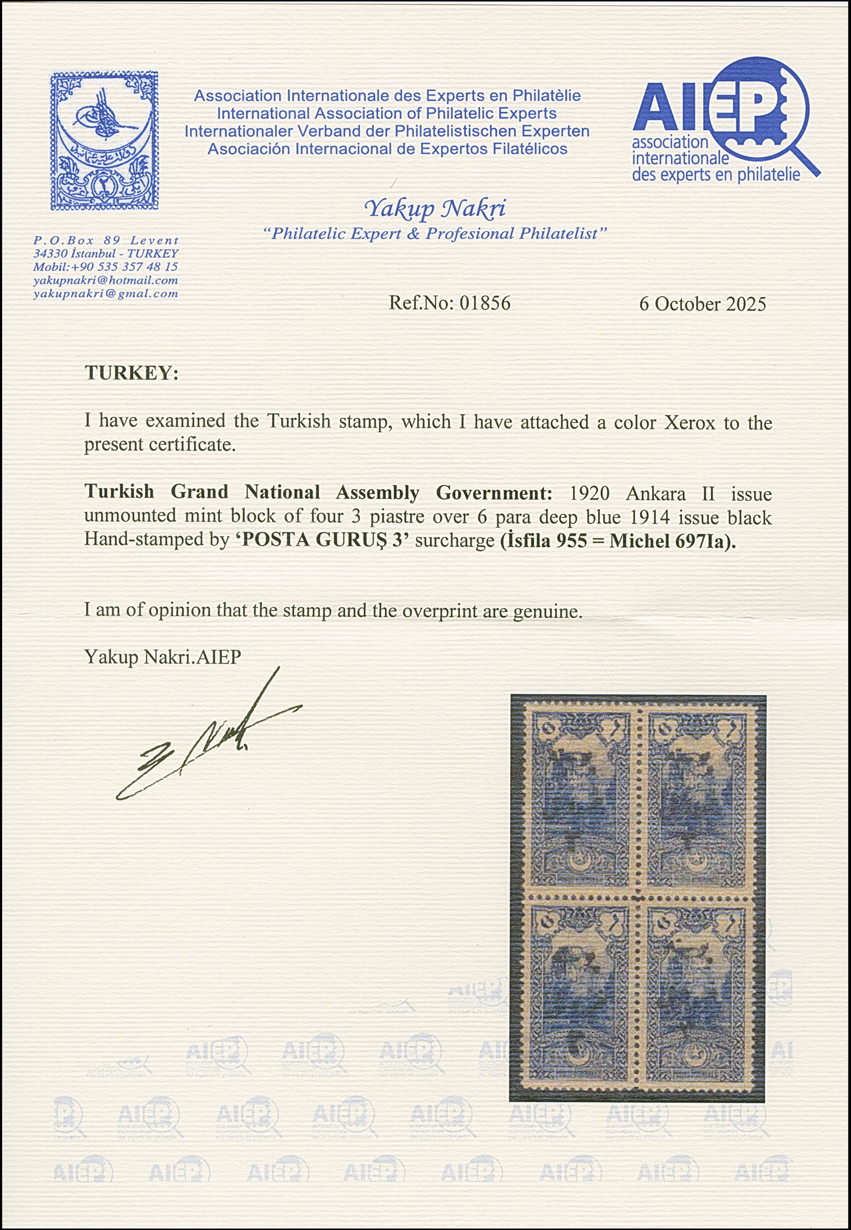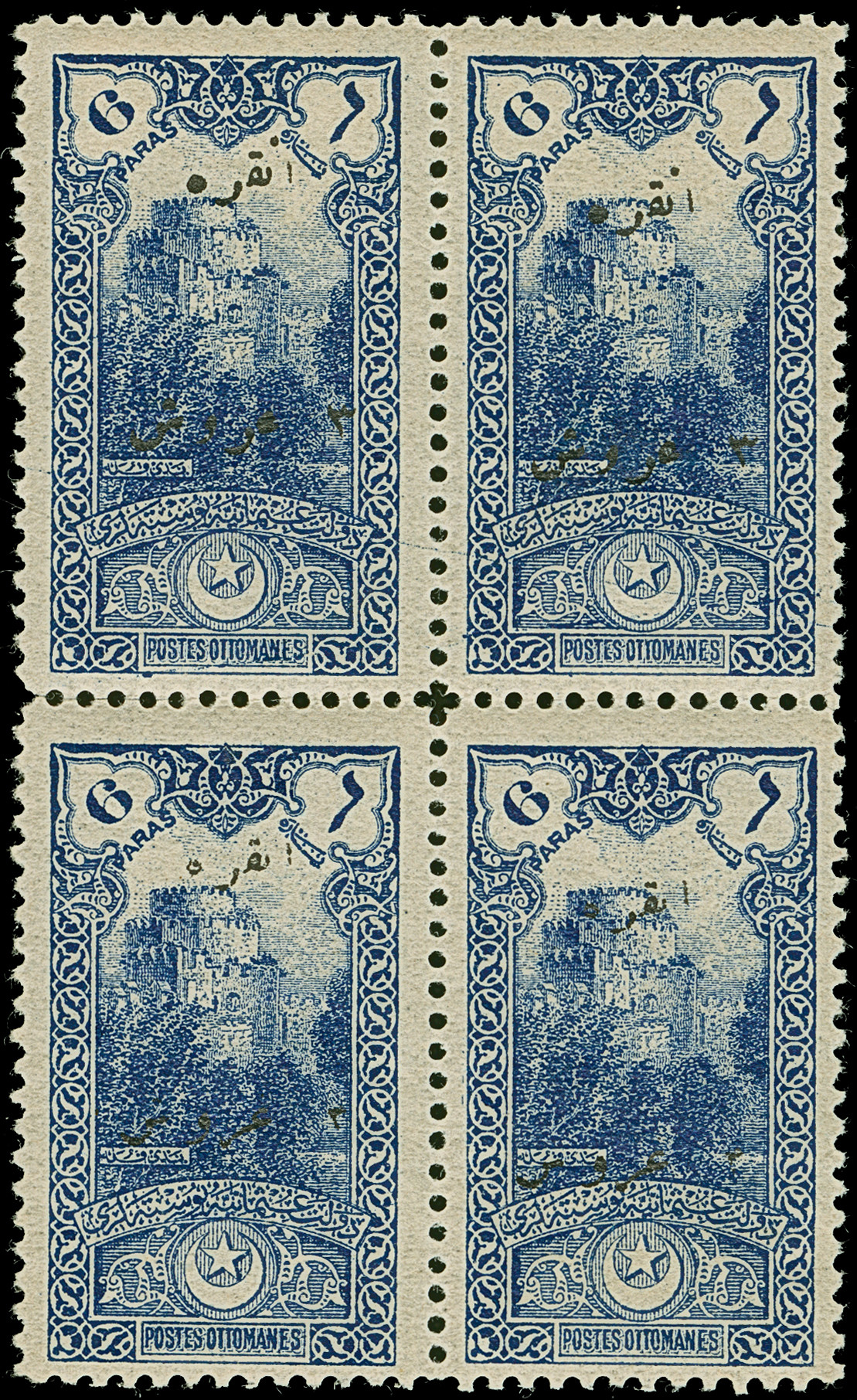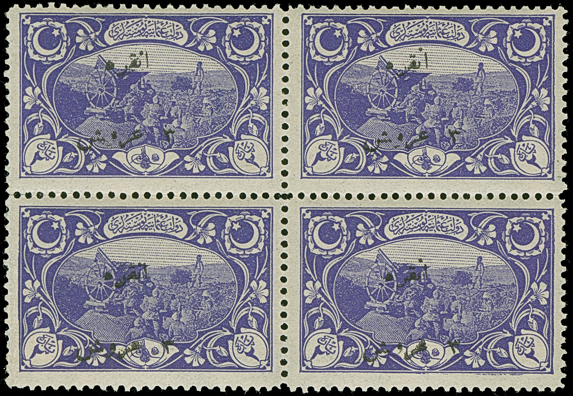 1920, 3 pia. on 6 pa. deep blue, block of four, mint never hinged very fine, an Angora Government rarity in top quality. Certificate Y. Nakri (2025) (Isf. catalogue value 9.000,-€)