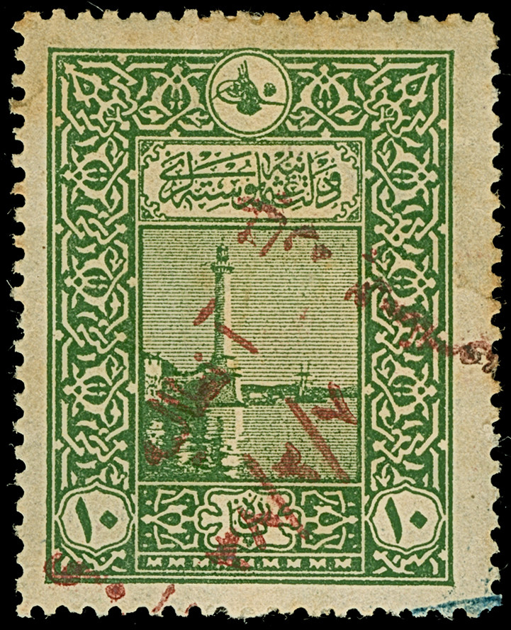 1922, TURKEY NI ASIA : ANTALYA AIR MAIL Souvenir issue 10 pa. green with red aviation overprint ‘Antalya 7.3.38’, light cancelled, paper remain on reverse, tiny toned, otherwise fine. Extremly scarce air mail stamp. Certificate Isfila 2013 (Mayo no.AA3)