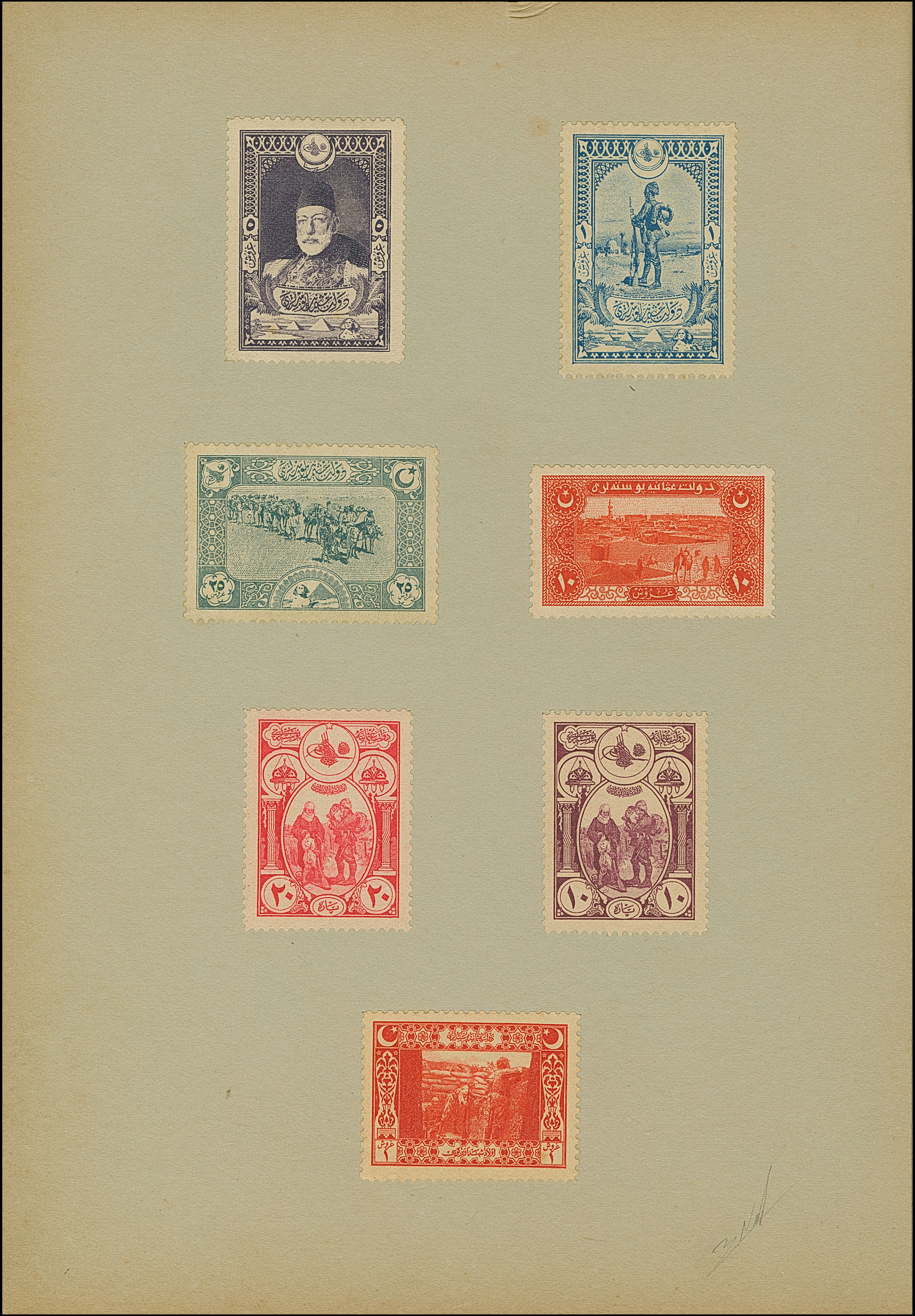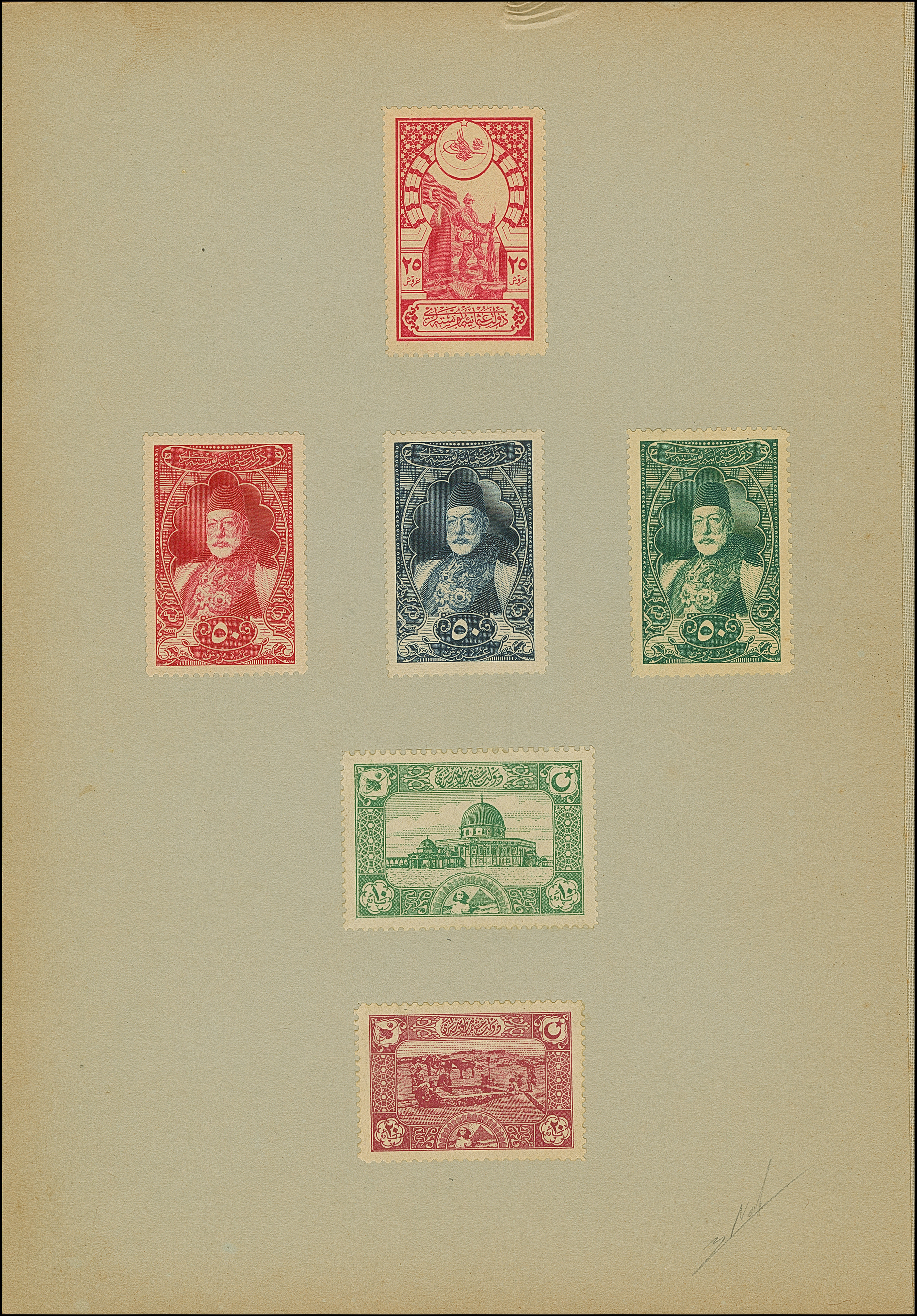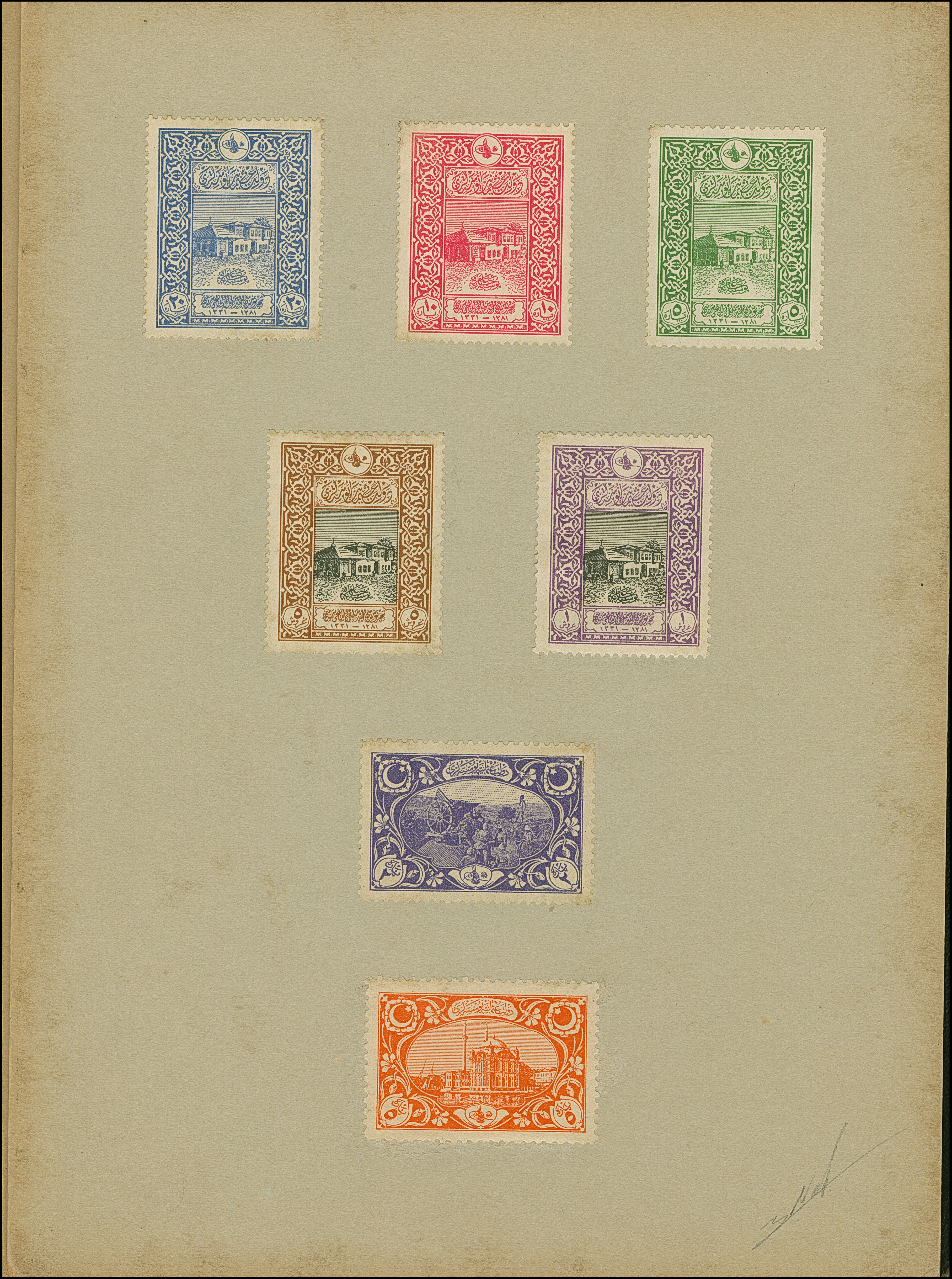 1901, Tugra presentation book, bound in red velvet, containing photographic essays for domestic and foreign mail issue in unissued designs and two large photographic proofs without denomination. Binding damaged and presentation cartons with marginal adhesions Most likely unique.