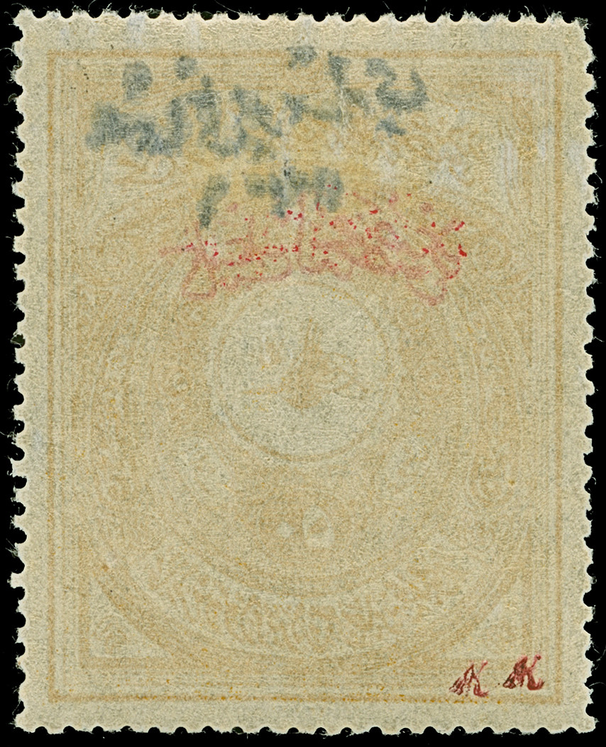 1862, Tughra first printing, 2 pia. black on thin deep blue paper, unused, A. Garmiryan plate flaw 2A, uncommonly large margins all around with dividing lines on three sides, extremely scarce and very fine (Isfila catalogue value 3.800€++)