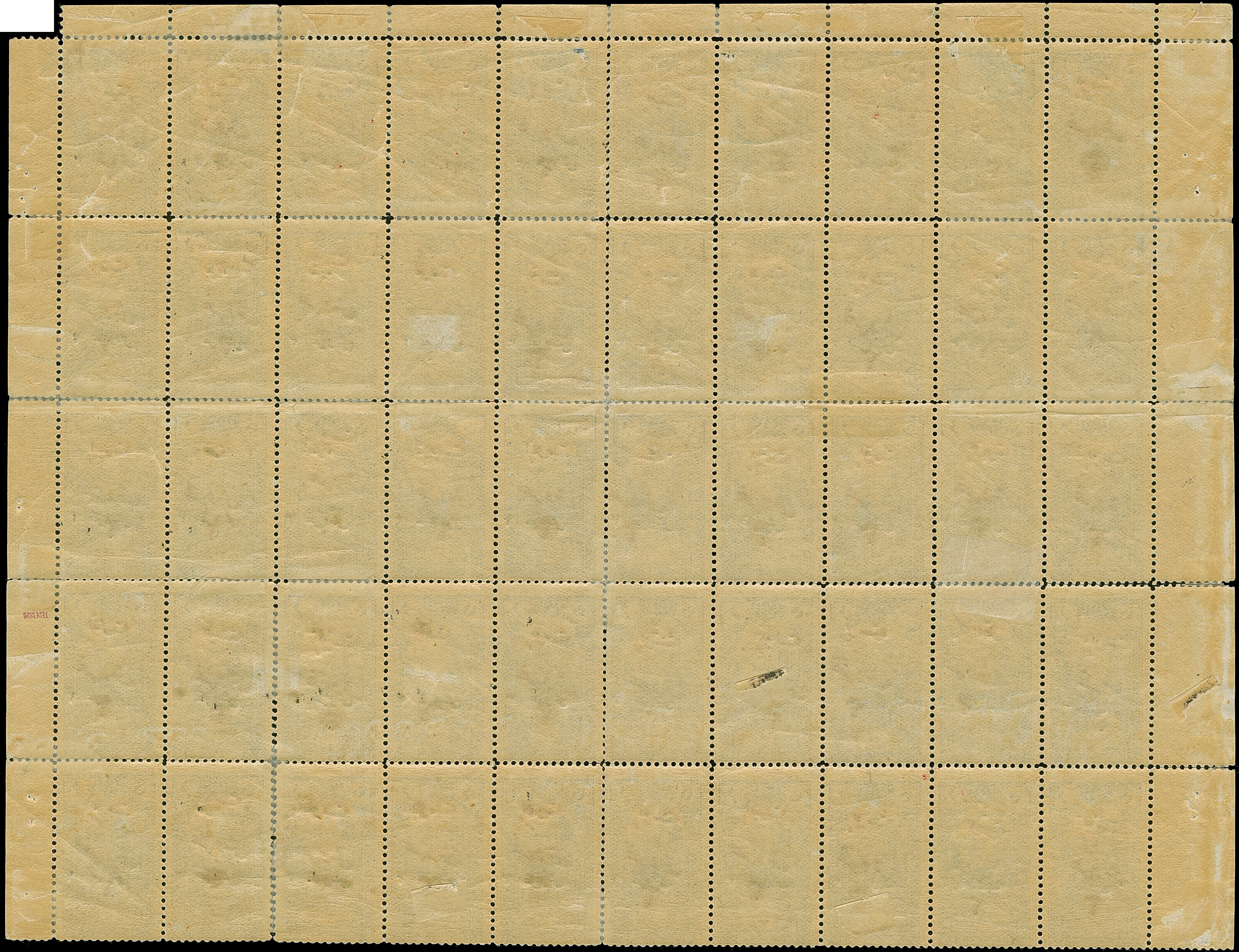 1920, 3 pia. on 6 pa. deep blue, red handstamped block of 50 with margins on three sides, most mint never hinged and very fine, some perfs and 3rd row apart, large blocks of this issue are very scarce. (Isf. catalogue value for mh blocks 12.700,-€). PROFI archive has not recorded larger blocks than four, an important rarity of Turkey in Asia issues.