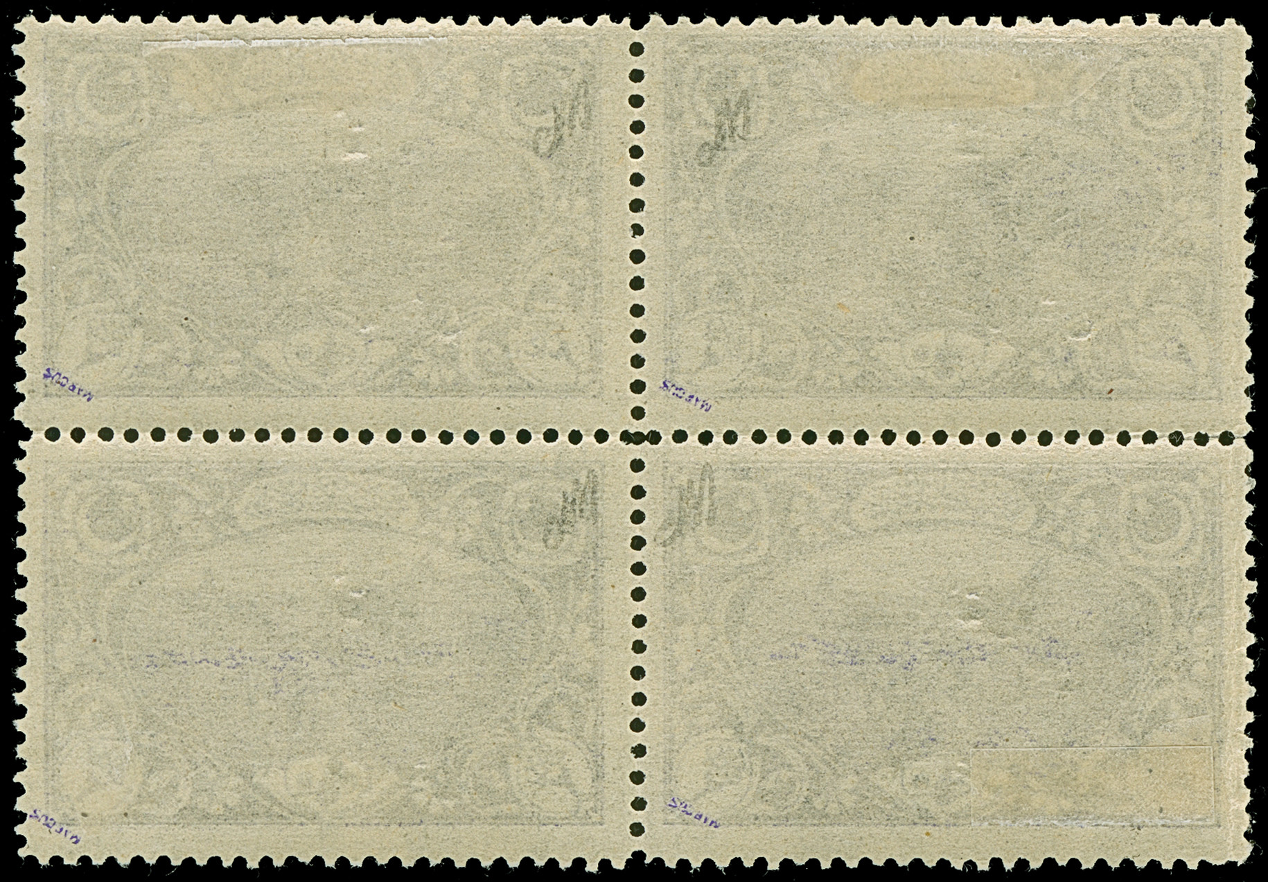 1920, 3 pia. on 2 pa. violet block of four, unused, each stamp light hinged, very fine and scarce, signed JM and Marcus (Isfila catalogue value 900,- Euro)