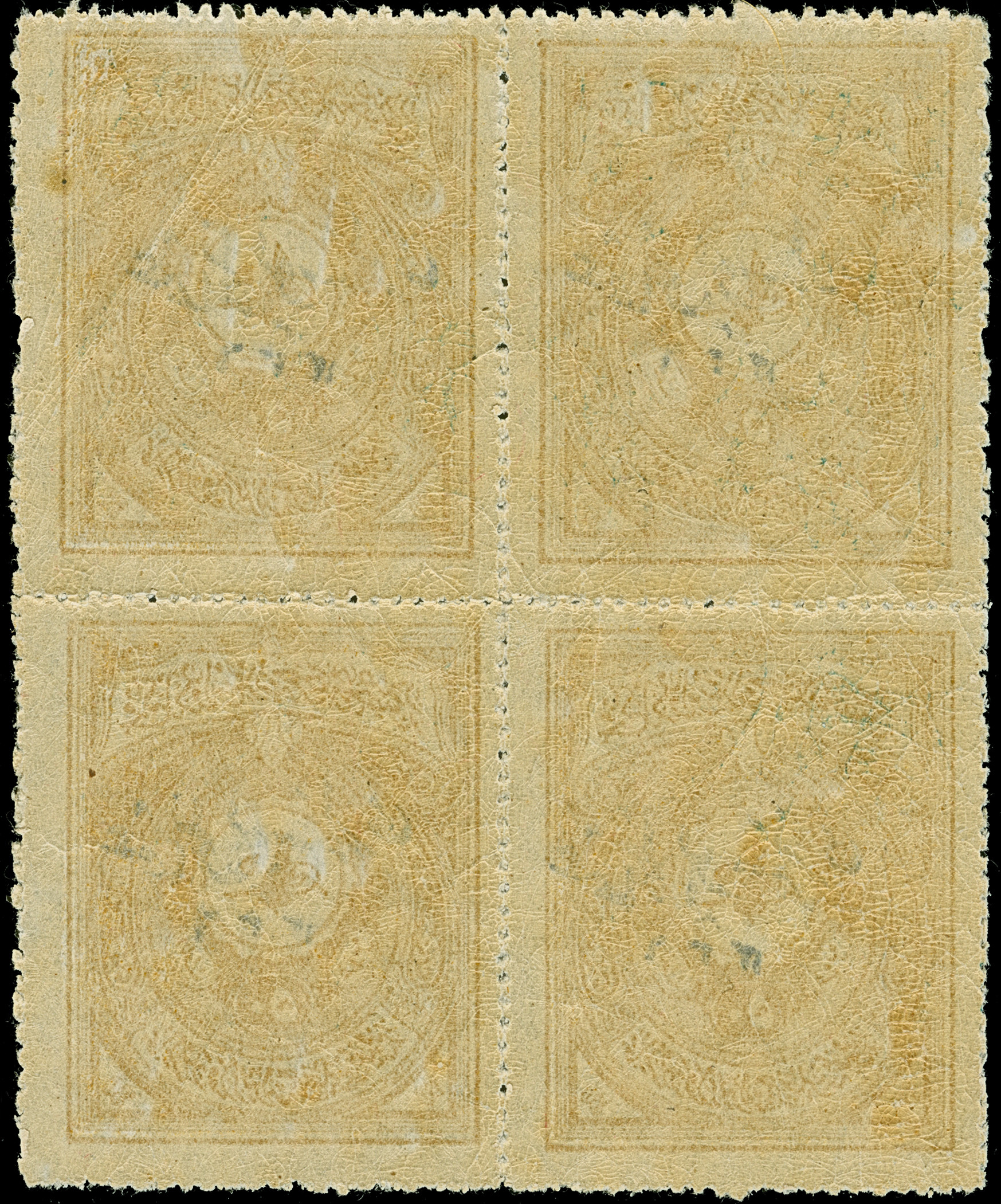 1862, Tughra 20 pa. yellow, trial printing for the third issue on thin gummed paper with ‘burele’ ground, right sheet marginal block of four (Type C-D/K-L). (The tabulation of the block reports and type are according to Tevfik Kuyas). Very Fine and an extremely rare multiple. (Isfila catalogue value for single stamps 13.300,-€, block of four is unpriced).
