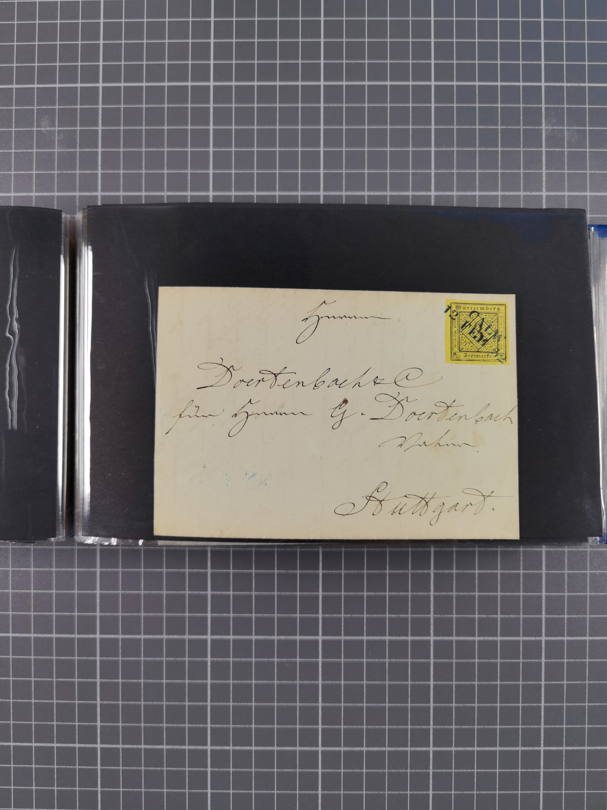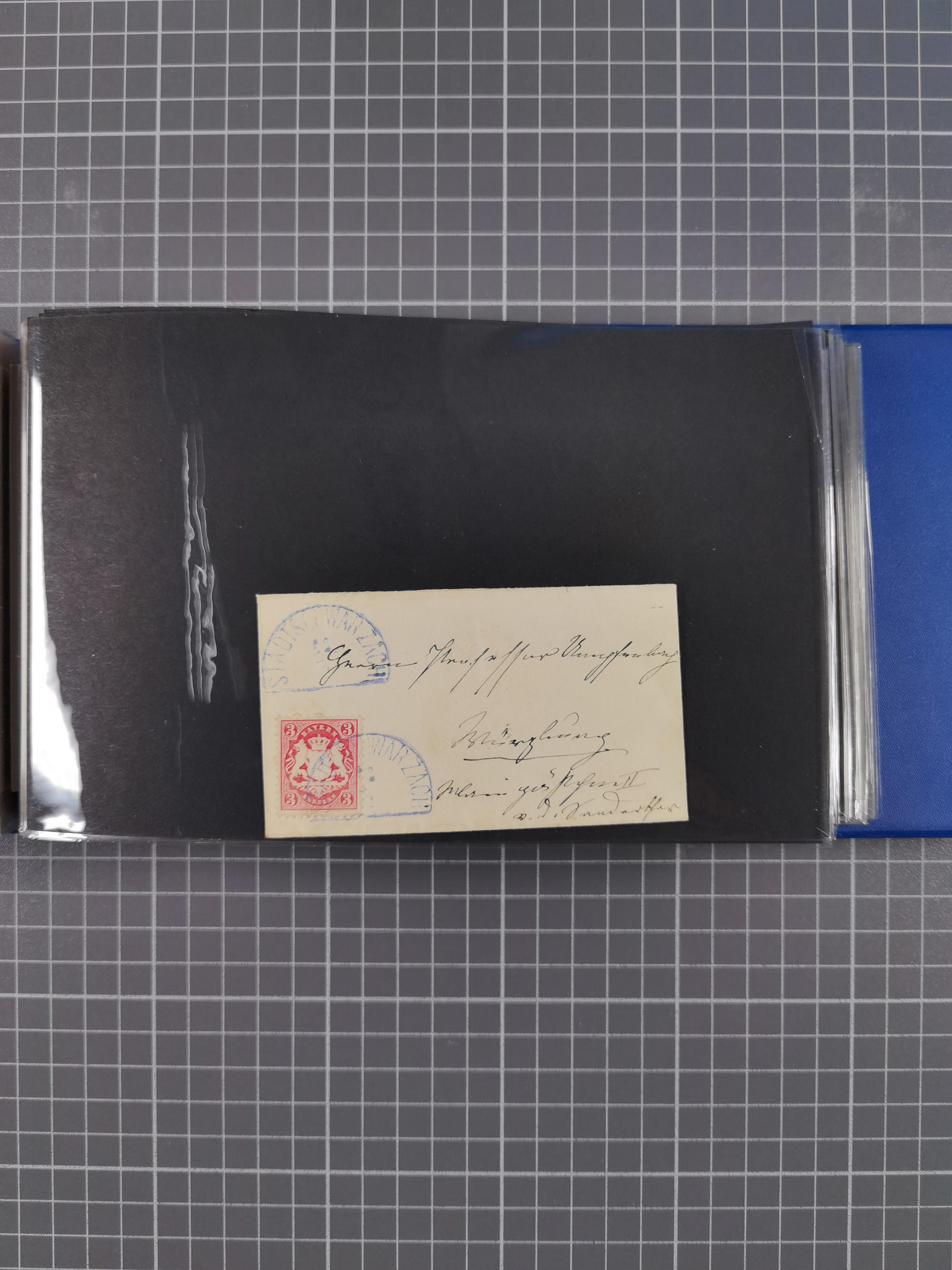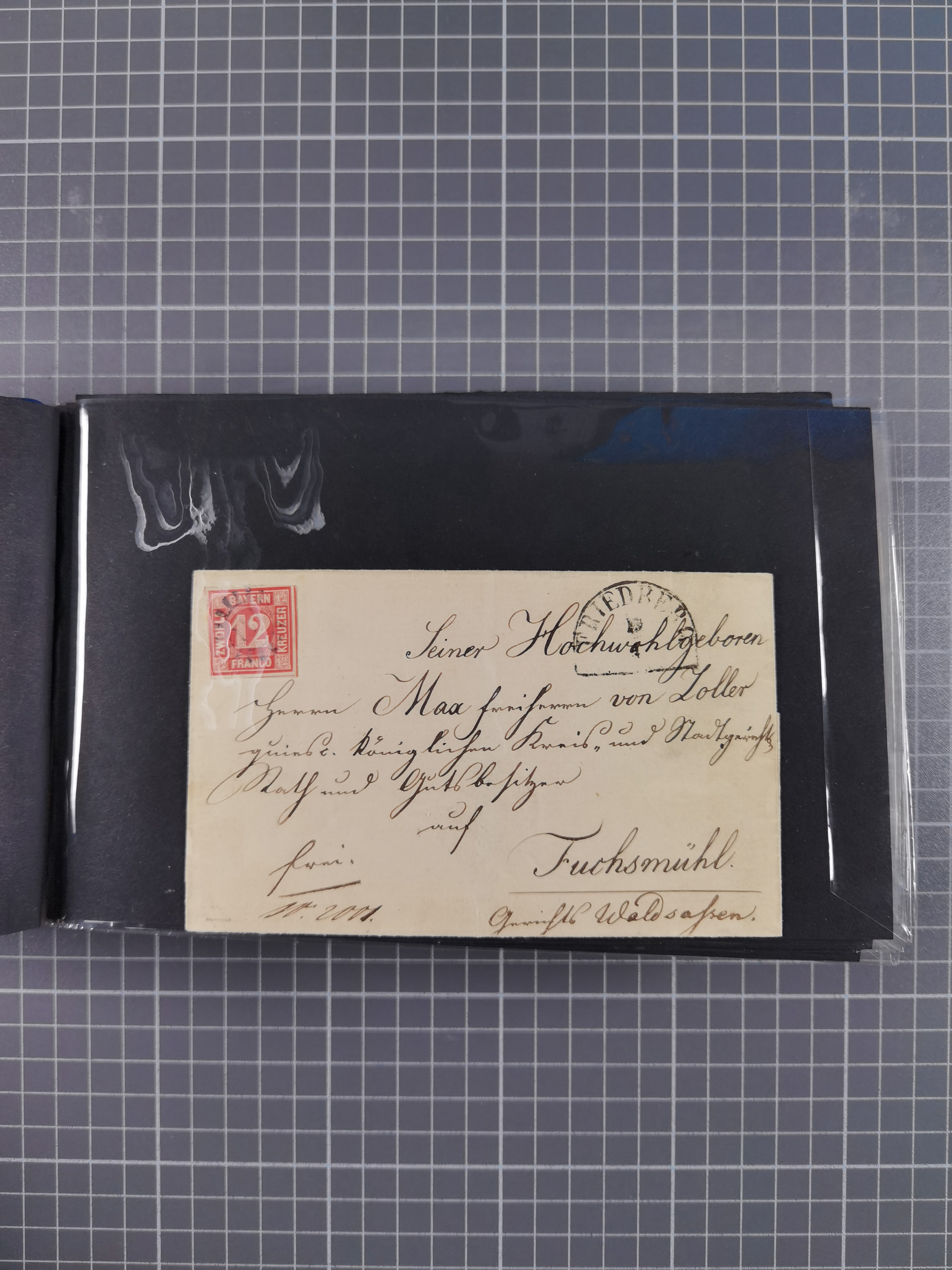 1830/86 (ca.), über 45 meist markenlose Briefe mit Steigbügelstempeln mit Schwerpunkt Württemberg, dabei u.a. HAIGERLOCH in rot auf Vorderseite, ALTSHAUSEN in blau (1844), BLAUFELDEN in waidblau (1850), ECHTERDINGEN in blau (1847), PLOCHINGEN, etc., auch einige Postscheine und Einzelmarken, im Album