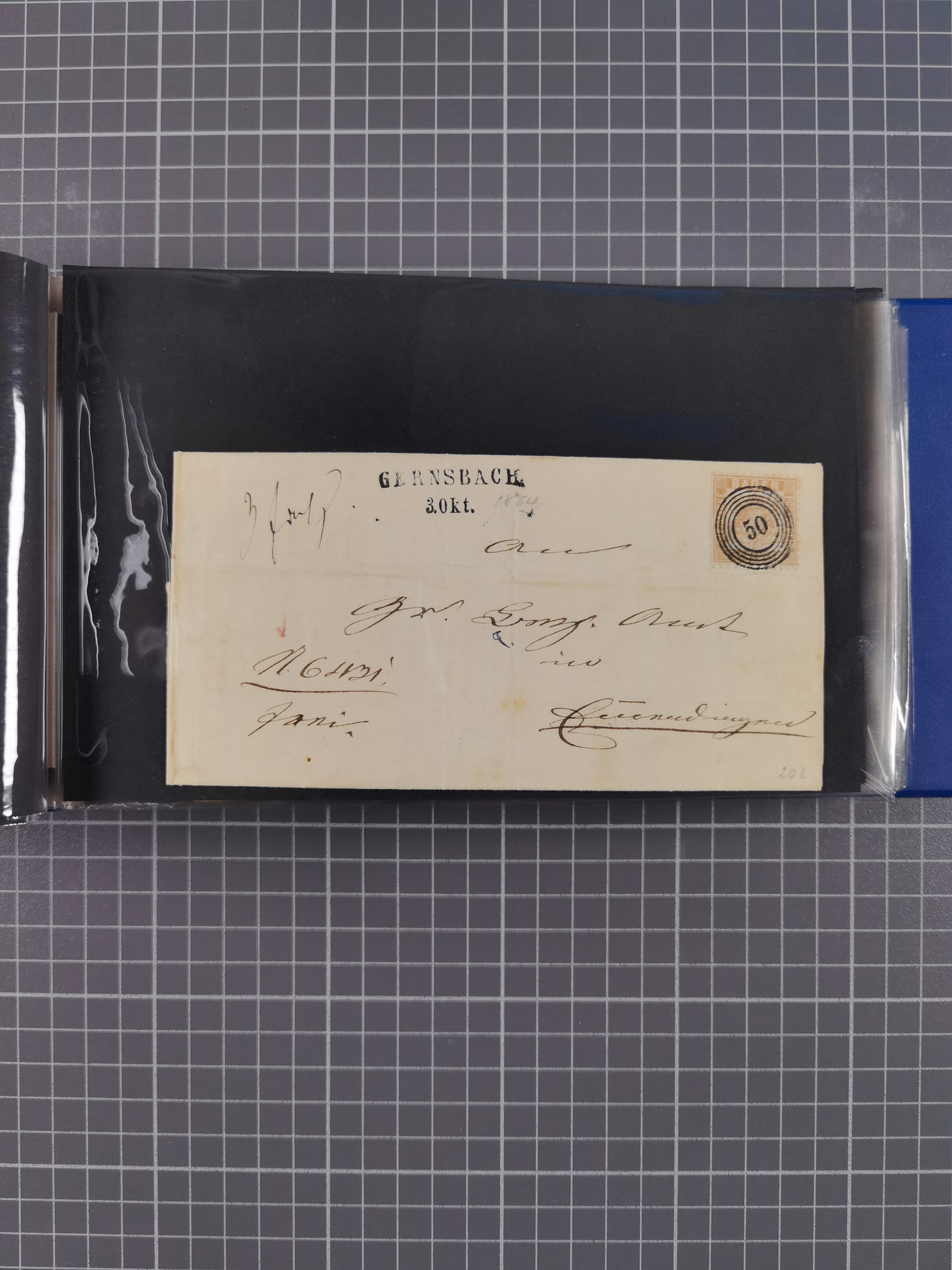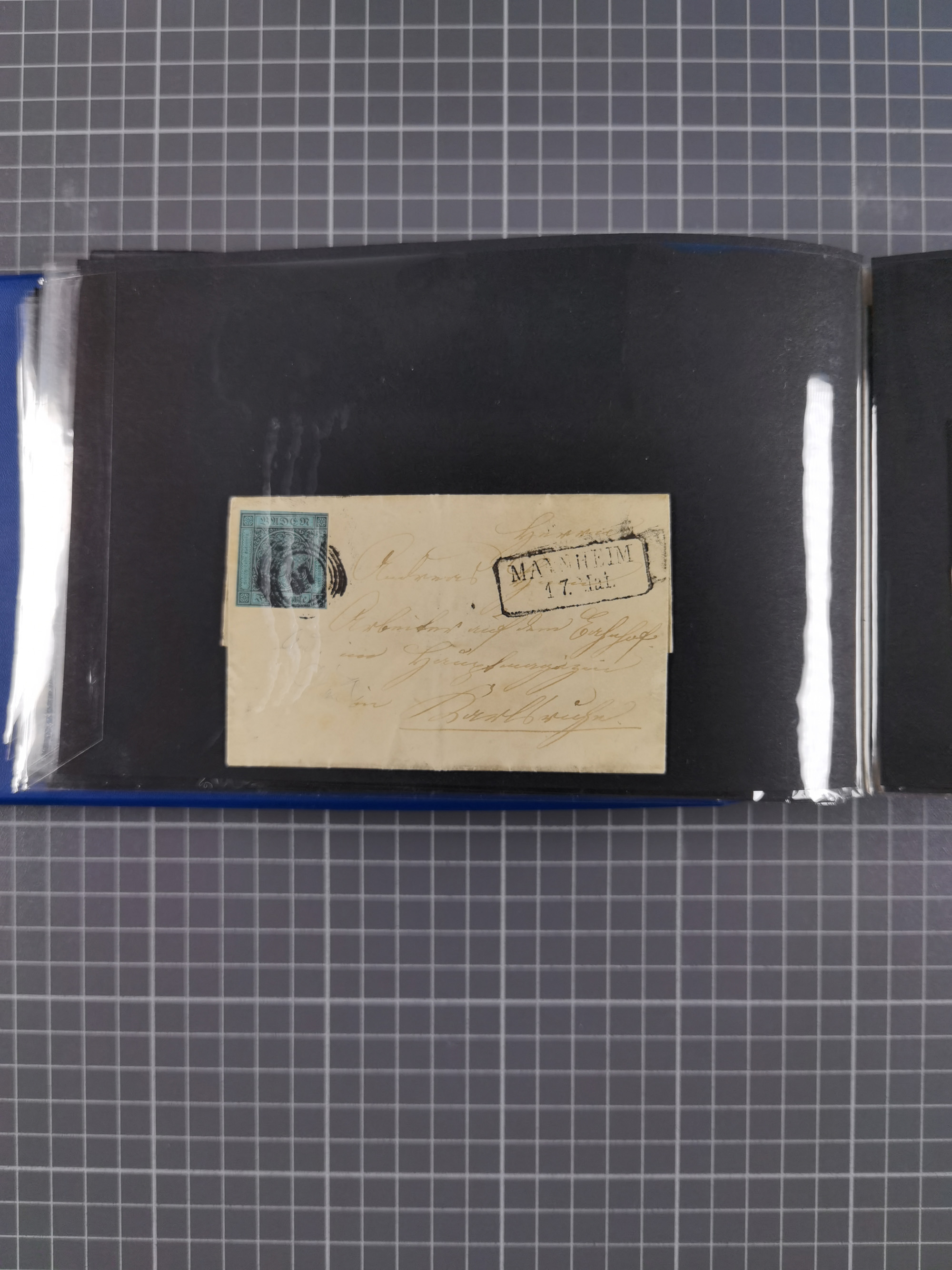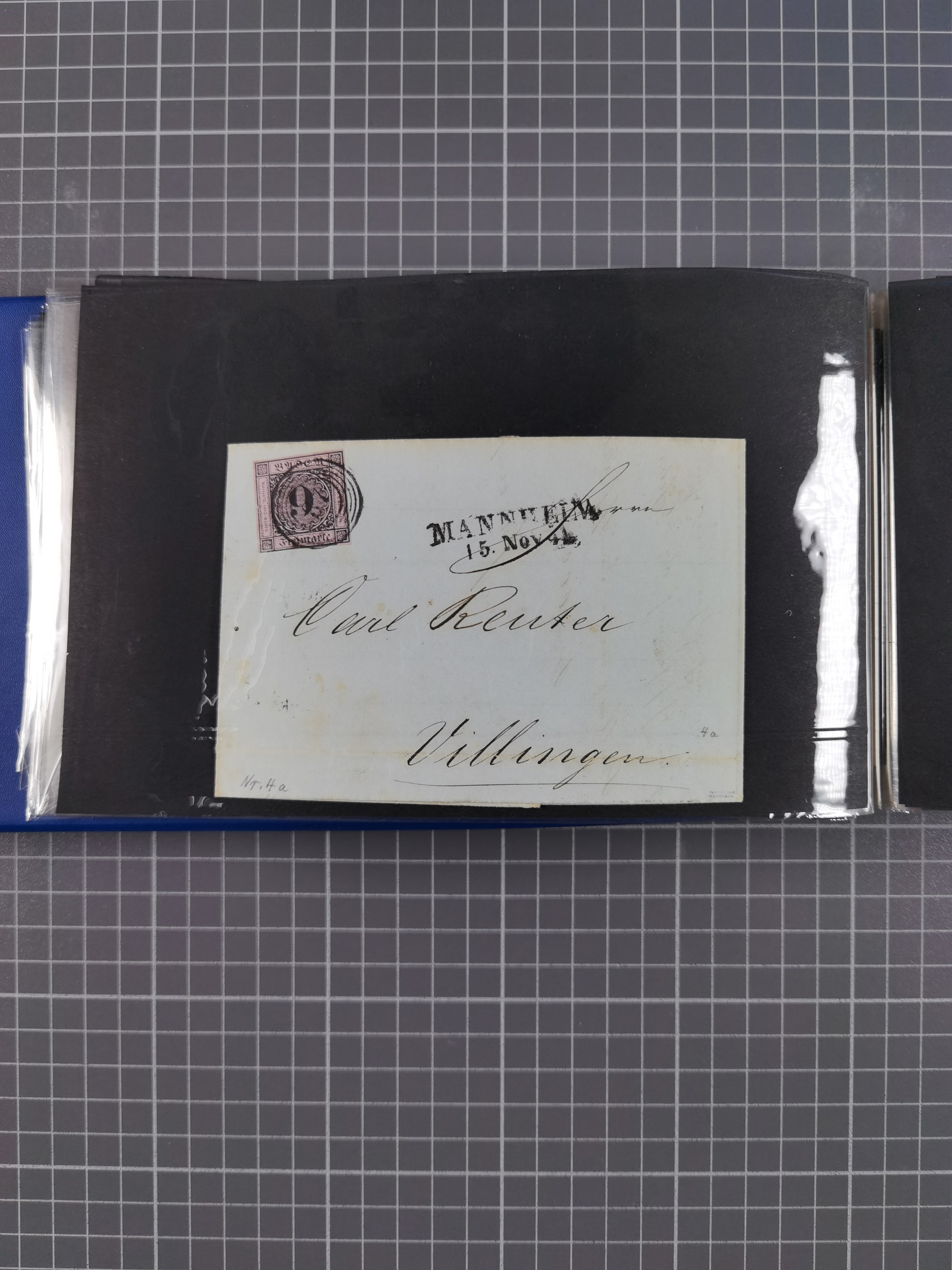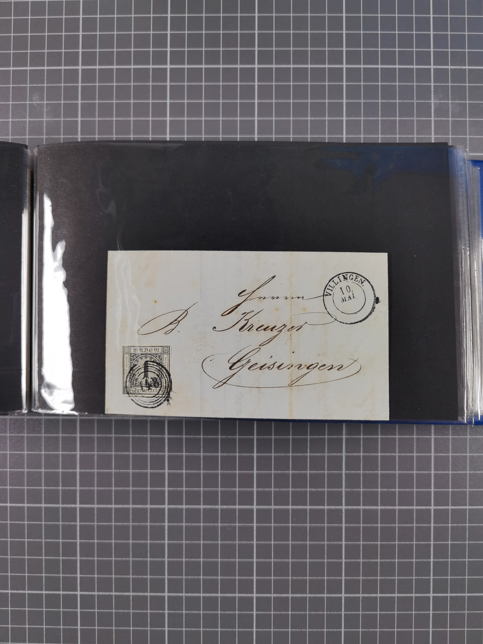 1830/86 (ca.), über 45 meist markenlose Briefe mit Steigbügelstempeln mit Schwerpunkt Württemberg, dabei u.a. HAIGERLOCH in rot auf Vorderseite, ALTSHAUSEN in blau (1844), BLAUFELDEN in waidblau (1850), ECHTERDINGEN in blau (1847), PLOCHINGEN, etc., auch einige Postscheine und Einzelmarken, im Album
