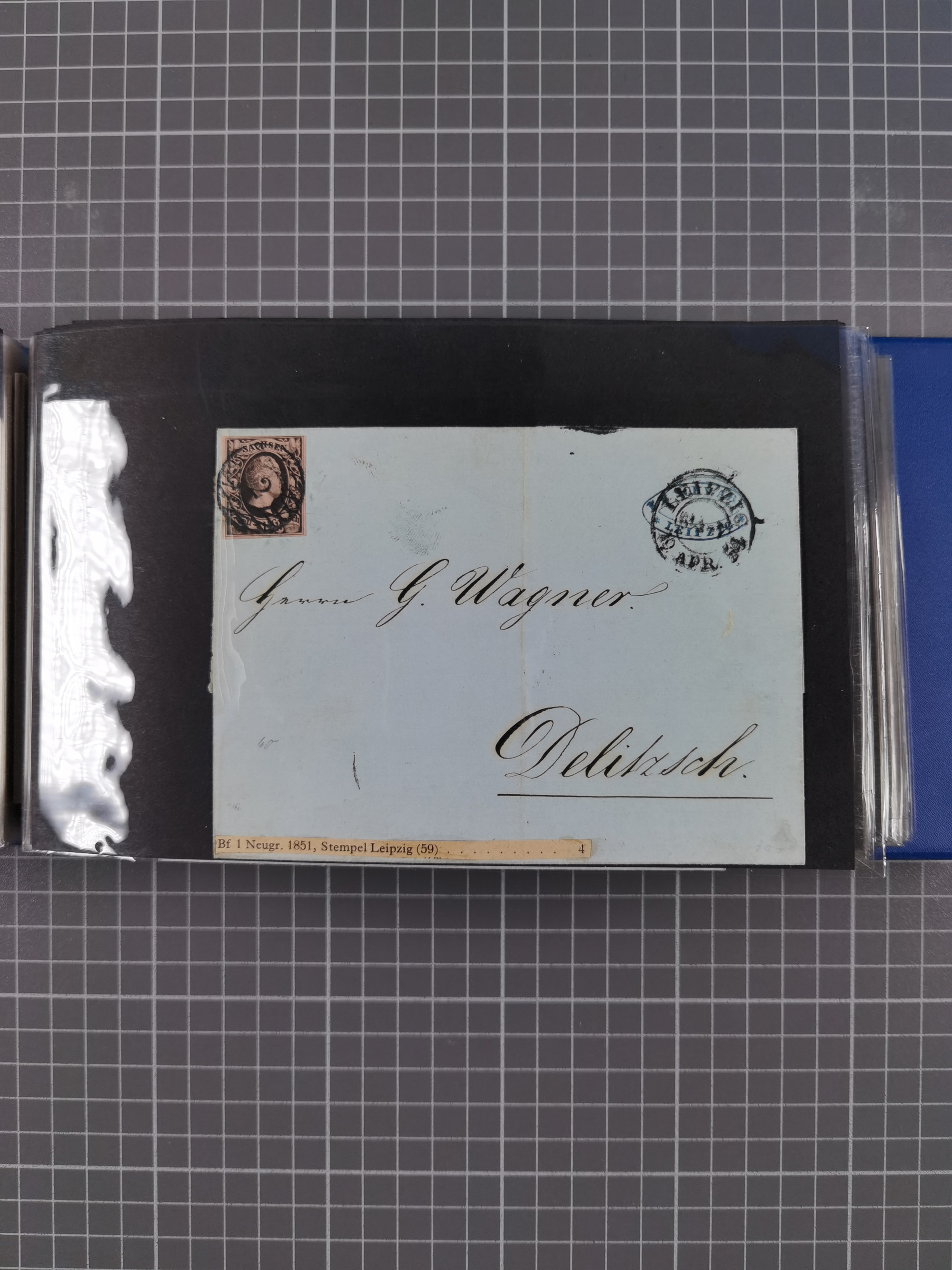 1824/82, ca. 40 Briefe, Karten und Ganzsachen ab Vorphila mit interessanten Stempeln, frankierte Belege mit Destination USA von Preußen mit zweimal 6½ Gr.-Frankaturen Kopfausgaben (1x GSU mit Zufrankatur), Sachsen mit 7½ Ngr.-Frankatur Johann I. Ausgabe, Thurn & Taxis und NDP sowie unfrankierter Faltbrief aus Bremerhaven 1865 nach Norwegen. Dazu etwas Ausland und Deutsches Reich Mi.-Nr. 21a auf Brief 1874 nach New York und drei Briefe 1879-82 von Hamburg nach Veracruz
