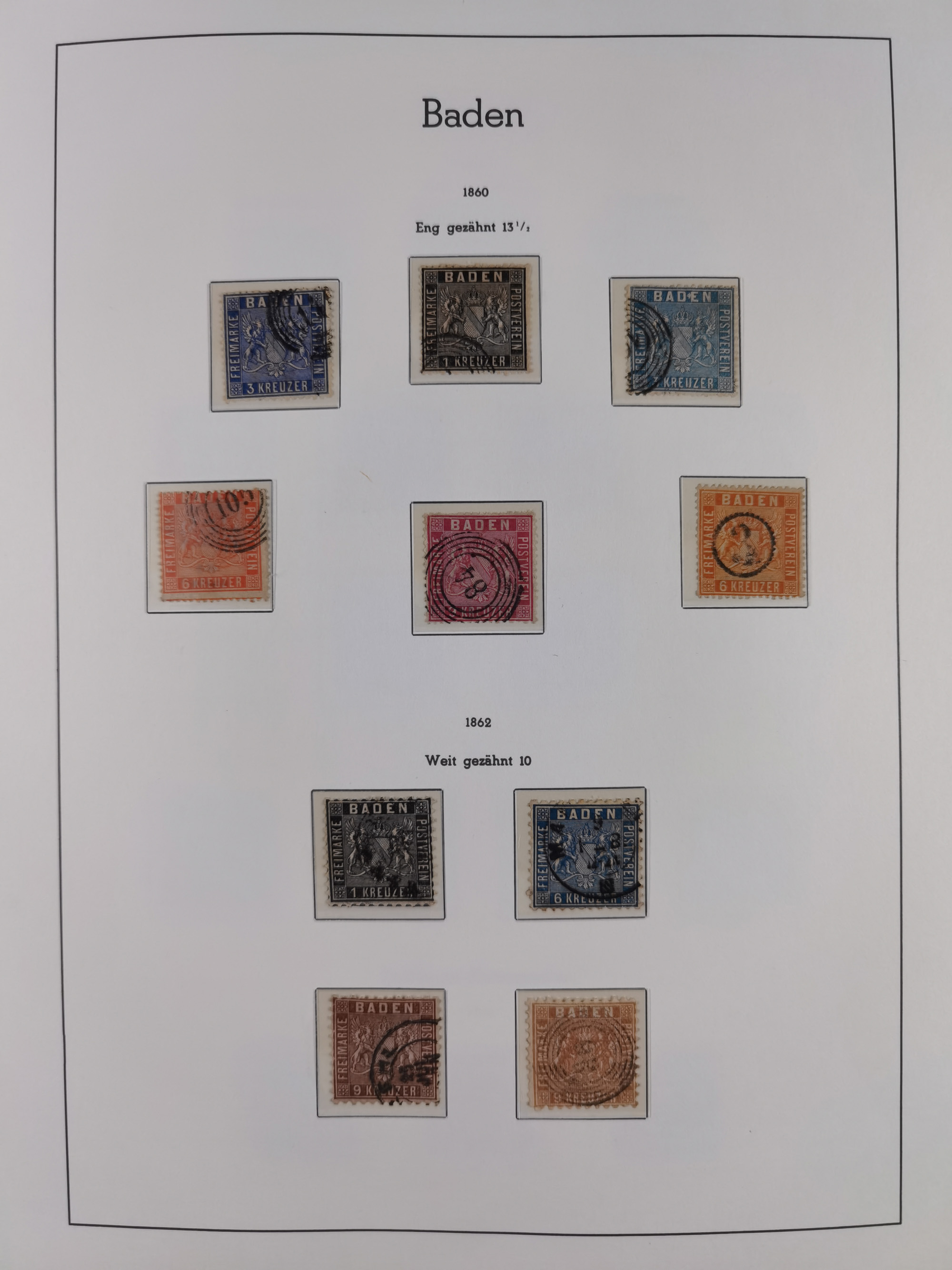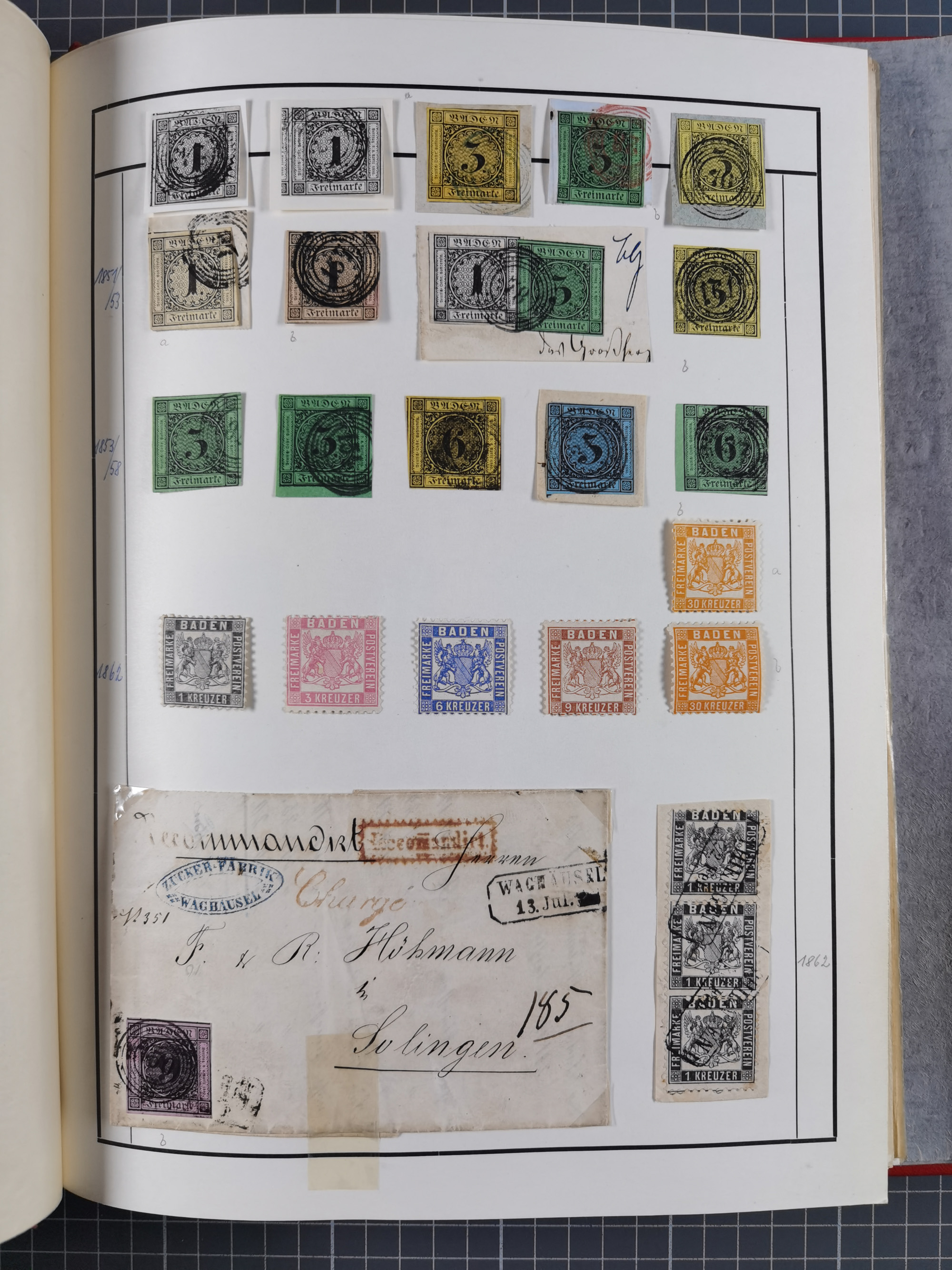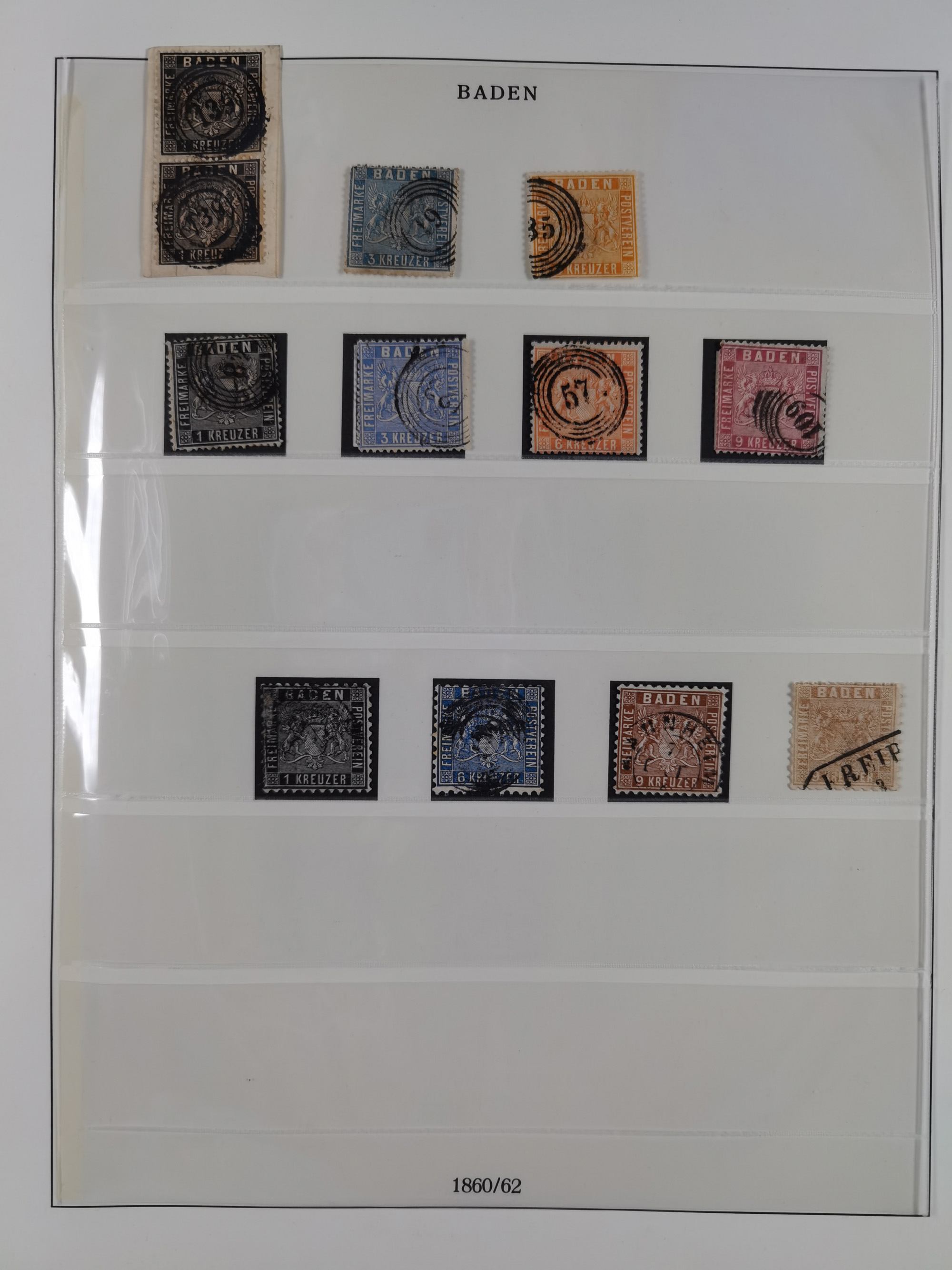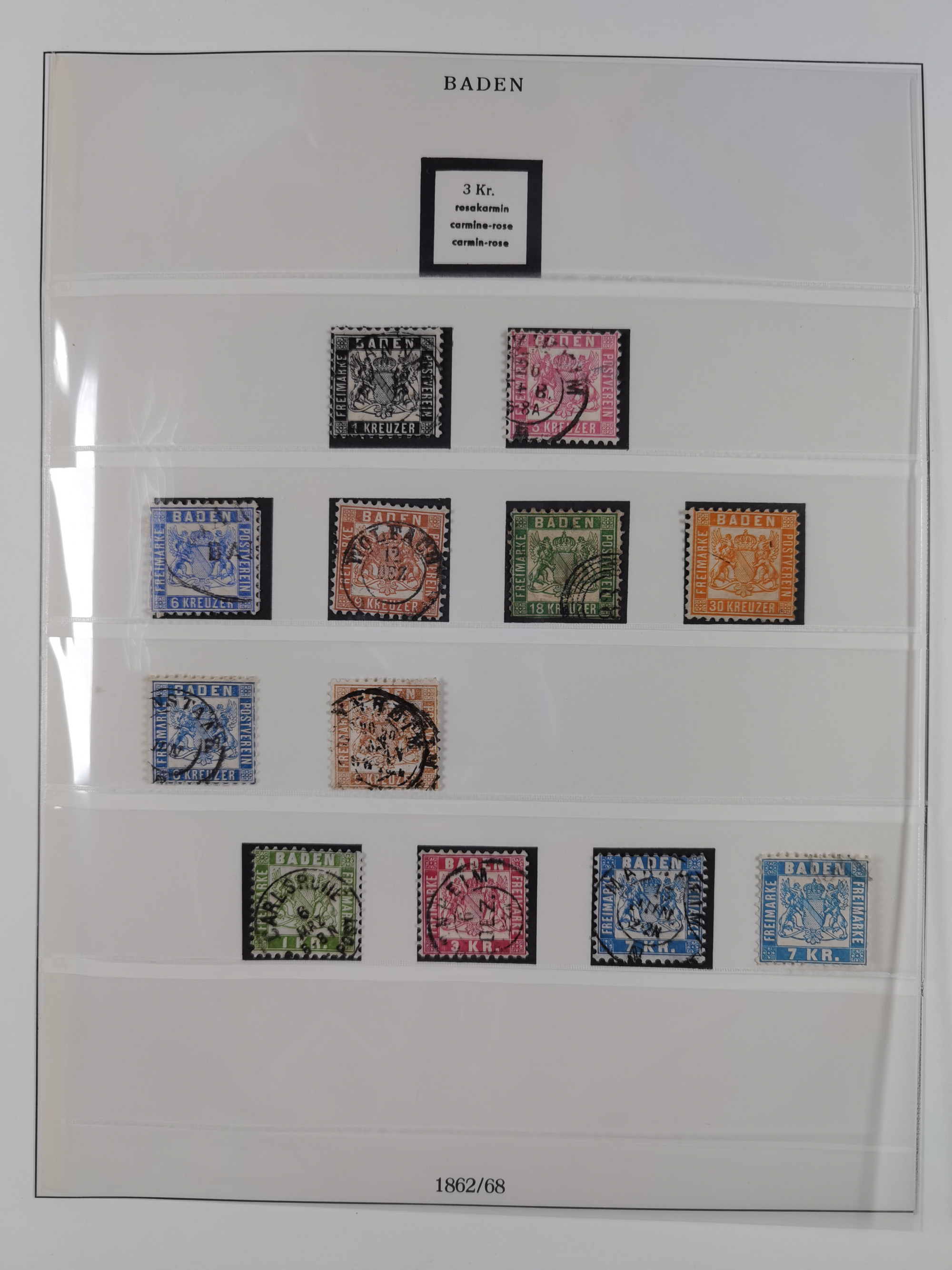 1849/1920, Baden bis Württemberg, meist gestempelte Sammlung mit besseren Werten und Ausgaben, ab Baden Mi.-Nr. 1a sign. Drahn, Braunschweig Mi.-Nr. 1-3 und 13, Hannover Mi.-Nr. 6, 17, Mecklenburg Mi.-Nr. 4 sign. Richter und Flemming, NDP Mi.-Nr. 23, sowie Oldenburg, Württemberg mit Mi.-Nr. 42, Sachsen Mi.-Nr. 1 sign. Bühler, etc., ferner einige abhängige Teile Ortsstempel, einiges signiert Richter, W. Engel und Drahn, etc., unterschiedliche Erhaltung, in drei Alben