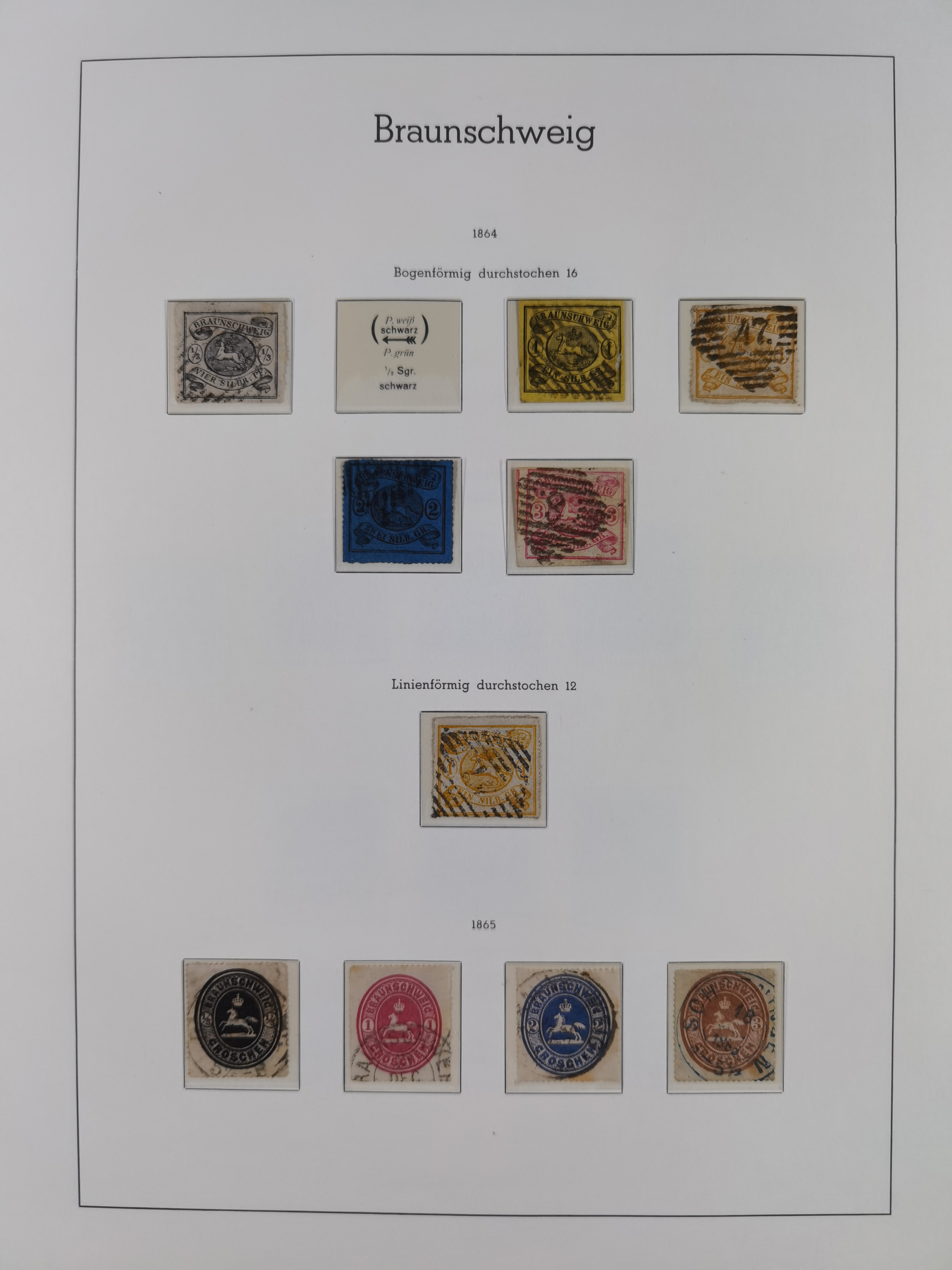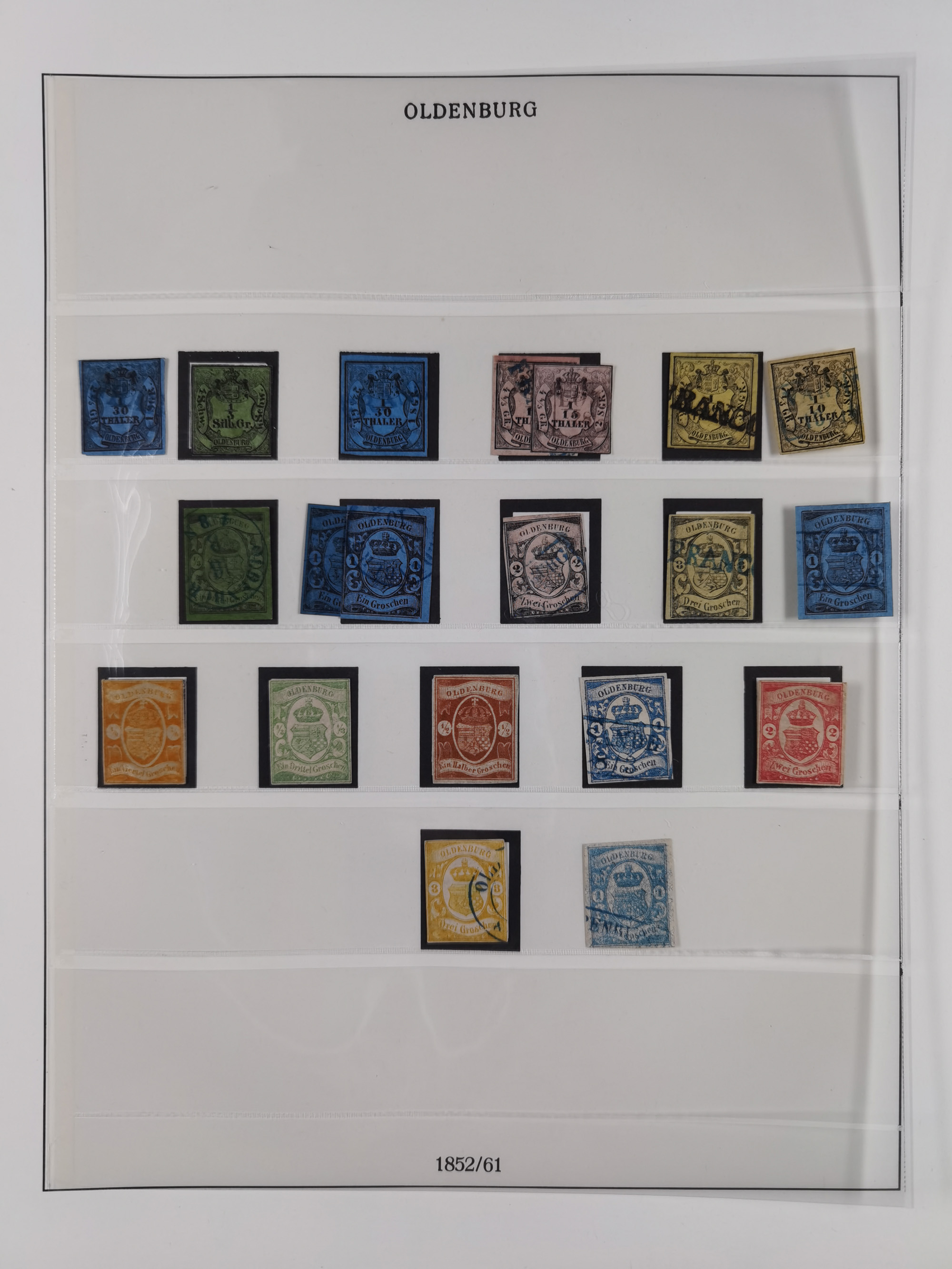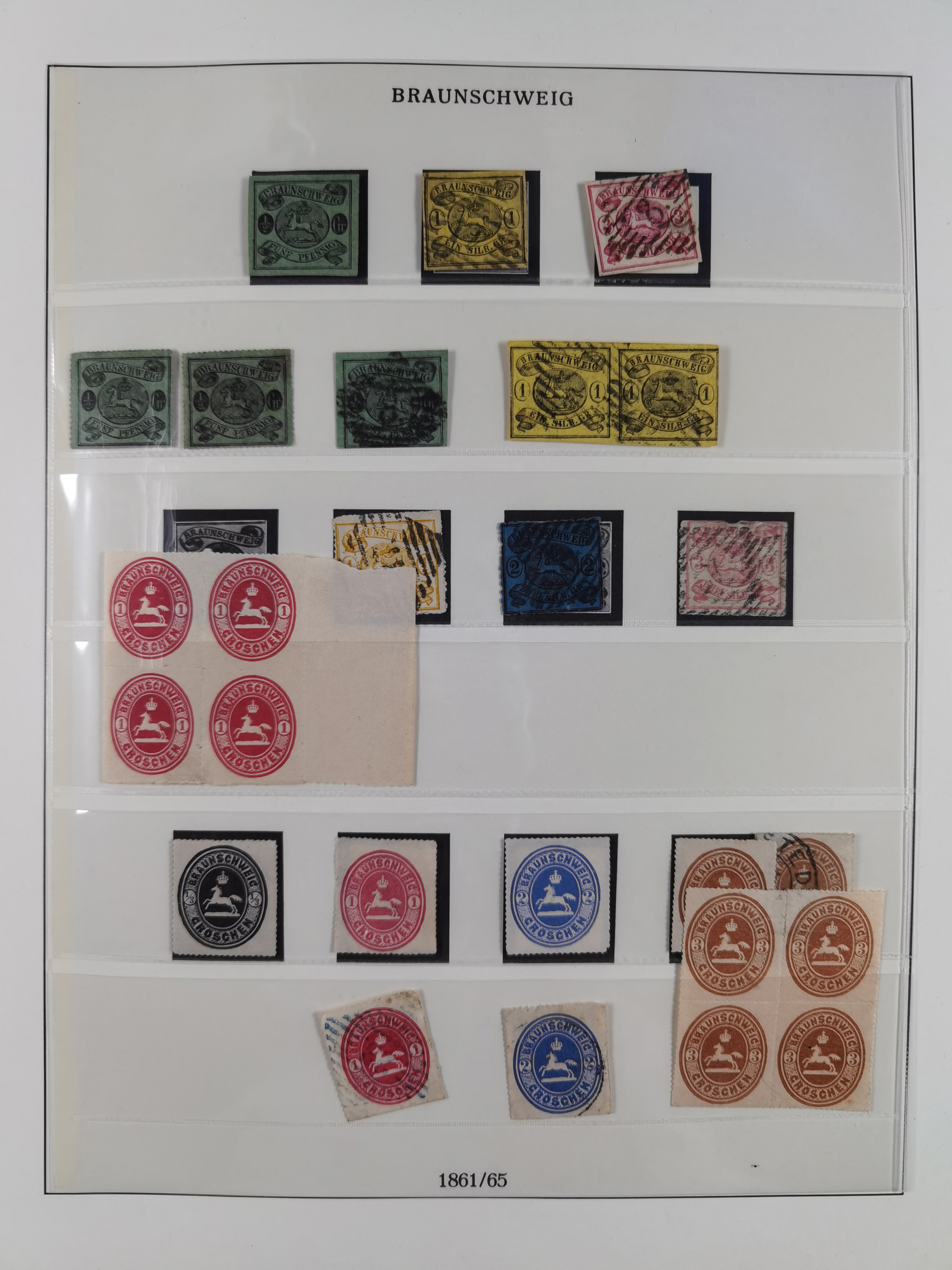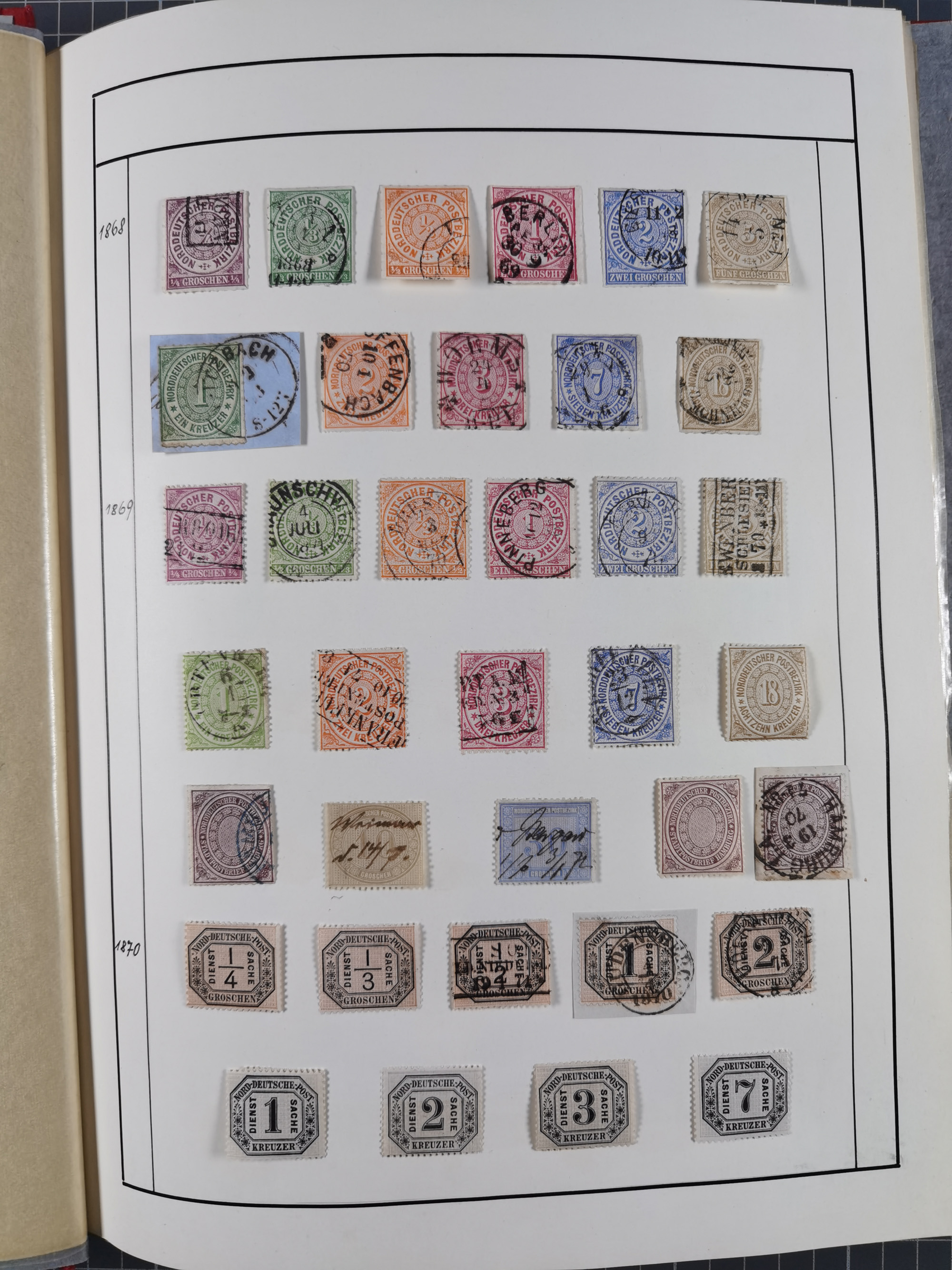 1849/1920, Baden bis Württemberg, meist gestempelte Sammlung mit besseren Werten und Ausgaben, ab Baden Mi.-Nr. 1a sign. Drahn, Braunschweig Mi.-Nr. 1-3 und 13, Hannover Mi.-Nr. 6, 17, Mecklenburg Mi.-Nr. 4 sign. Richter und Flemming, NDP Mi.-Nr. 23, sowie Oldenburg, Württemberg mit Mi.-Nr. 42, Sachsen Mi.-Nr. 1 sign. Bühler, etc., ferner einige abhängige Teile Ortsstempel, einiges signiert Richter, W. Engel und Drahn, etc., unterschiedliche Erhaltung, in drei Alben