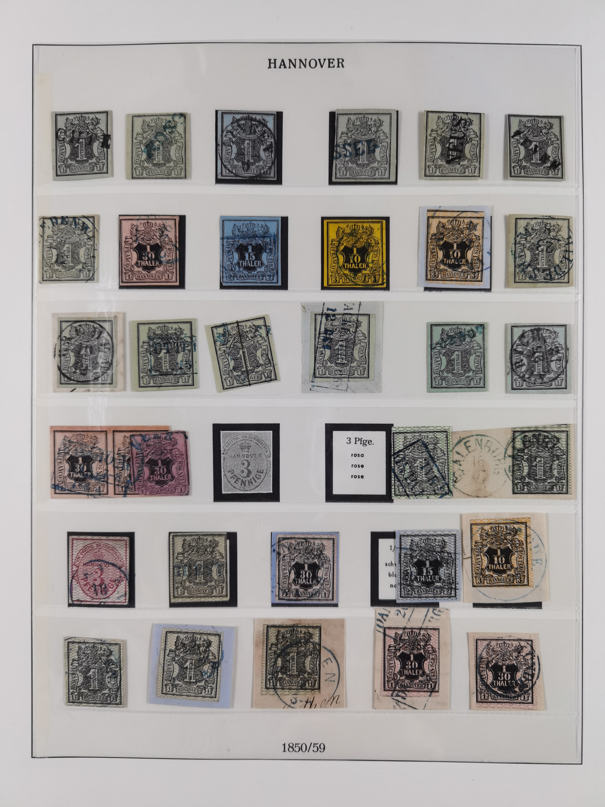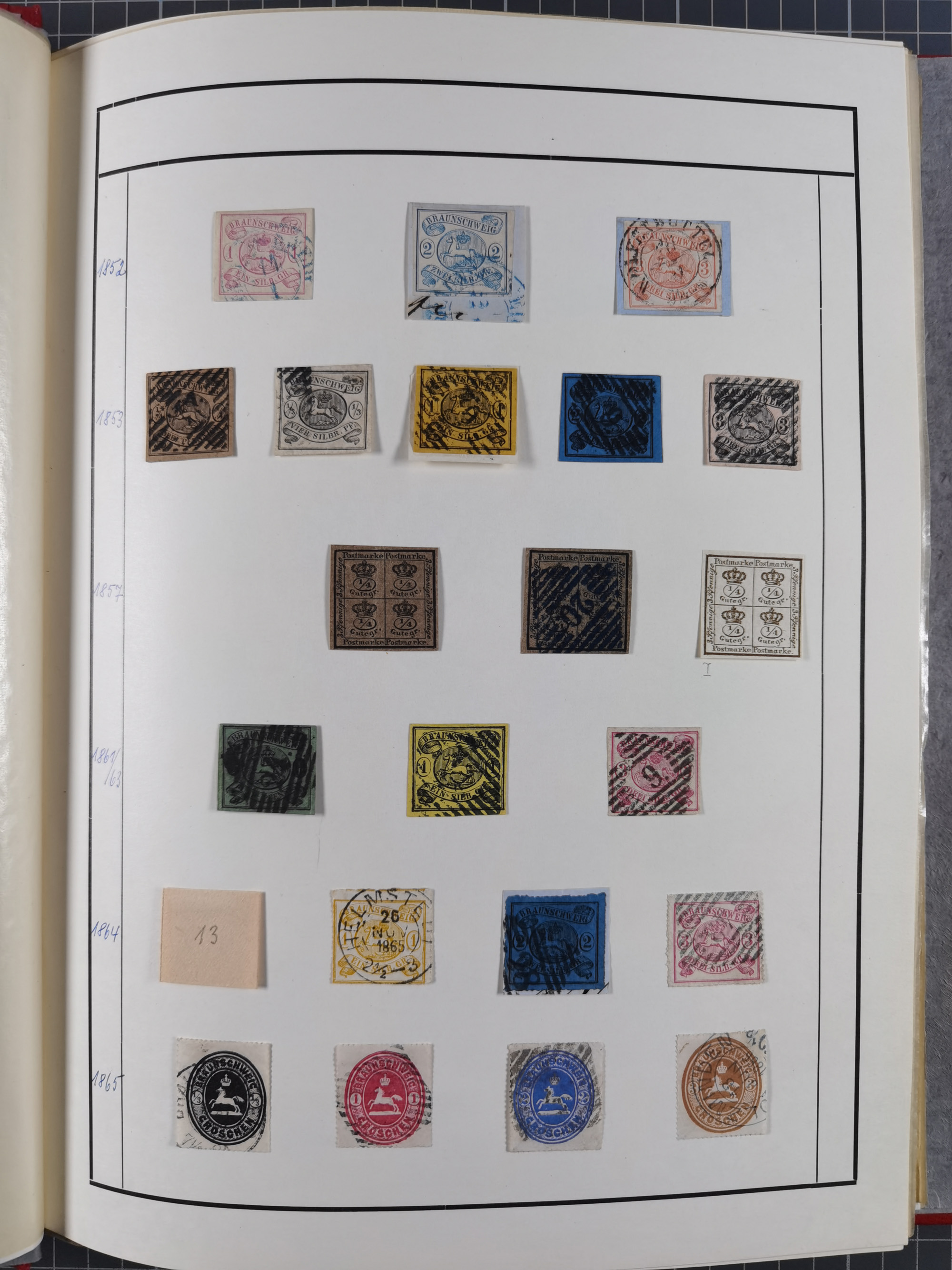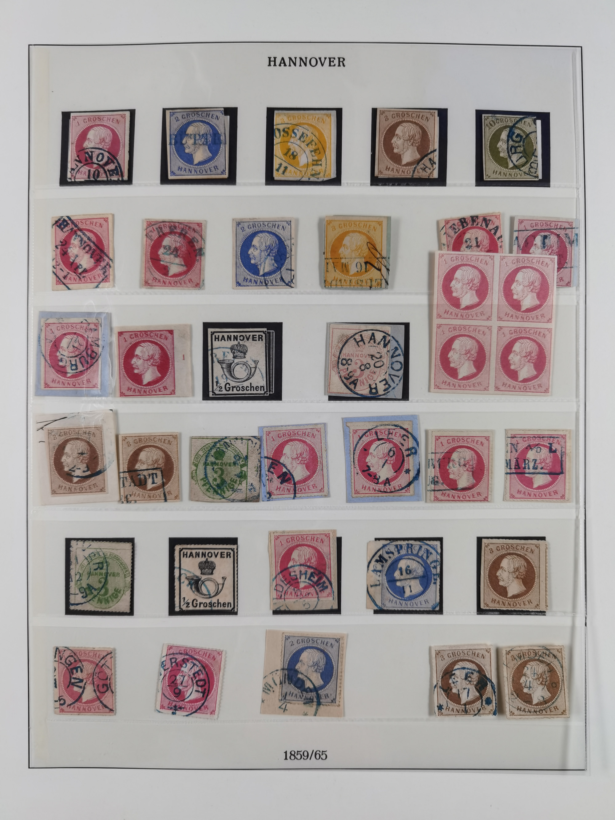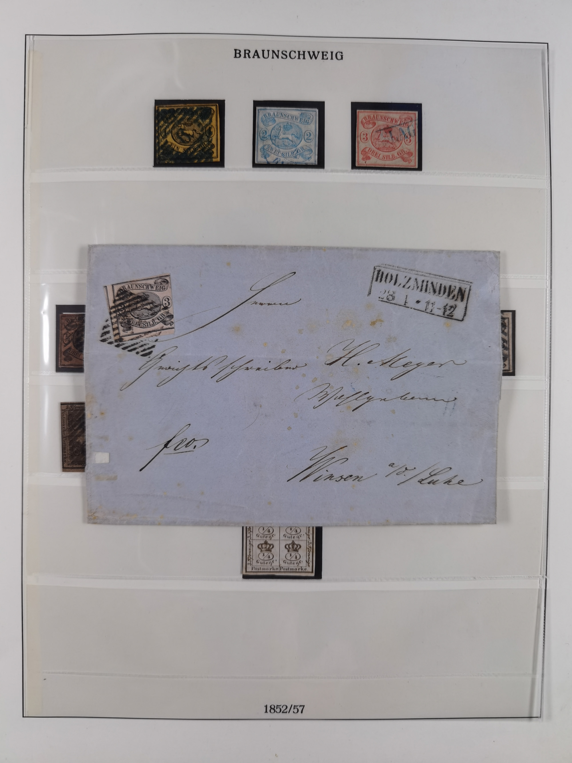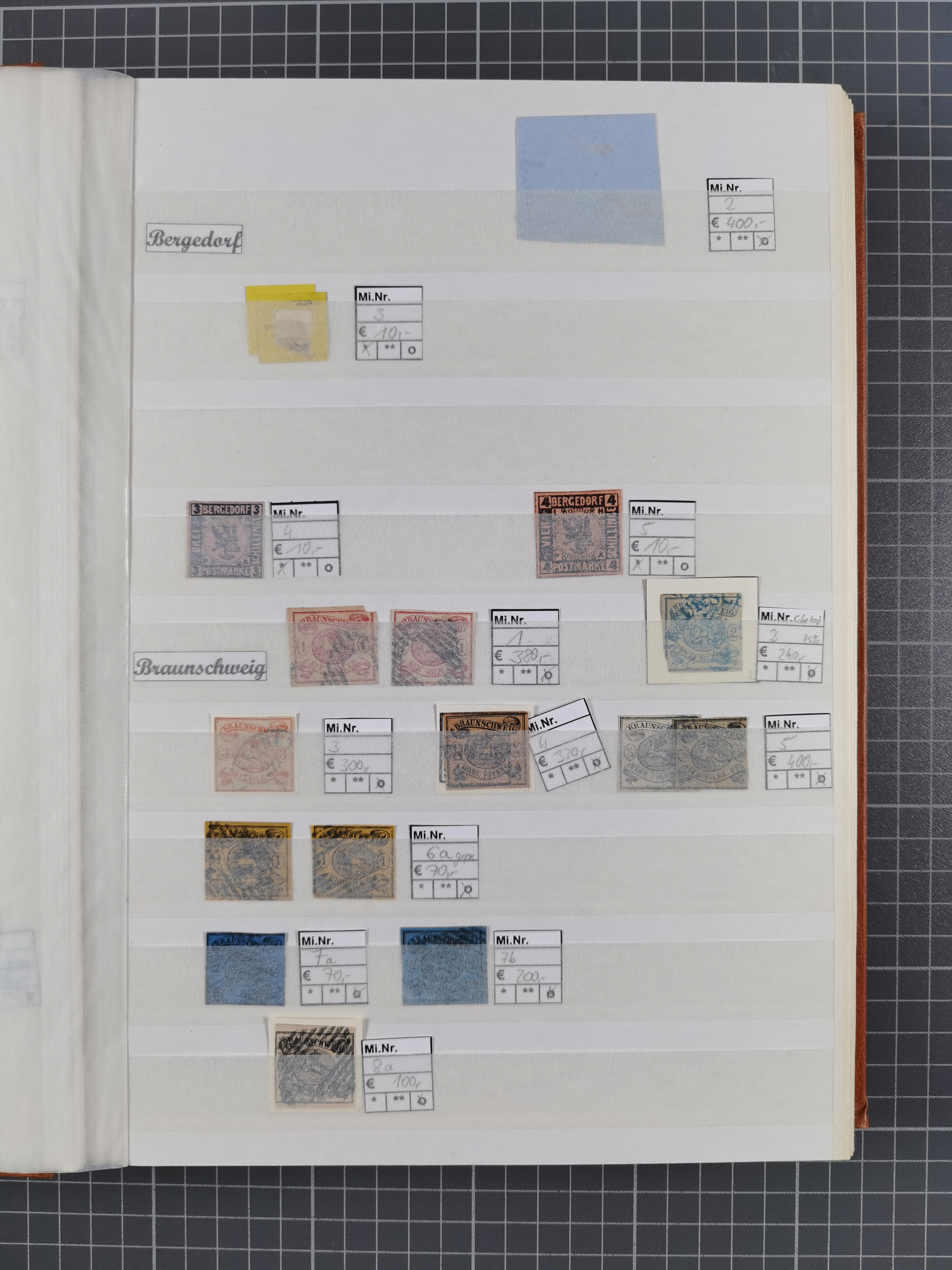 1852/65, gestempelte Sammlung von Bergedorf bis Schleswig Holstein mit besseren Marken, dabei u.a. Bergedorf Randstück Mi.-Nr. 1a (FA Jakubek), Mi.-Nr. 1b (FA Jakubek, laut Dr. Mozek Stempel nicht prüfbar) und Mi.-Nr. 2 (FA Dr. Mozek BPP), Braunschweig mit besseren Werten in zum Teil fehlerhafter Erhaltung, Hannover mit einigen Briefen, Helgoland Mi.-Nr. 19Aa auf Brief mit zwei weiteren Marken und Schleswig Holstein mit sechs Marken