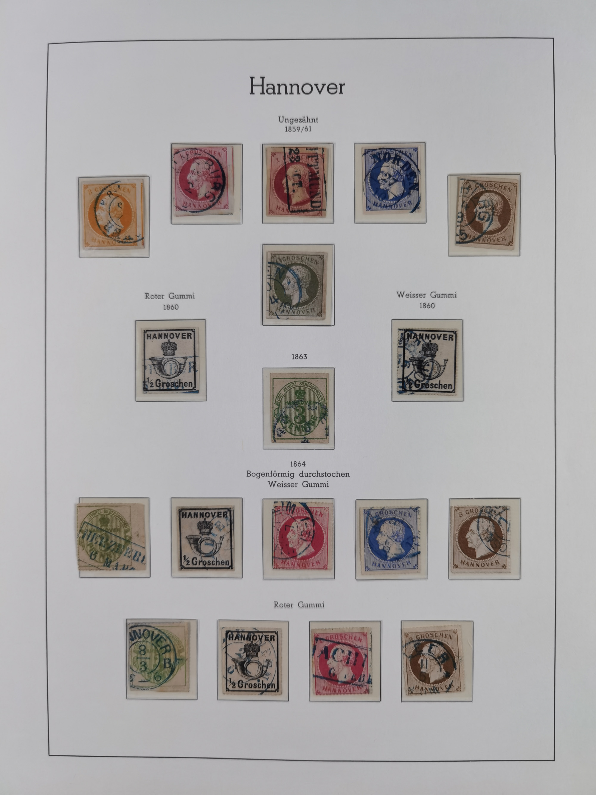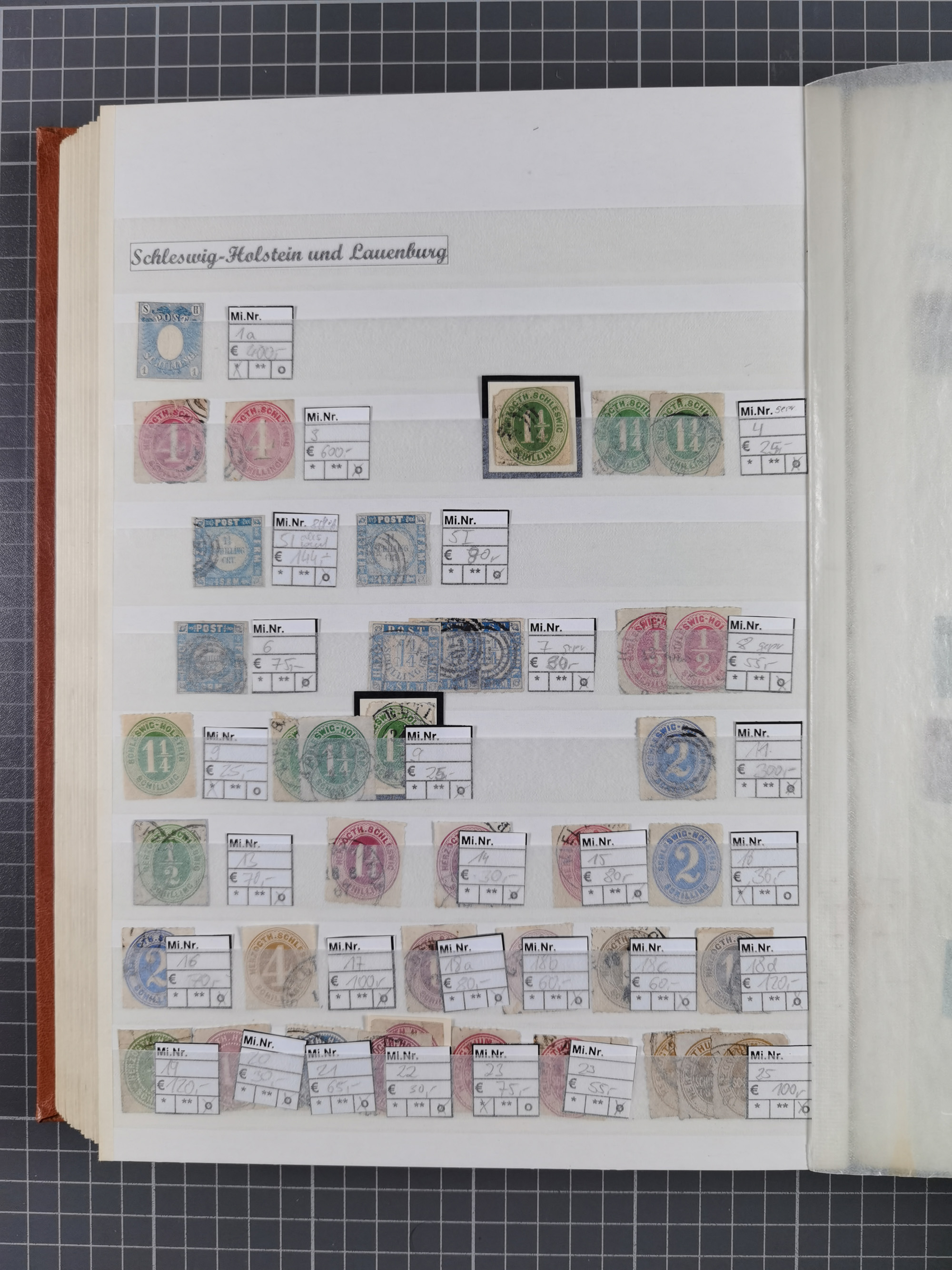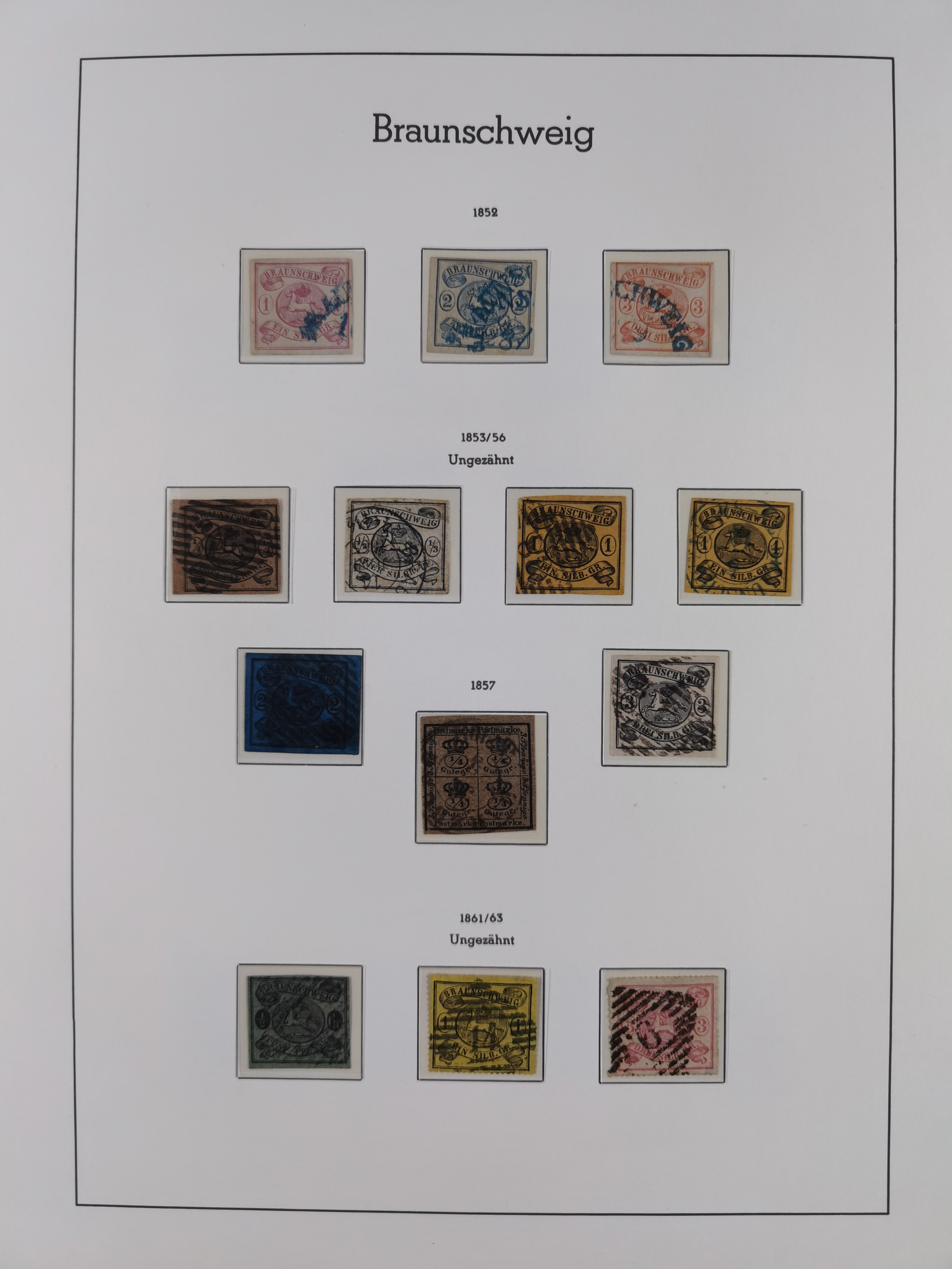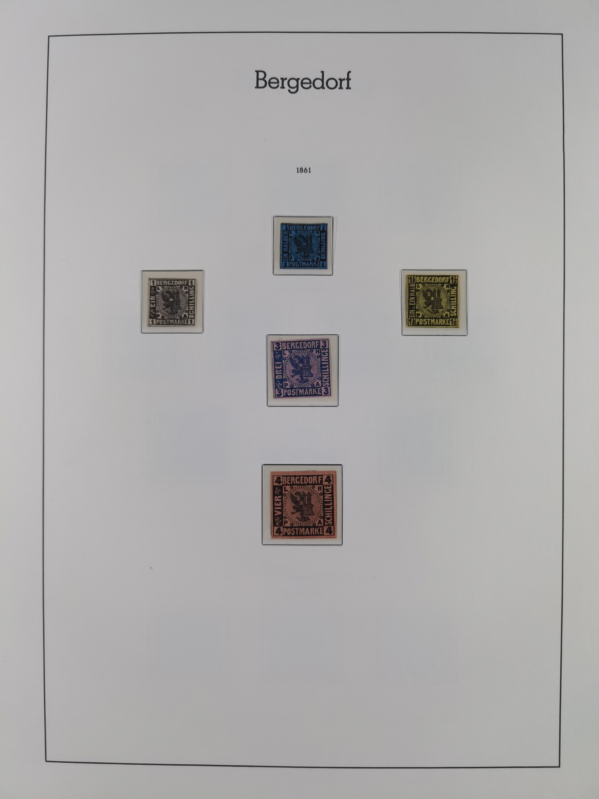1852/65, gestempelte Sammlung von Bergedorf bis Schleswig Holstein mit besseren Marken, dabei u.a. Bergedorf Randstück Mi.-Nr. 1a (FA Jakubek), Mi.-Nr. 1b (FA Jakubek, laut Dr. Mozek Stempel nicht prüfbar) und Mi.-Nr. 2 (FA Dr. Mozek BPP), Braunschweig mit besseren Werten in zum Teil fehlerhafter Erhaltung, Hannover mit einigen Briefen, Helgoland Mi.-Nr. 19Aa auf Brief mit zwei weiteren Marken und Schleswig Holstein mit sechs Marken