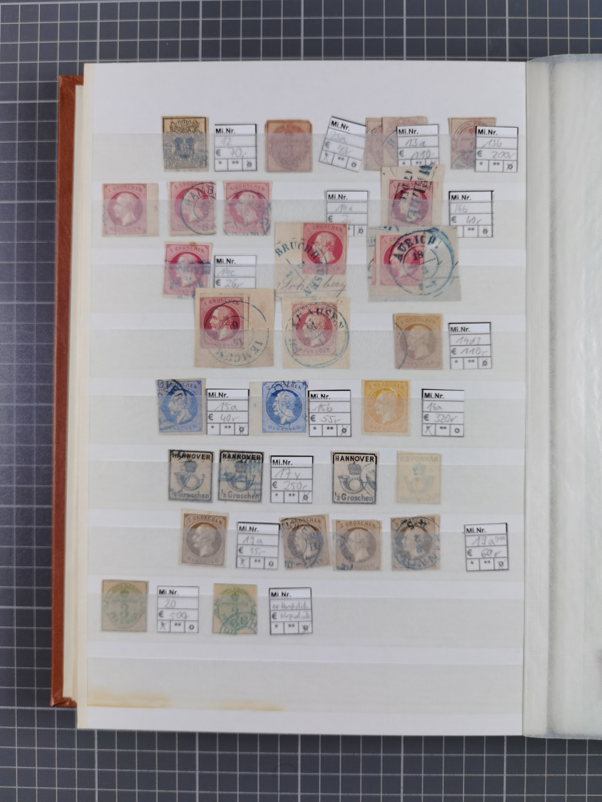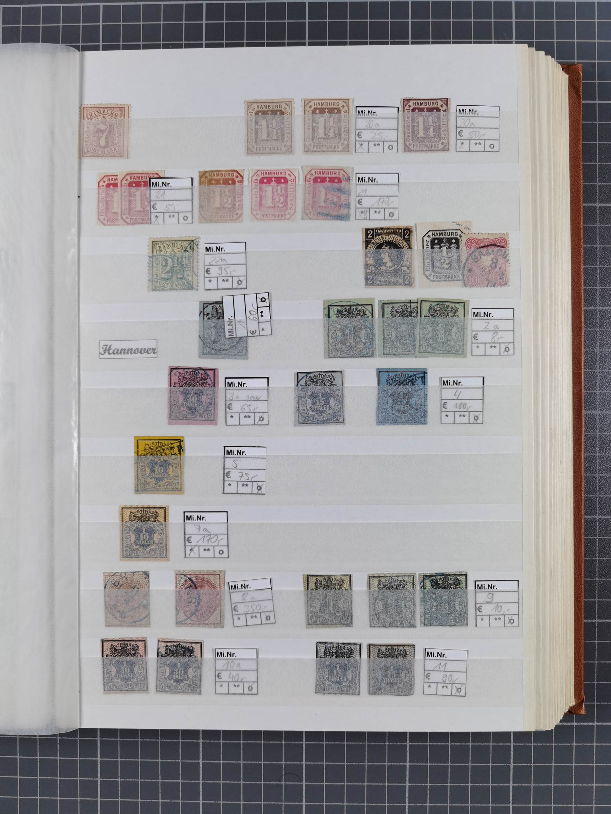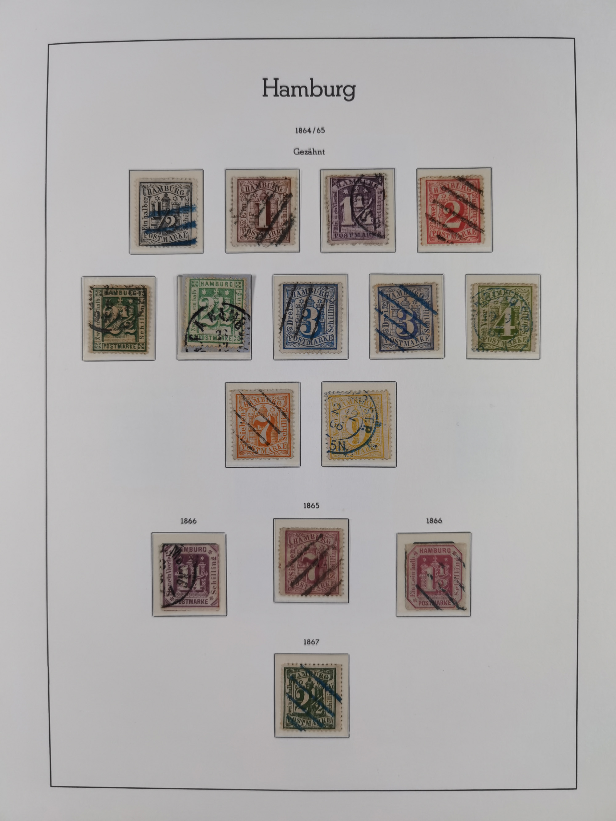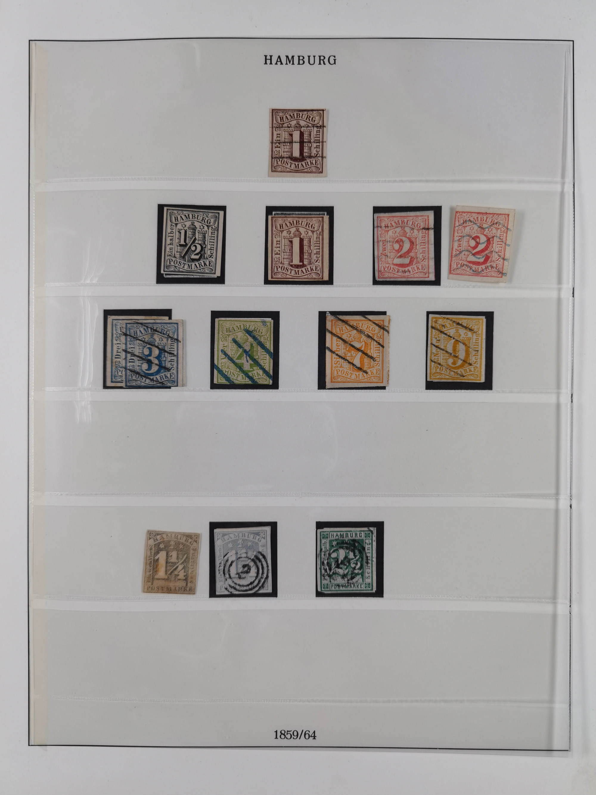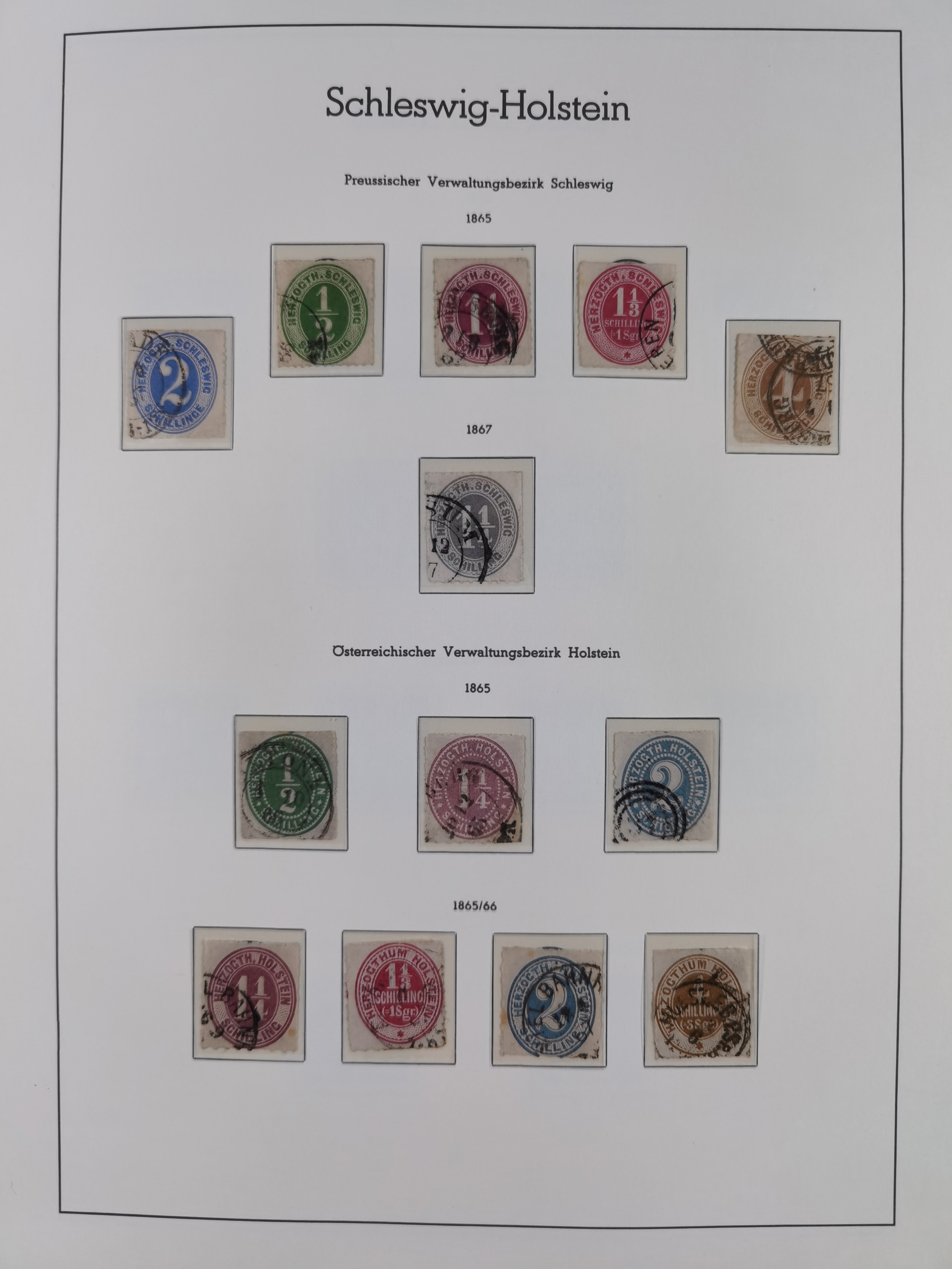1852/65, gestempelte Sammlung von Bergedorf bis Schleswig Holstein mit besseren Marken, dabei u.a. Bergedorf Randstück Mi.-Nr. 1a (FA Jakubek), Mi.-Nr. 1b (FA Jakubek, laut Dr. Mozek Stempel nicht prüfbar) und Mi.-Nr. 2 (FA Dr. Mozek BPP), Braunschweig mit besseren Werten in zum Teil fehlerhafter Erhaltung, Hannover mit einigen Briefen, Helgoland Mi.-Nr. 19Aa auf Brief mit zwei weiteren Marken und Schleswig Holstein mit sechs Marken