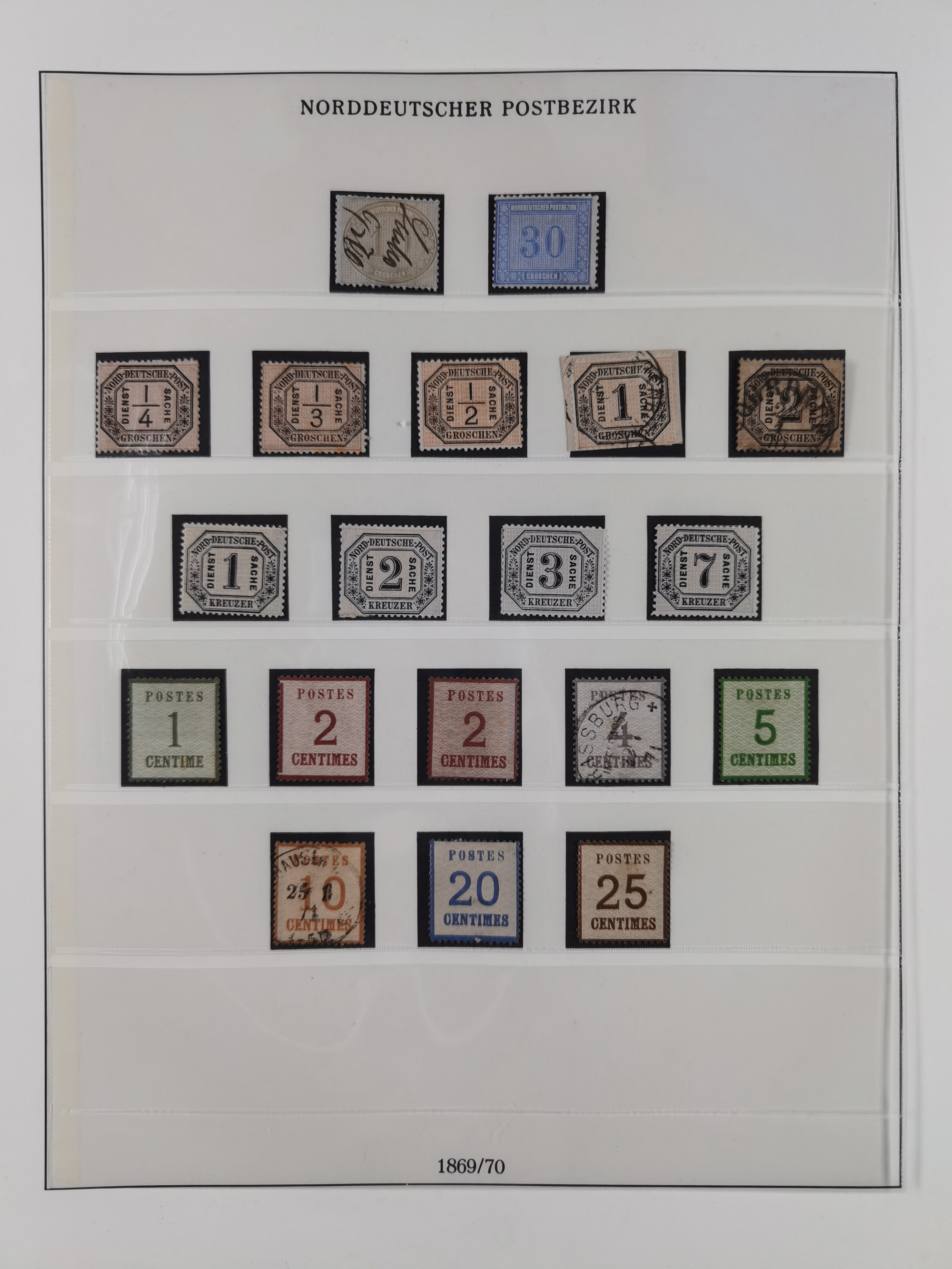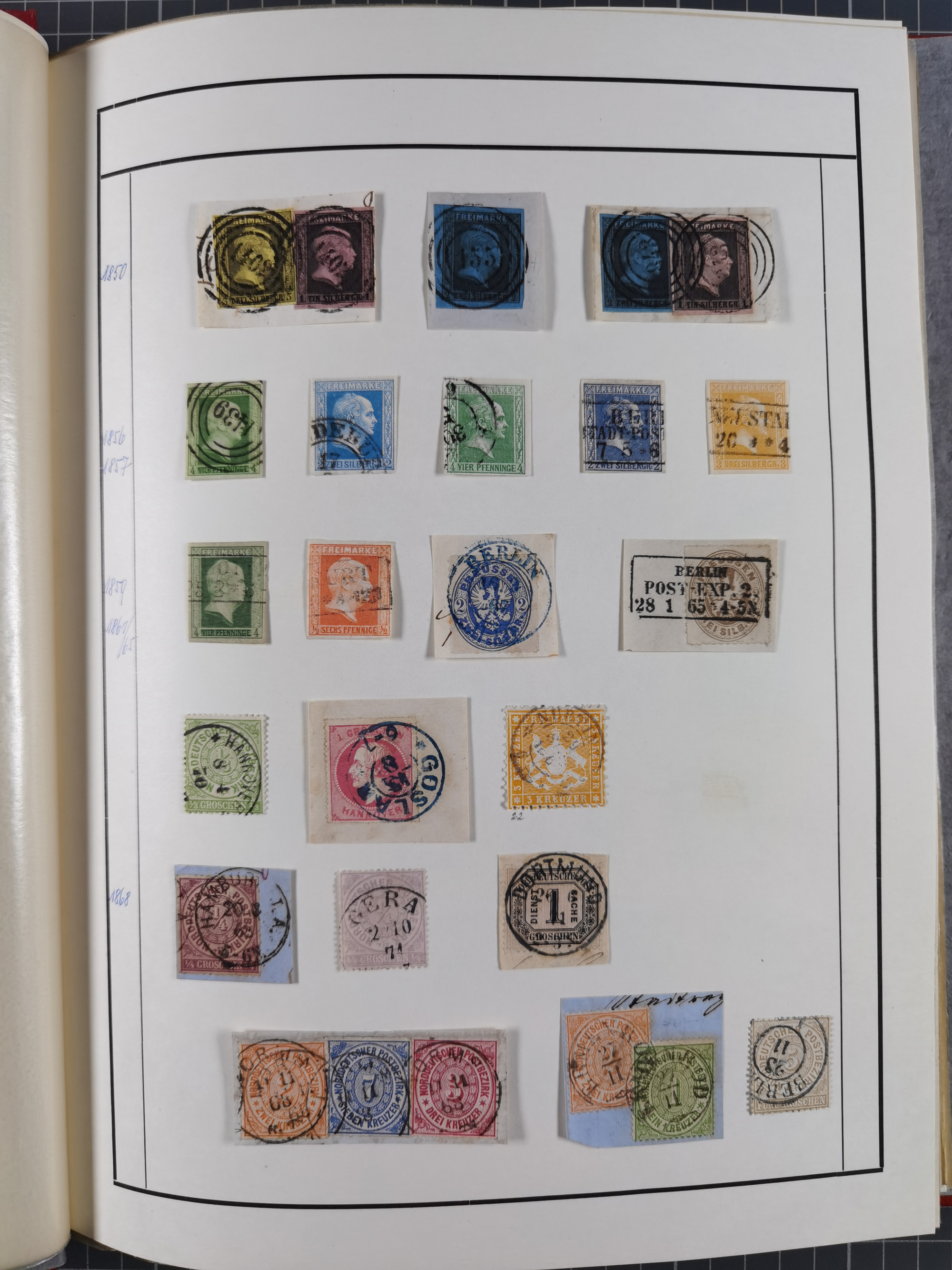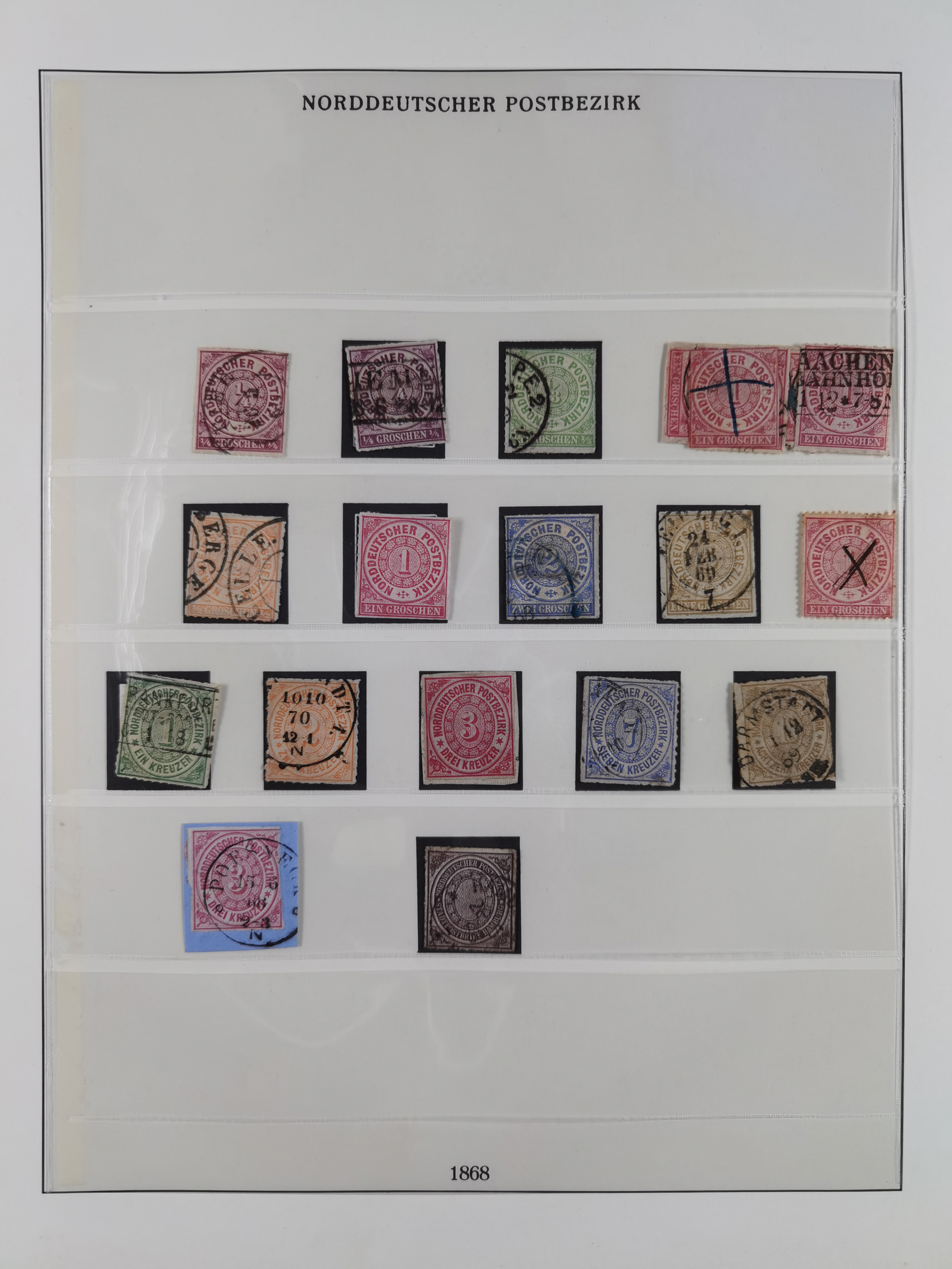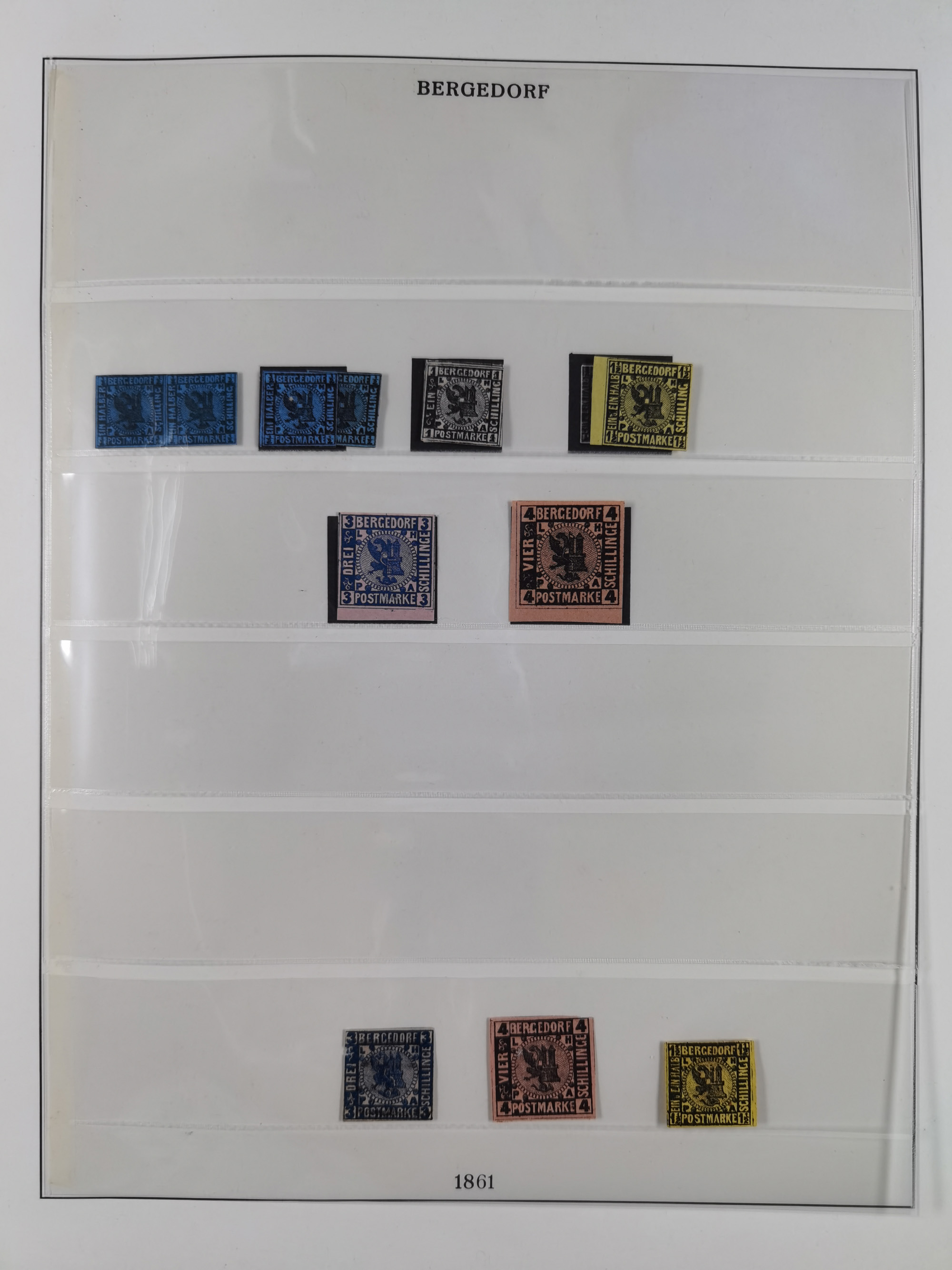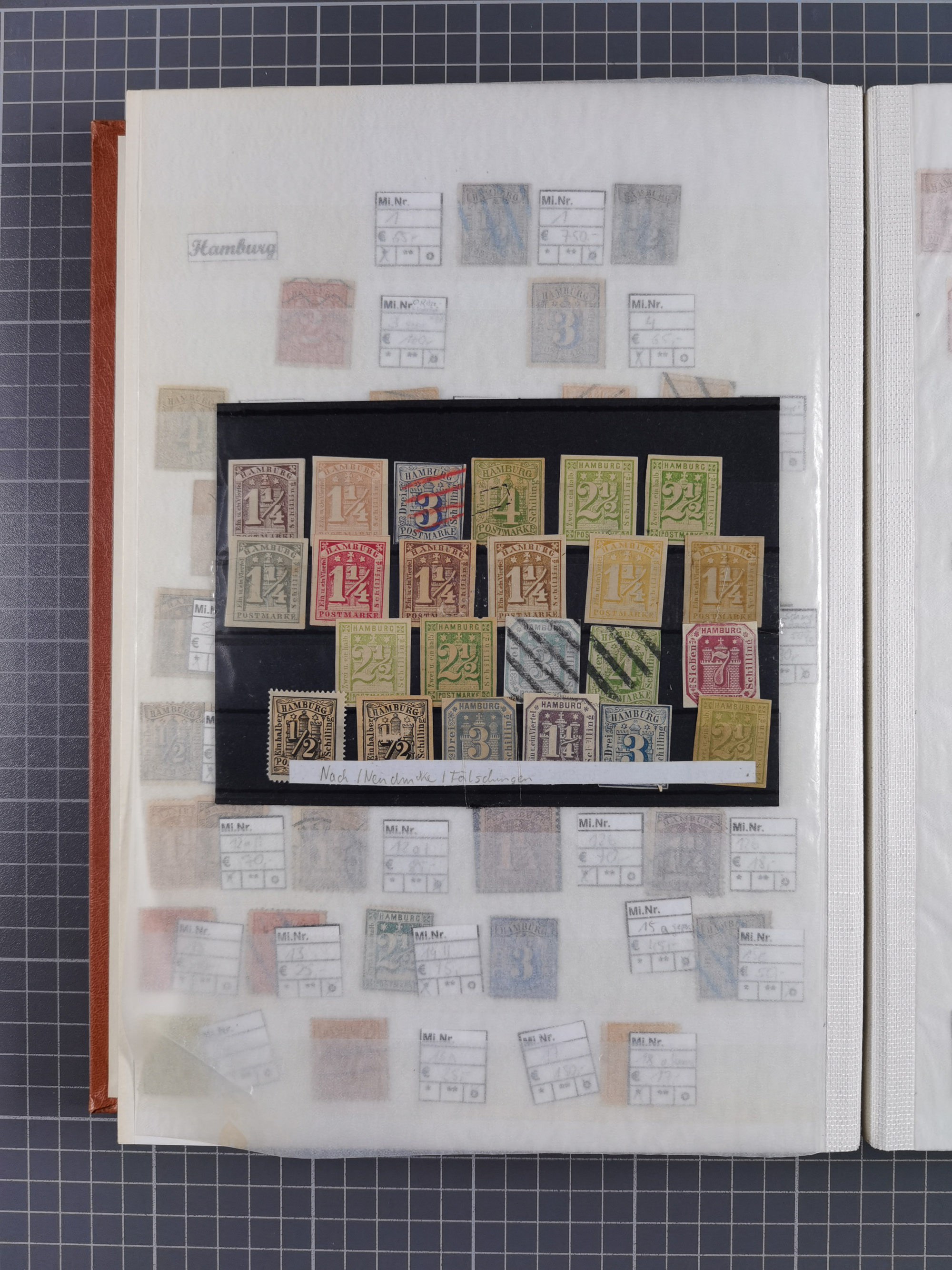 Bergedorf bis NDP, meist gestempelte und ungebrauchte Sammlung mit besseren Marken, Farben und Besonderheiten, Schwerpunkt bei Preußen, Sachsen und NDP. Dabei u.a. Preußen mit Mi.-Nr. 2c gestempelt (KB Wasels BPP), Mi.-Nr. 5 b gestempelt (FB Flemming BPP), Mi.-Nr. 11c gestempelt (KB Brettl BPP) und Mi.-Nr. 18a mit rotem Bahnpost-L3 “COELN/VERVIERS” (FB Flemming BPP) sowie Sachsen mit u.a. Mi.-Nr. 2Ic und 2IId gestempelt (jeweils FA Vaatz BPP), Mi.-Nr. 12b gestempelt (FA Vaatz BPP) und Mi.-Nr. 13a gestempelt (FA Vaatz BPP). Dazu eine stark reparierte Sachsen Mi.-Nr. 1a gestempelt (sign. Richter). Viele bessere Marken bzw. Farben sind signiert oder haben KB und FB, sauber im Steckbuch