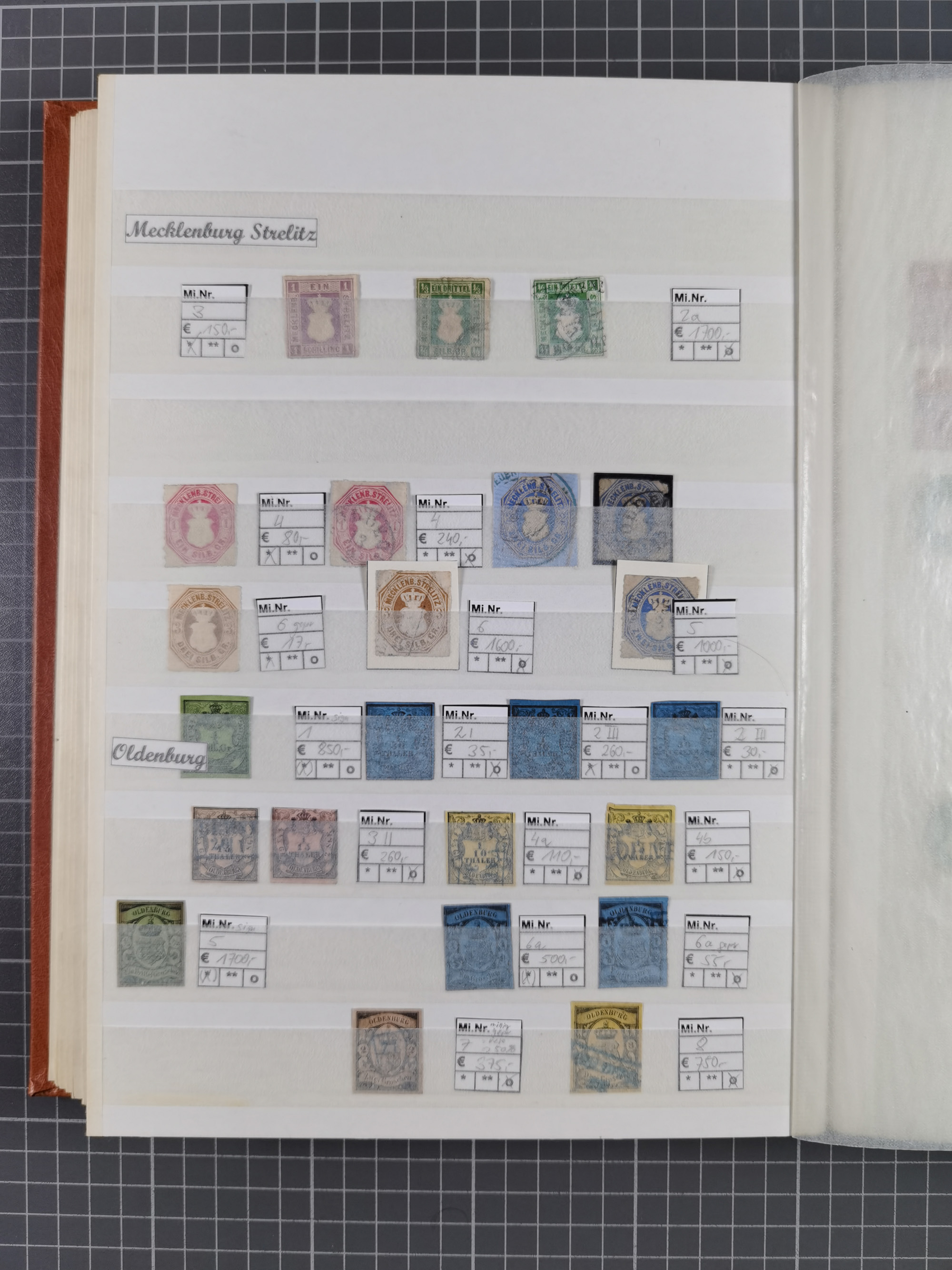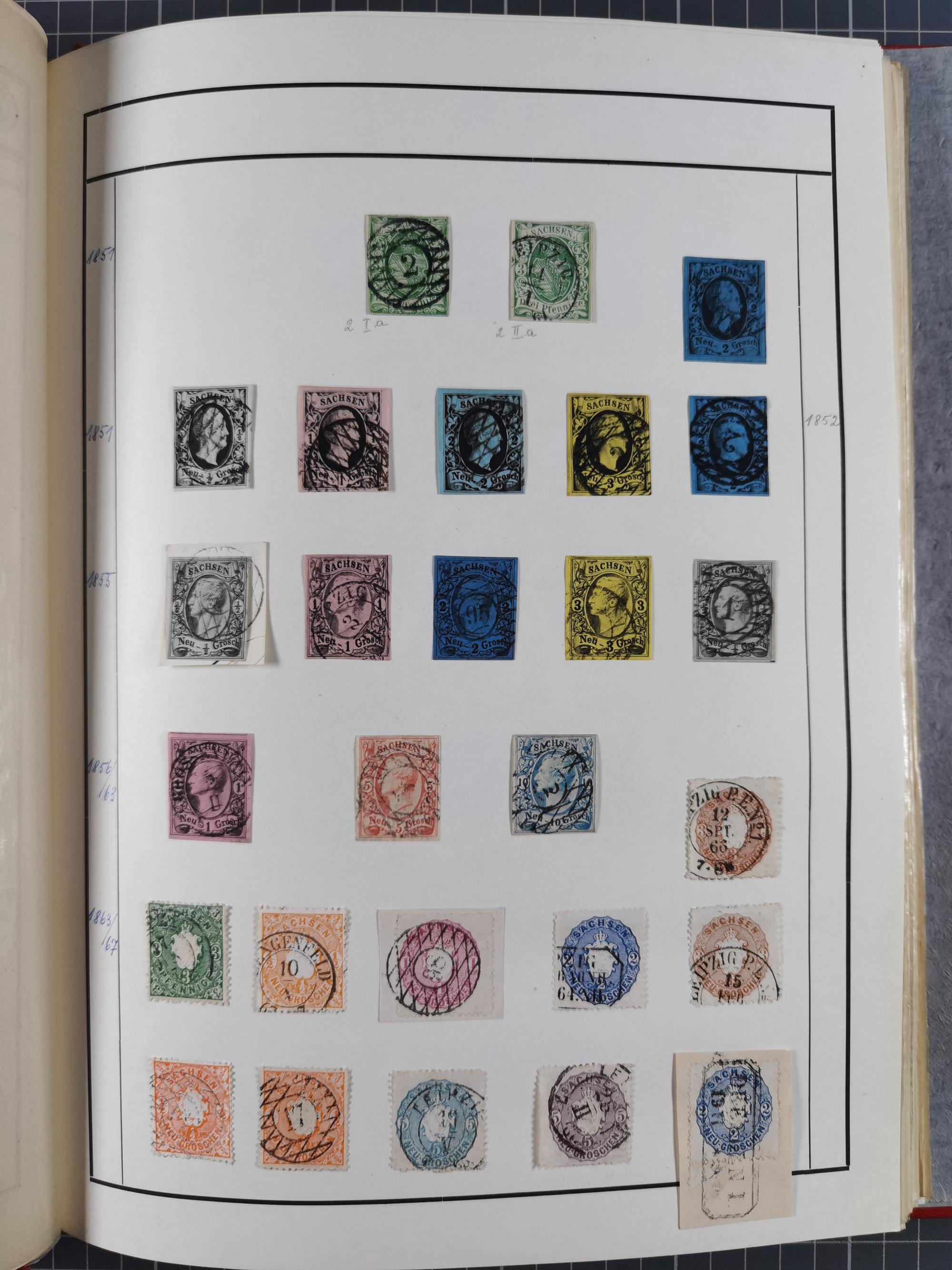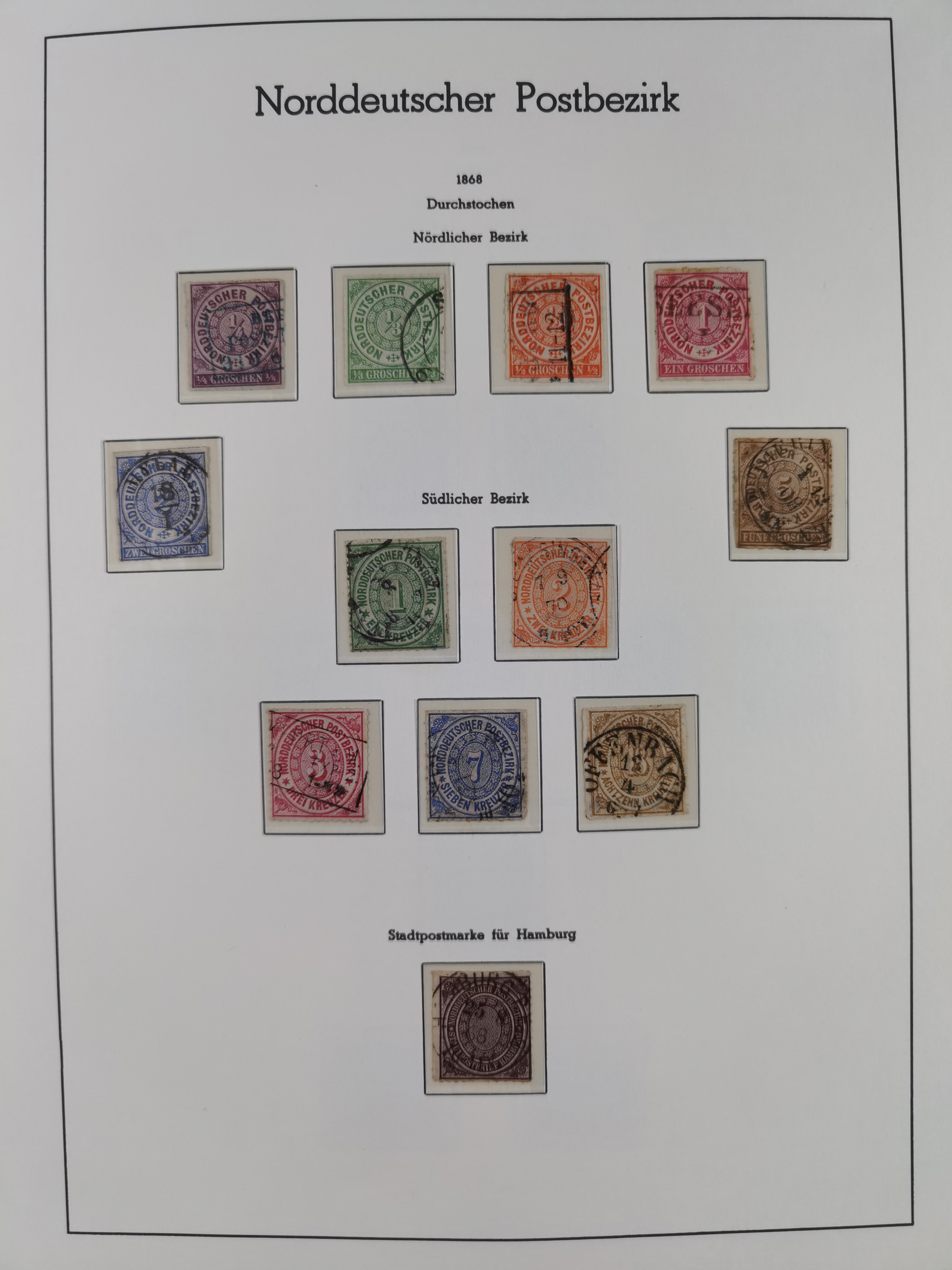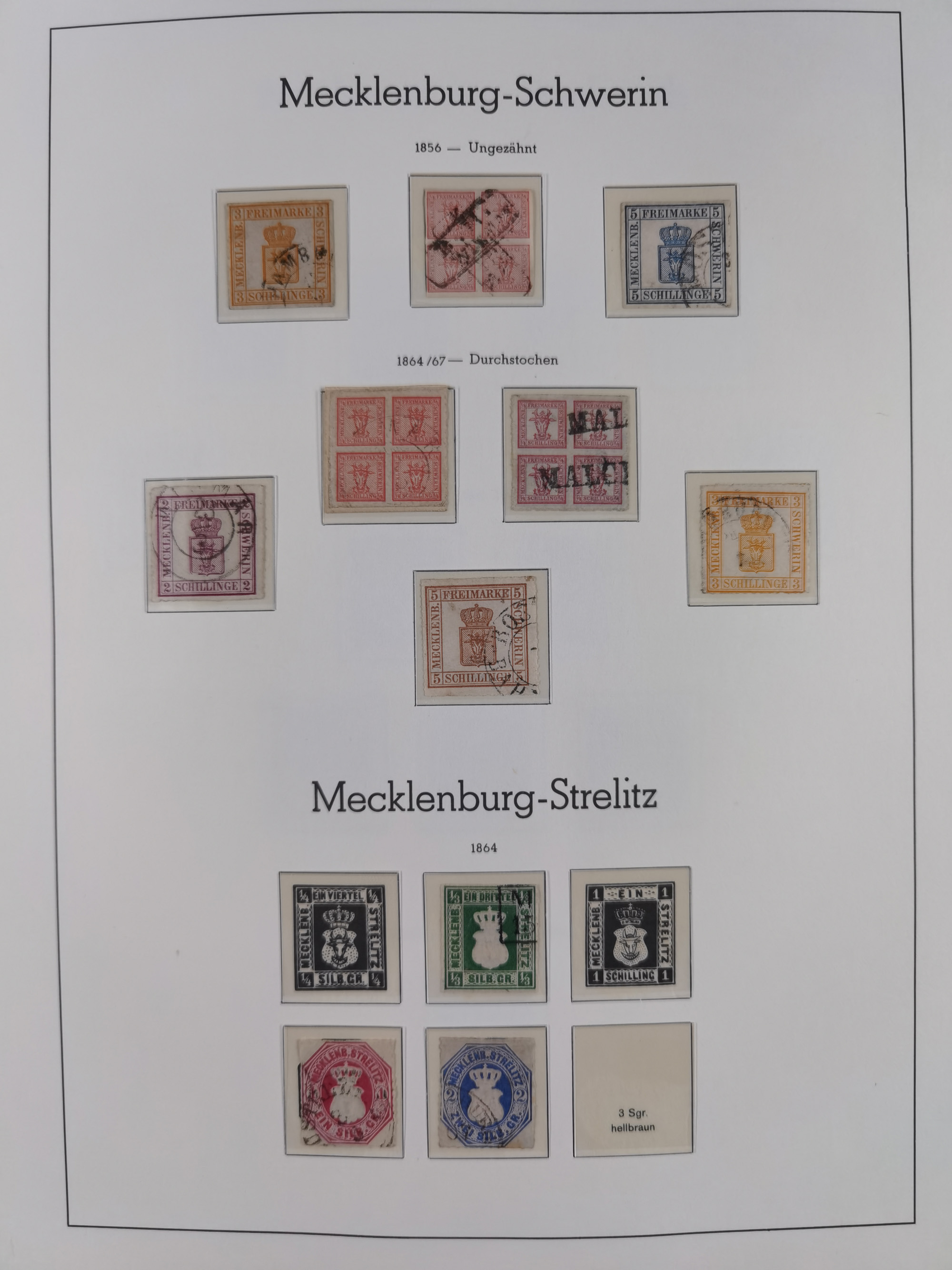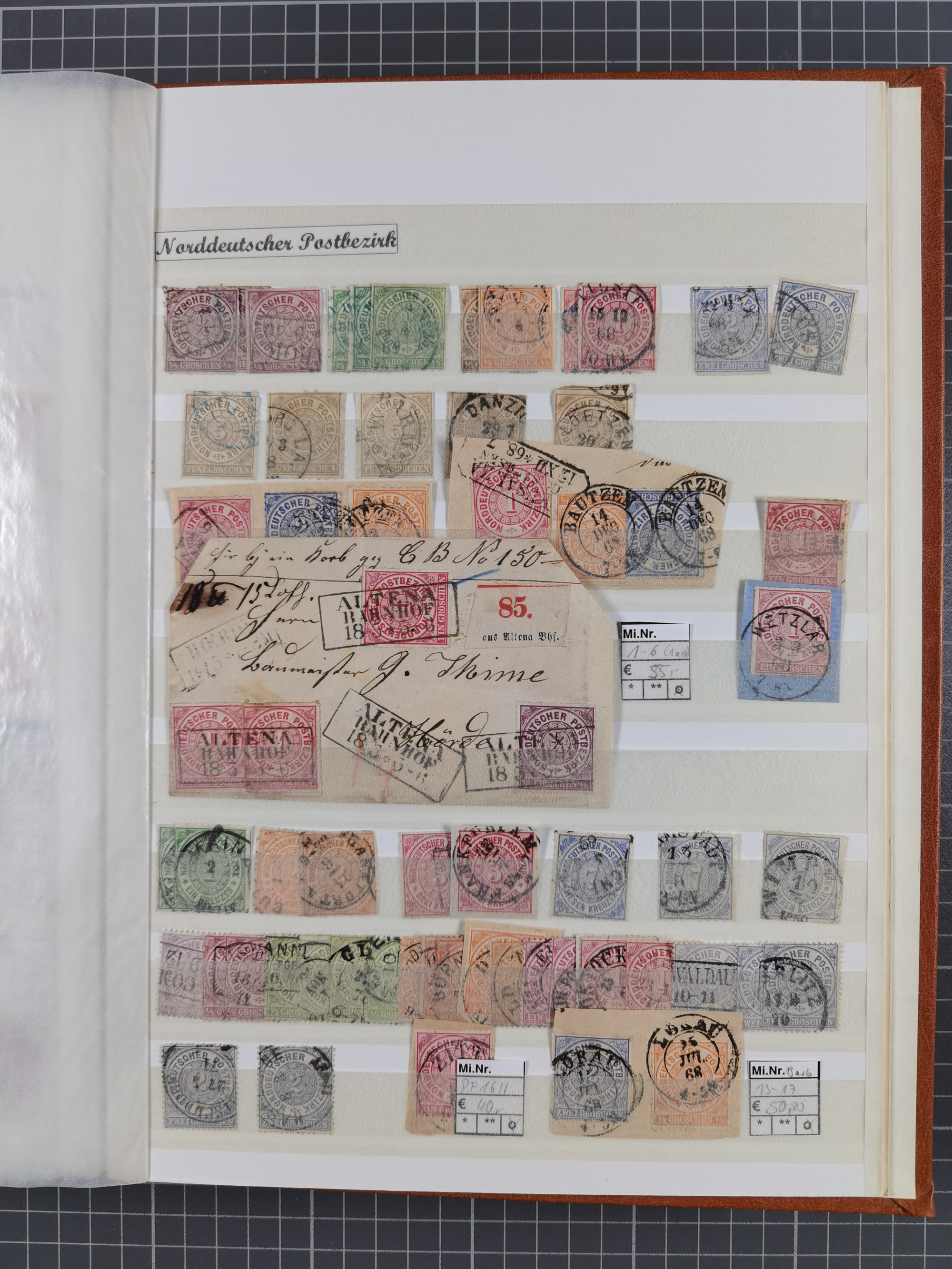 Bergedorf bis NDP, meist gestempelte und ungebrauchte Sammlung mit besseren Marken, Farben und Besonderheiten, Schwerpunkt bei Preußen, Sachsen und NDP. Dabei u.a. Preußen mit Mi.-Nr. 2c gestempelt (KB Wasels BPP), Mi.-Nr. 5 b gestempelt (FB Flemming BPP), Mi.-Nr. 11c gestempelt (KB Brettl BPP) und Mi.-Nr. 18a mit rotem Bahnpost-L3 “COELN/VERVIERS” (FB Flemming BPP) sowie Sachsen mit u.a. Mi.-Nr. 2Ic und 2IId gestempelt (jeweils FA Vaatz BPP), Mi.-Nr. 12b gestempelt (FA Vaatz BPP) und Mi.-Nr. 13a gestempelt (FA Vaatz BPP). Dazu eine stark reparierte Sachsen Mi.-Nr. 1a gestempelt (sign. Richter). Viele bessere Marken bzw. Farben sind signiert oder haben KB und FB, sauber im Steckbuch