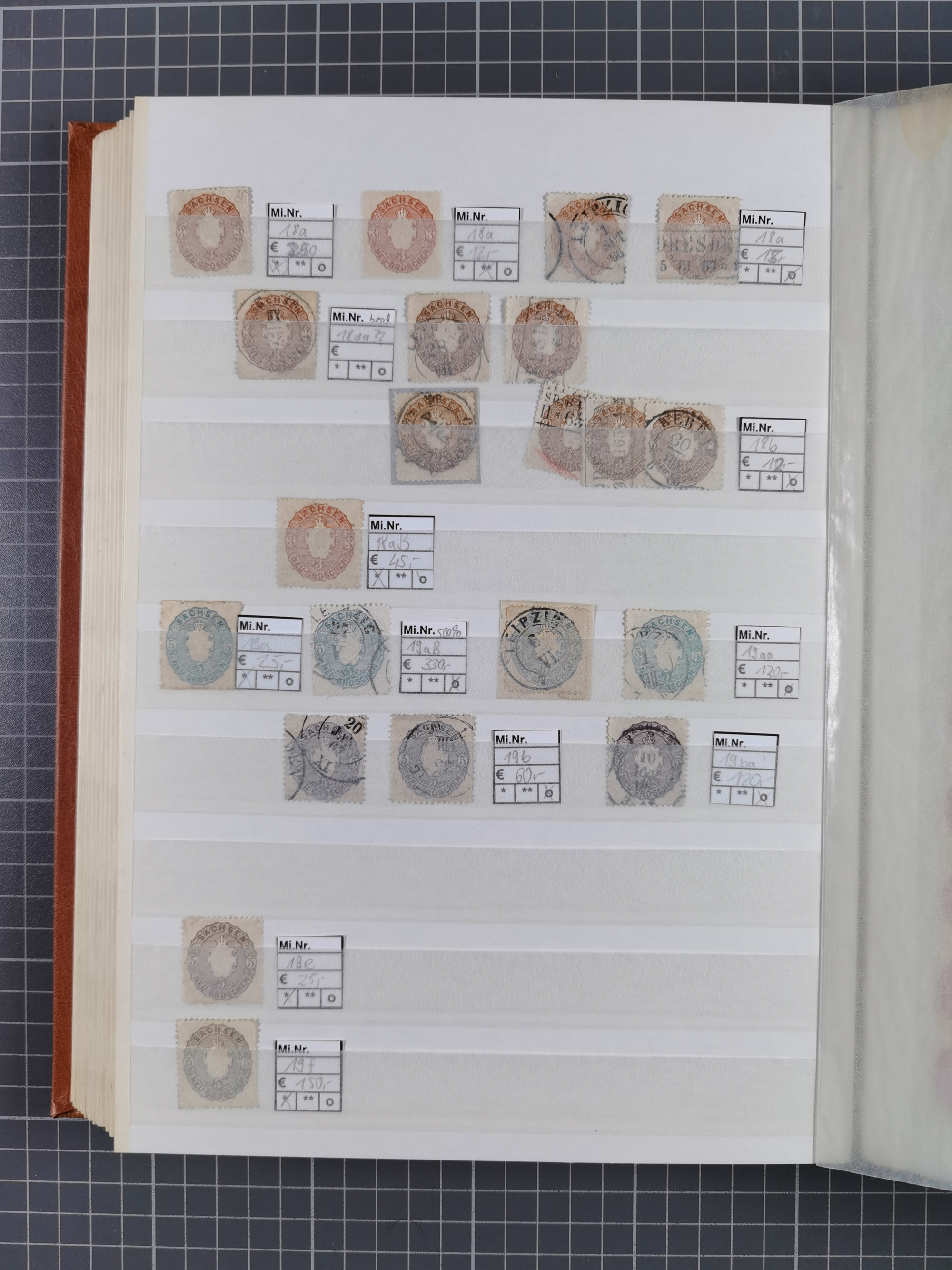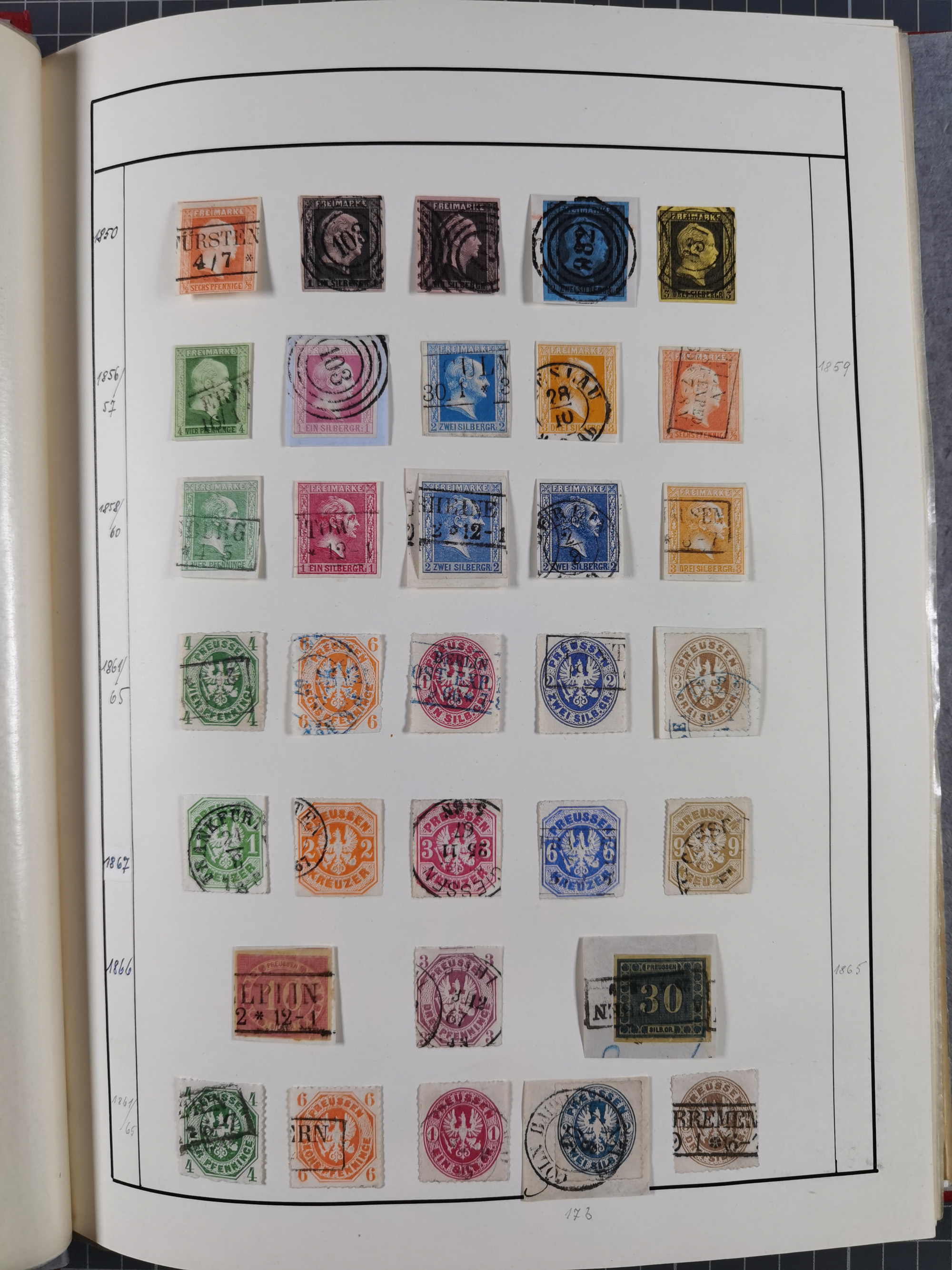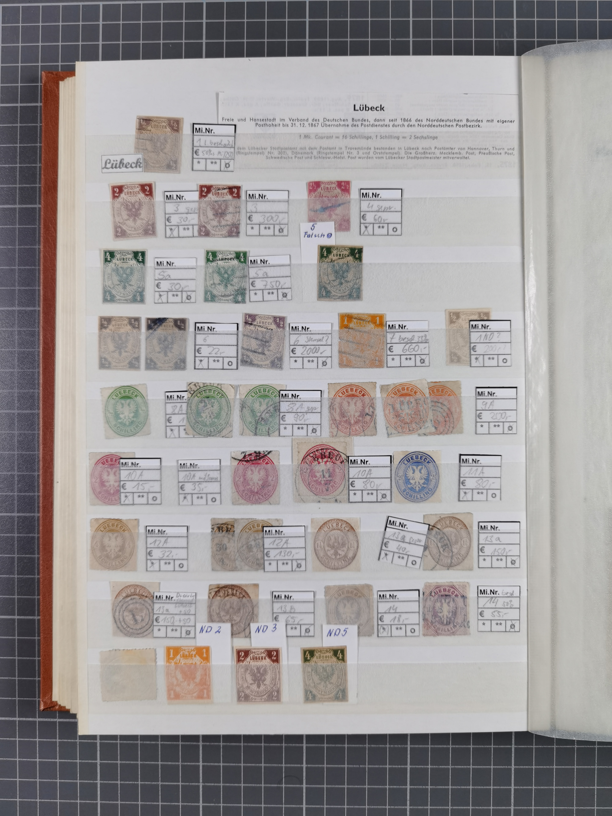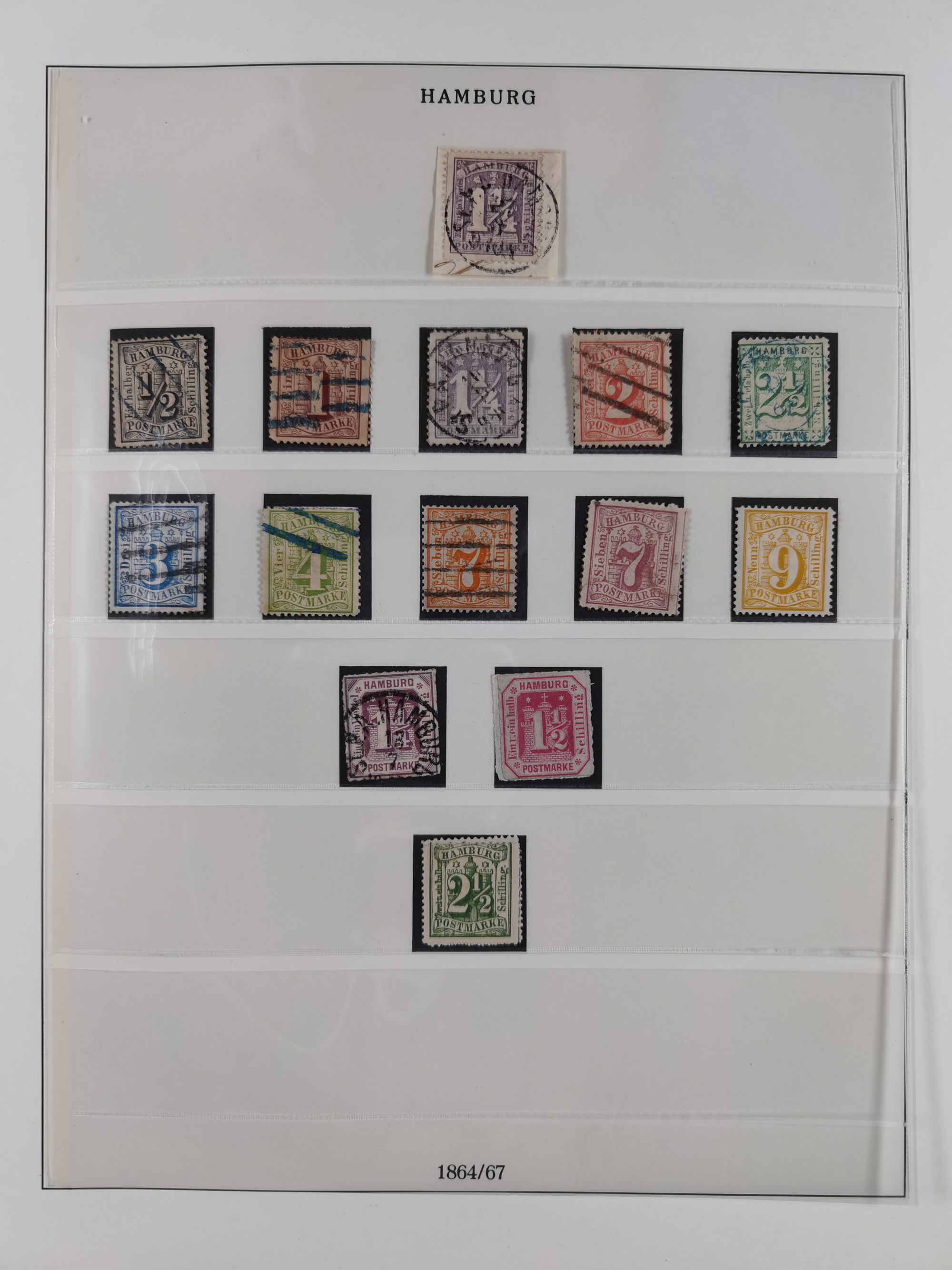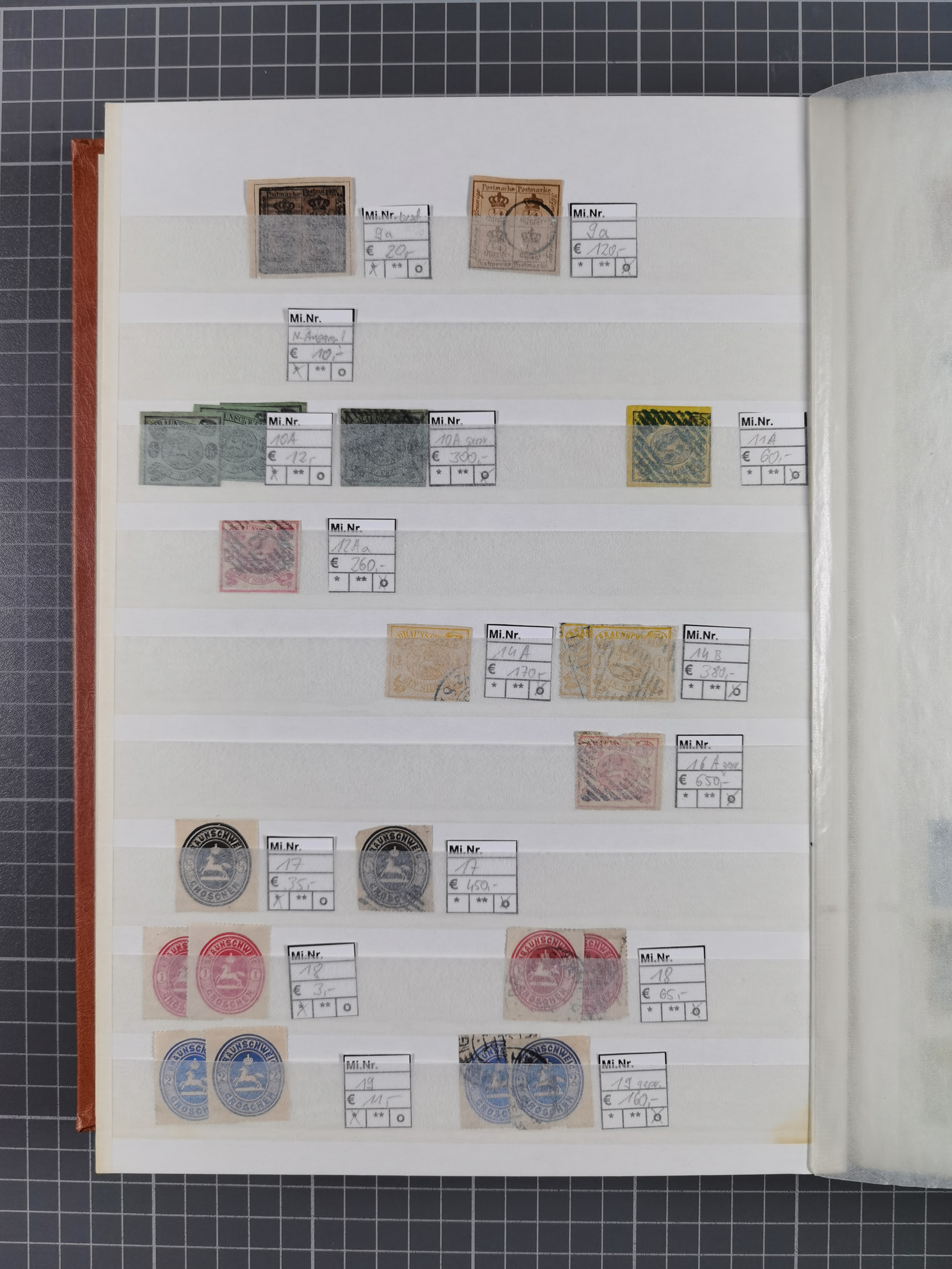 Bergedorf bis NDP, meist gestempelte und ungebrauchte Sammlung mit besseren Marken, Farben und Besonderheiten, Schwerpunkt bei Preußen, Sachsen und NDP. Dabei u.a. Preußen mit Mi.-Nr. 2c gestempelt (KB Wasels BPP), Mi.-Nr. 5 b gestempelt (FB Flemming BPP), Mi.-Nr. 11c gestempelt (KB Brettl BPP) und Mi.-Nr. 18a mit rotem Bahnpost-L3 “COELN/VERVIERS” (FB Flemming BPP) sowie Sachsen mit u.a. Mi.-Nr. 2Ic und 2IId gestempelt (jeweils FA Vaatz BPP), Mi.-Nr. 12b gestempelt (FA Vaatz BPP) und Mi.-Nr. 13a gestempelt (FA Vaatz BPP). Dazu eine stark reparierte Sachsen Mi.-Nr. 1a gestempelt (sign. Richter). Viele bessere Marken bzw. Farben sind signiert oder haben KB und FB, sauber im Steckbuch