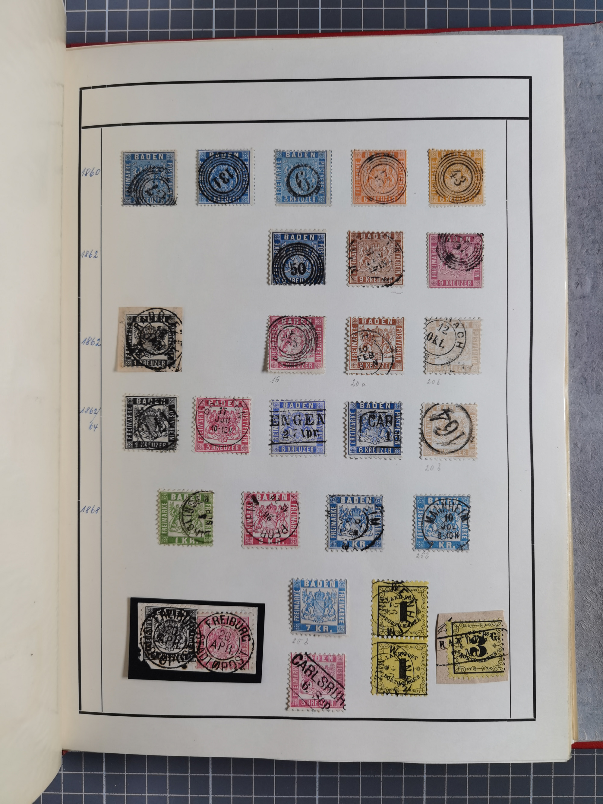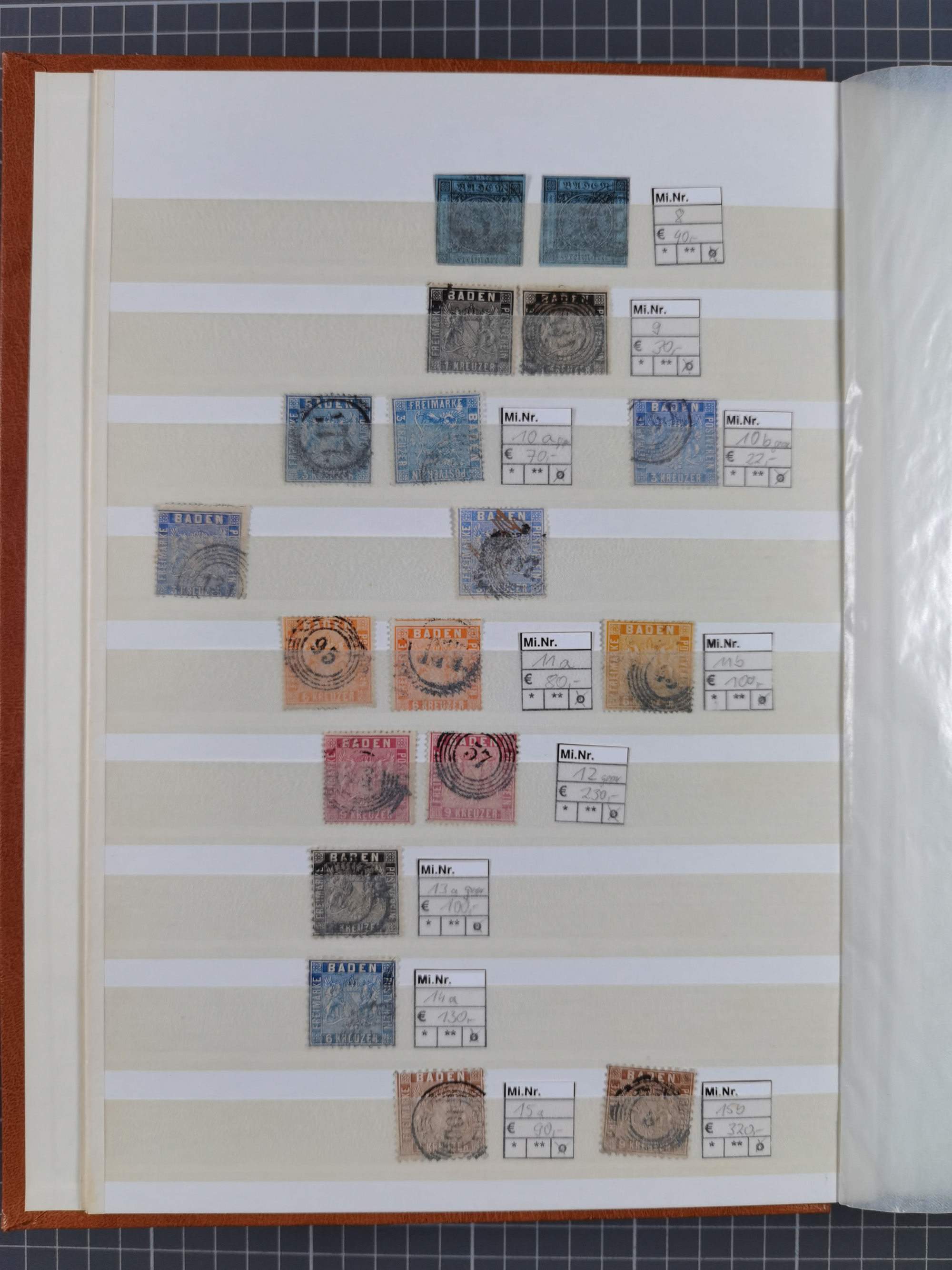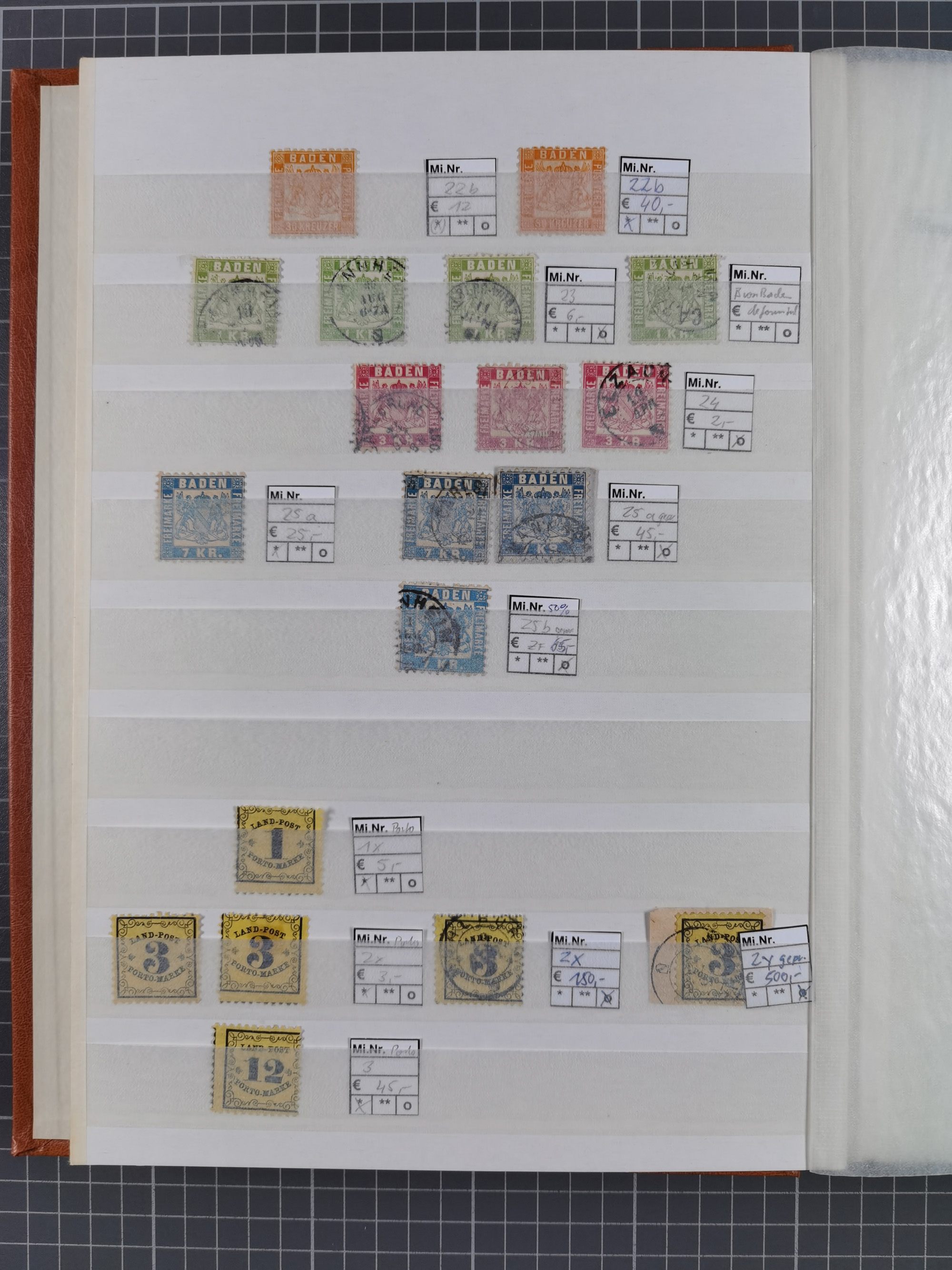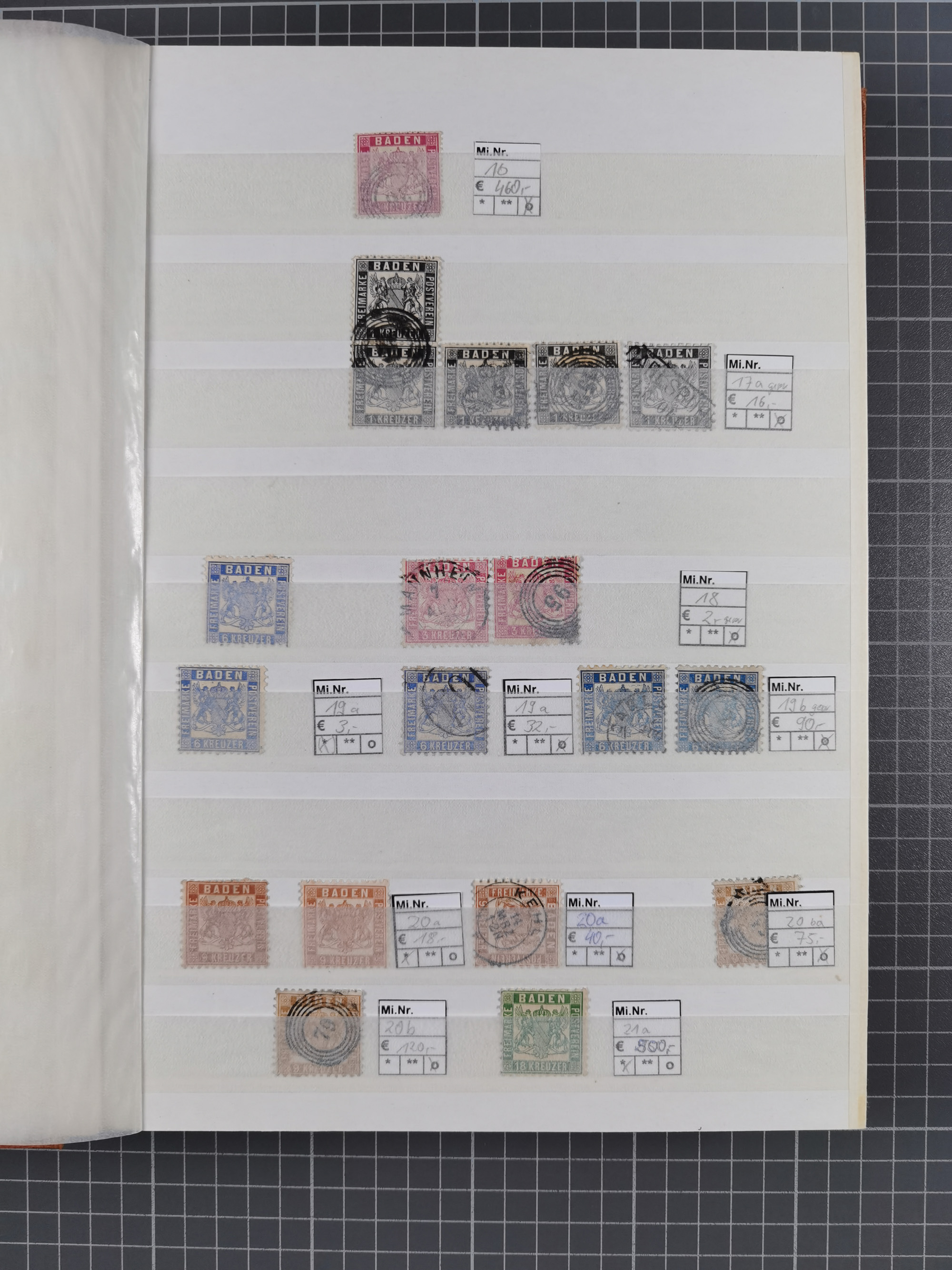 Baden bis Württemberg, meist ungebrauchter und gestempelter Bestand auf kleinen Steckkarten im Album, sauber sortiert in Mengen bis ca. 8x pro Sorte, zum Teil stark fehlerhafte Erhaltung