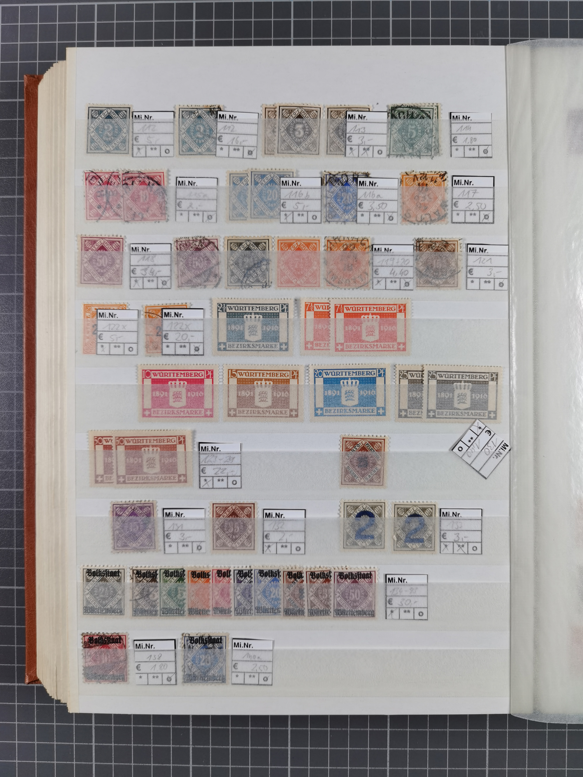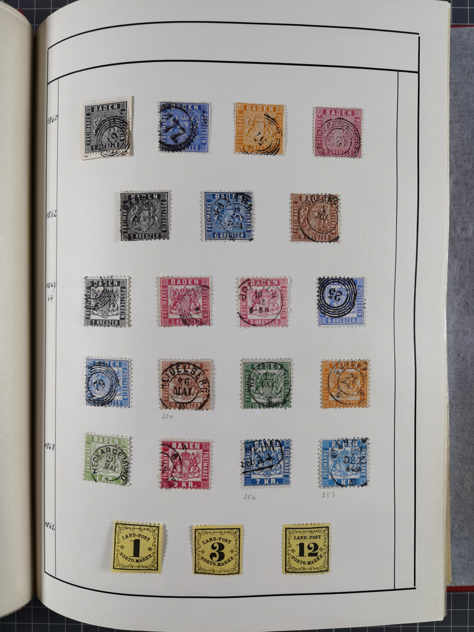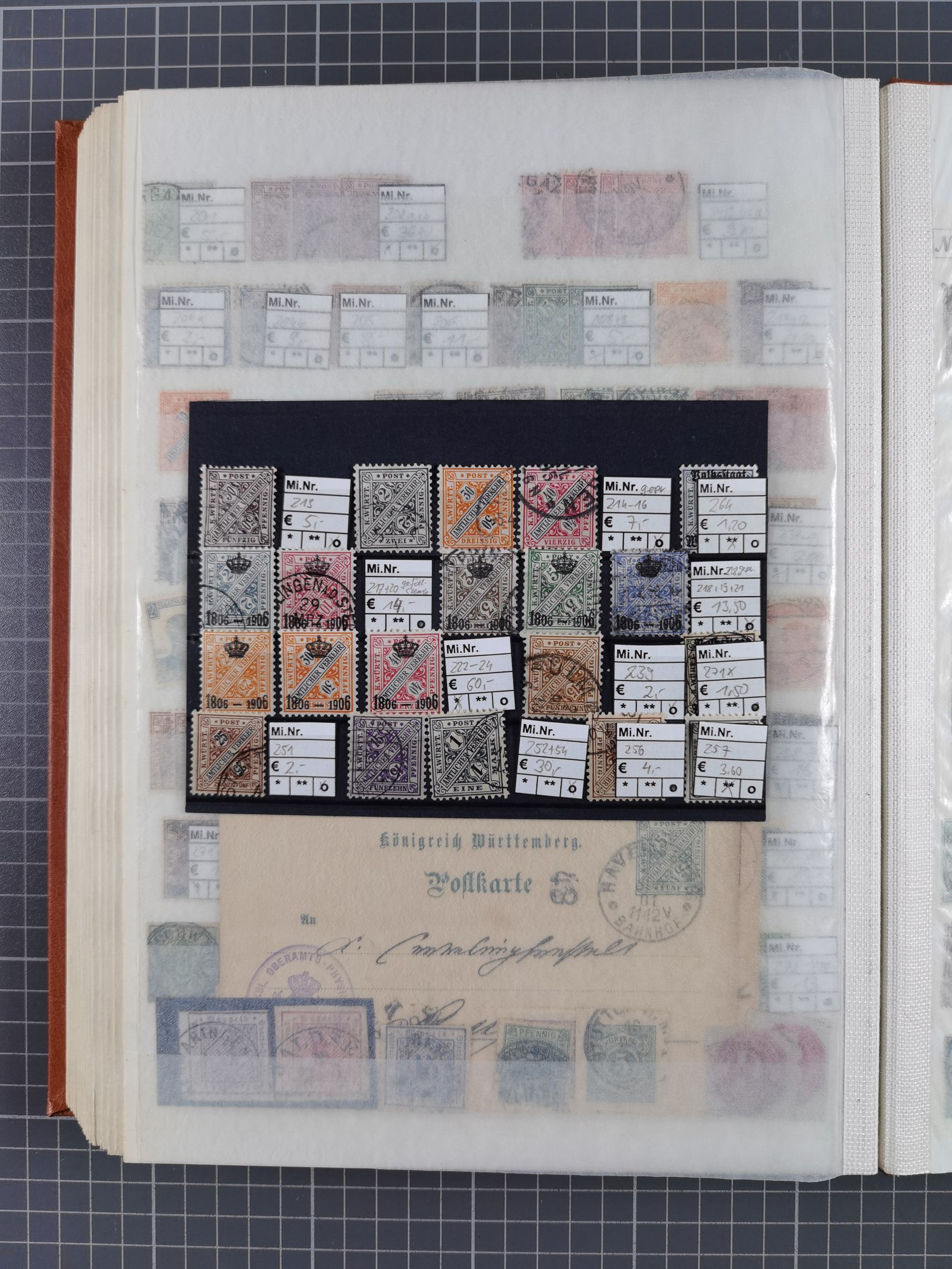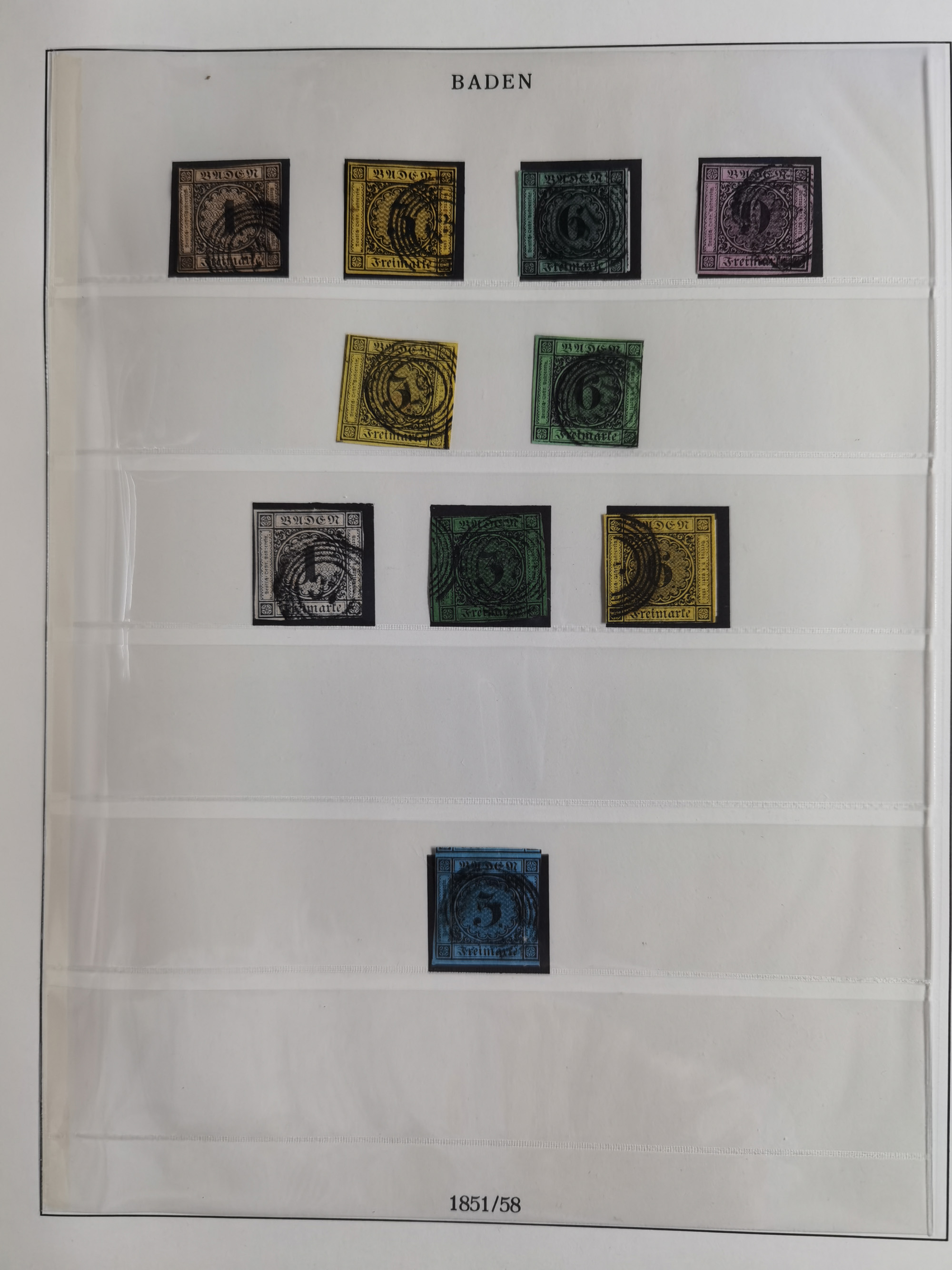 Baden bis Württemberg, meist ungebrauchter und gestempelter Bestand auf kleinen Steckkarten im Album, sauber sortiert in Mengen bis ca. 8x pro Sorte, zum Teil stark fehlerhafte Erhaltung