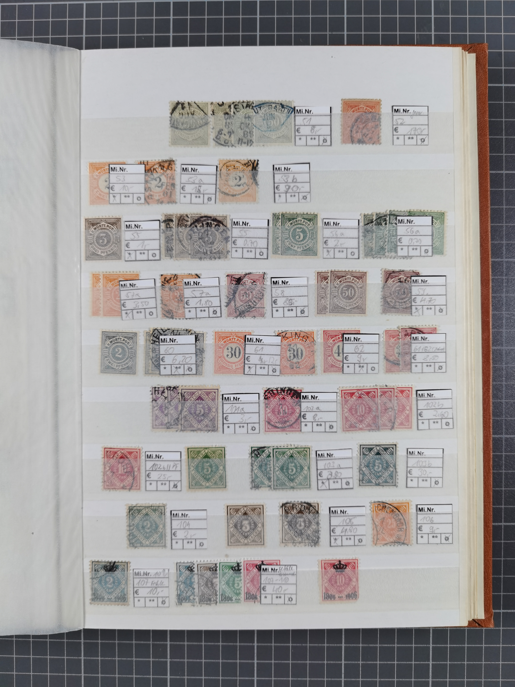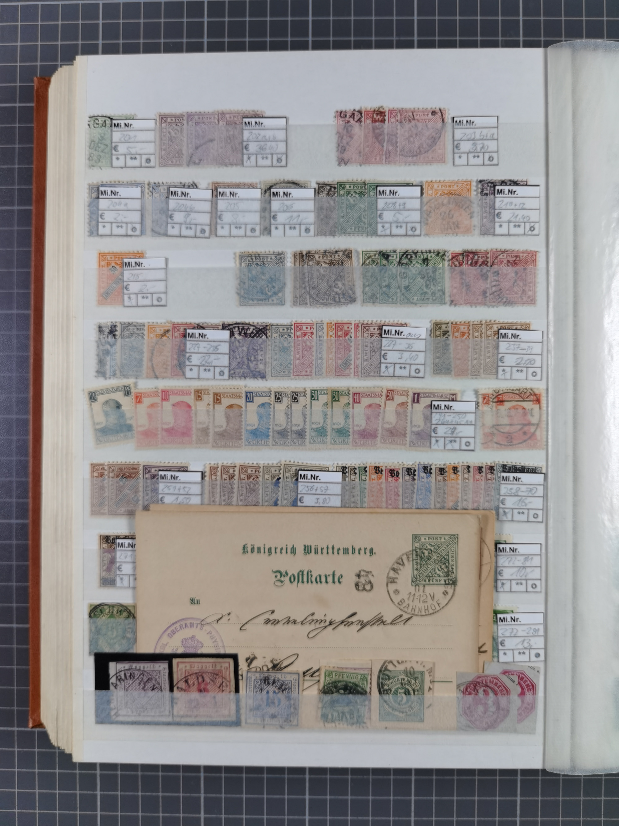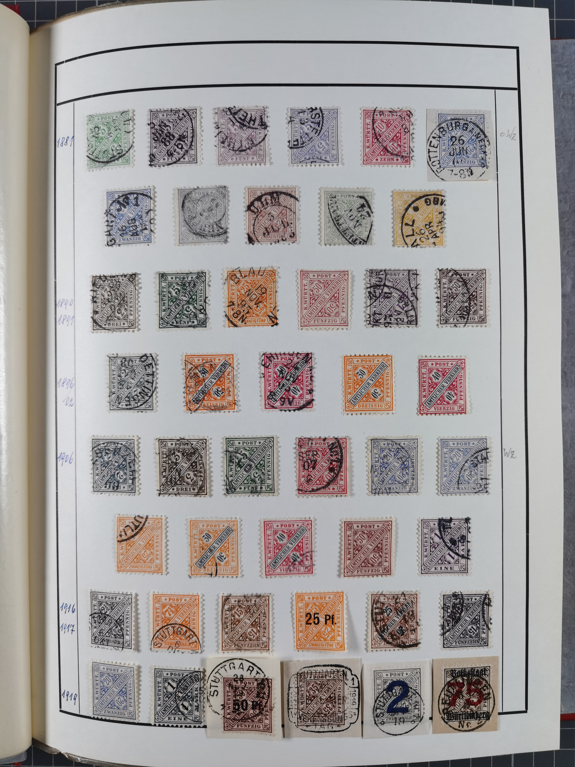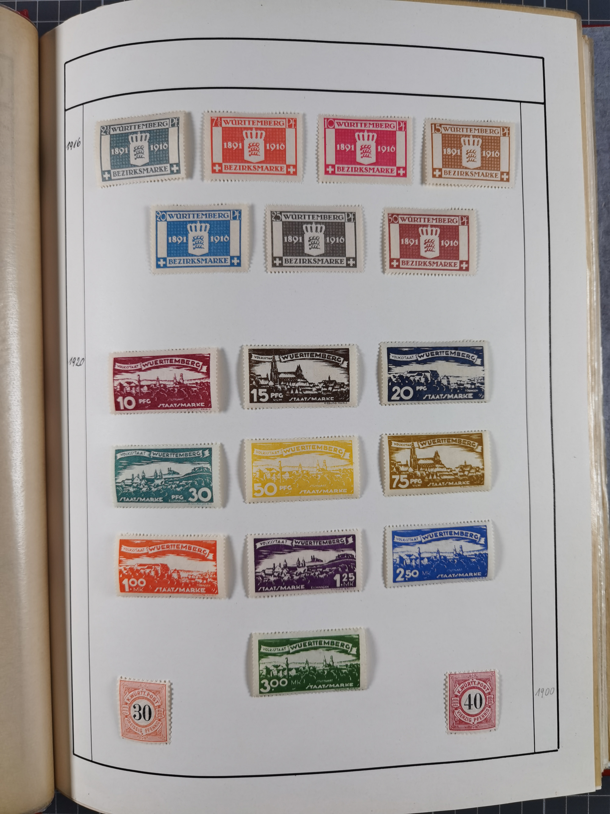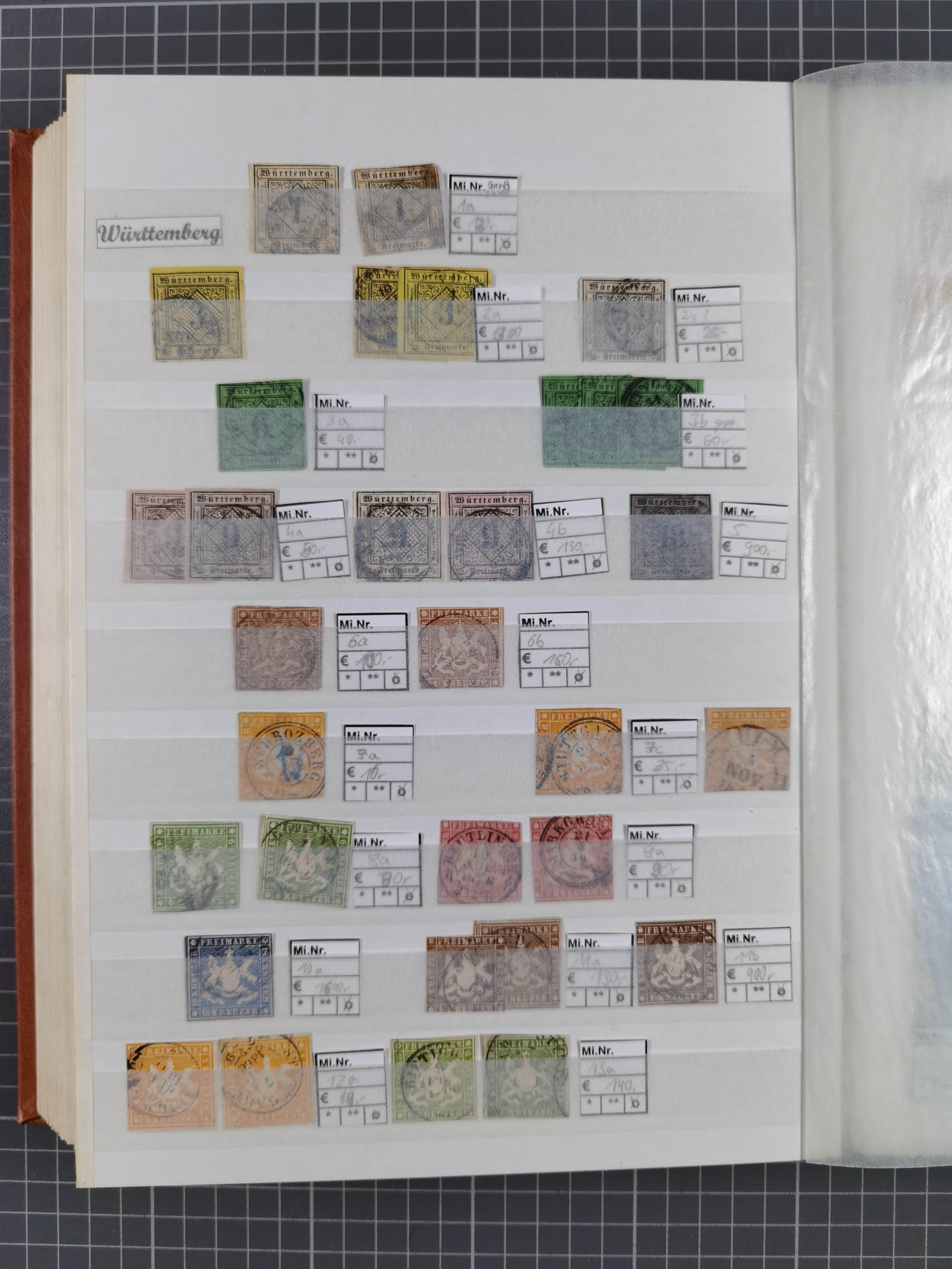 Baden bis Württemberg, meist ungebrauchter und gestempelter Bestand auf kleinen Steckkarten im Album, sauber sortiert in Mengen bis ca. 8x pro Sorte, zum Teil stark fehlerhafte Erhaltung