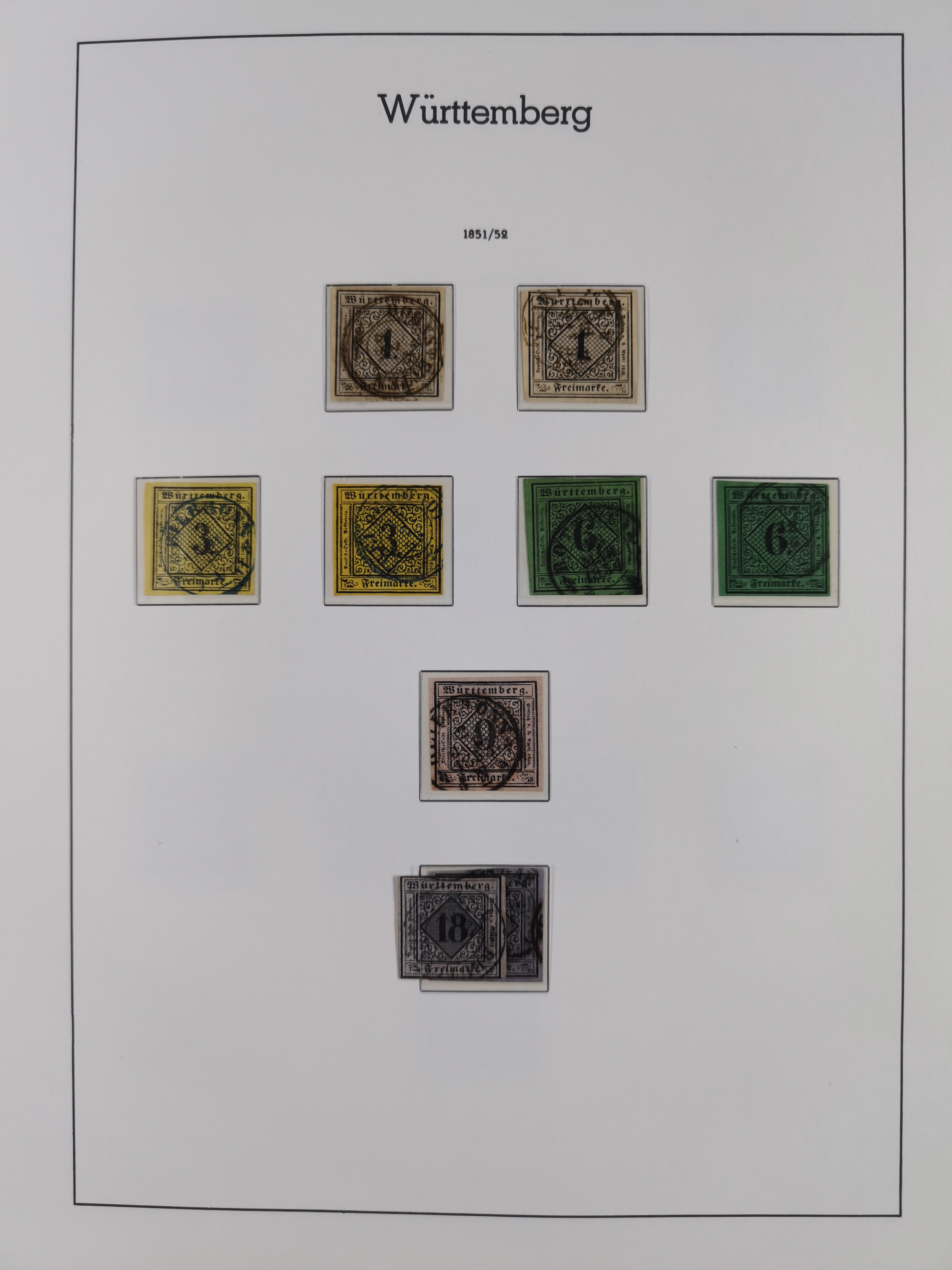 1851/68, meist gestempelte Sammlung inkl. Landpost mit besseren Marken, Farben und einigen Doubletten. Dabei u.a. Mi.-Nr. 1a mit Nummernstempel “164” (FA Englert BPP) und Mi.-Nr. 21b gestempelt (FB Stegmüller). Erhaltung von fehlerhaft bis einwandfrei