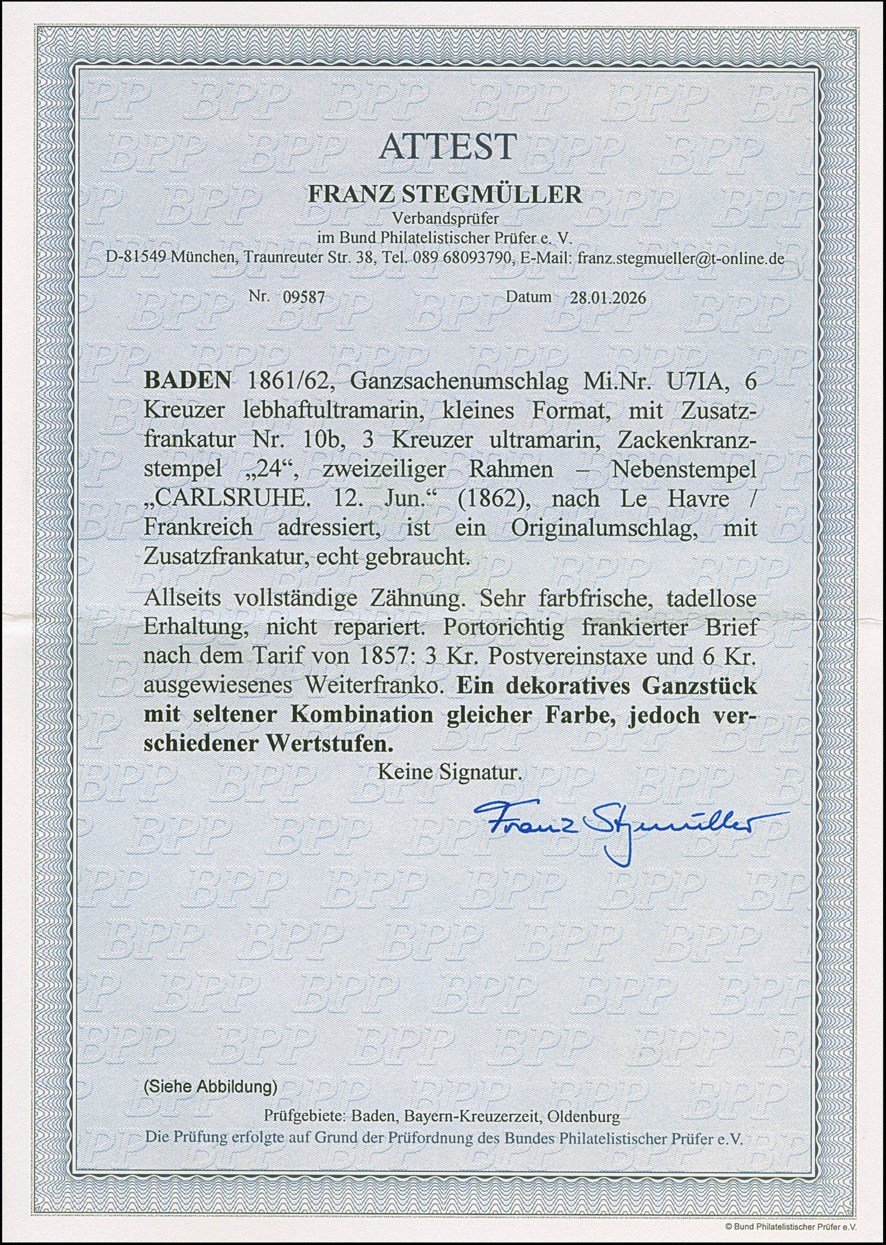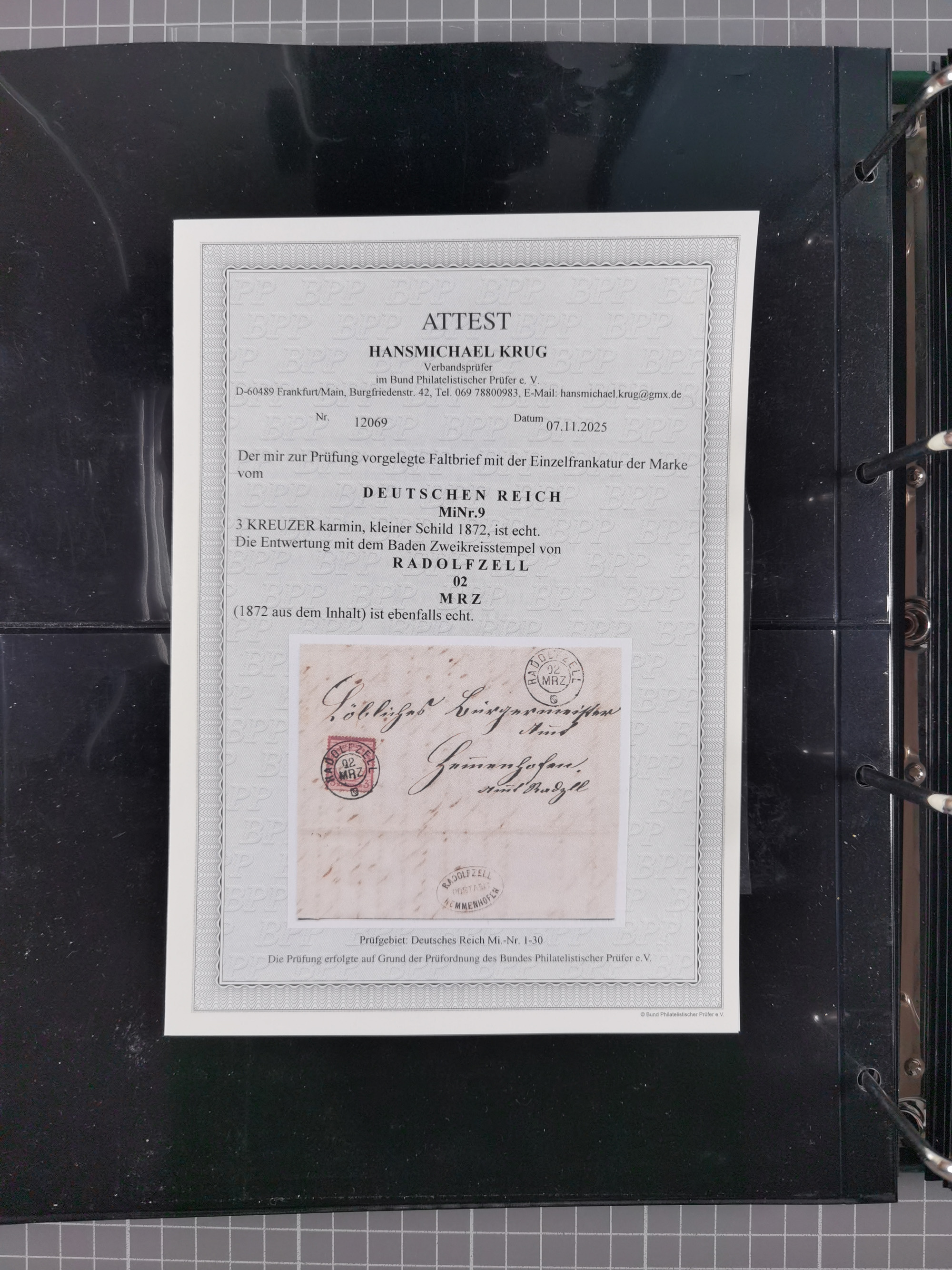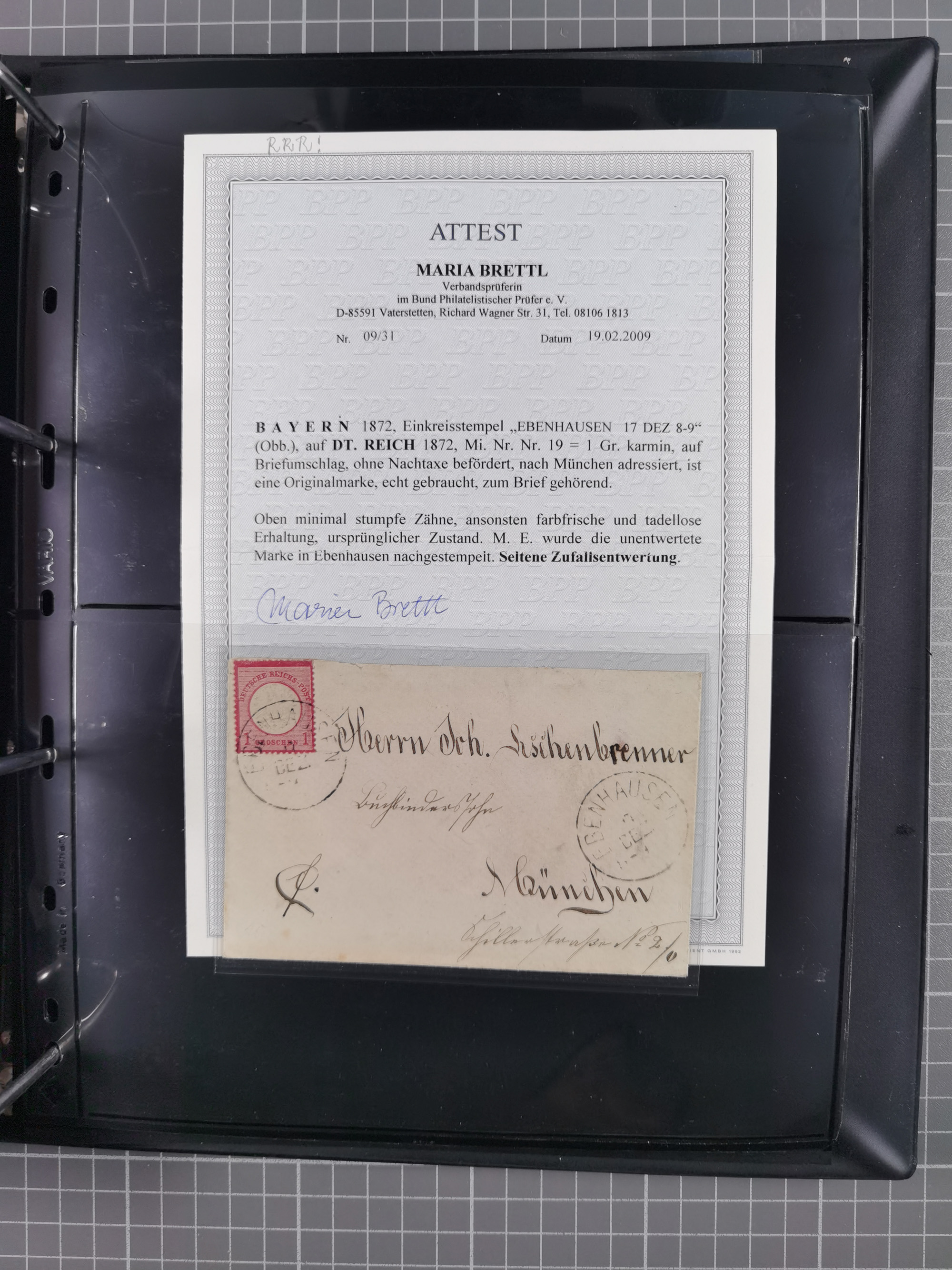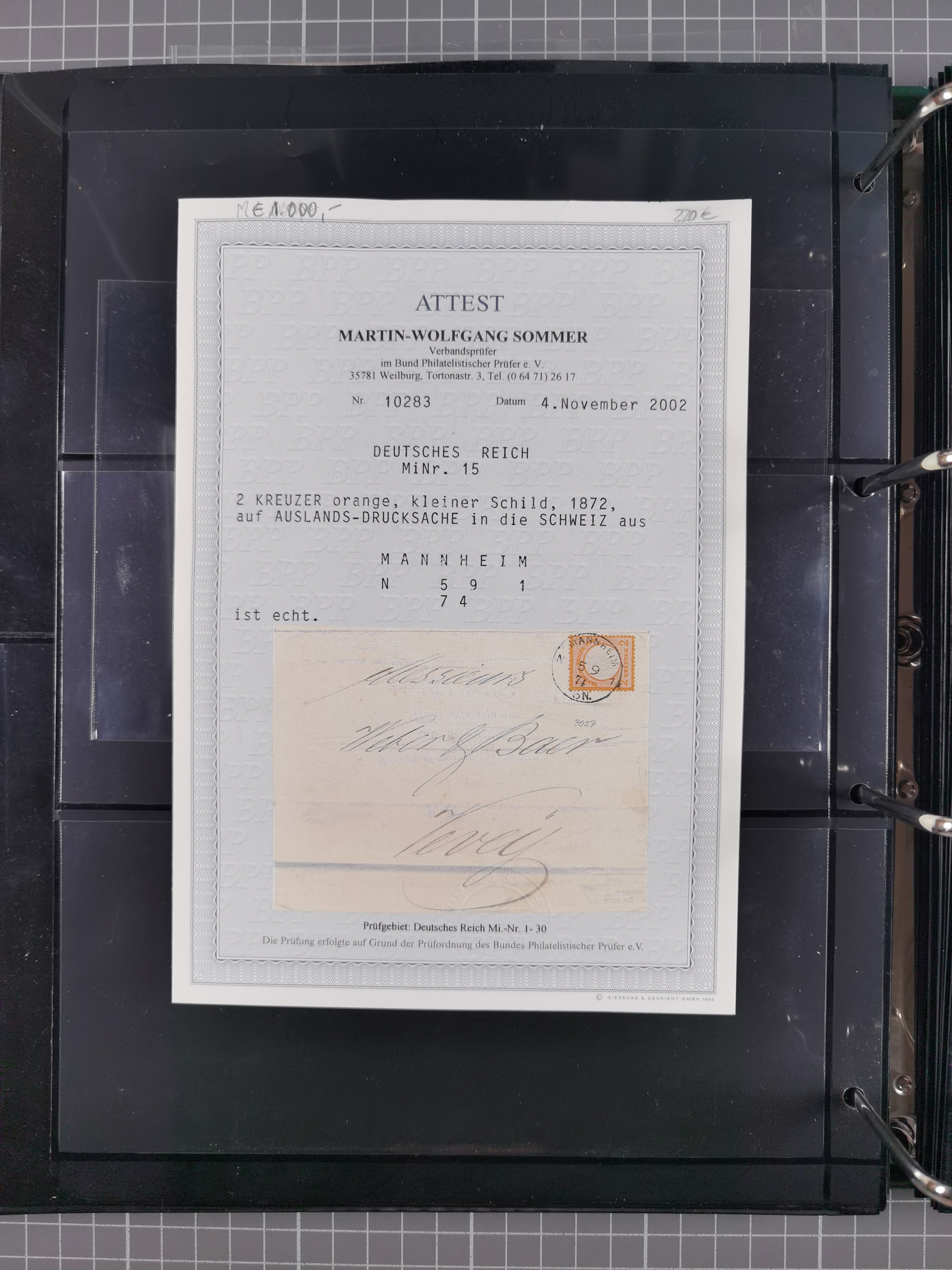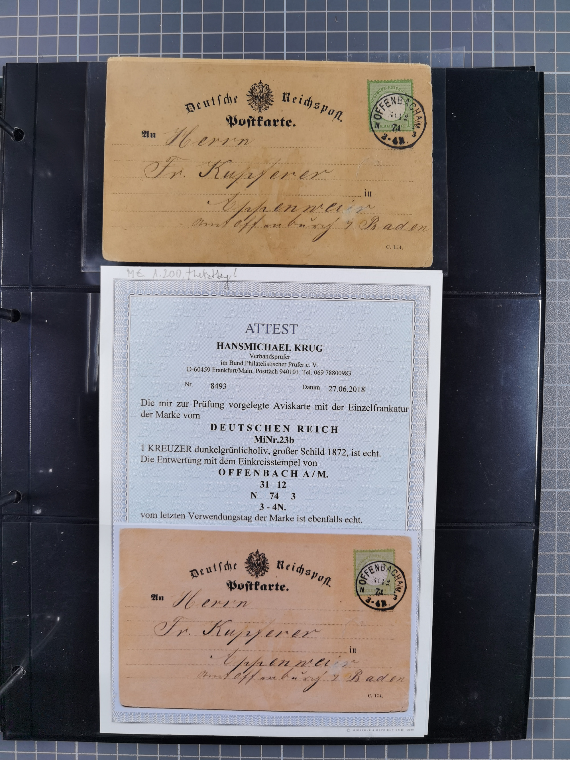 1872/75, Kreuzerbezirk, Sammlung von 31 Belegen, dabei Farbfrankaturen Michel 7 + 8, Mi. 8 EF auf Brief in den eigenen Landzustellbezirk, dito auf Drucksache in die Schweiz, 11 EF auf Wertbrief, 15 EF auf Drucksache in die Schweiz, 23b auf Letzttags-Brief und als MeF in die USA, 24 EF auf Drucksache nach Italien, 27a(2) auf Auslandsbrief, 27c EF, etc. 17 Atteste und 8 Befunde BPP