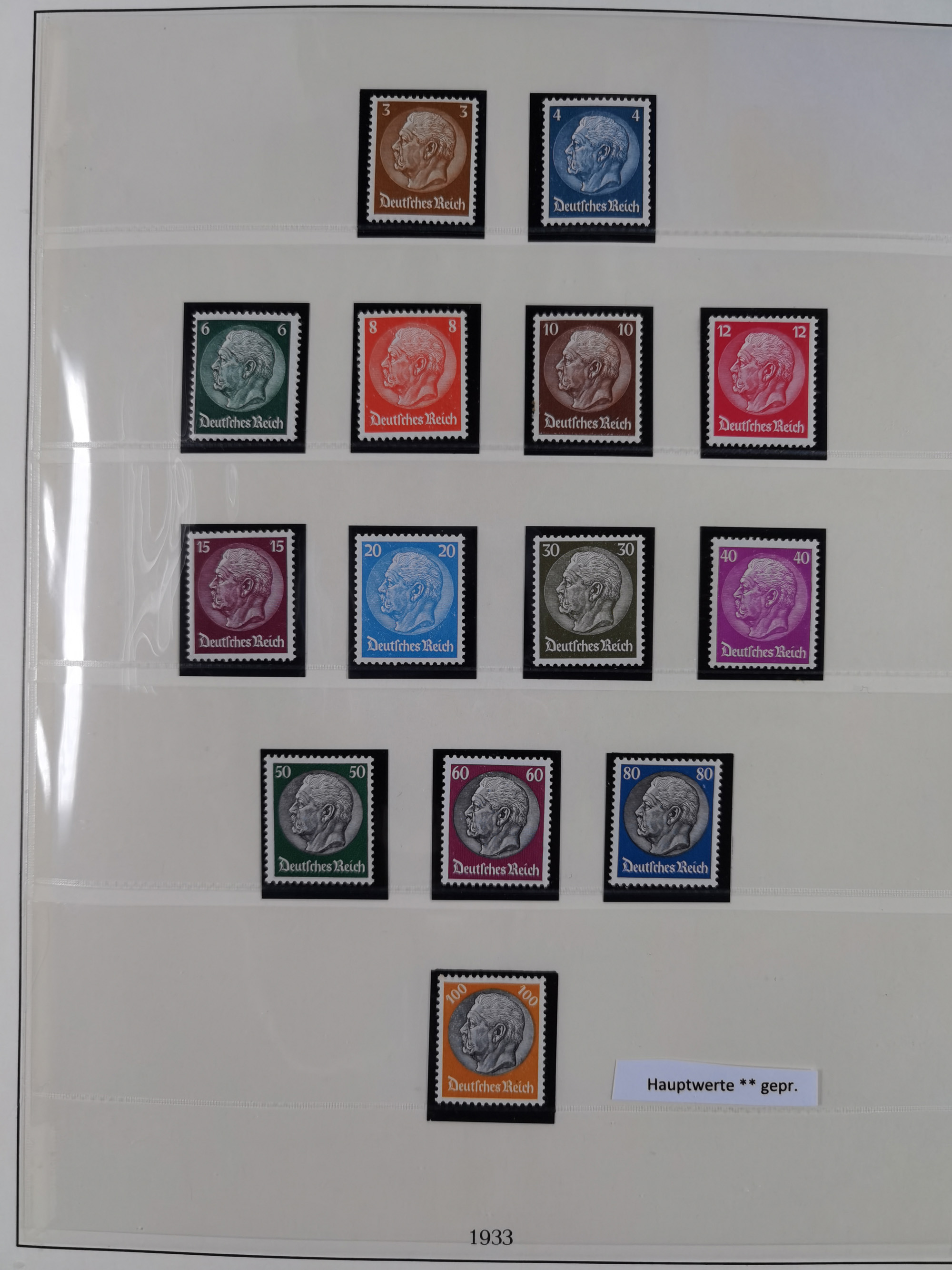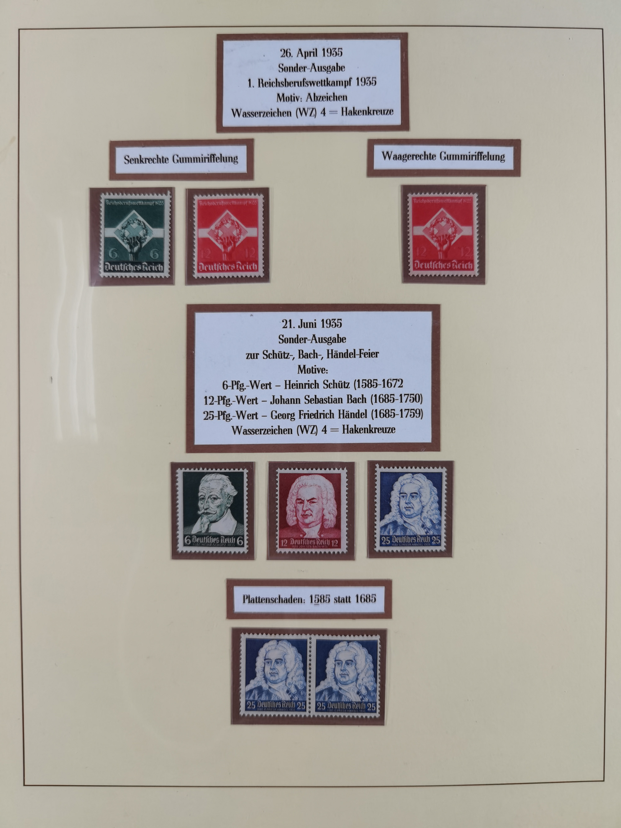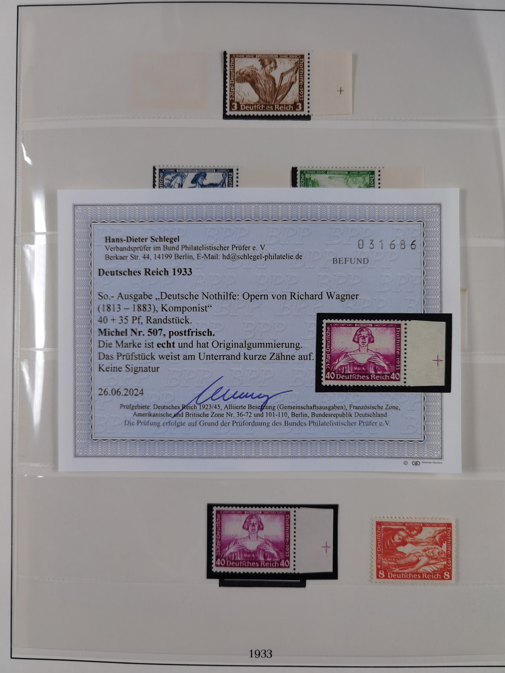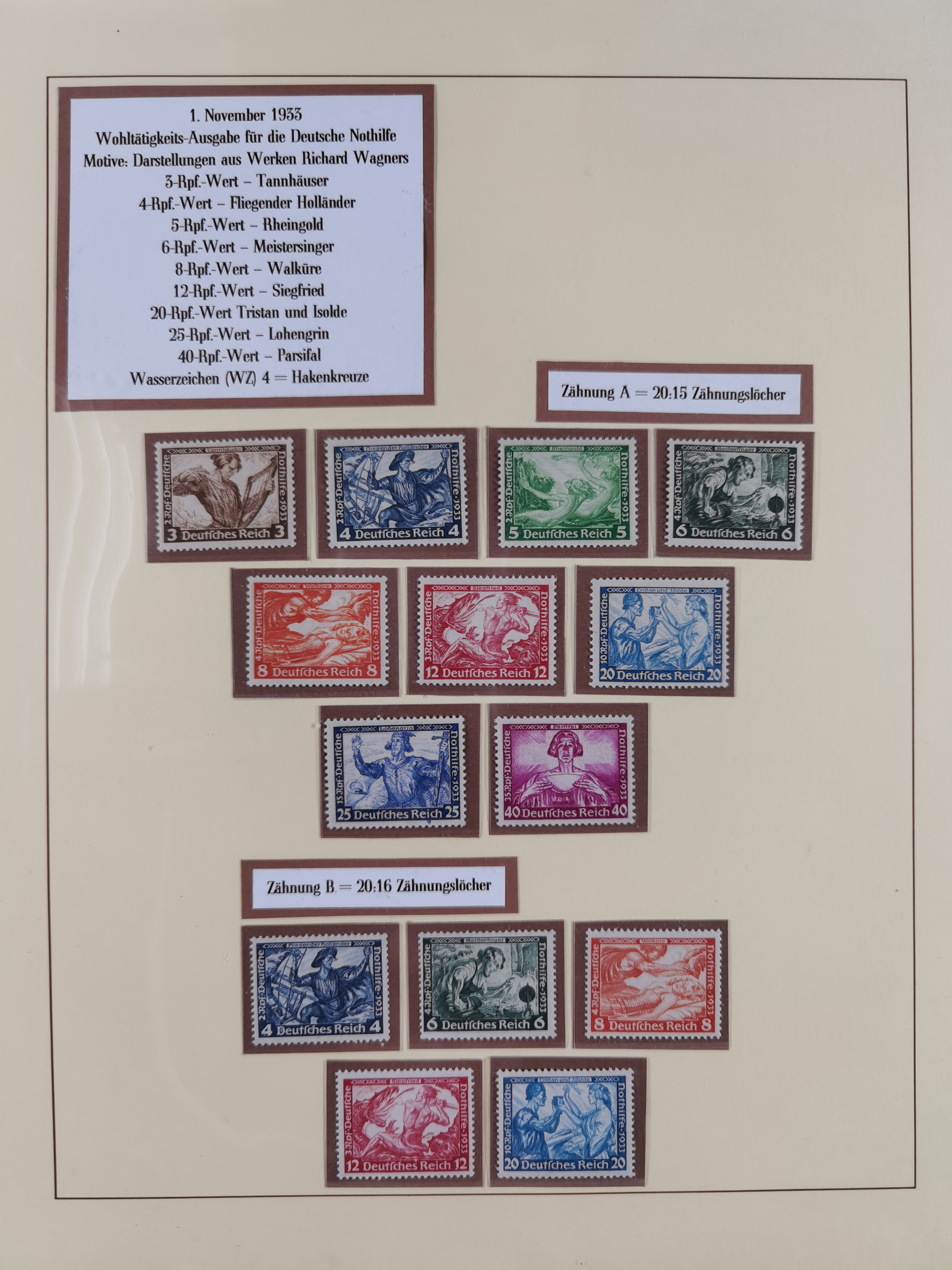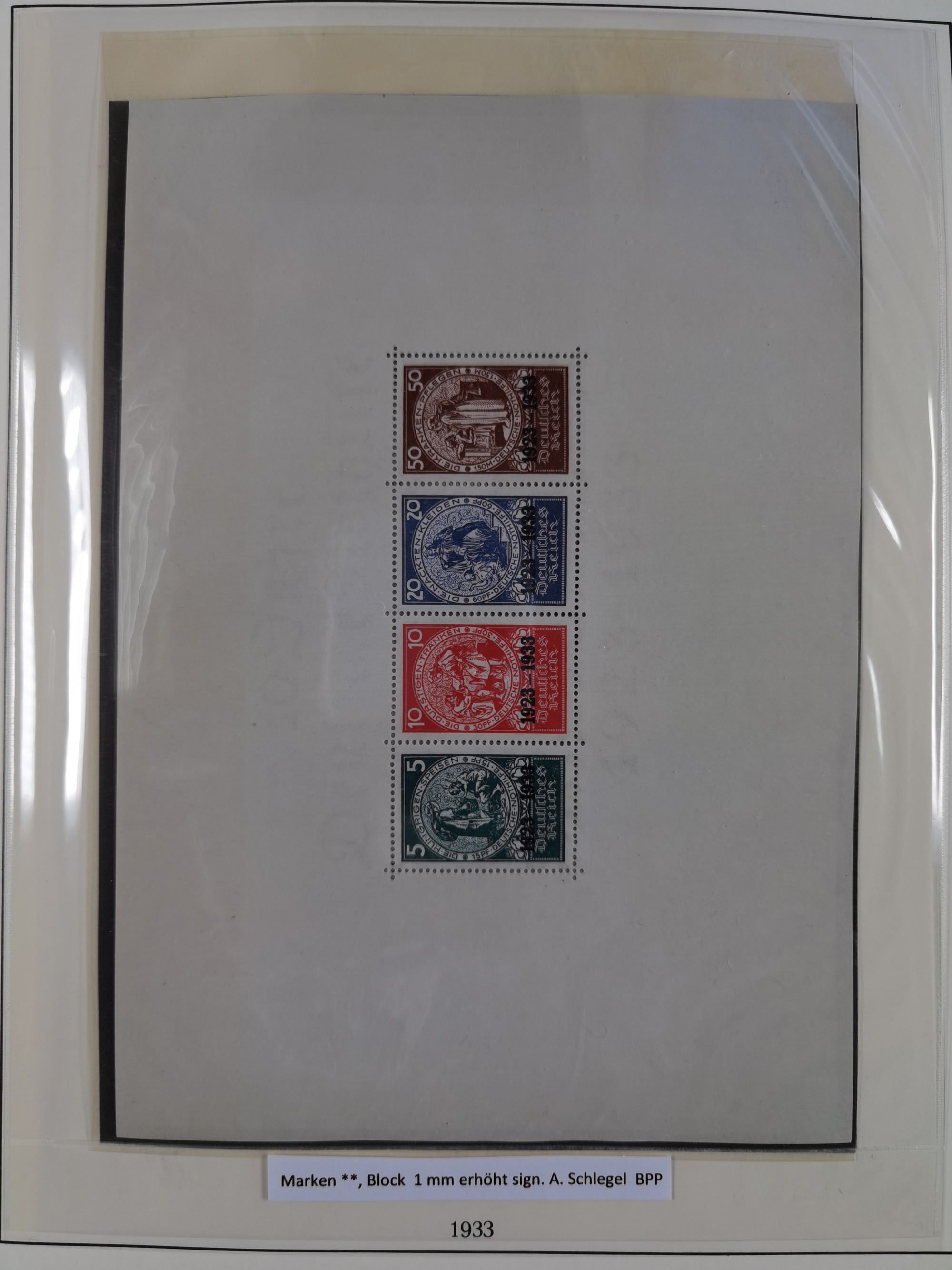 1933/45, meist postfrische Sammlung im Lindner-Falzlosalbum komplett mit vielen Besonderheiten. Mi. 482-495 postfrisch, Höchstwerte sign. A. Schlegel BPP, Mi. 496-98 ungebraucht, Mi. 507 postfrisch, Befund Schlegel BPP, Block 2 postfrisch (1 mm erhöht sign. Schlegel BPP), Mi. 529-539 x und Viererblock 539 y je postfrisch mit Attest Schlegel BPP, Bl. 3 Attest A. Schlegel BPP, Mi. 586 Y ungebraucht, Attest Oechsner BPP, Mi. 587 U ungebraucht, Attest H.-D. Schlegel BPP, Block 6z postfrisch, sign. Schlegel BPP, Mi. 641 x postfrisch, sign. D. Schlegel BPP, Mi. 659 x postfrisch, Befund Oechsner BPP, Mi. 671 x und 672 y sign., Mi. 814 Phasenabzug und Abzug vom Urstempel je postfrisch, viele Plattenfehler wie 909 I und 910 I und II je sign. A. Schlegel BPP.