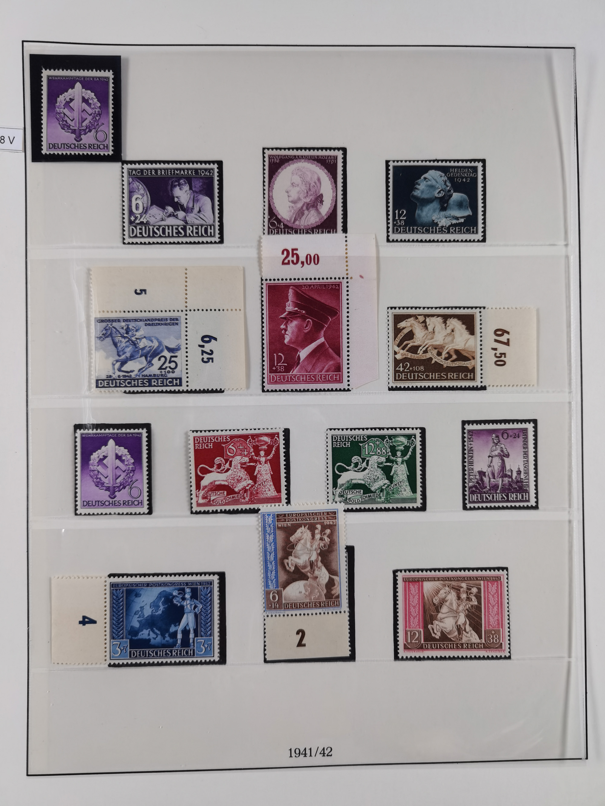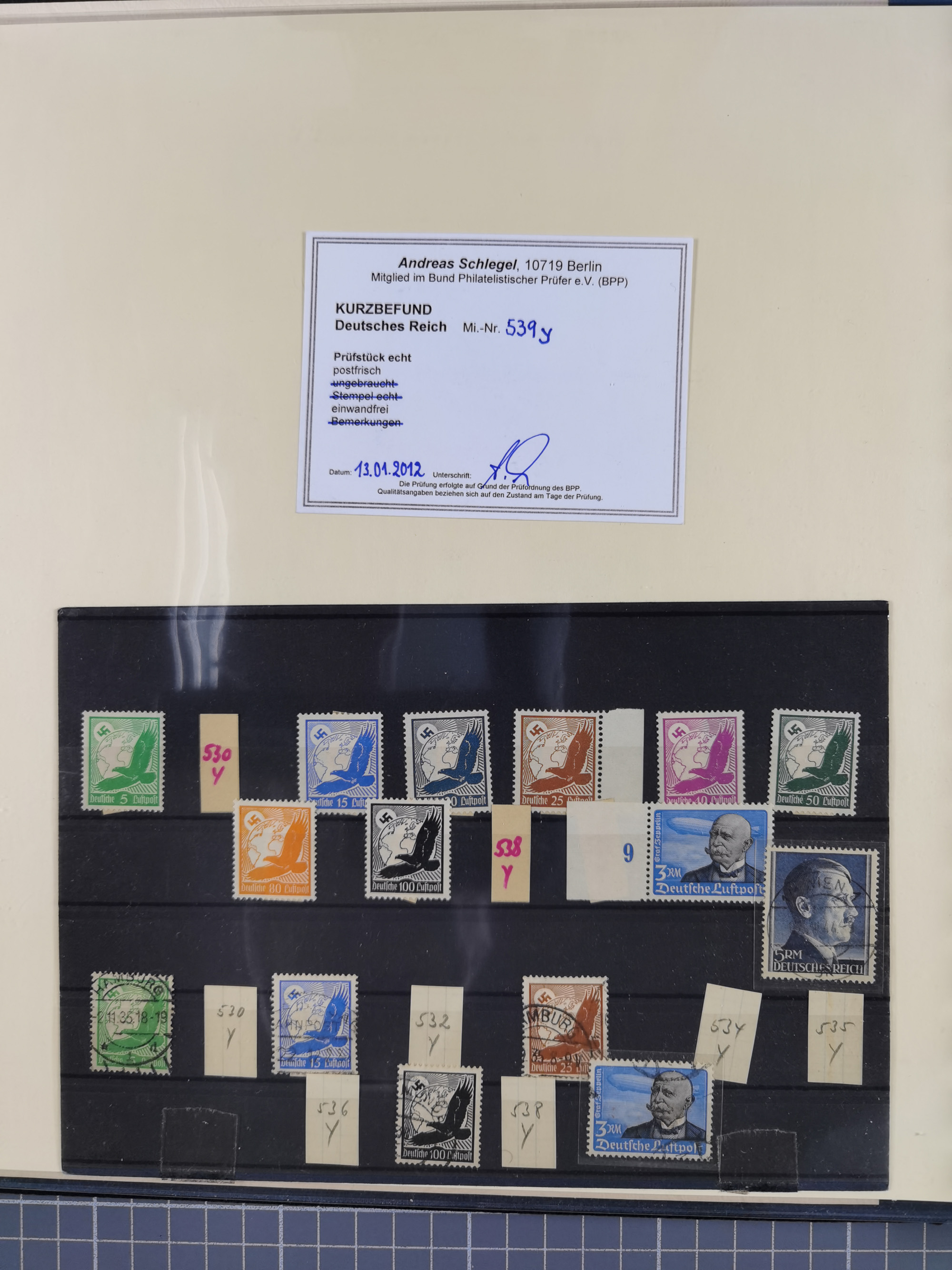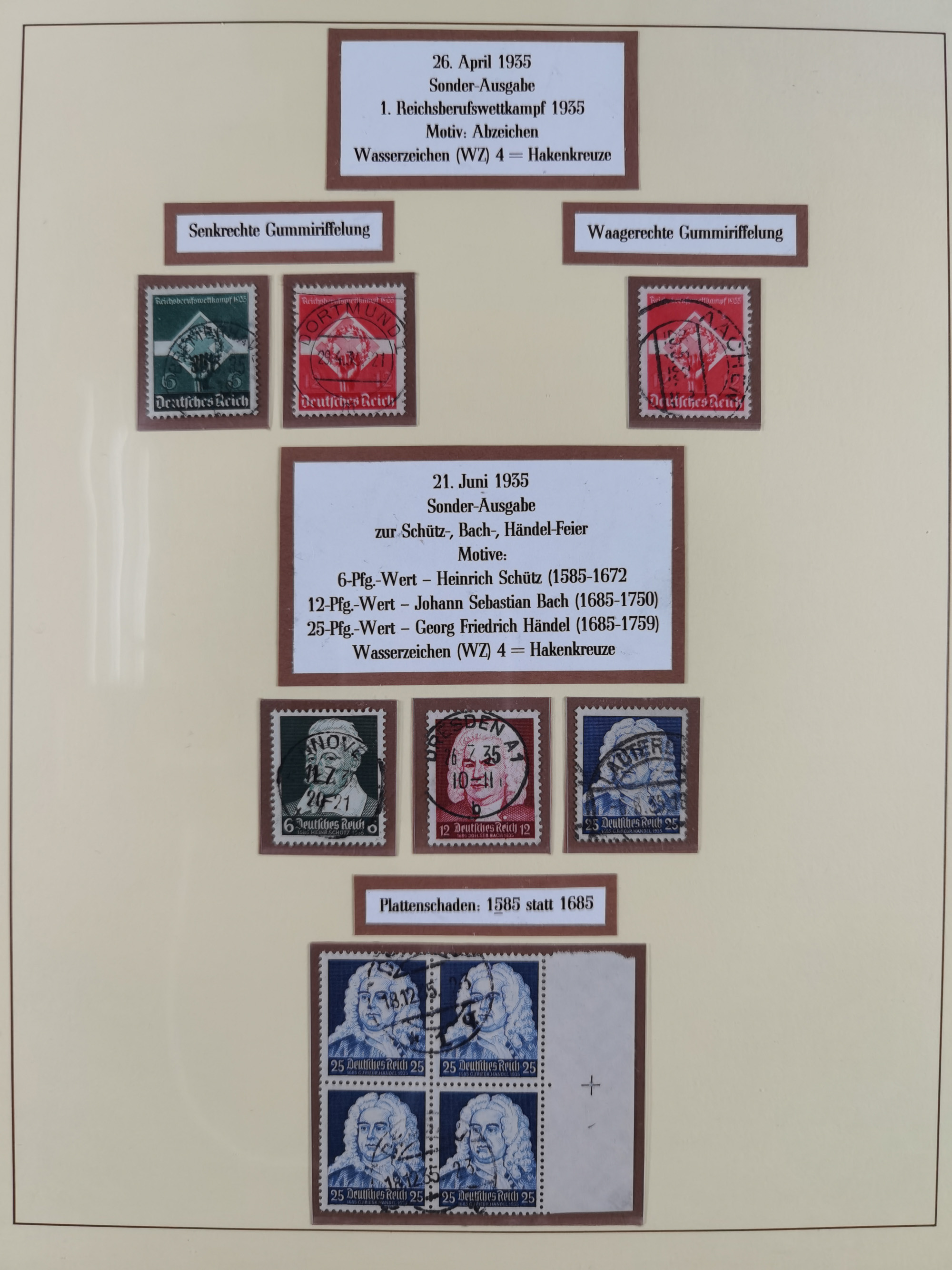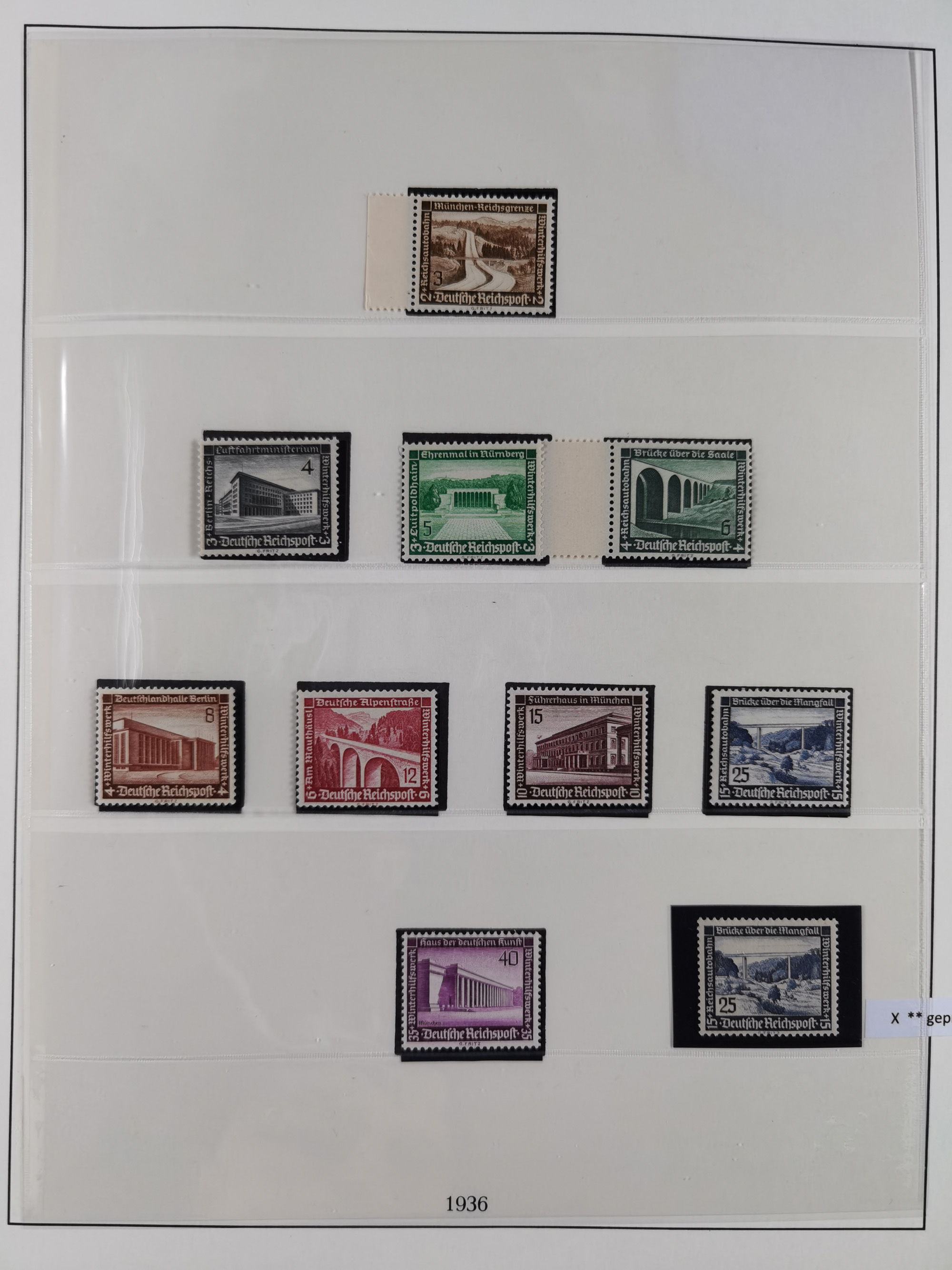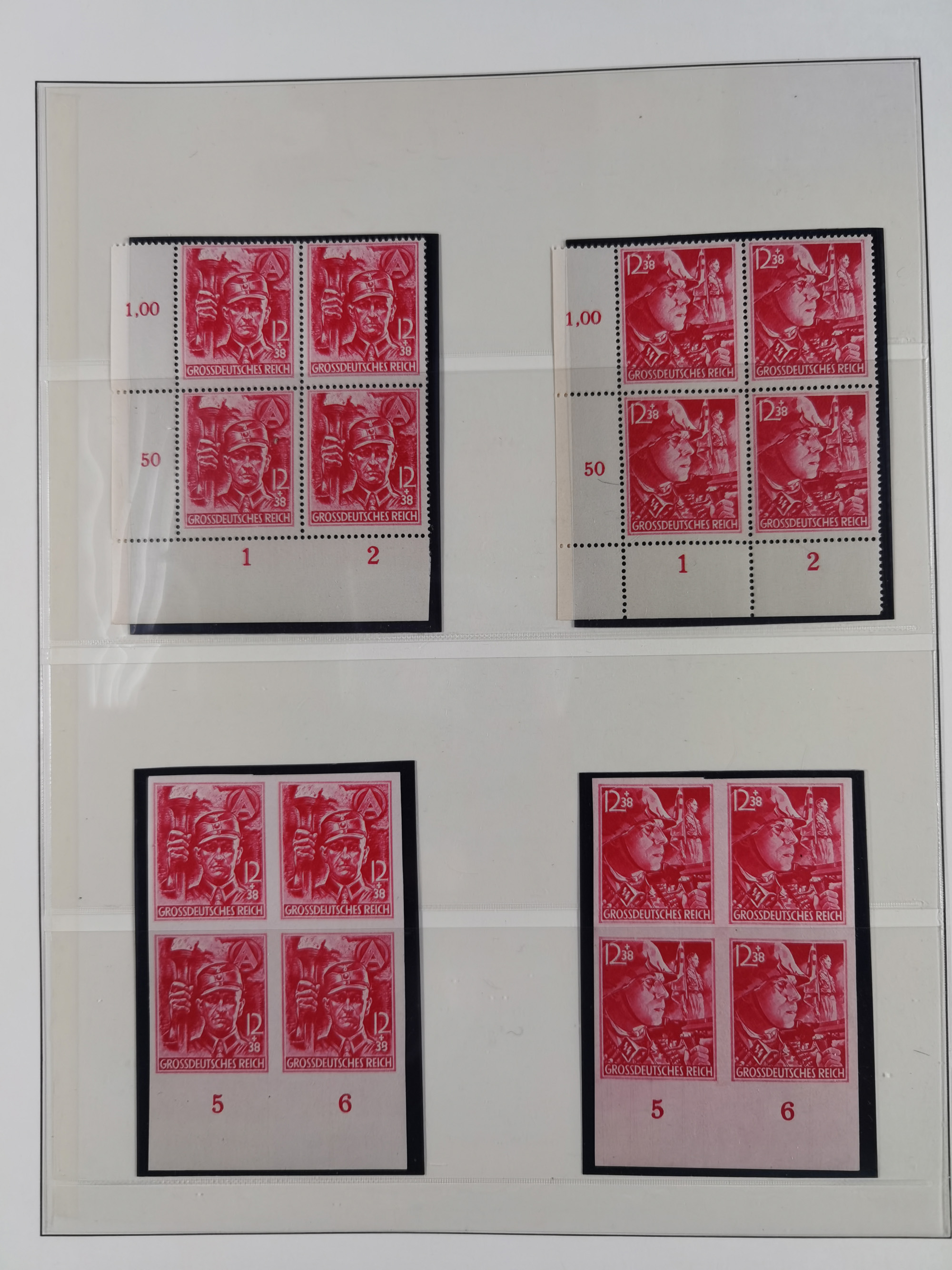 1933/45, meist postfrische Sammlung im Lindner-Falzlosalbum komplett mit vielen Besonderheiten. Mi. 482-495 postfrisch, Höchstwerte sign. A. Schlegel BPP, Mi. 496-98 ungebraucht, Mi. 507 postfrisch, Befund Schlegel BPP, Block 2 postfrisch (1 mm erhöht sign. Schlegel BPP), Mi. 529-539 x und Viererblock 539 y je postfrisch mit Attest Schlegel BPP, Bl. 3 Attest A. Schlegel BPP, Mi. 586 Y ungebraucht, Attest Oechsner BPP, Mi. 587 U ungebraucht, Attest H.-D. Schlegel BPP, Block 6z postfrisch, sign. Schlegel BPP, Mi. 641 x postfrisch, sign. D. Schlegel BPP, Mi. 659 x postfrisch, Befund Oechsner BPP, Mi. 671 x und 672 y sign., Mi. 814 Phasenabzug und Abzug vom Urstempel je postfrisch, viele Plattenfehler wie 909 I und 910 I und II je sign. A. Schlegel BPP.