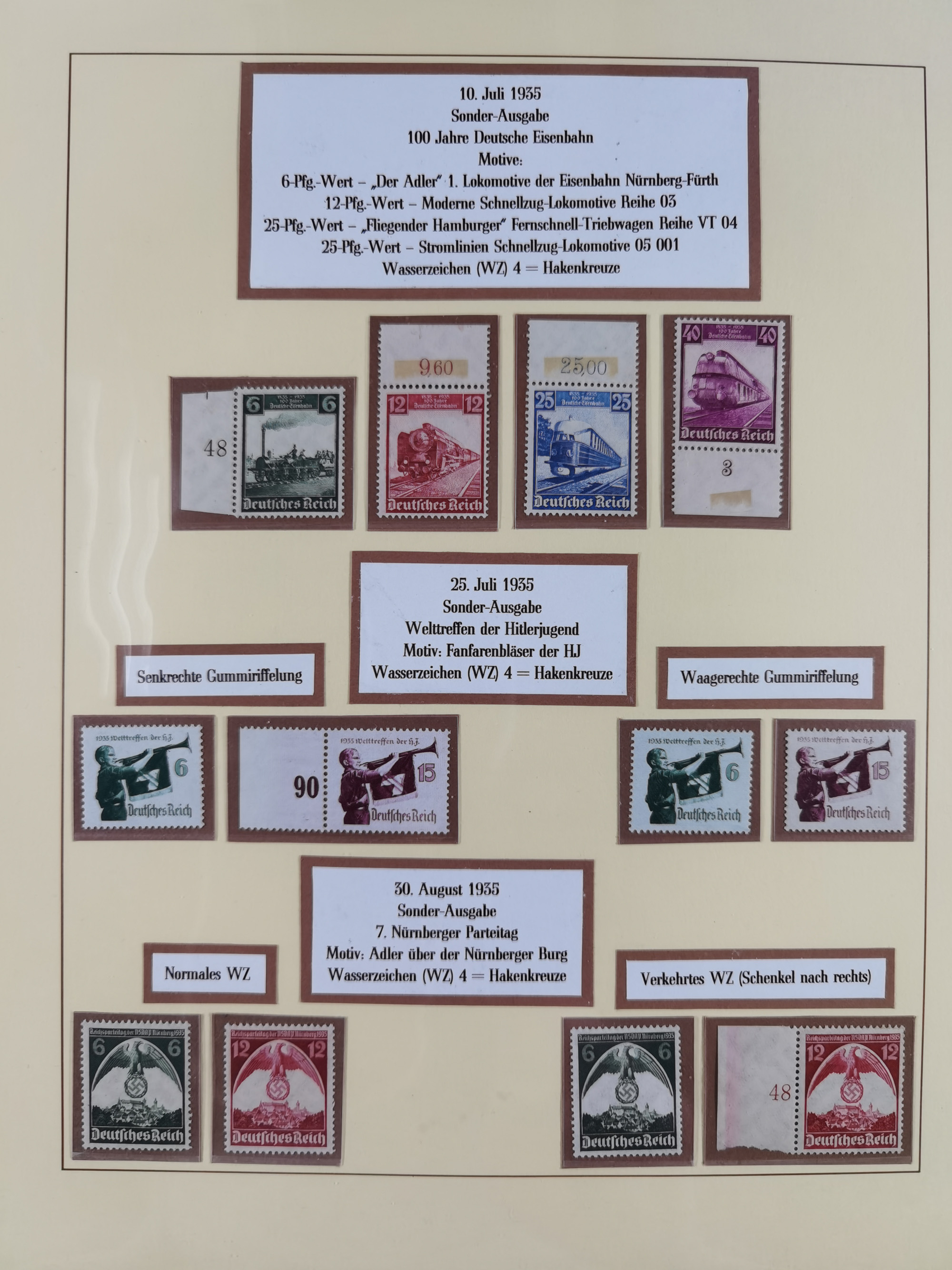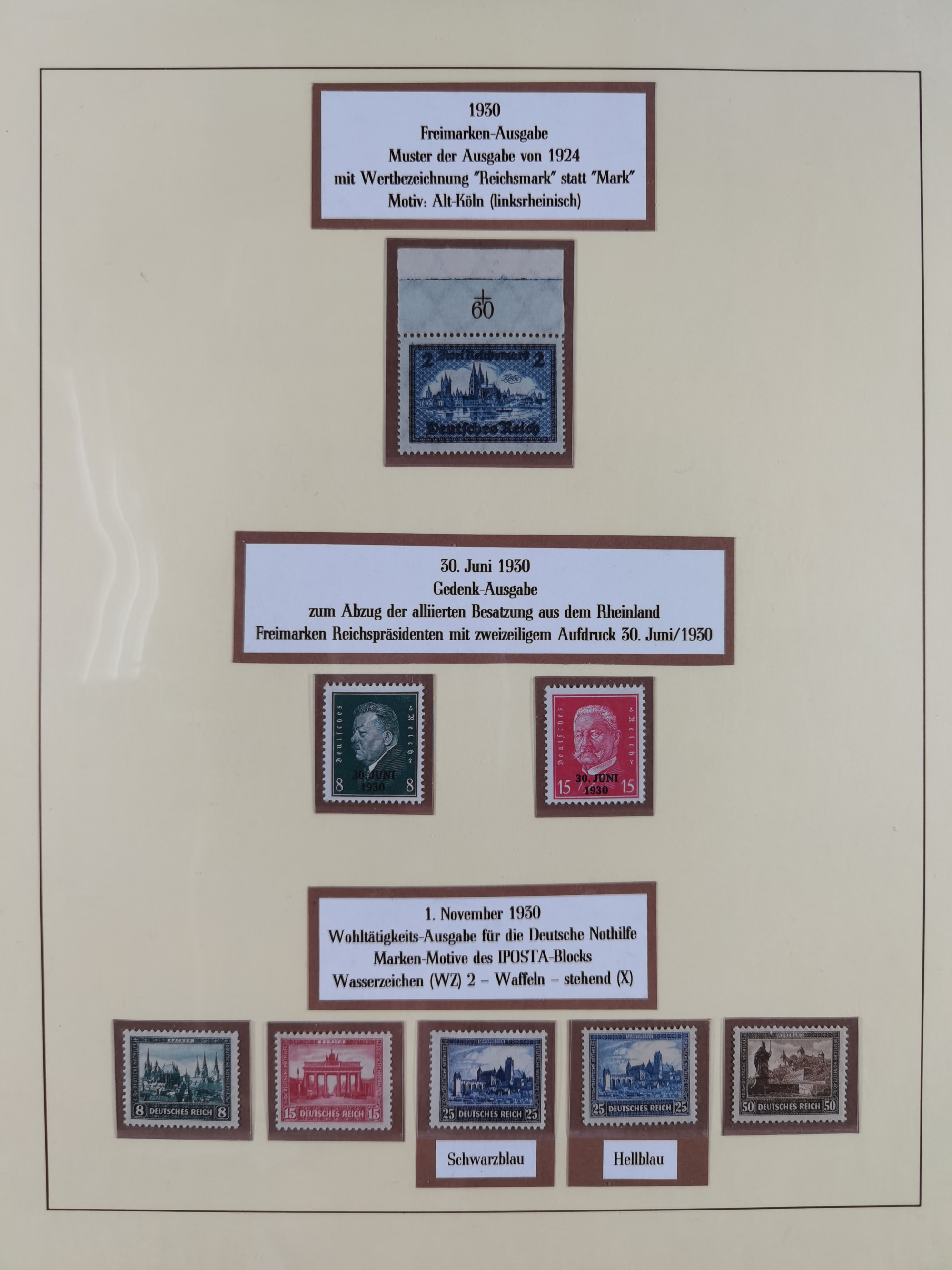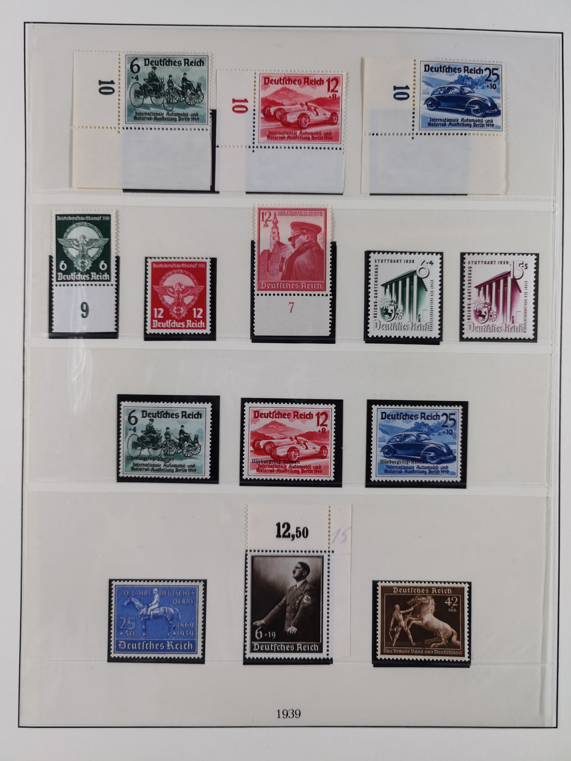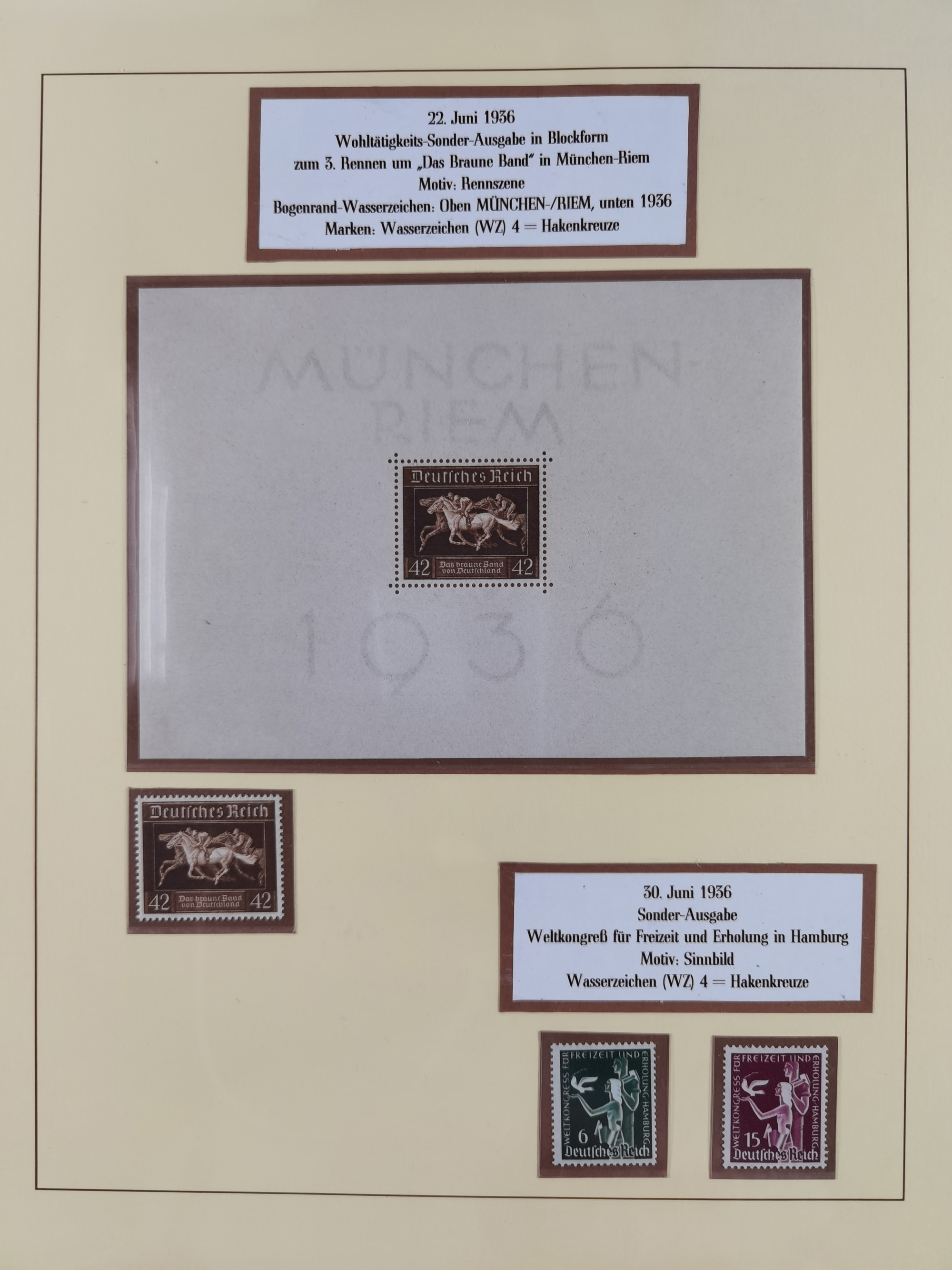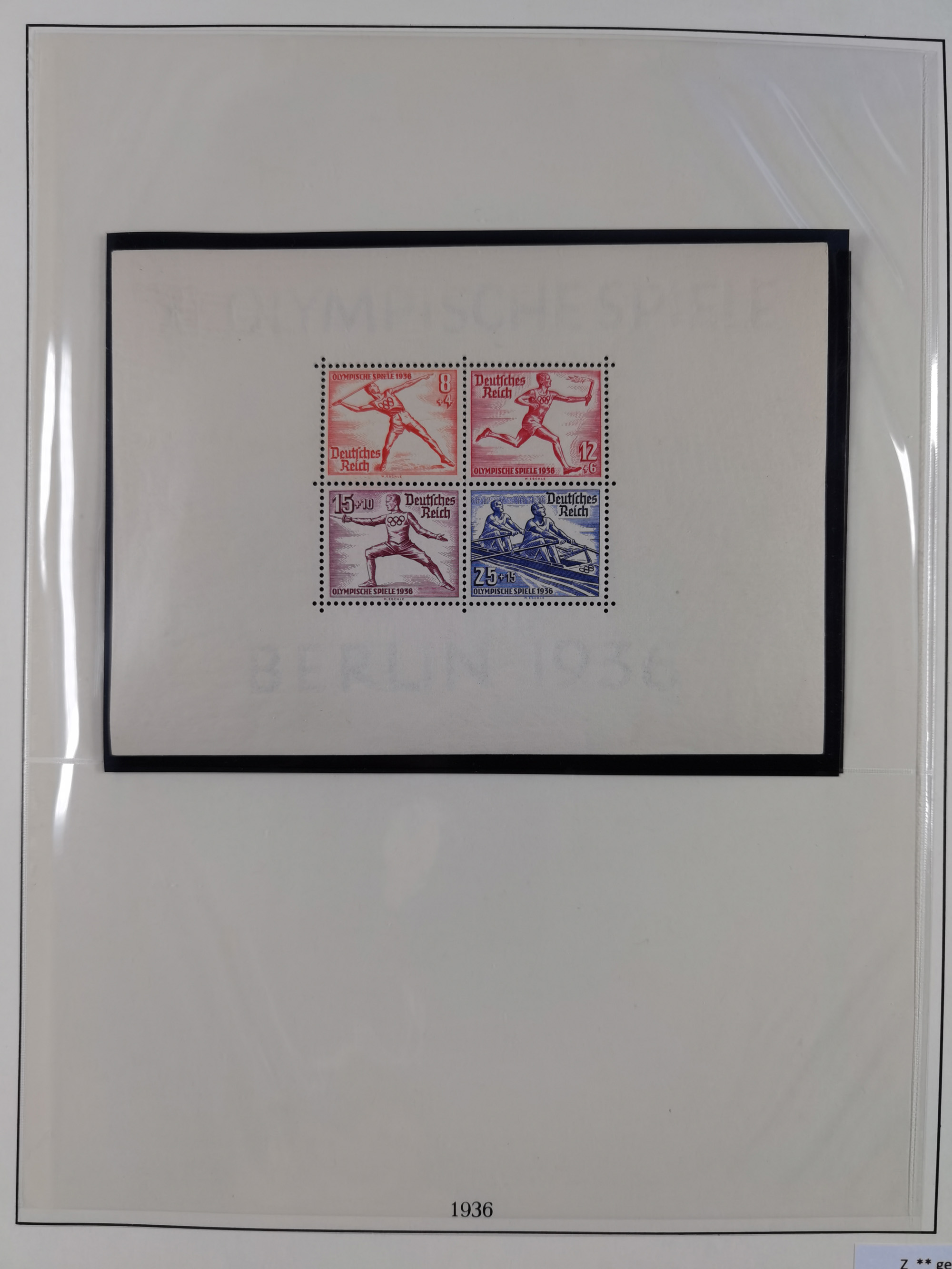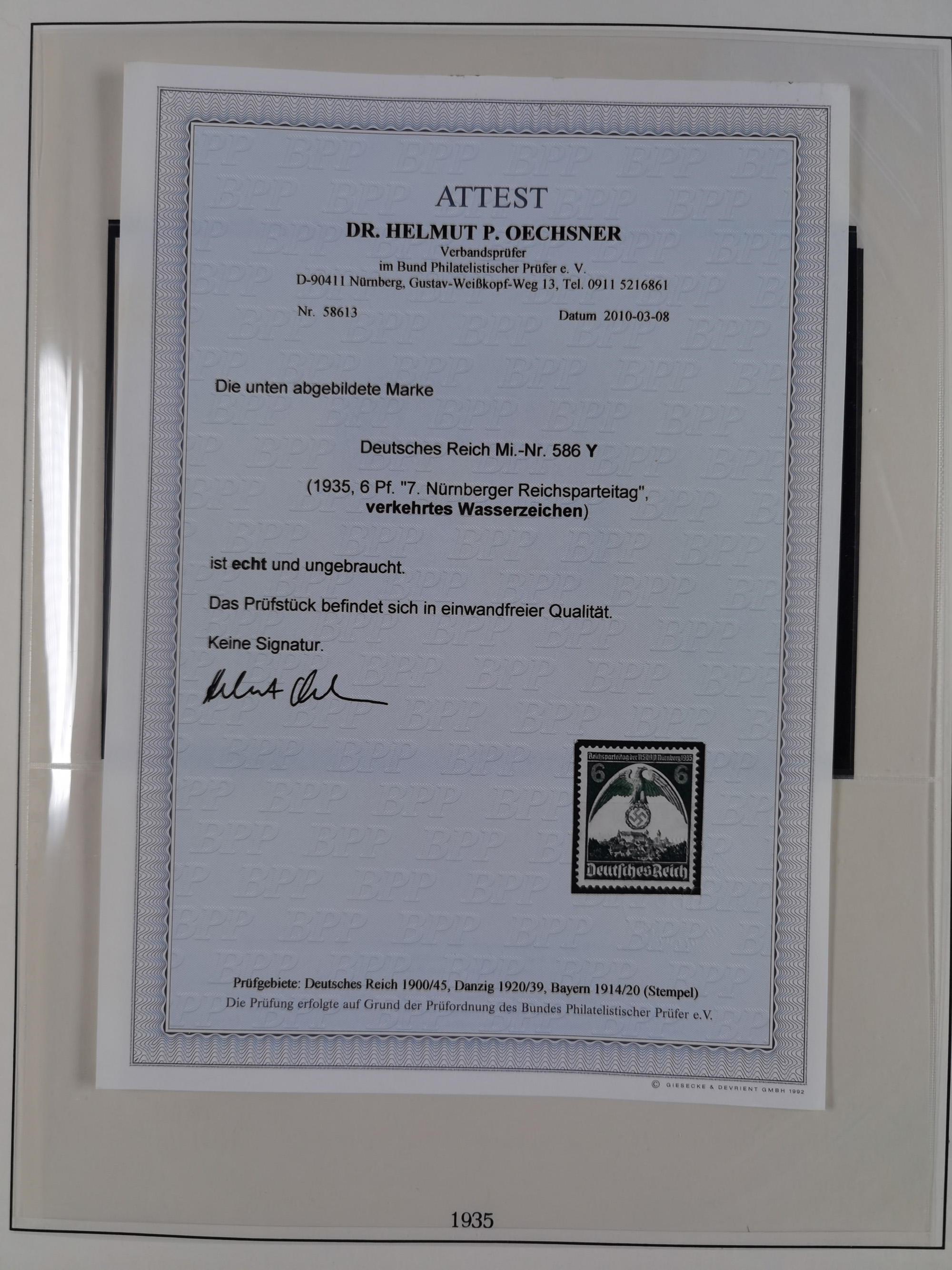 1933/45, meist postfrische Sammlung im Lindner-Falzlosalbum komplett mit vielen Besonderheiten. Mi. 482-495 postfrisch, Höchstwerte sign. A. Schlegel BPP, Mi. 496-98 ungebraucht, Mi. 507 postfrisch, Befund Schlegel BPP, Block 2 postfrisch (1 mm erhöht sign. Schlegel BPP), Mi. 529-539 x und Viererblock 539 y je postfrisch mit Attest Schlegel BPP, Bl. 3 Attest A. Schlegel BPP, Mi. 586 Y ungebraucht, Attest Oechsner BPP, Mi. 587 U ungebraucht, Attest H.-D. Schlegel BPP, Block 6z postfrisch, sign. Schlegel BPP, Mi. 641 x postfrisch, sign. D. Schlegel BPP, Mi. 659 x postfrisch, Befund Oechsner BPP, Mi. 671 x und 672 y sign., Mi. 814 Phasenabzug und Abzug vom Urstempel je postfrisch, viele Plattenfehler wie 909 I und 910 I und II je sign. A. Schlegel BPP.