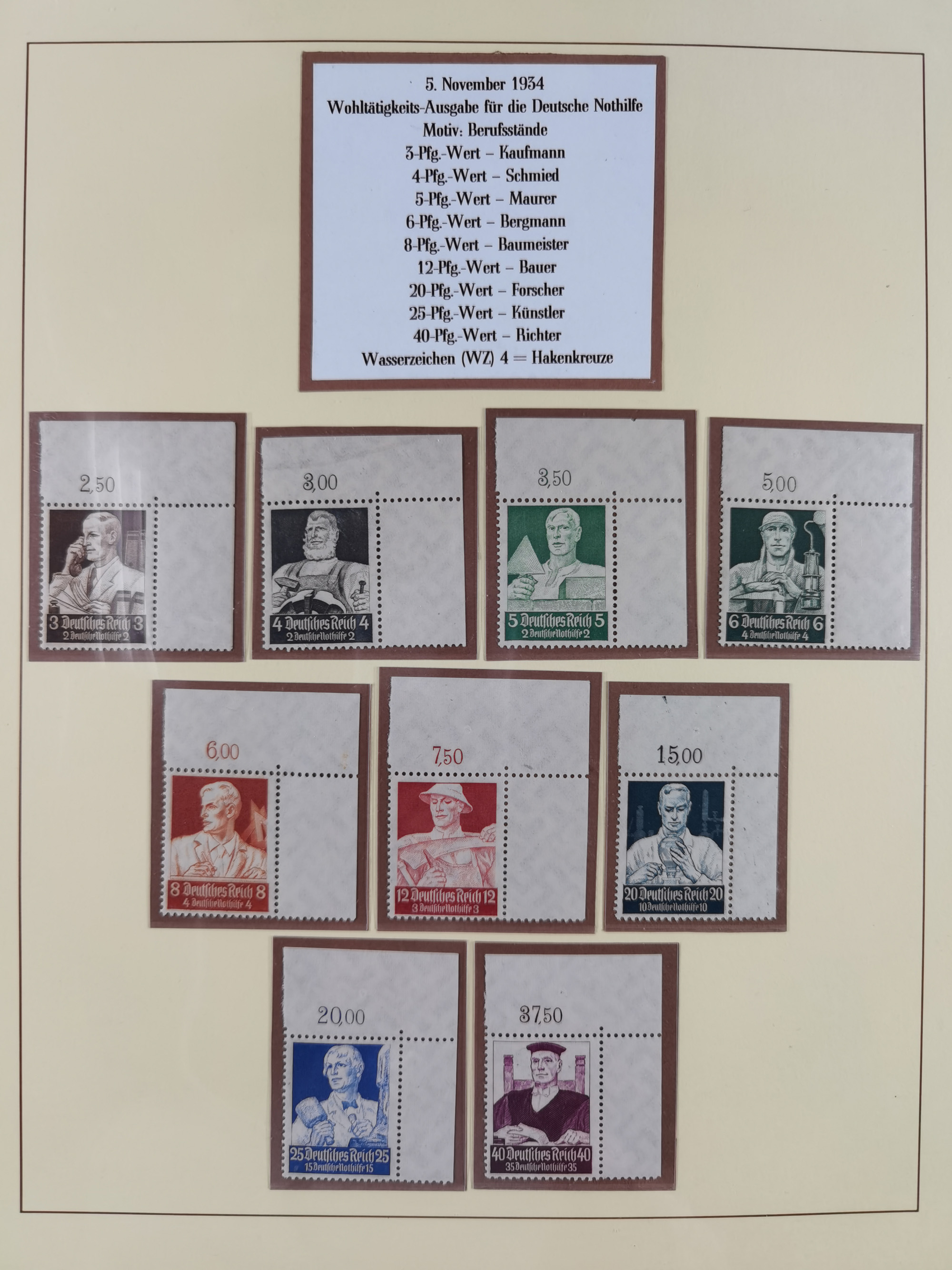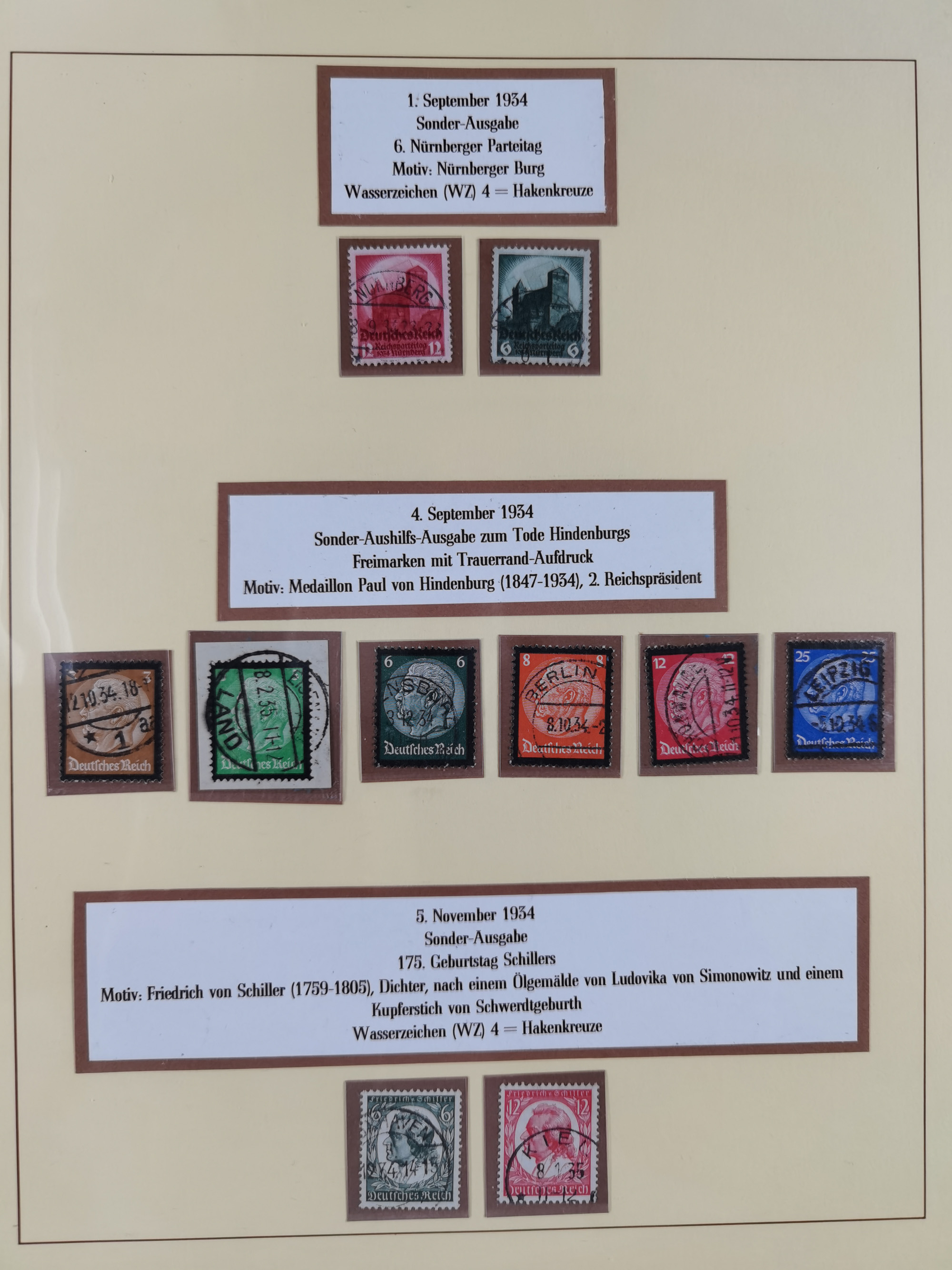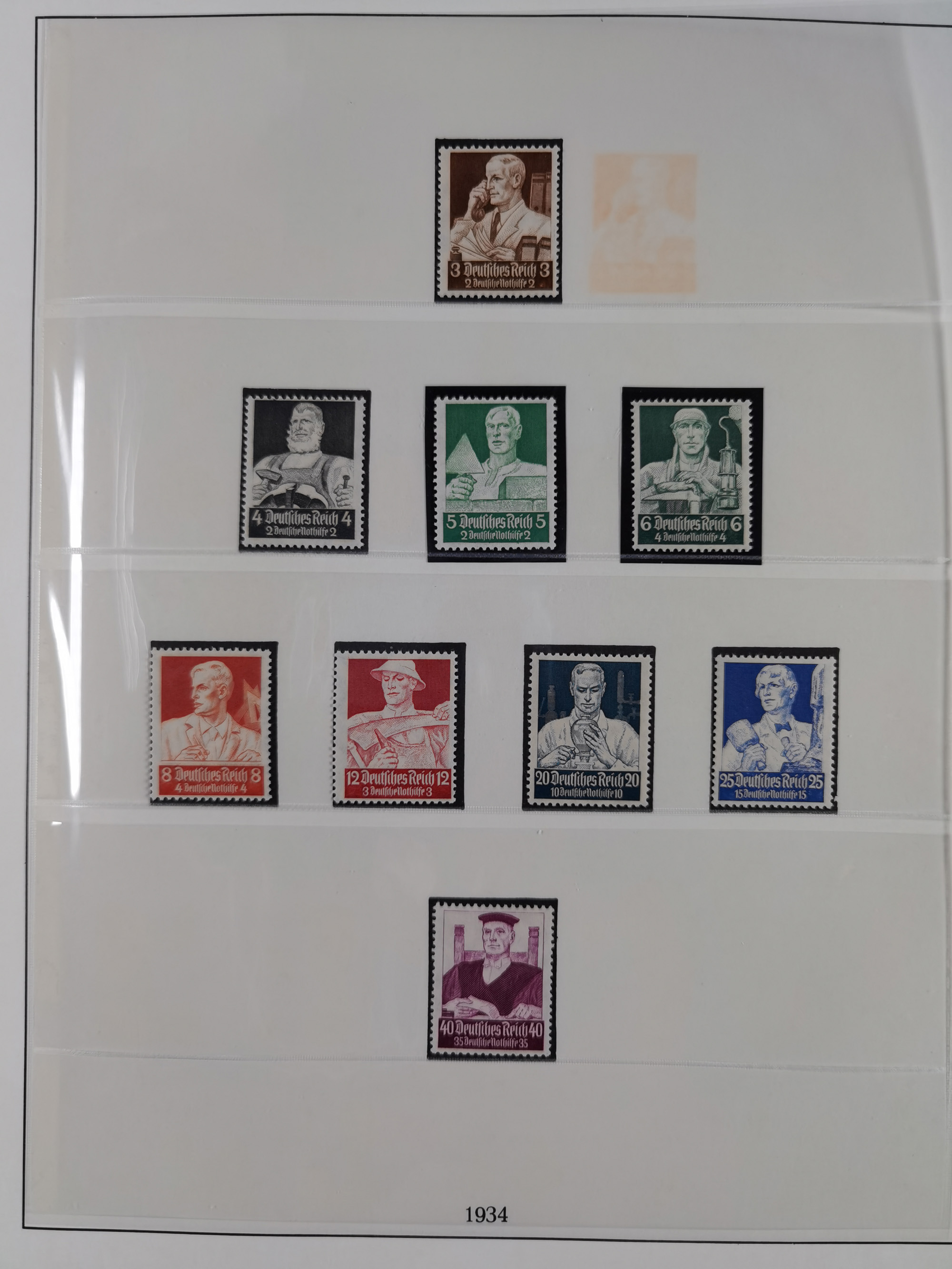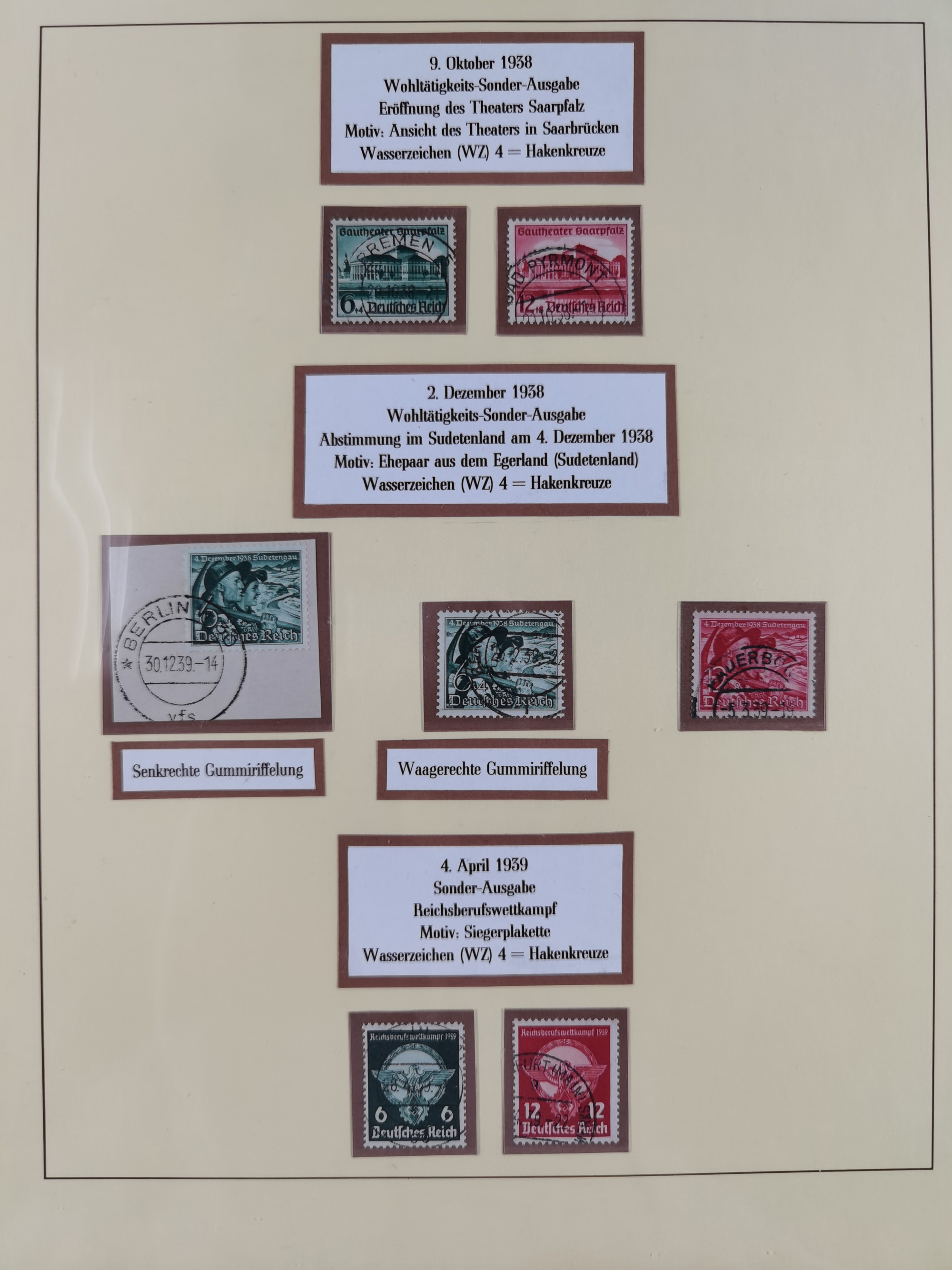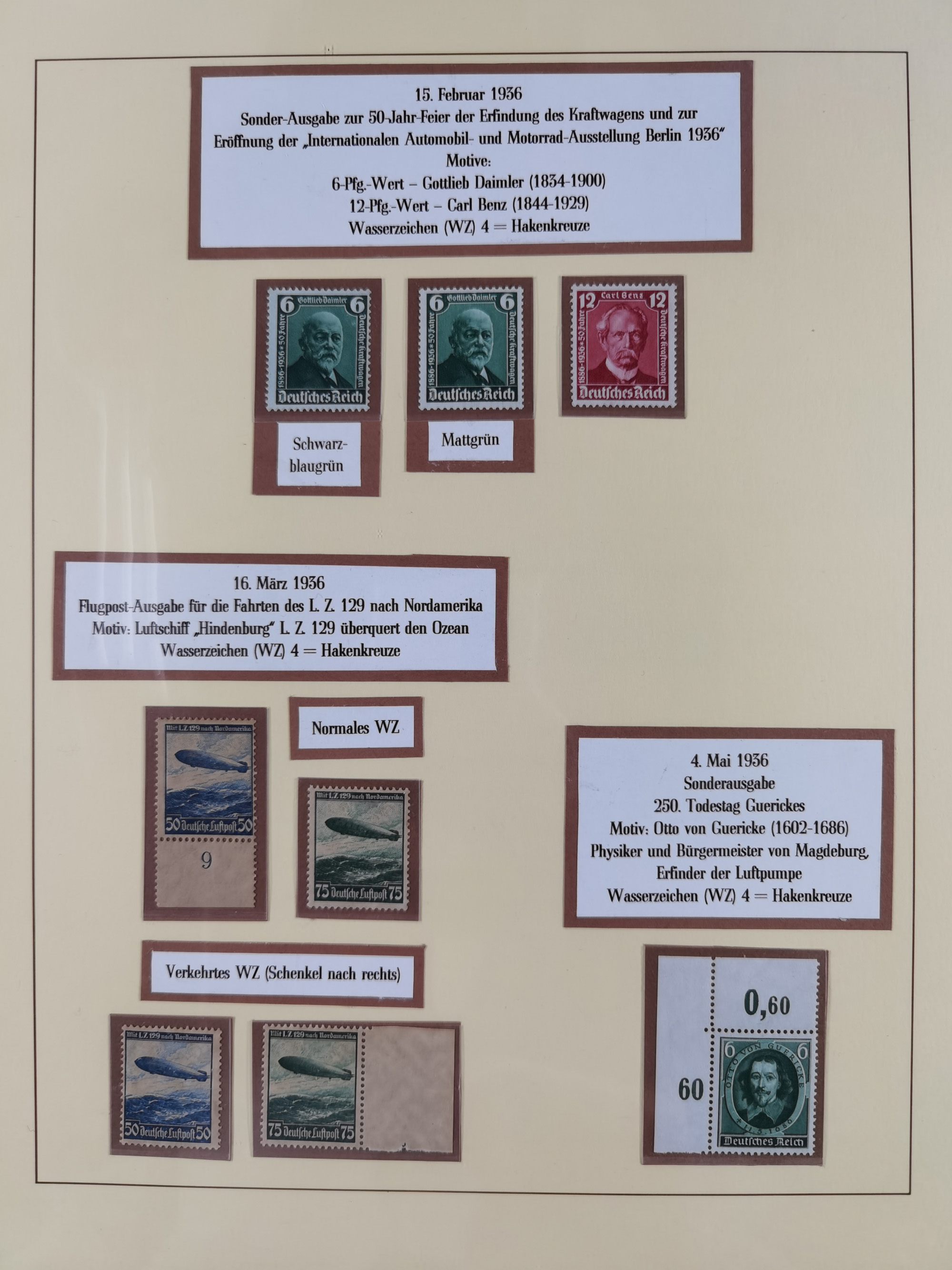 1933/45, meist postfrische Sammlung im Lindner-Falzlosalbum komplett mit vielen Besonderheiten. Mi. 482-495 postfrisch, Höchstwerte sign. A. Schlegel BPP, Mi. 496-98 ungebraucht, Mi. 507 postfrisch, Befund Schlegel BPP, Block 2 postfrisch (1 mm erhöht sign. Schlegel BPP), Mi. 529-539 x und Viererblock 539 y je postfrisch mit Attest Schlegel BPP, Bl. 3 Attest A. Schlegel BPP, Mi. 586 Y ungebraucht, Attest Oechsner BPP, Mi. 587 U ungebraucht, Attest H.-D. Schlegel BPP, Block 6z postfrisch, sign. Schlegel BPP, Mi. 641 x postfrisch, sign. D. Schlegel BPP, Mi. 659 x postfrisch, Befund Oechsner BPP, Mi. 671 x und 672 y sign., Mi. 814 Phasenabzug und Abzug vom Urstempel je postfrisch, viele Plattenfehler wie 909 I und 910 I und II je sign. A. Schlegel BPP.