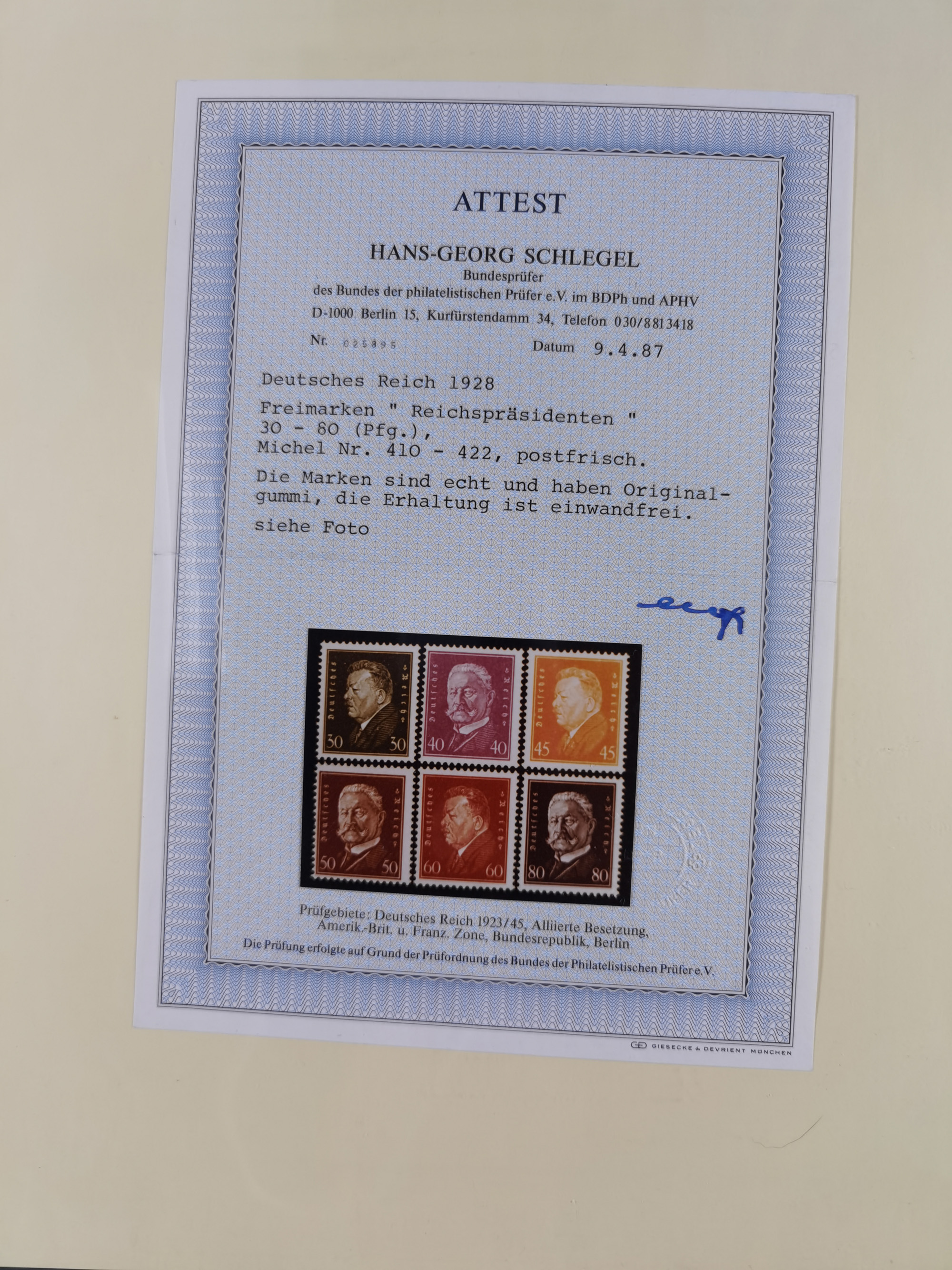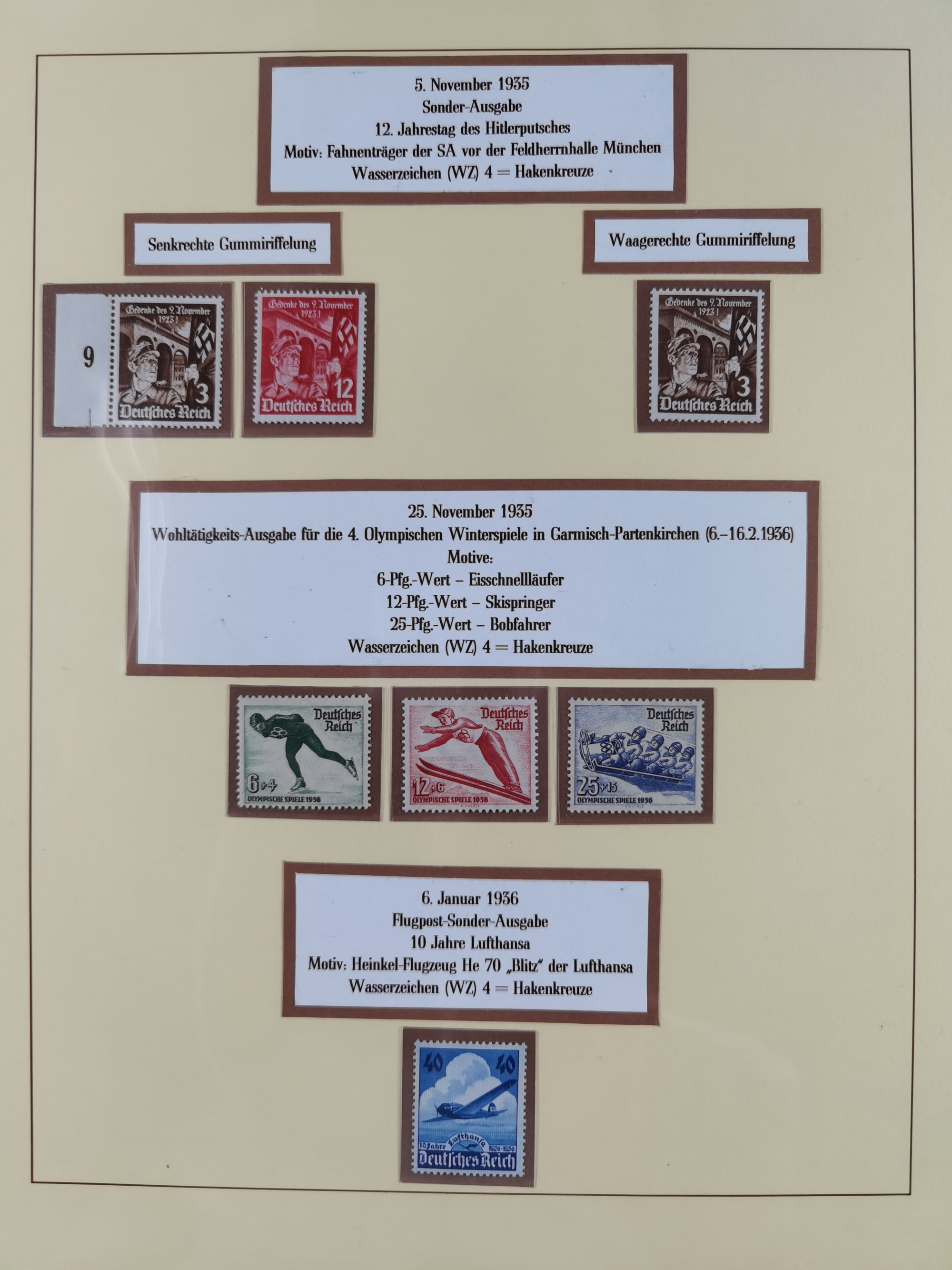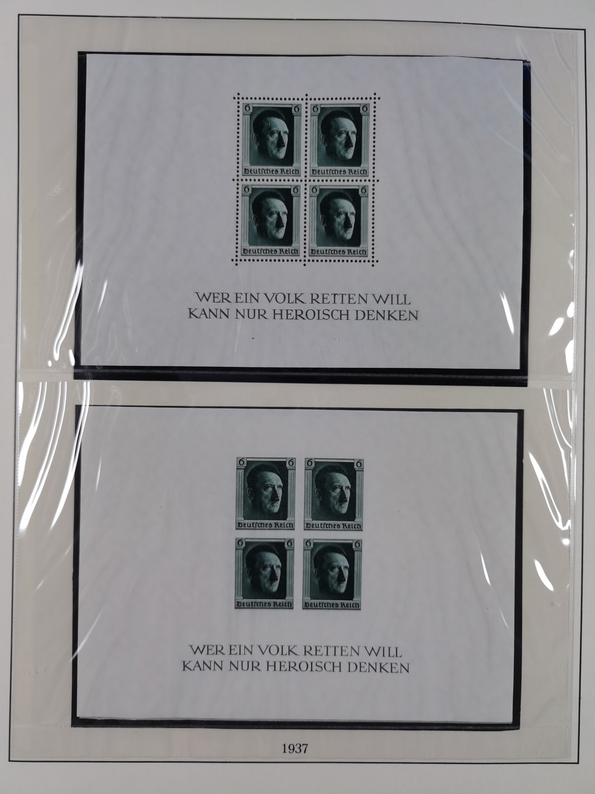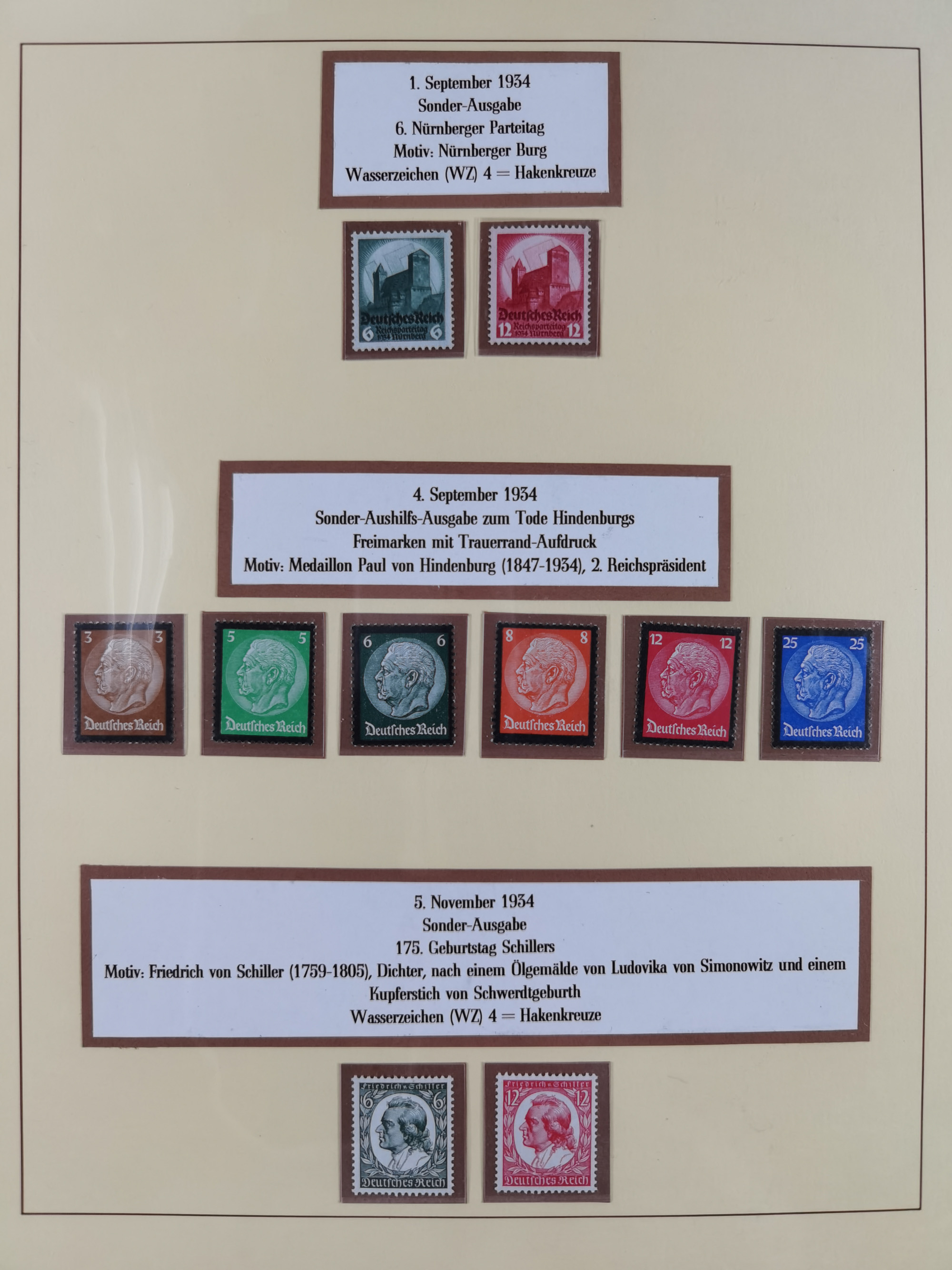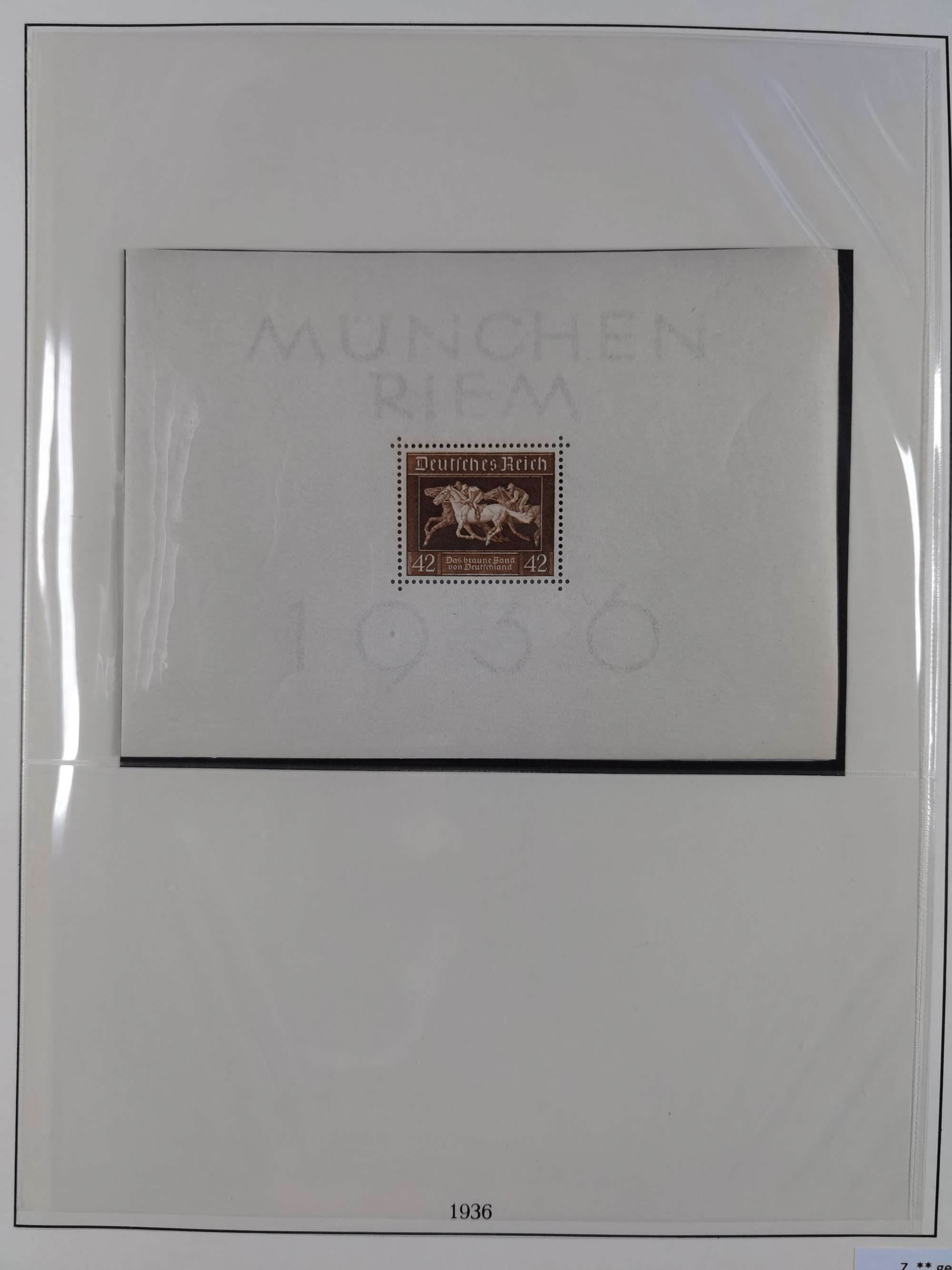 1933/45, meist postfrische Sammlung im Lindner-Falzlosalbum komplett mit vielen Besonderheiten. Mi. 482-495 postfrisch, Höchstwerte sign. A. Schlegel BPP, Mi. 496-98 ungebraucht, Mi. 507 postfrisch, Befund Schlegel BPP, Block 2 postfrisch (1 mm erhöht sign. Schlegel BPP), Mi. 529-539 x und Viererblock 539 y je postfrisch mit Attest Schlegel BPP, Bl. 3 Attest A. Schlegel BPP, Mi. 586 Y ungebraucht, Attest Oechsner BPP, Mi. 587 U ungebraucht, Attest H.-D. Schlegel BPP, Block 6z postfrisch, sign. Schlegel BPP, Mi. 641 x postfrisch, sign. D. Schlegel BPP, Mi. 659 x postfrisch, Befund Oechsner BPP, Mi. 671 x und 672 y sign., Mi. 814 Phasenabzug und Abzug vom Urstempel je postfrisch, viele Plattenfehler wie 909 I und 910 I und II je sign. A. Schlegel BPP.