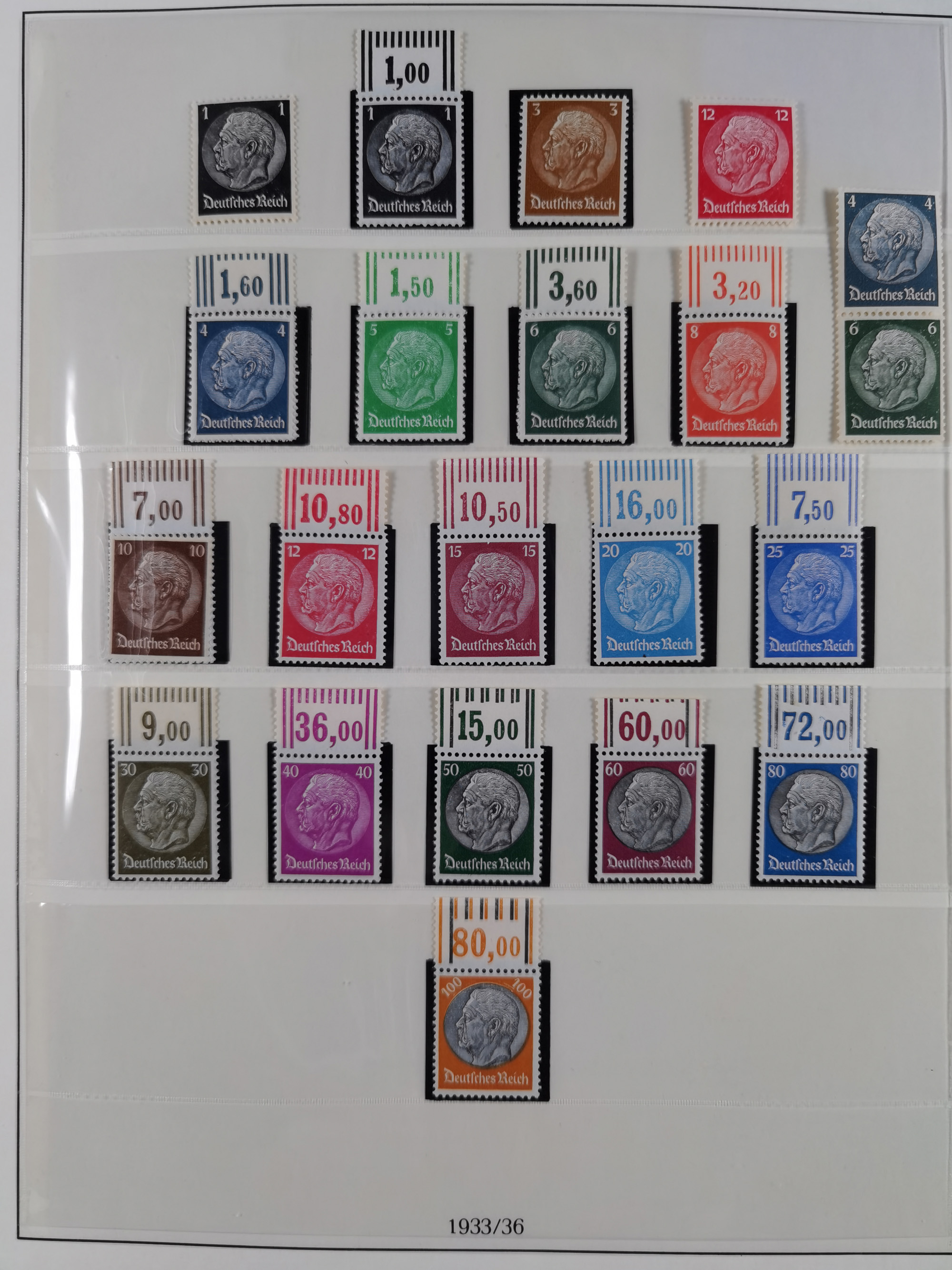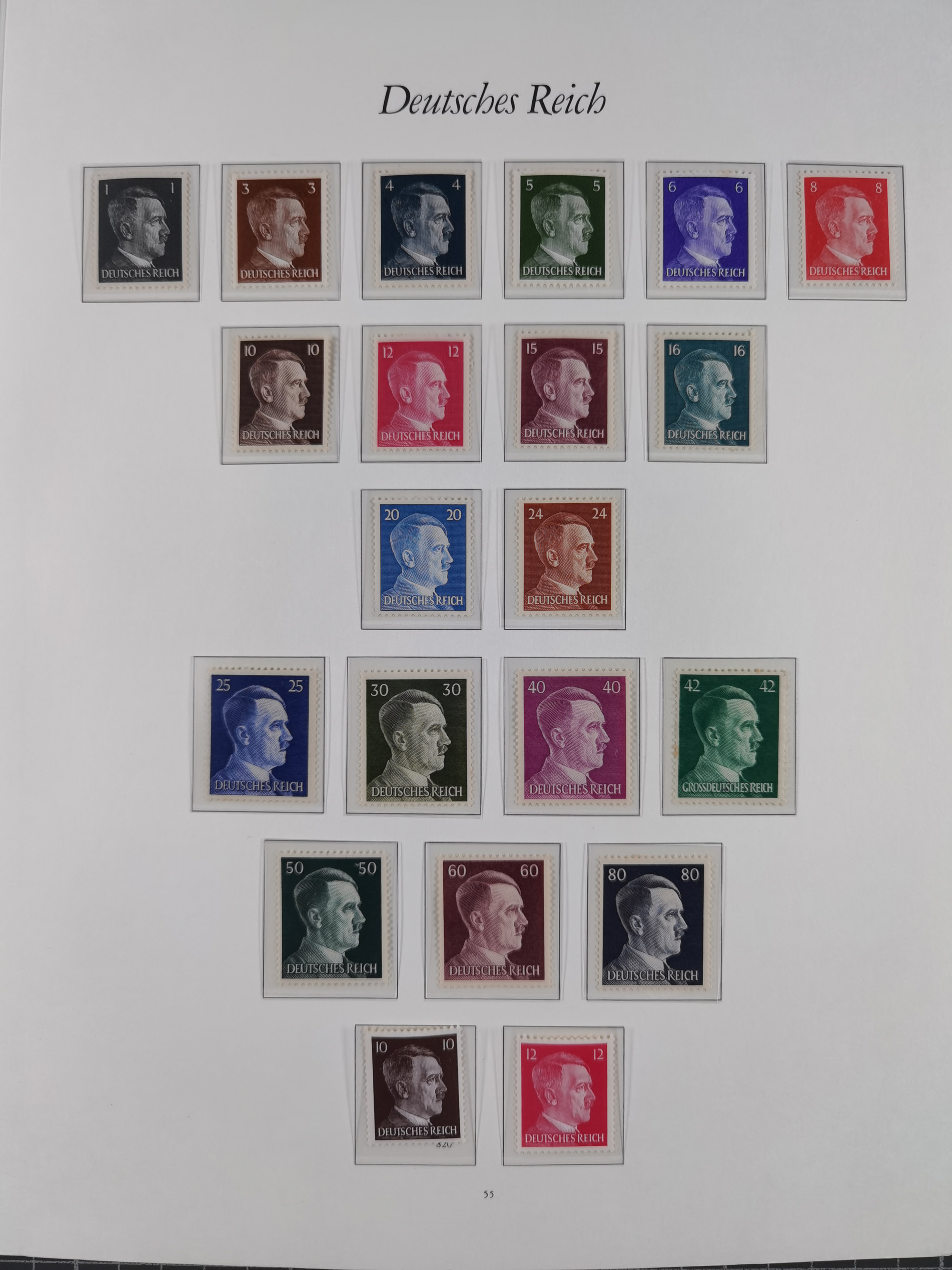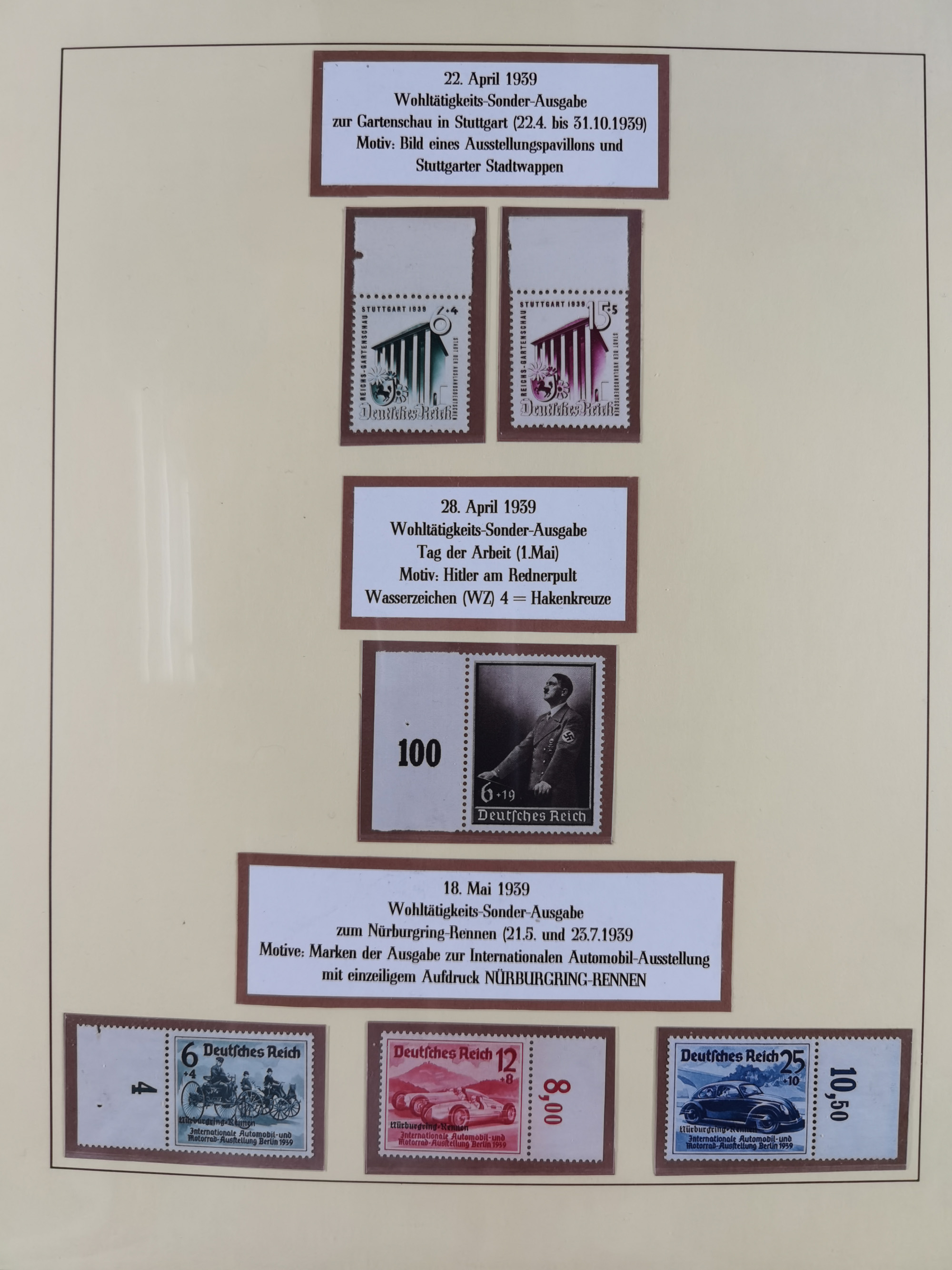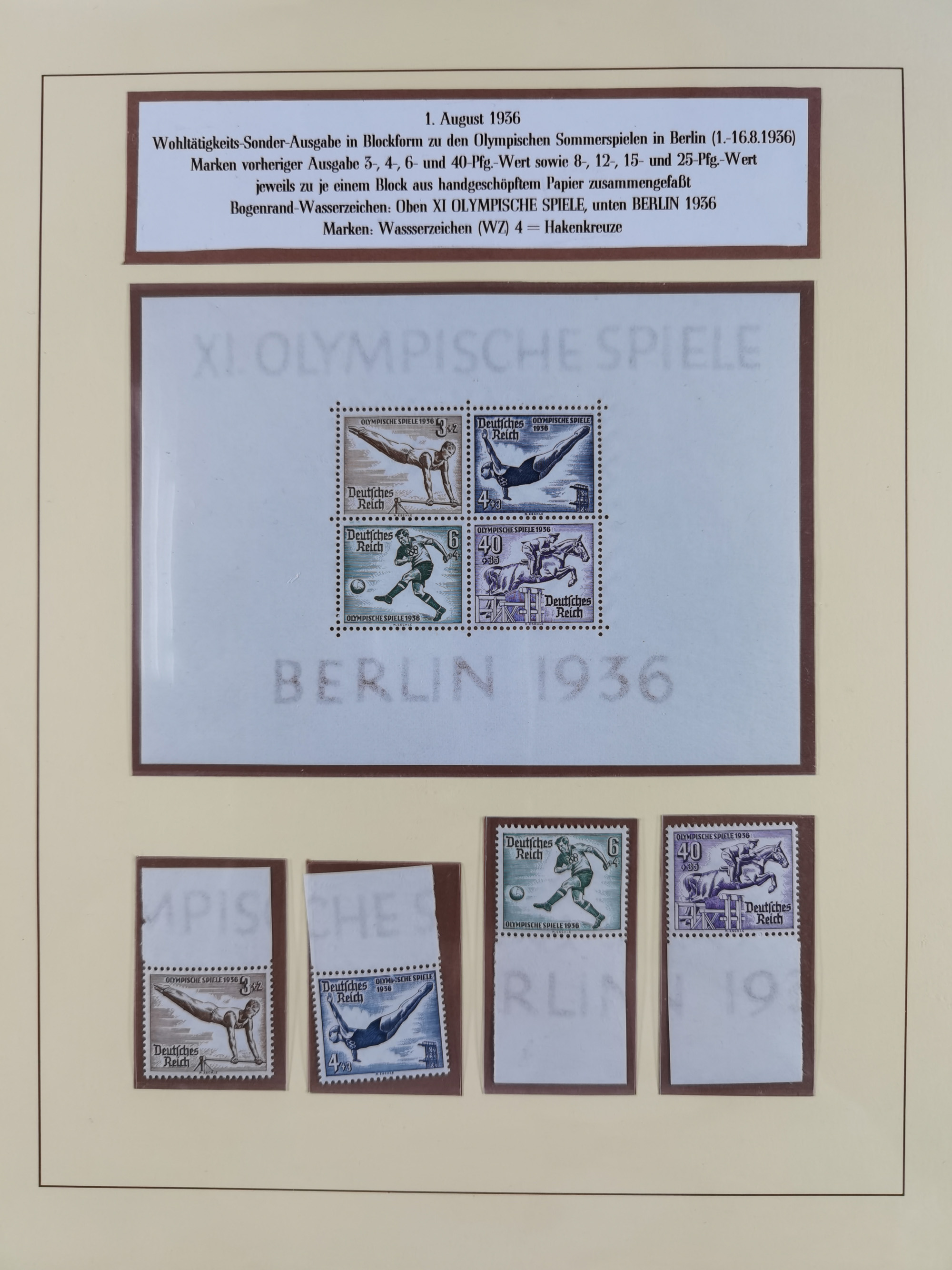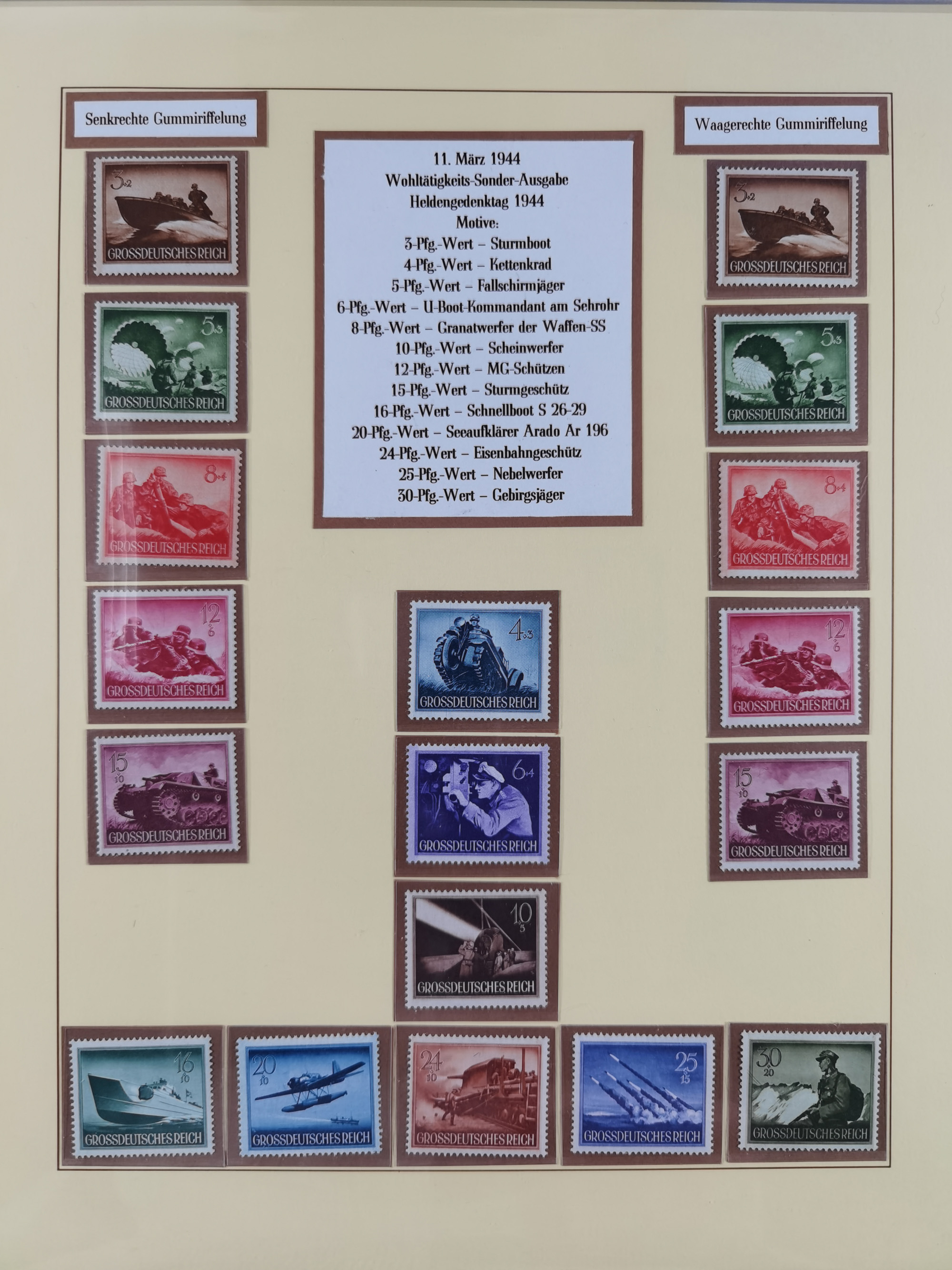 1933/45, meist postfrische Sammlung im Lindner-Falzlosalbum komplett mit vielen Besonderheiten. Mi. 482-495 postfrisch, Höchstwerte sign. A. Schlegel BPP, Mi. 496-98 ungebraucht, Mi. 507 postfrisch, Befund Schlegel BPP, Block 2 postfrisch (1 mm erhöht sign. Schlegel BPP), Mi. 529-539 x und Viererblock 539 y je postfrisch mit Attest Schlegel BPP, Bl. 3 Attest A. Schlegel BPP, Mi. 586 Y ungebraucht, Attest Oechsner BPP, Mi. 587 U ungebraucht, Attest H.-D. Schlegel BPP, Block 6z postfrisch, sign. Schlegel BPP, Mi. 641 x postfrisch, sign. D. Schlegel BPP, Mi. 659 x postfrisch, Befund Oechsner BPP, Mi. 671 x und 672 y sign., Mi. 814 Phasenabzug und Abzug vom Urstempel je postfrisch, viele Plattenfehler wie 909 I und 910 I und II je sign. A. Schlegel BPP.