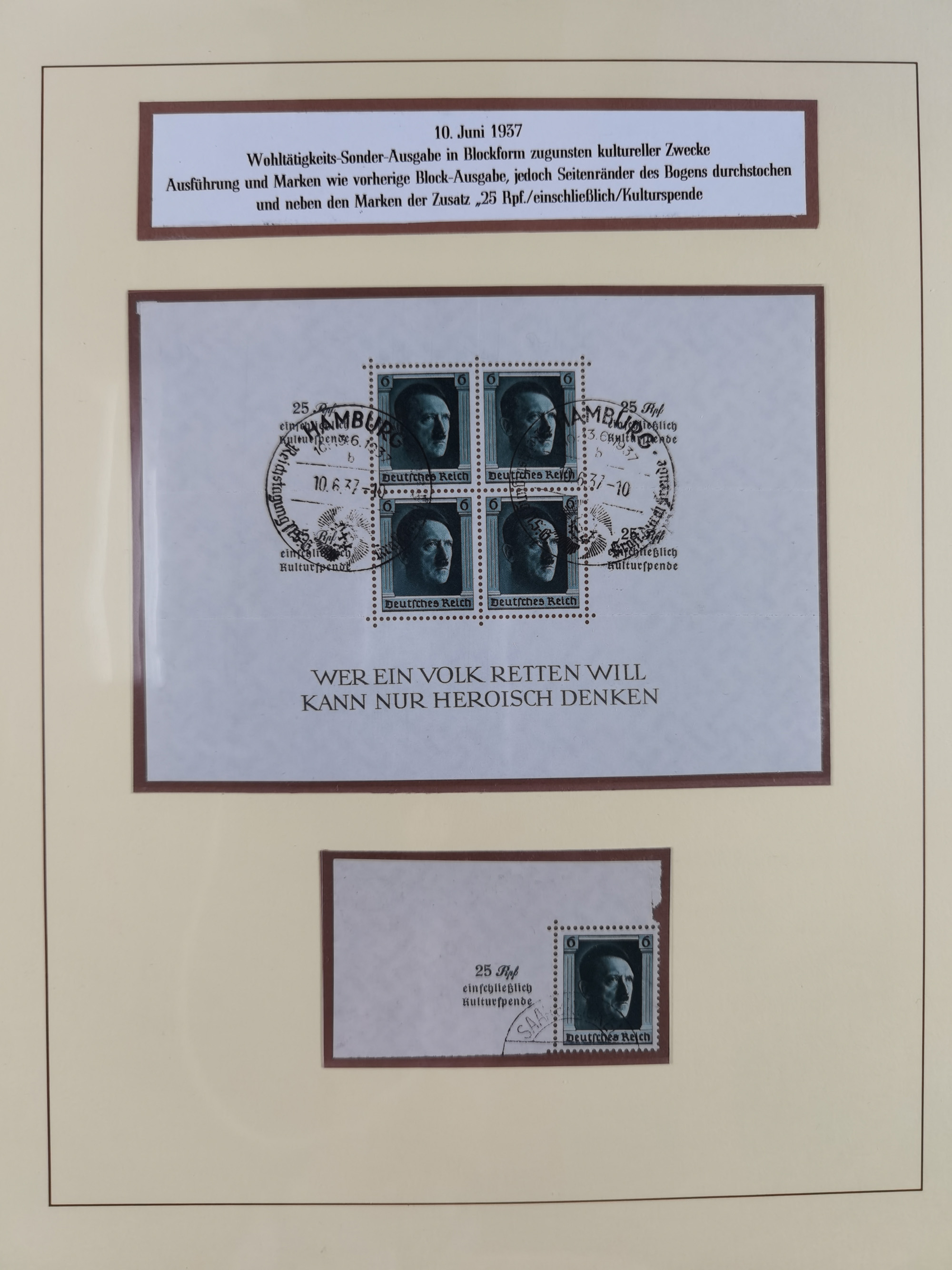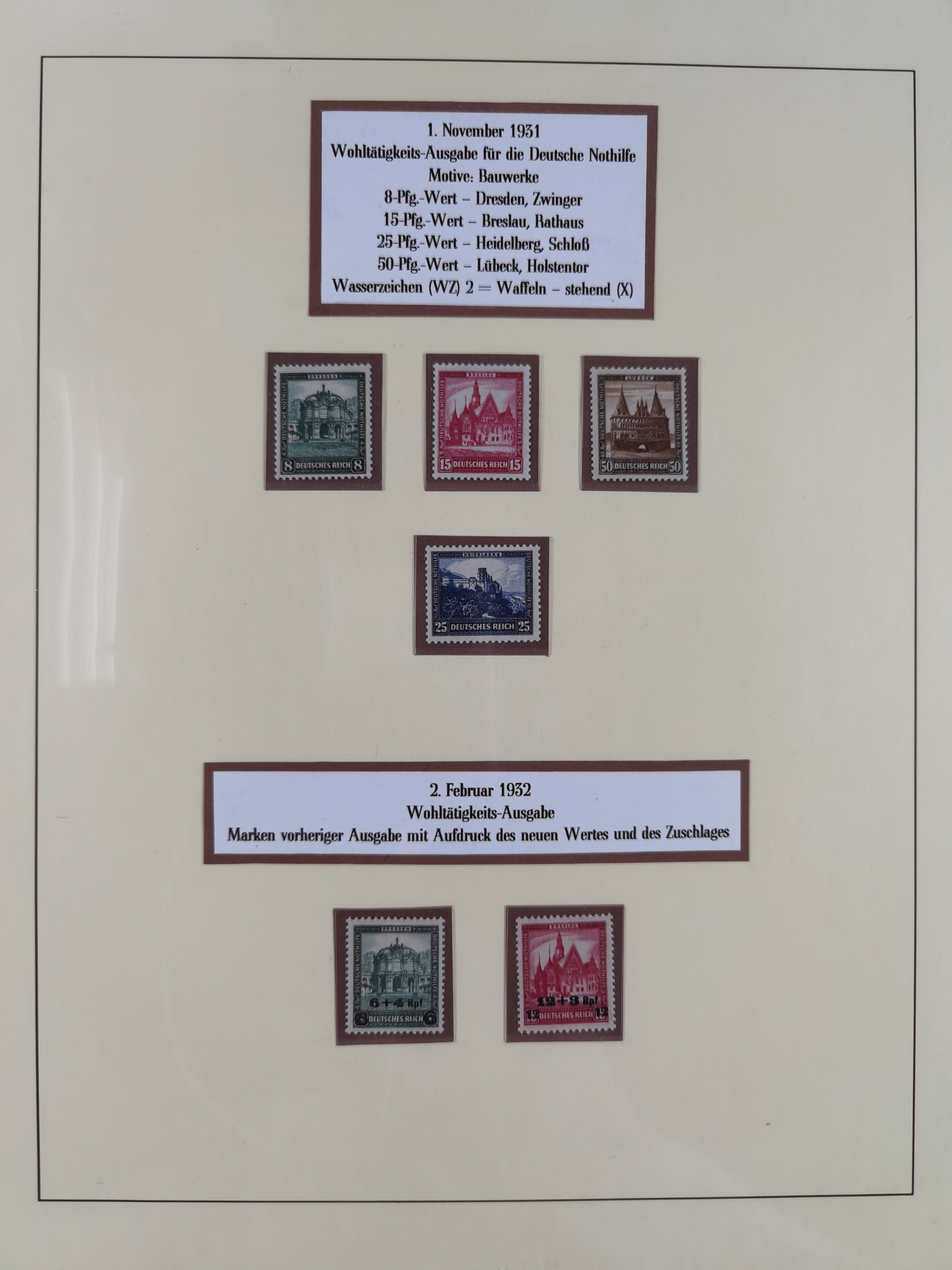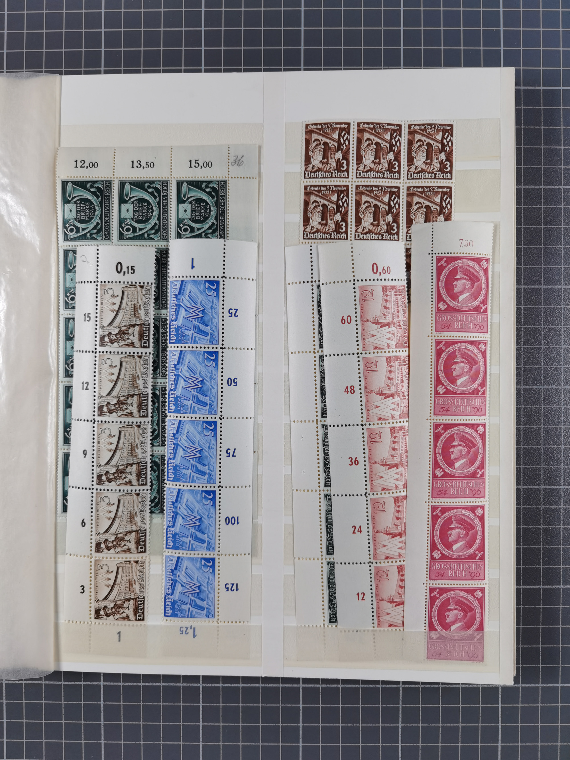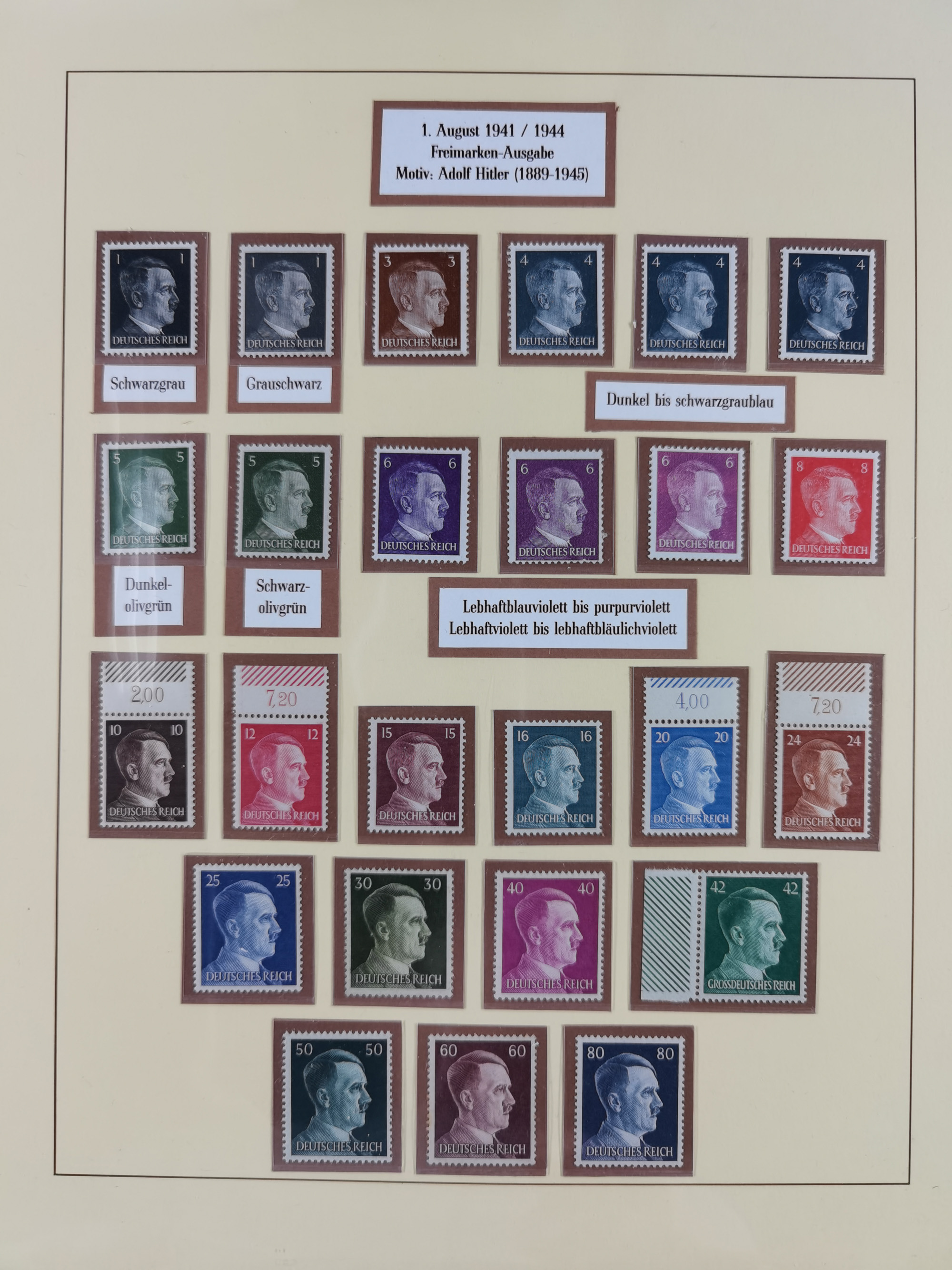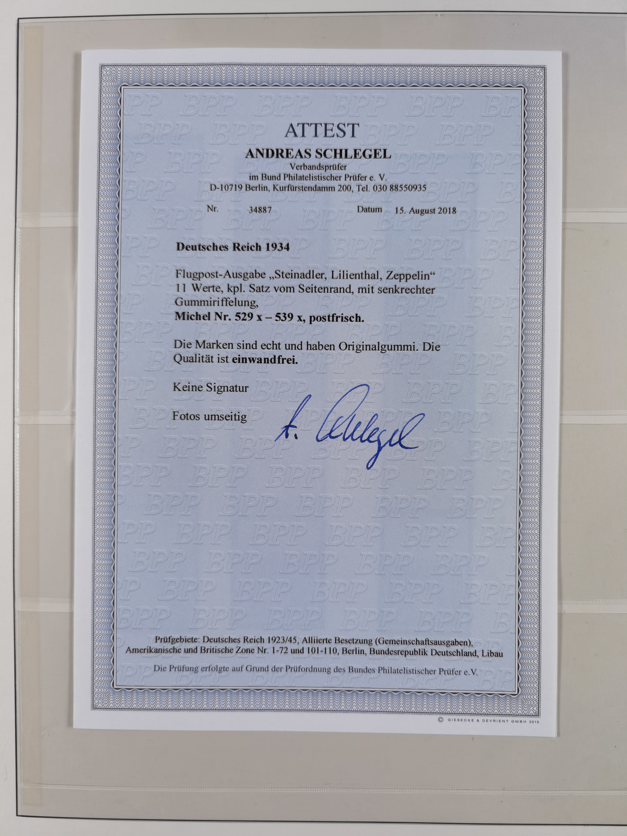 1933/45, meist postfrische Sammlung im Lindner-Falzlosalbum komplett mit vielen Besonderheiten. Mi. 482-495 postfrisch, Höchstwerte sign. A. Schlegel BPP, Mi. 496-98 ungebraucht, Mi. 507 postfrisch, Befund Schlegel BPP, Block 2 postfrisch (1 mm erhöht sign. Schlegel BPP), Mi. 529-539 x und Viererblock 539 y je postfrisch mit Attest Schlegel BPP, Bl. 3 Attest A. Schlegel BPP, Mi. 586 Y ungebraucht, Attest Oechsner BPP, Mi. 587 U ungebraucht, Attest H.-D. Schlegel BPP, Block 6z postfrisch, sign. Schlegel BPP, Mi. 641 x postfrisch, sign. D. Schlegel BPP, Mi. 659 x postfrisch, Befund Oechsner BPP, Mi. 671 x und 672 y sign., Mi. 814 Phasenabzug und Abzug vom Urstempel je postfrisch, viele Plattenfehler wie 909 I und 910 I und II je sign. A. Schlegel BPP.
