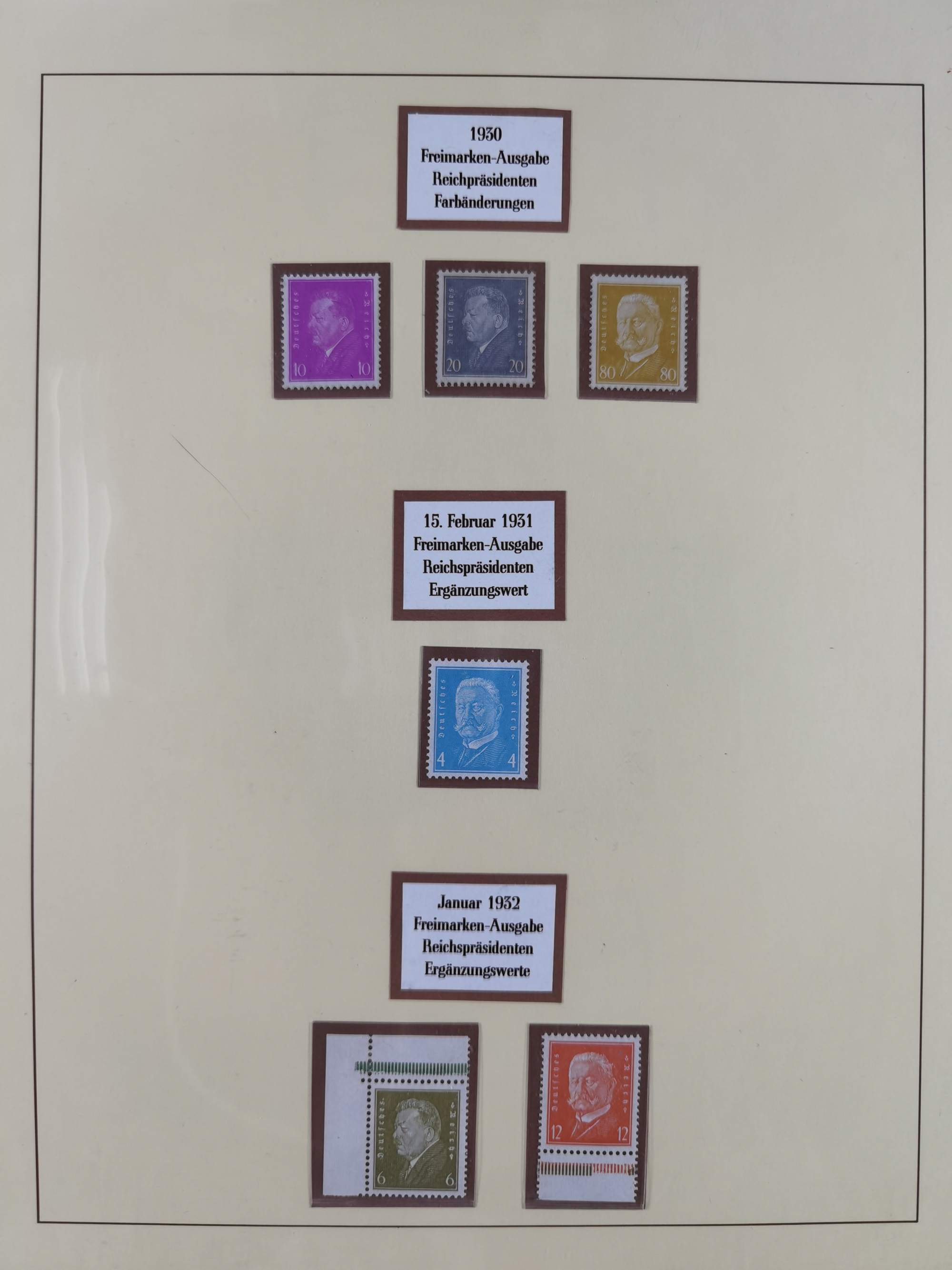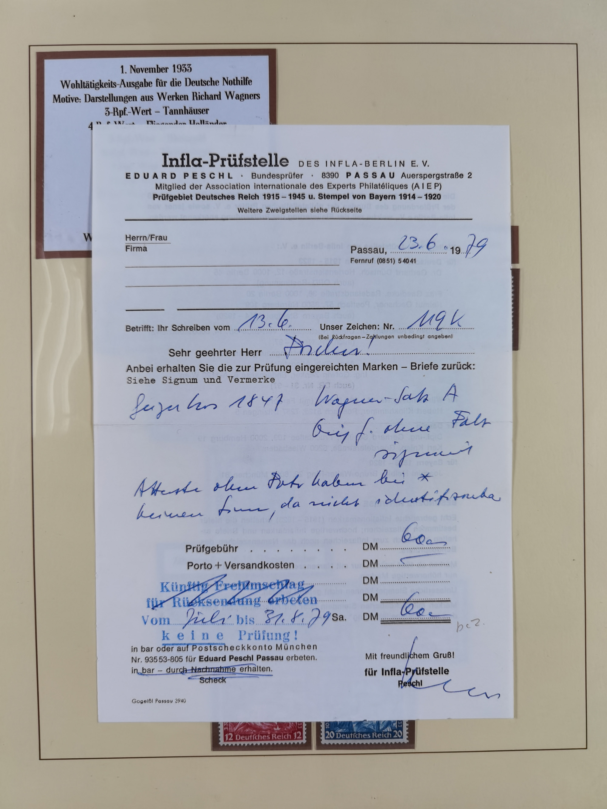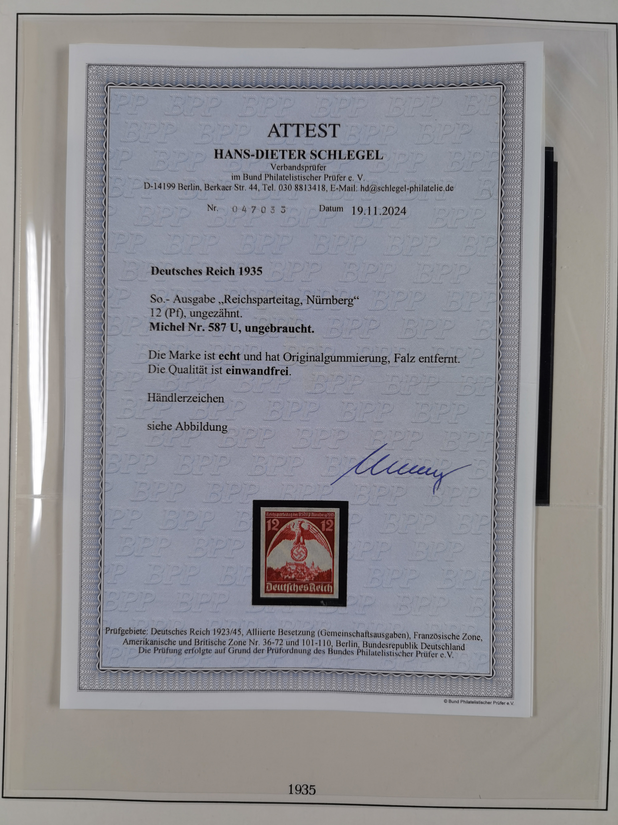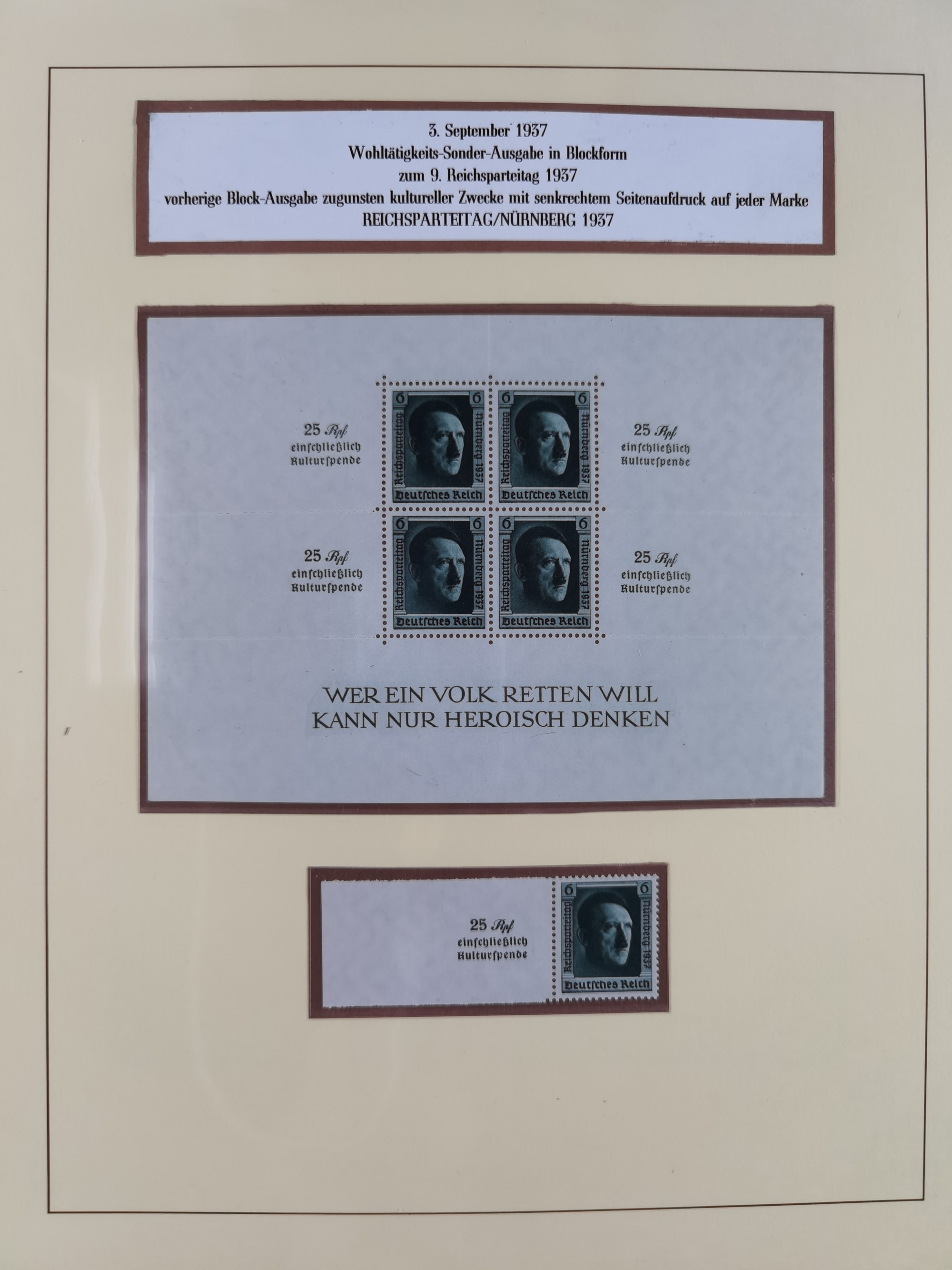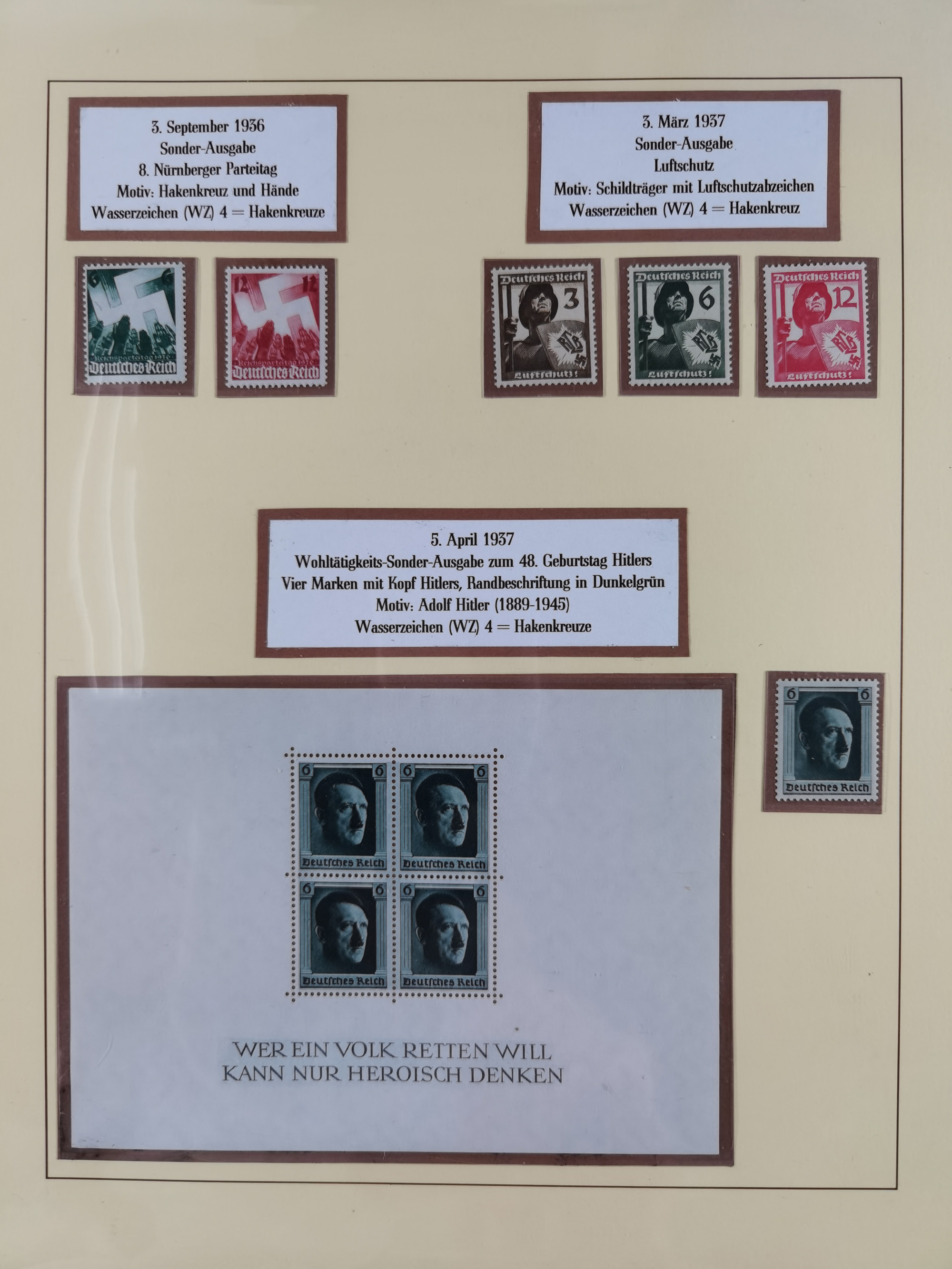 1933/45, meist postfrische Sammlung im Lindner-Falzlosalbum komplett mit vielen Besonderheiten. Mi. 482-495 postfrisch, Höchstwerte sign. A. Schlegel BPP, Mi. 496-98 ungebraucht, Mi. 507 postfrisch, Befund Schlegel BPP, Block 2 postfrisch (1 mm erhöht sign. Schlegel BPP), Mi. 529-539 x und Viererblock 539 y je postfrisch mit Attest Schlegel BPP, Bl. 3 Attest A. Schlegel BPP, Mi. 586 Y ungebraucht, Attest Oechsner BPP, Mi. 587 U ungebraucht, Attest H.-D. Schlegel BPP, Block 6z postfrisch, sign. Schlegel BPP, Mi. 641 x postfrisch, sign. D. Schlegel BPP, Mi. 659 x postfrisch, Befund Oechsner BPP, Mi. 671 x und 672 y sign., Mi. 814 Phasenabzug und Abzug vom Urstempel je postfrisch, viele Plattenfehler wie 909 I und 910 I und II je sign. A. Schlegel BPP.