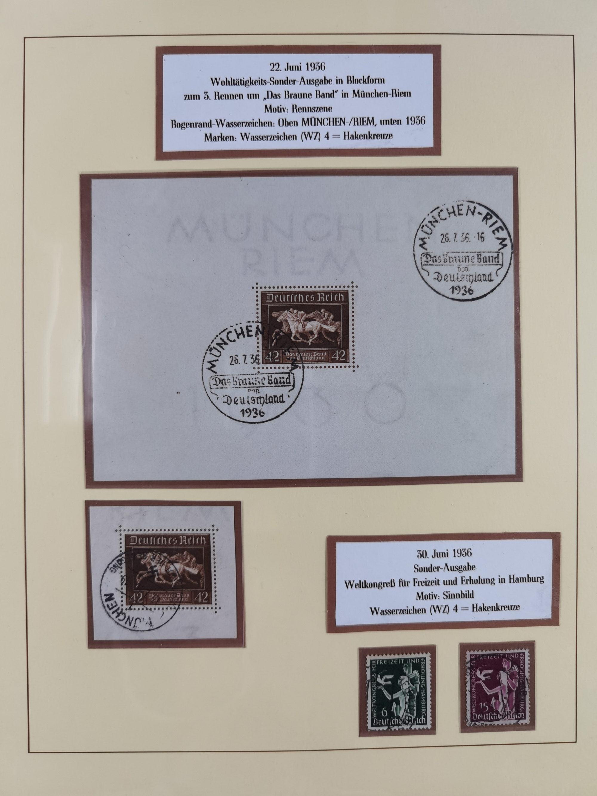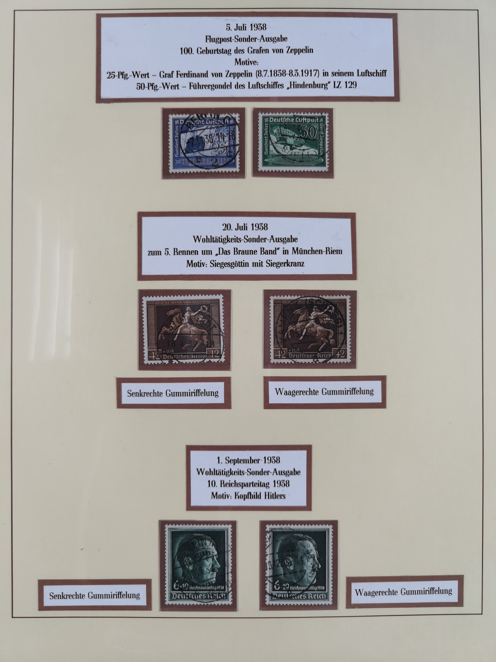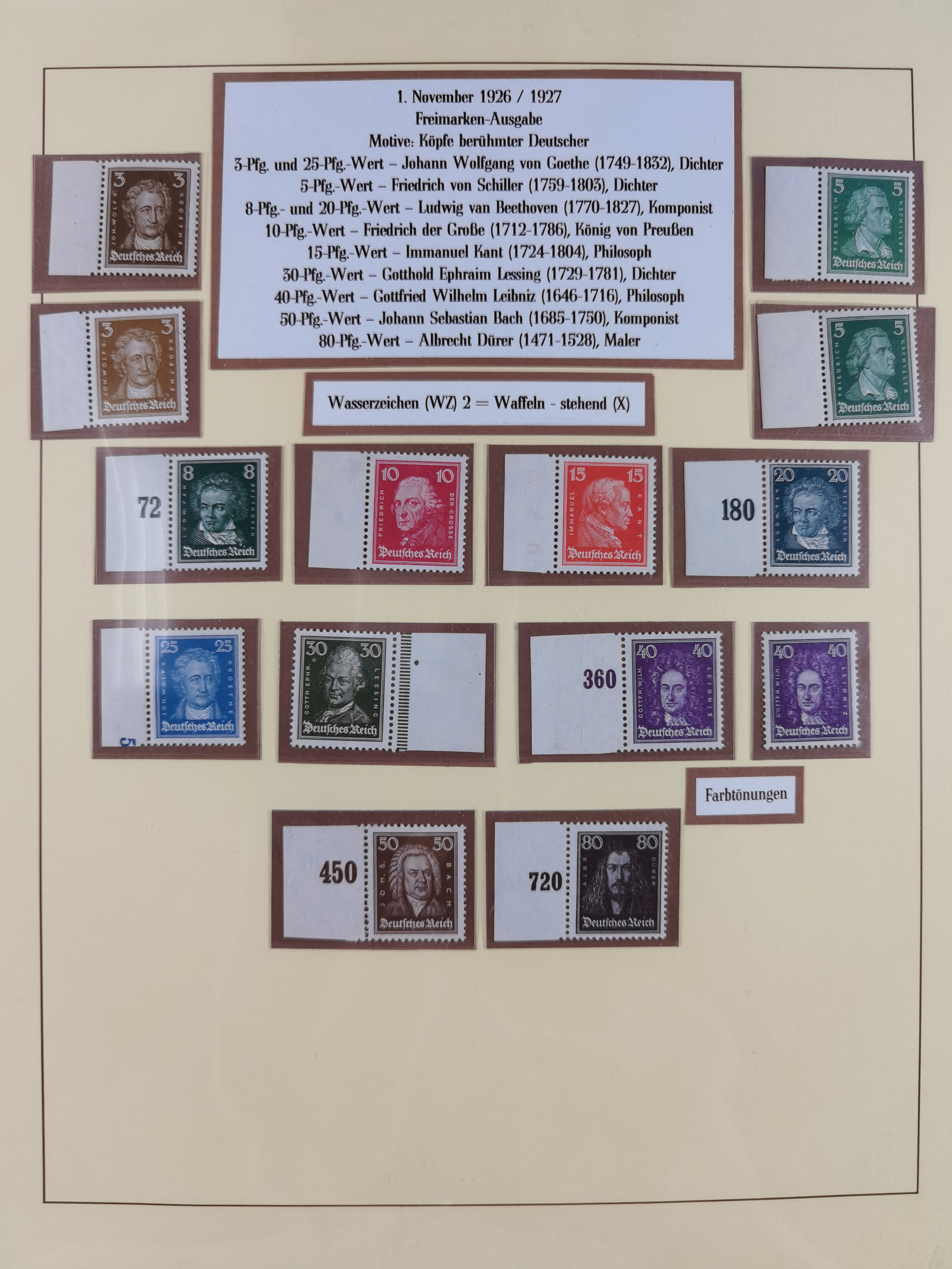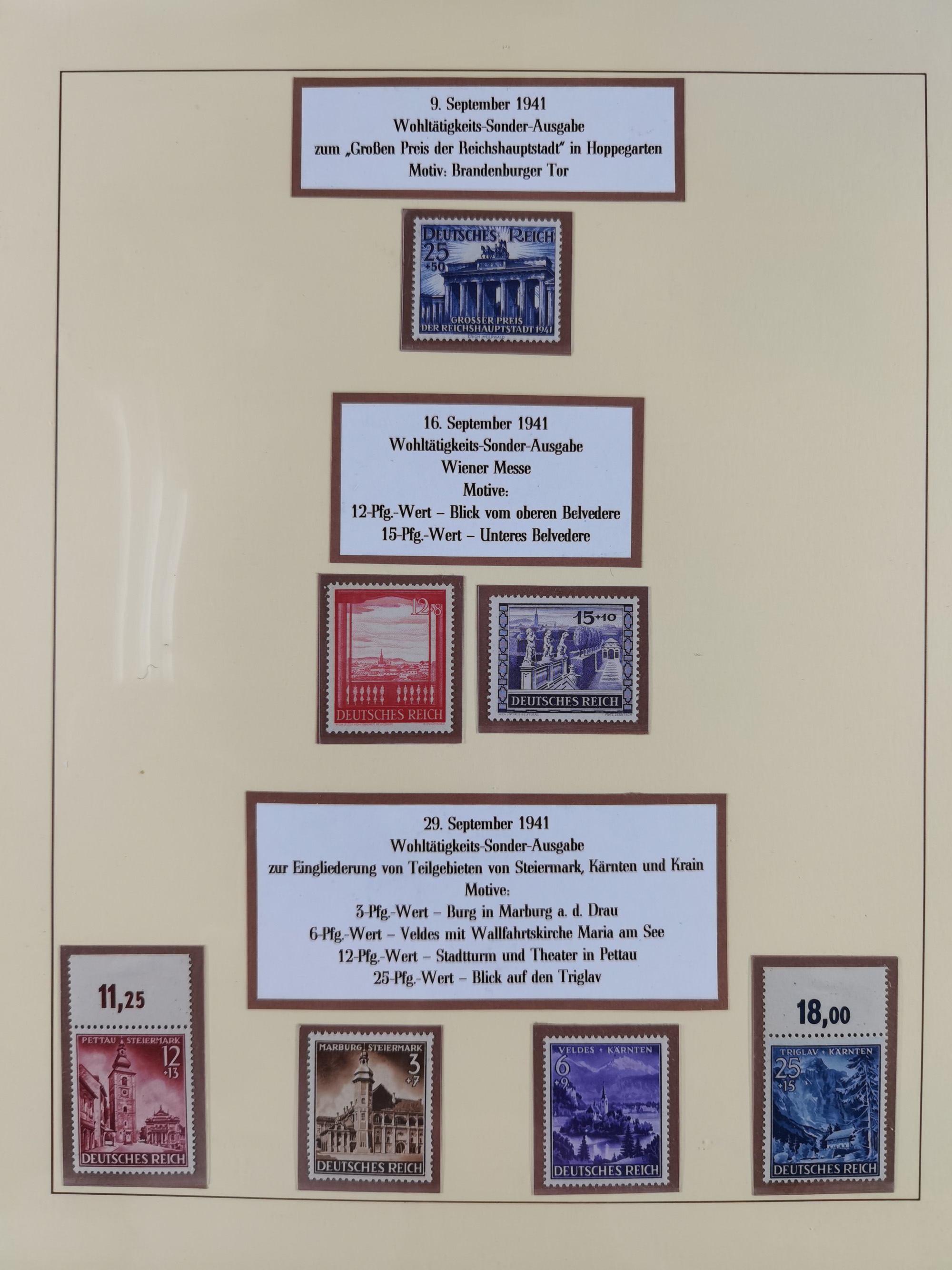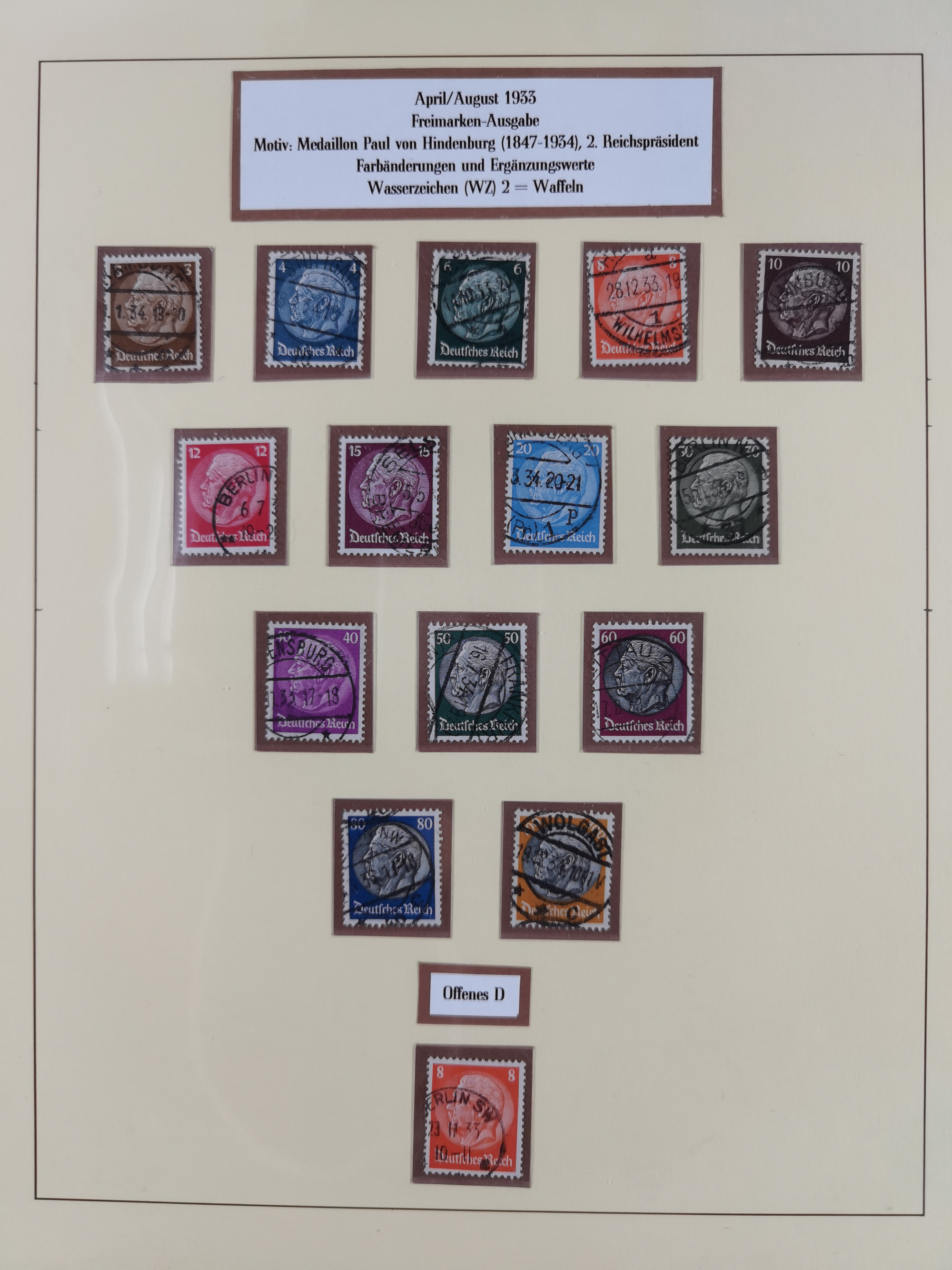 1933/45, meist postfrische Sammlung im Lindner-Falzlosalbum komplett mit vielen Besonderheiten. Mi. 482-495 postfrisch, Höchstwerte sign. A. Schlegel BPP, Mi. 496-98 ungebraucht, Mi. 507 postfrisch, Befund Schlegel BPP, Block 2 postfrisch (1 mm erhöht sign. Schlegel BPP), Mi. 529-539 x und Viererblock 539 y je postfrisch mit Attest Schlegel BPP, Bl. 3 Attest A. Schlegel BPP, Mi. 586 Y ungebraucht, Attest Oechsner BPP, Mi. 587 U ungebraucht, Attest H.-D. Schlegel BPP, Block 6z postfrisch, sign. Schlegel BPP, Mi. 641 x postfrisch, sign. D. Schlegel BPP, Mi. 659 x postfrisch, Befund Oechsner BPP, Mi. 671 x und 672 y sign., Mi. 814 Phasenabzug und Abzug vom Urstempel je postfrisch, viele Plattenfehler wie 909 I und 910 I und II je sign. A. Schlegel BPP.
