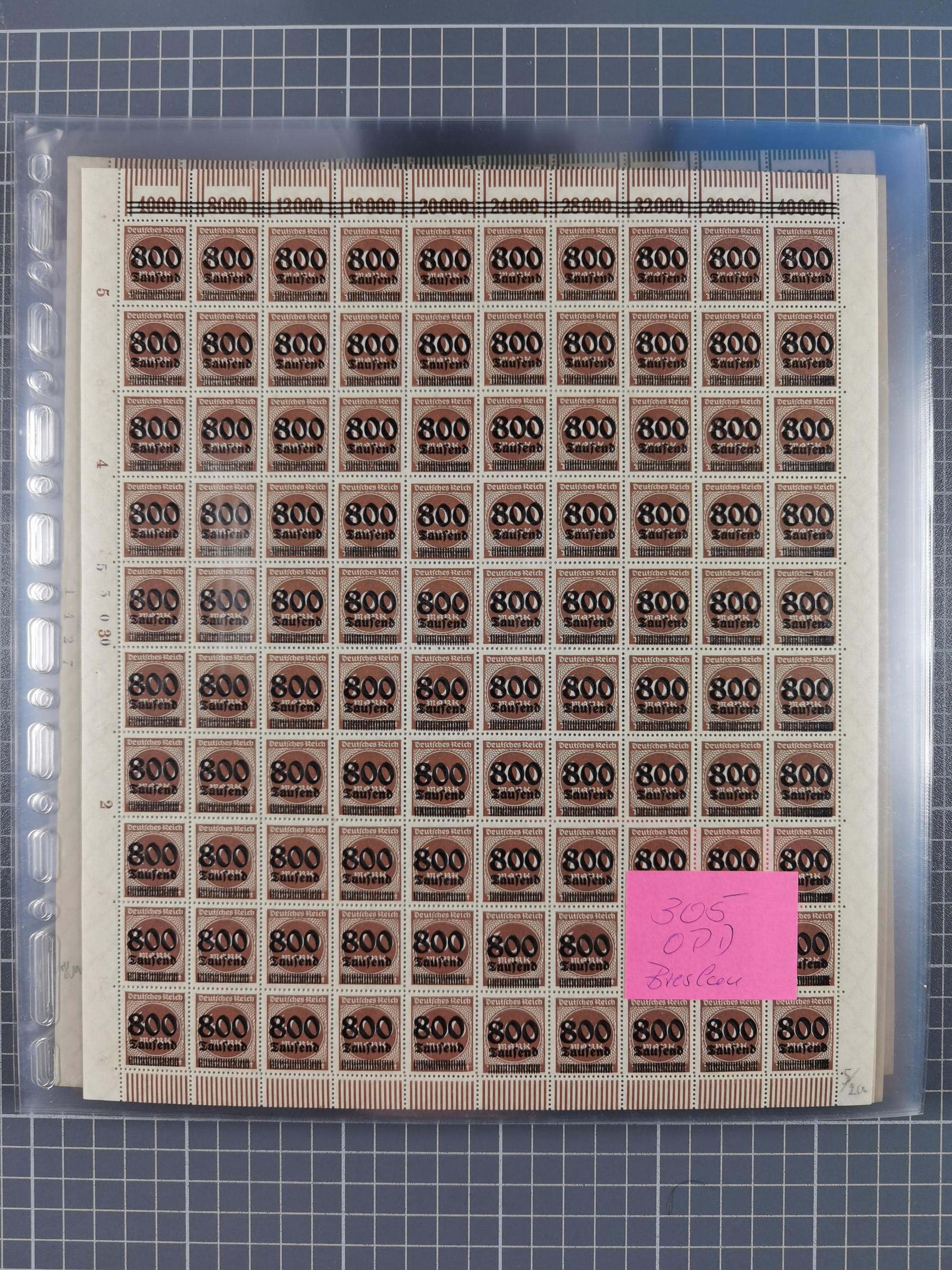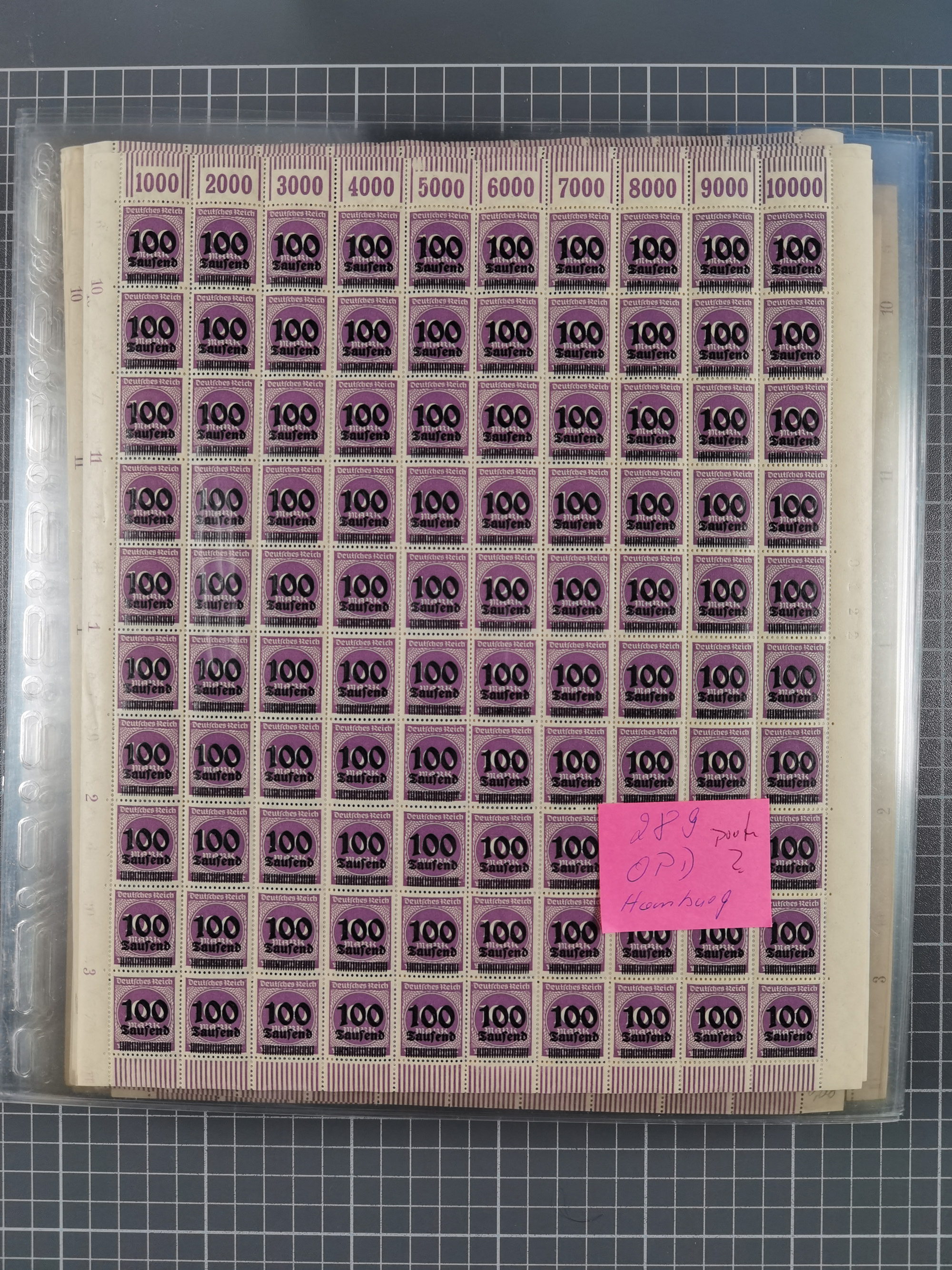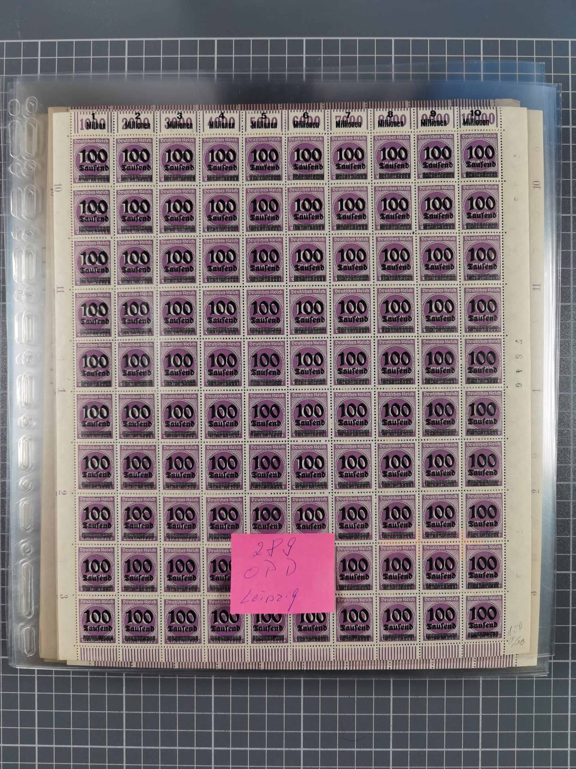 1923, OPD-Bogen, Sammlung von rund 70 Stück, einige mehrfach, dabei u. A. 333AW (Frankfurt) und 335B (Breslau und Stuttgart). Teils übliche kleine Mängel, jedoch insgesamt sehr sauber, meist einzeln in Kunststoffhüllen