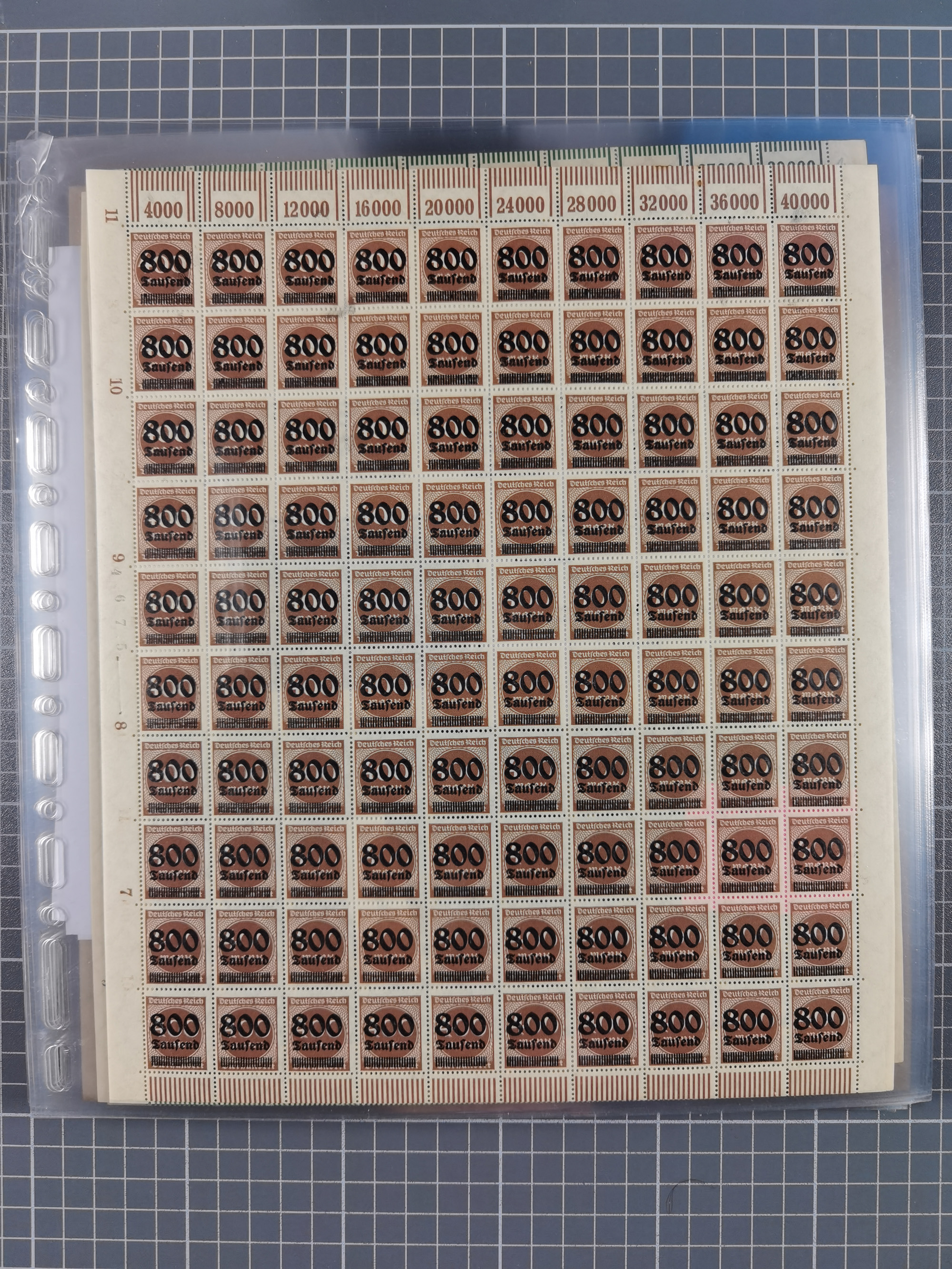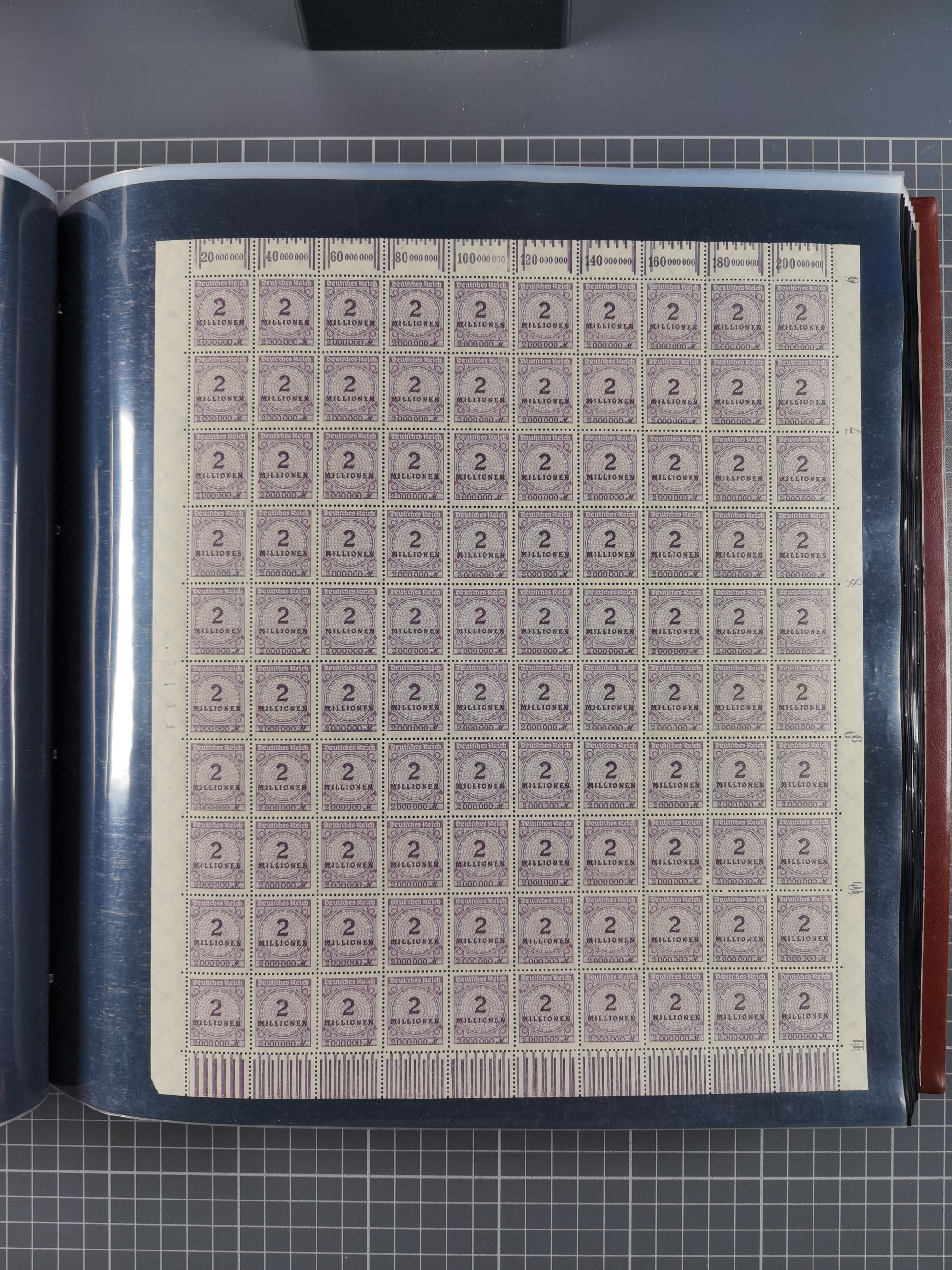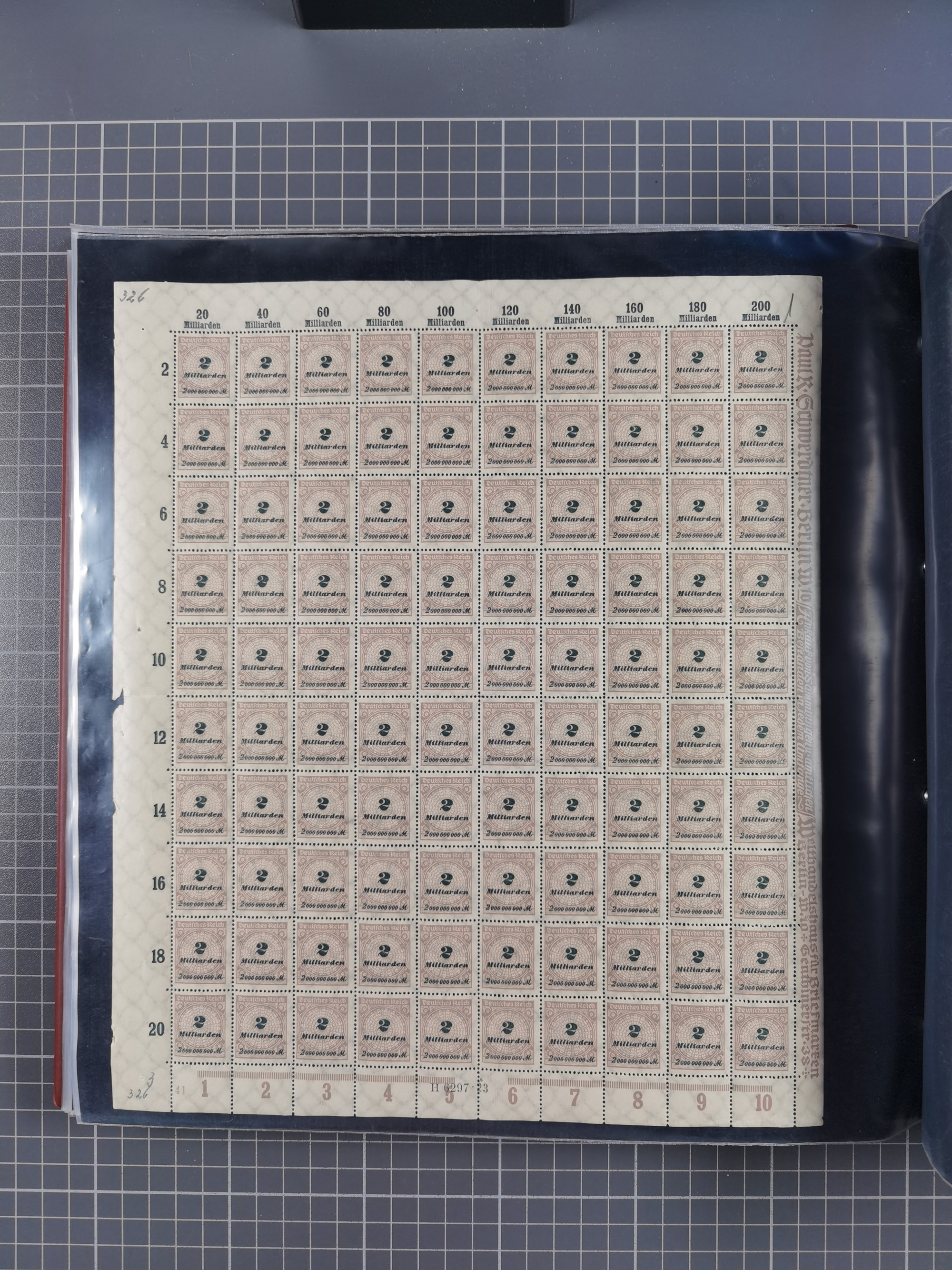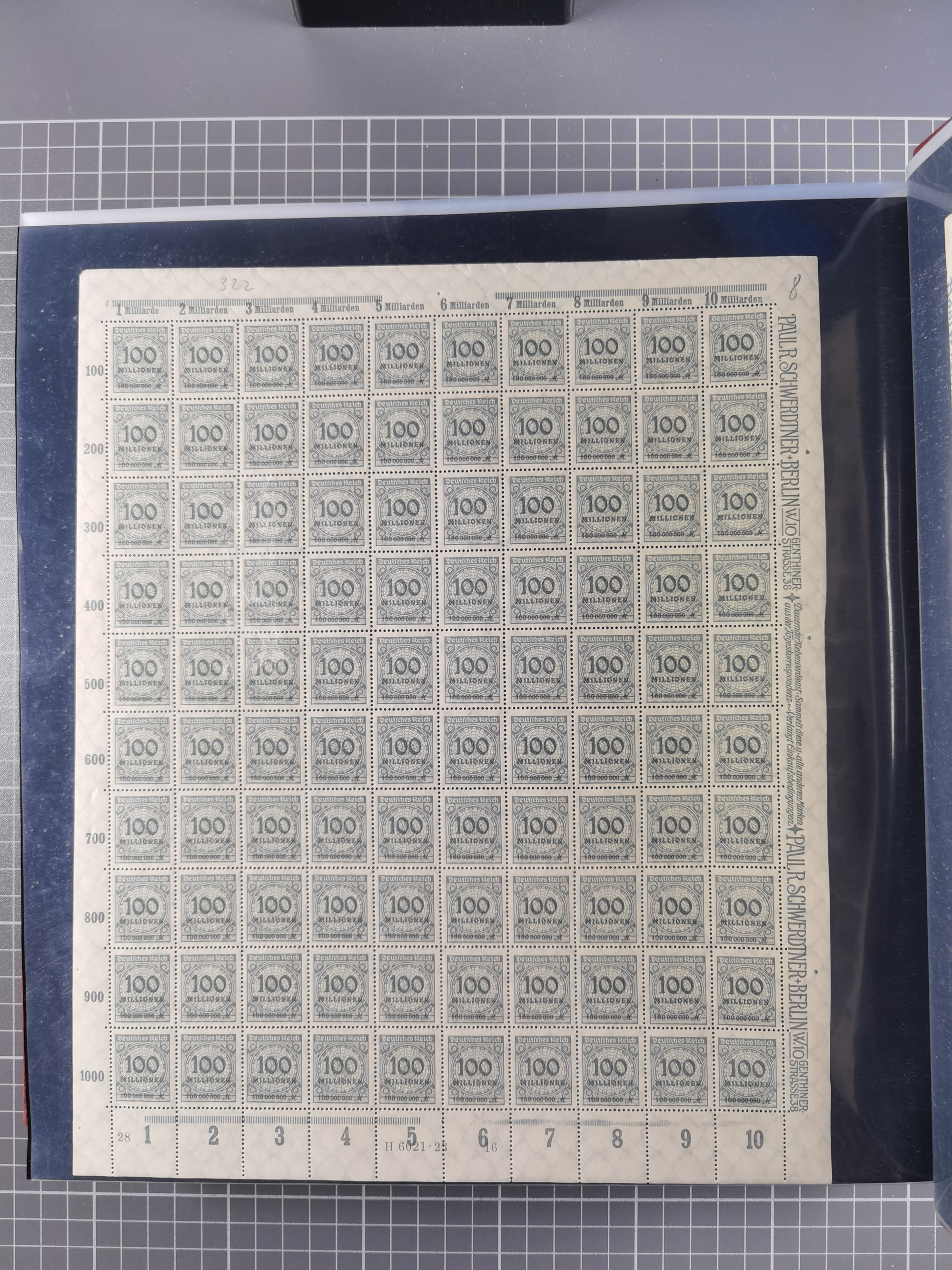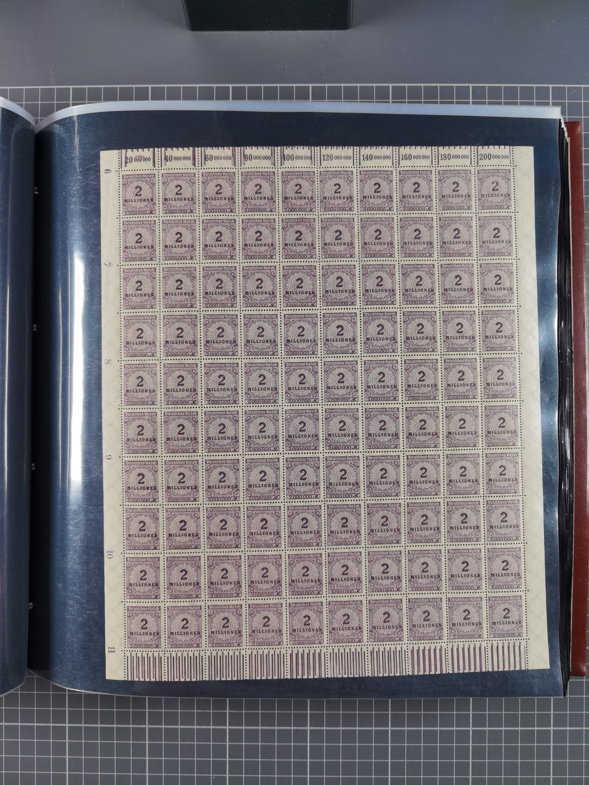 1923, meist postfrische Sammlung mit ca. 200 Bogen ex Mi.-Nr. 313-30, dabei u.a. Mi.-Nr. 330A (4) und 330B (3), gute Erhaltung, teils übliche Einschränkungen, in zwei Alben