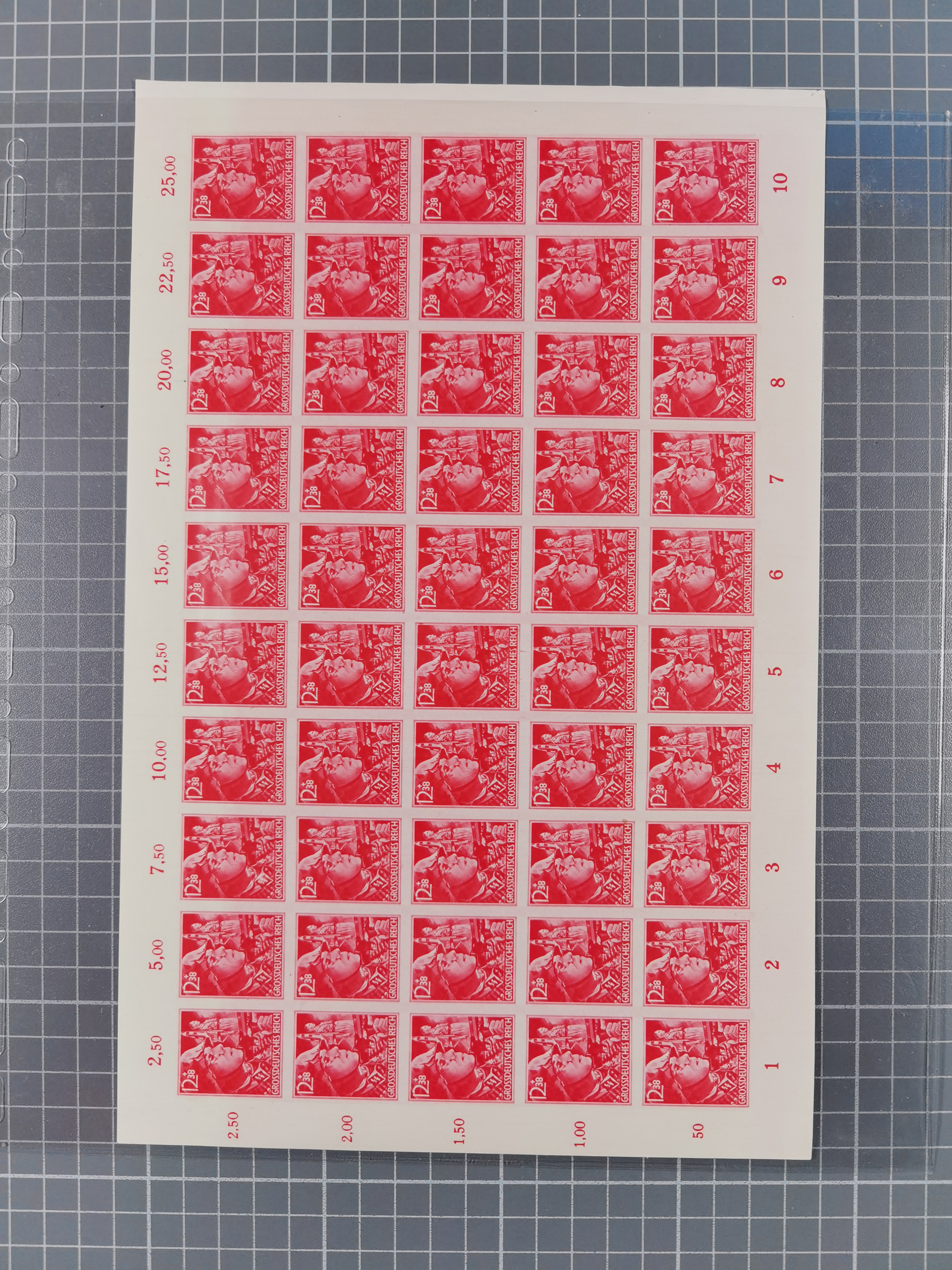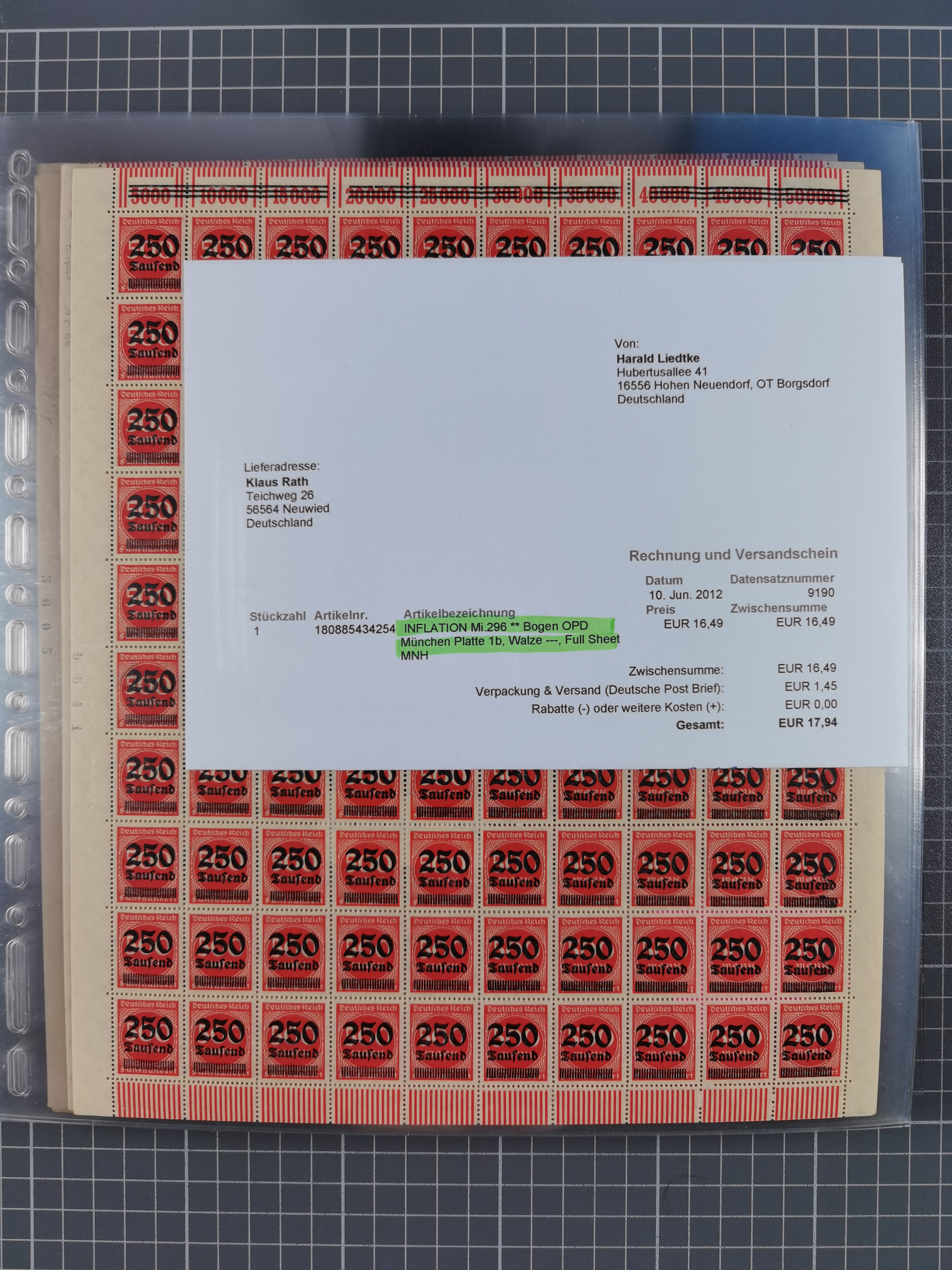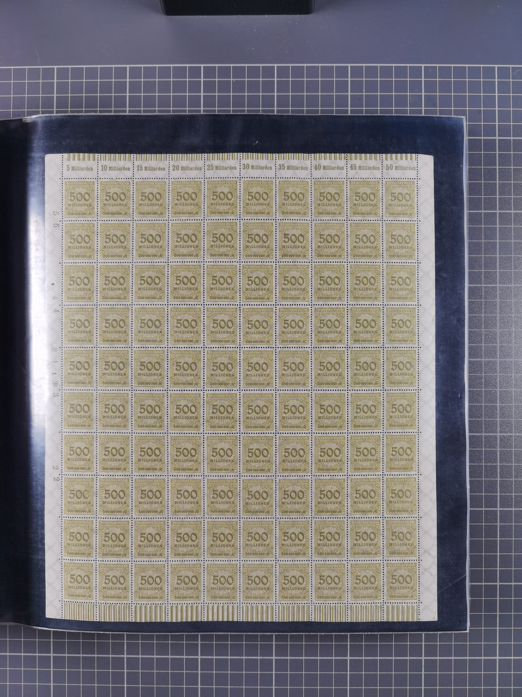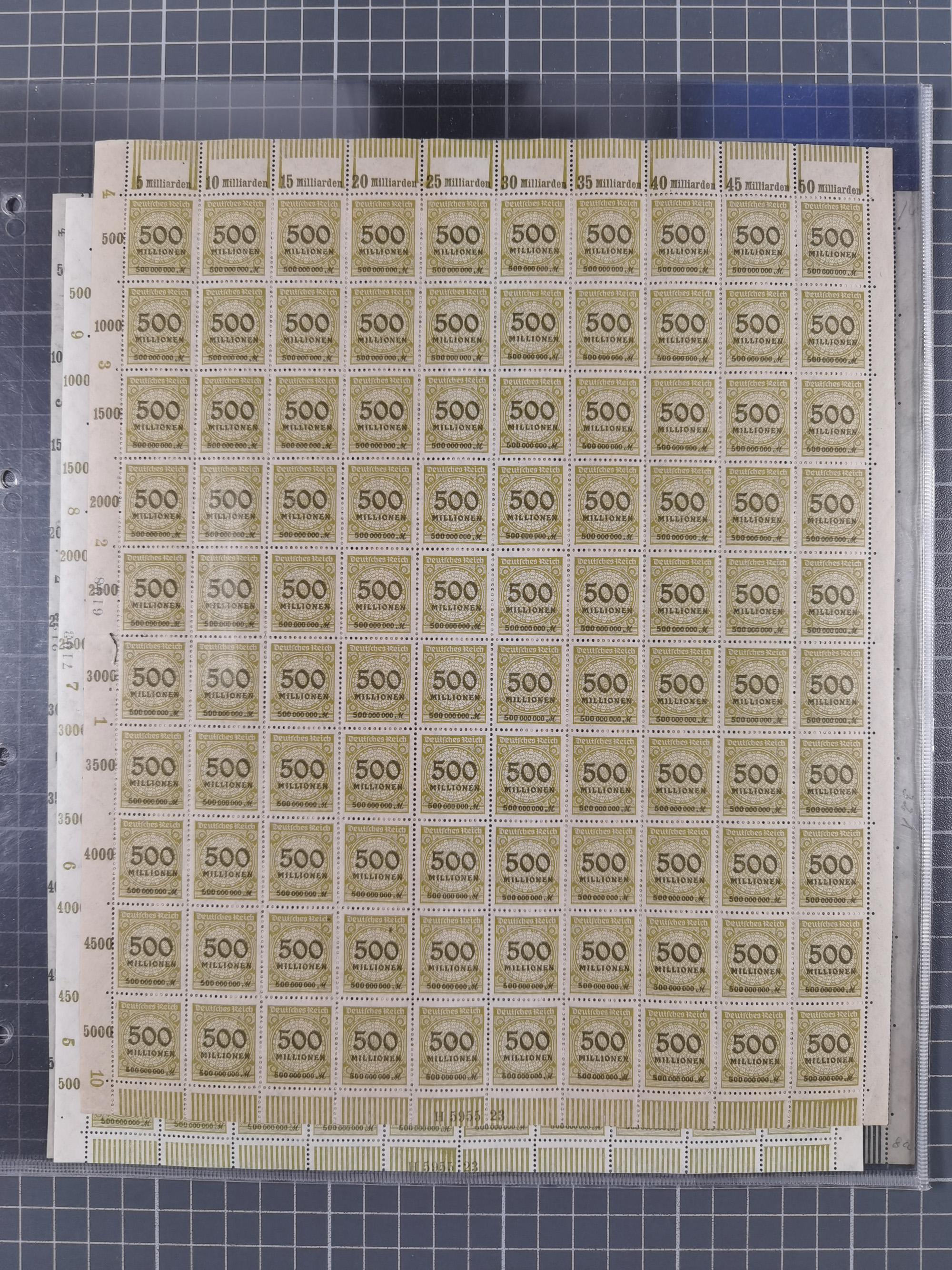 1923, meist postfrische Partie mit 2 Bogen Mi.-Nr. 321 und 4 Bogen Mi.-Nr. 324, alle Bogen in Platte/Walze gedruckt, jeweils ein UB und ein OB sowie beide HAN, teils angetrennt/gefaltet bzw. Randfehler und 2 Marken defekt, sonst gute Erhaltung