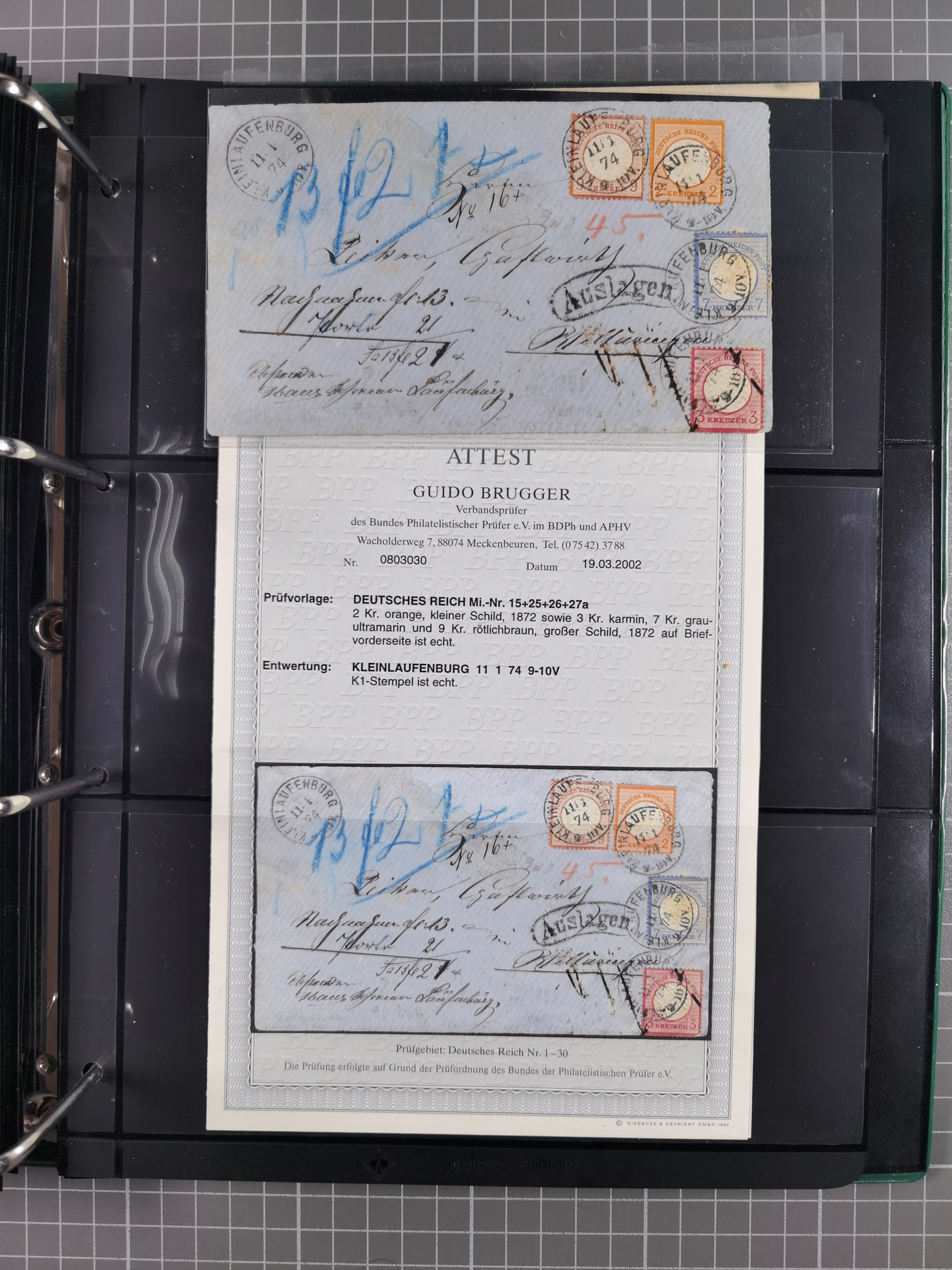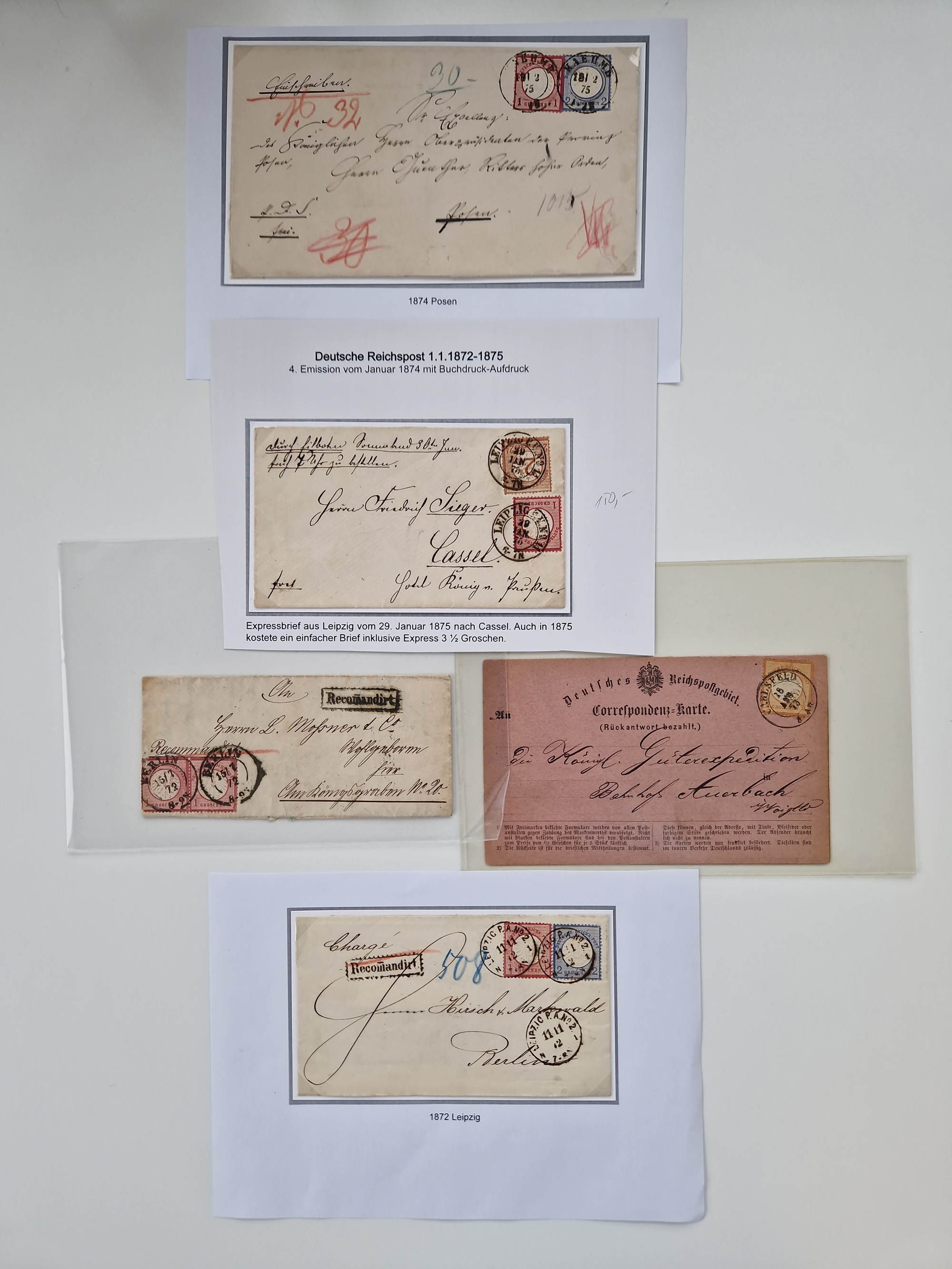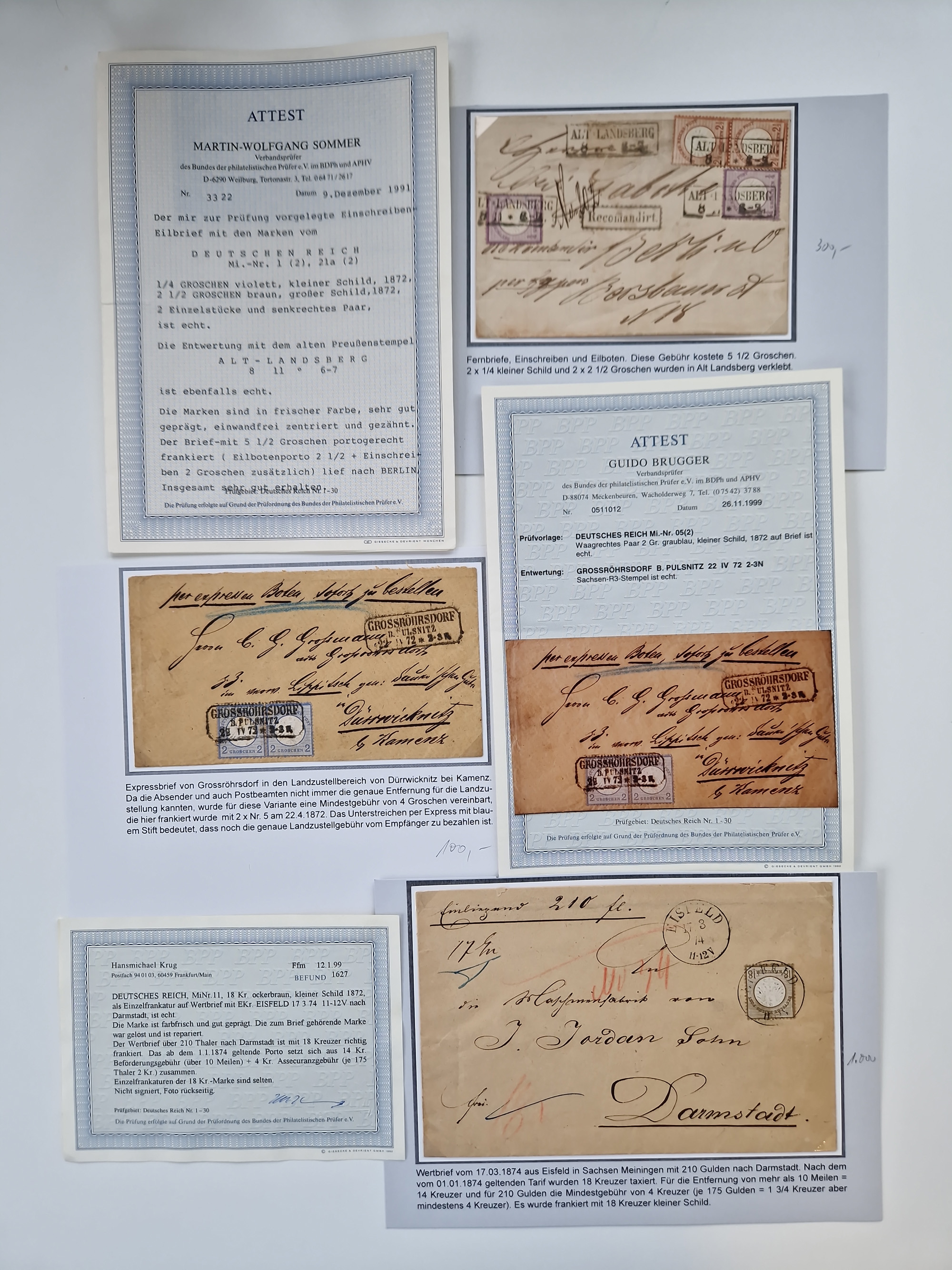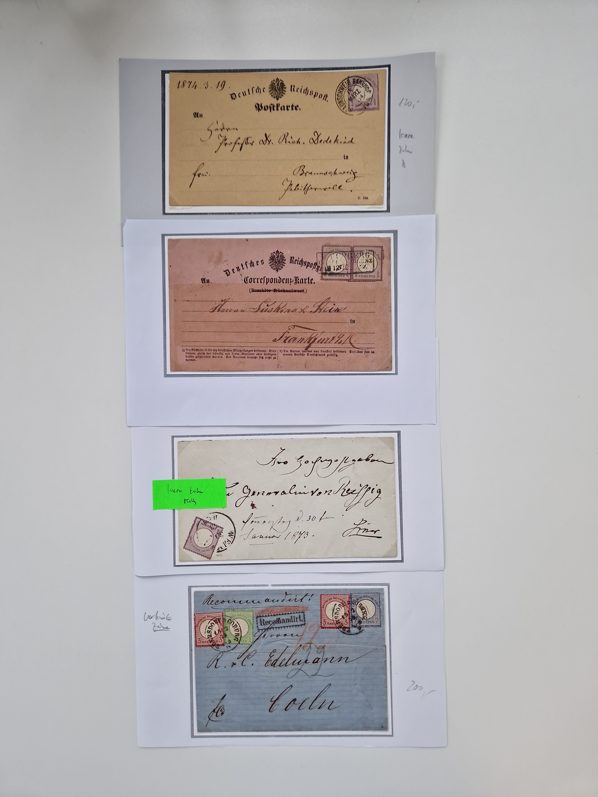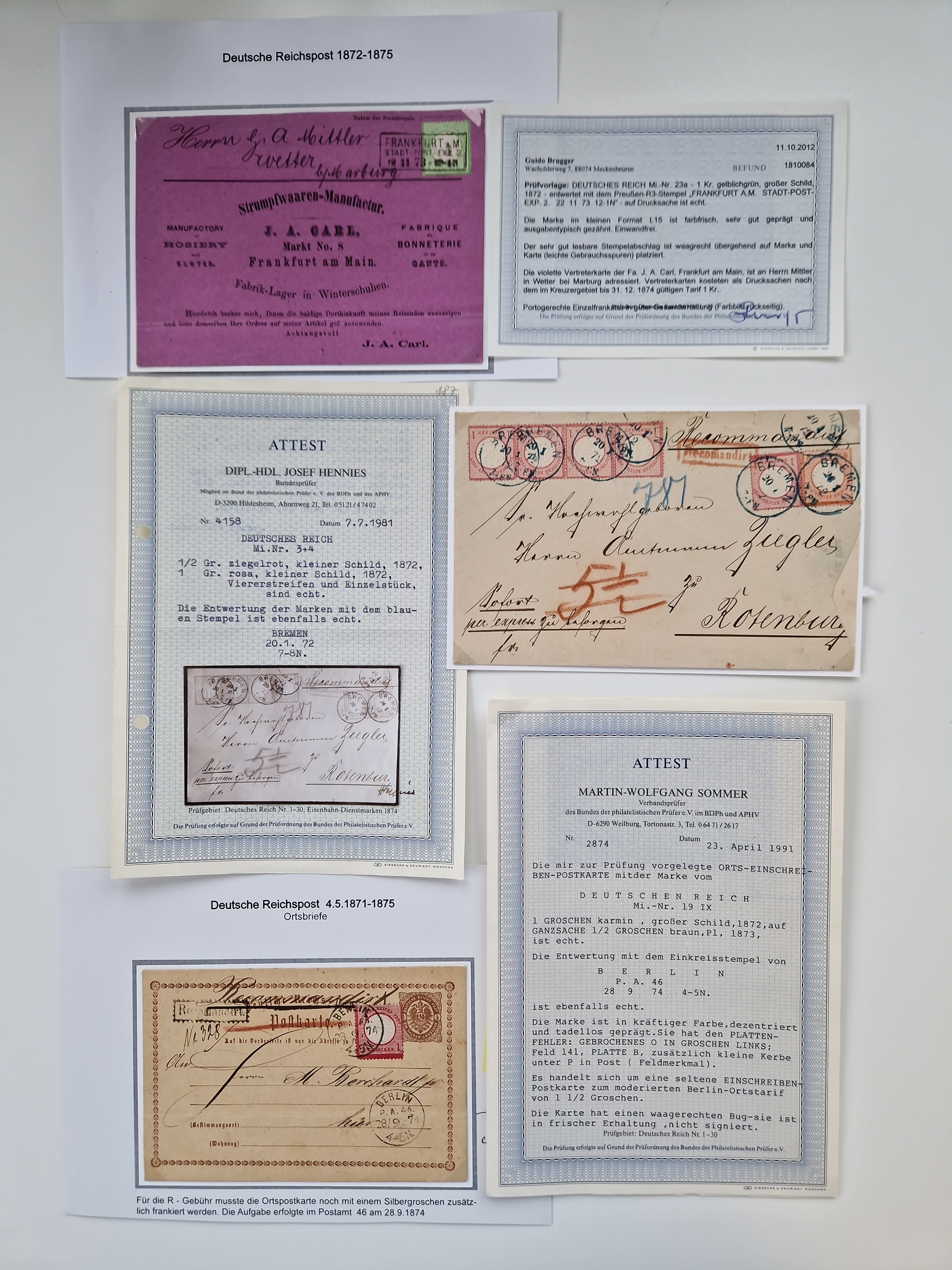 1872/74, umfangreiche Sammlung mit über 100 Briefen und Karten mit besseren Einzel- und Mehrfachfrankaturen, R- und Wertbriefen, Express-Briefe, interessante Stempel und weiteren Besonderheiten. Dabei u.a. Mi.-Nr. 1 (2) + Paar 21a auf R-Express-Brief (FA Sommer BPP), Mi.-Nr. 3 (7) auf Express-Brief (1 Wert fehlerhaft), Mi.-Nr. 5 im Paar auf Express-Brief mit Landzustellung (FA Brugger BPP), zwei Einzelfrankaturen Mi.-Nr. 11 auf Wertbriefen (repariert, einmal mit FB Krug BPP), Mi.-Nr. 17a(2) auf Drucksache der 2. Gewichtsstufe (FA Krug BPP), Mi.-Nr. 19 auf P1 als R-Ortskarte von Berlin (FA Sommer BPP) und Mi.-Nr. 23a+30 auf Wertbrief. Die Erhaltung ist zum Teil fehlerhaft, vieles signiert bzw. mit FB und Fotoattesten, ex Untermann