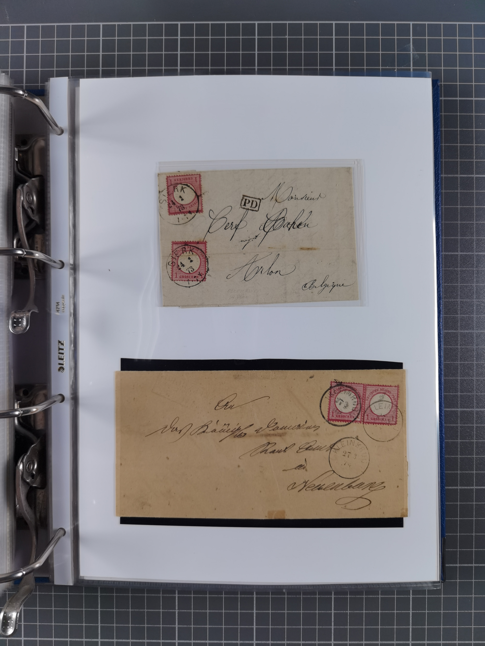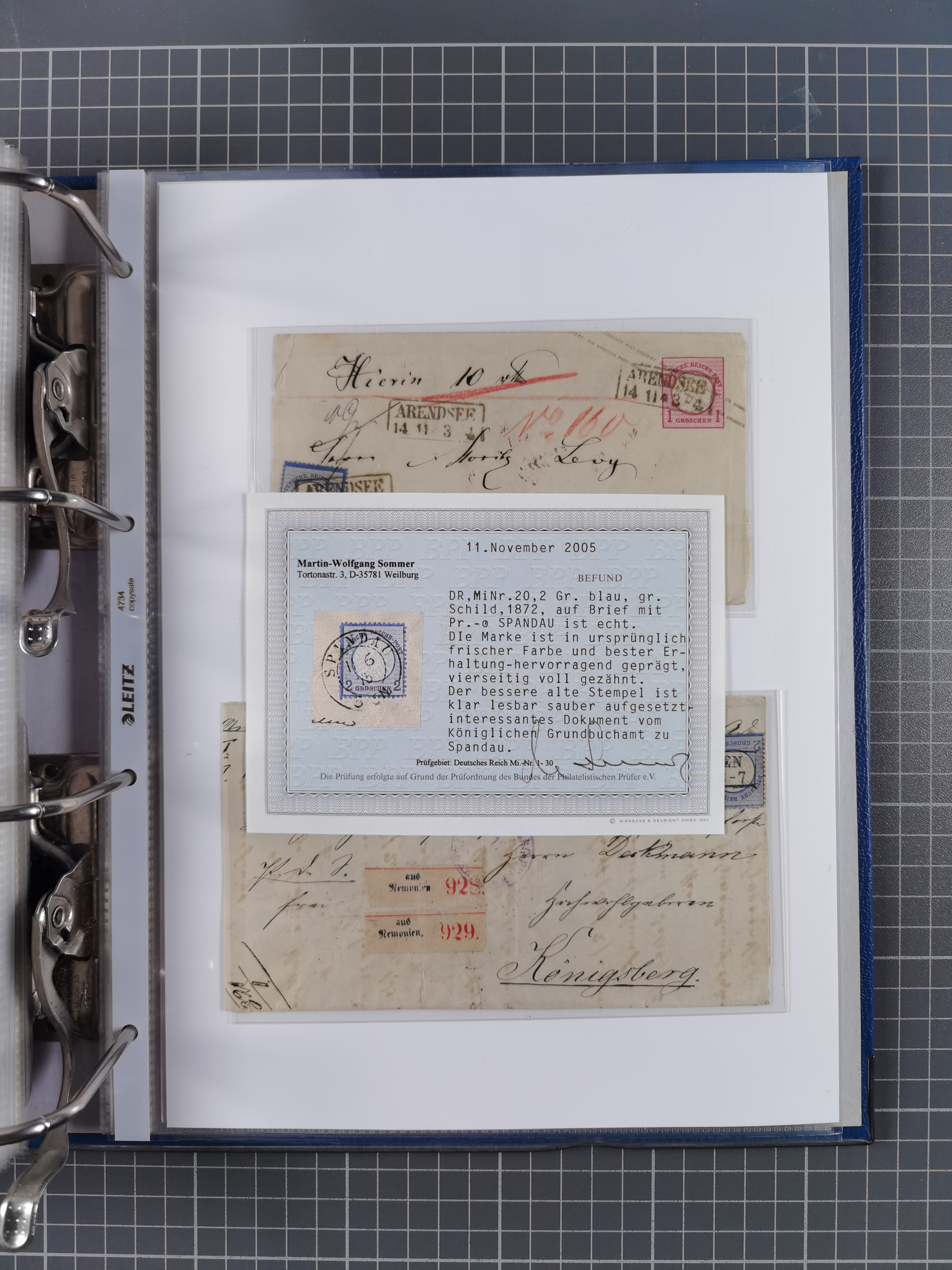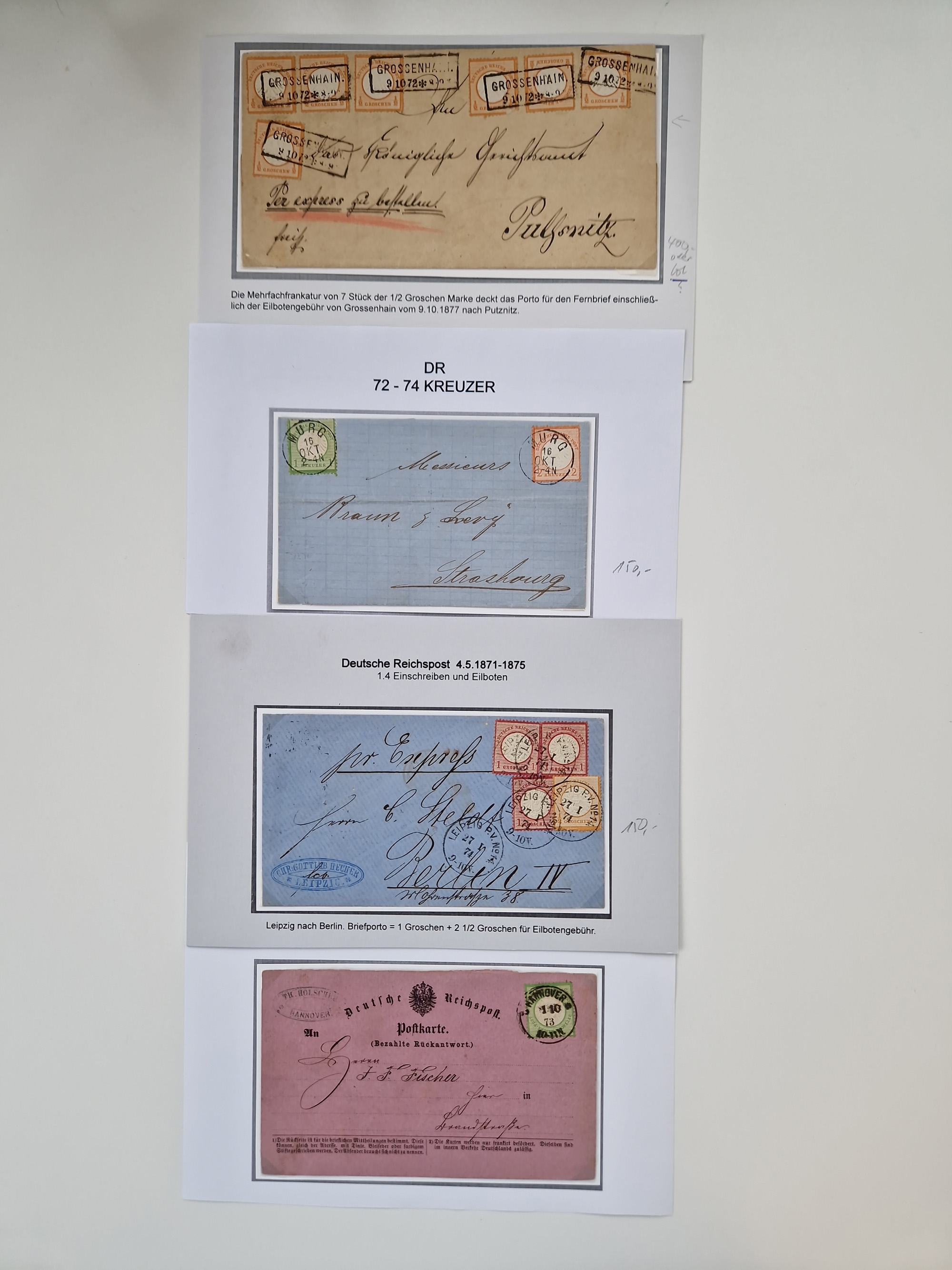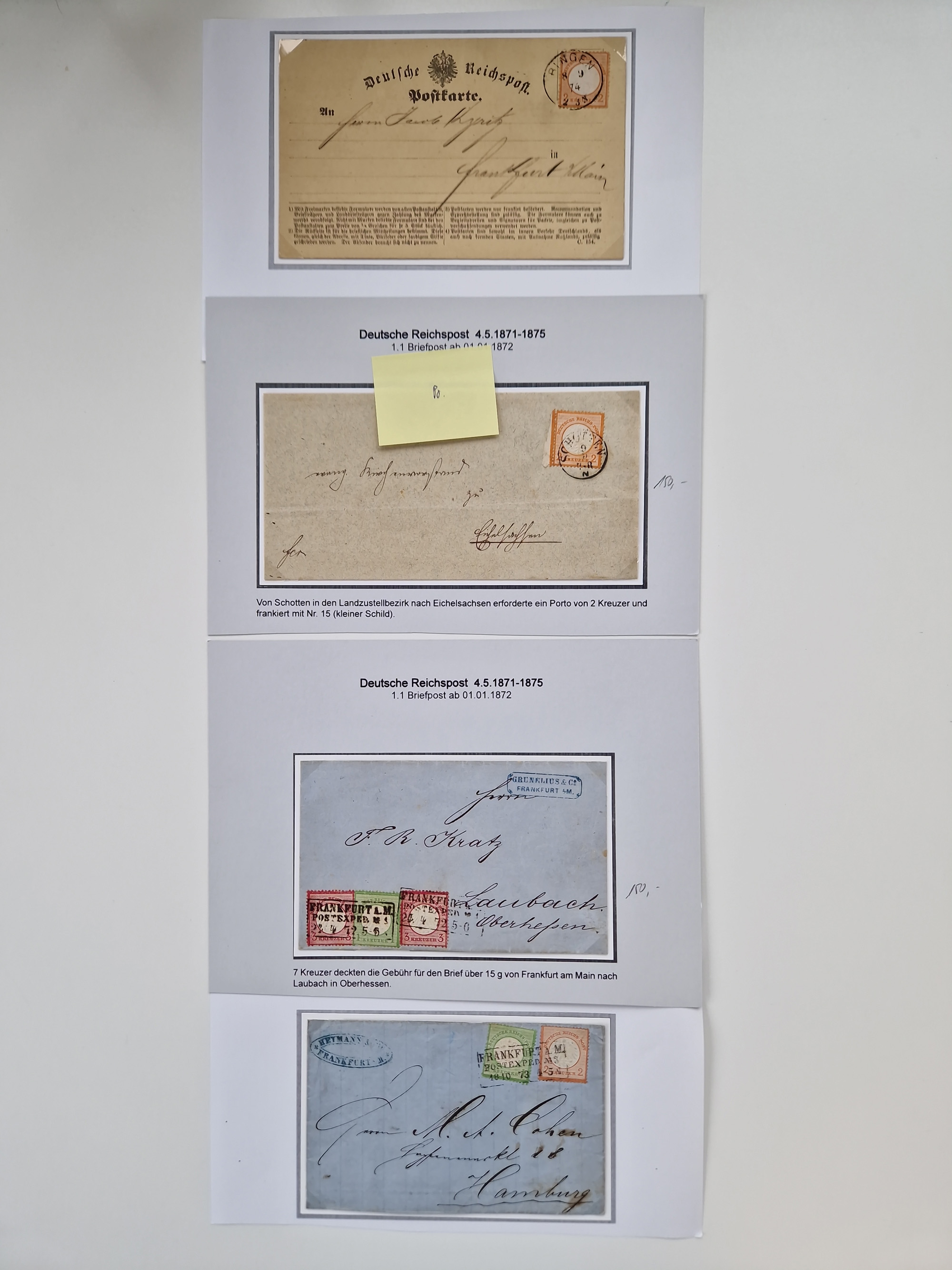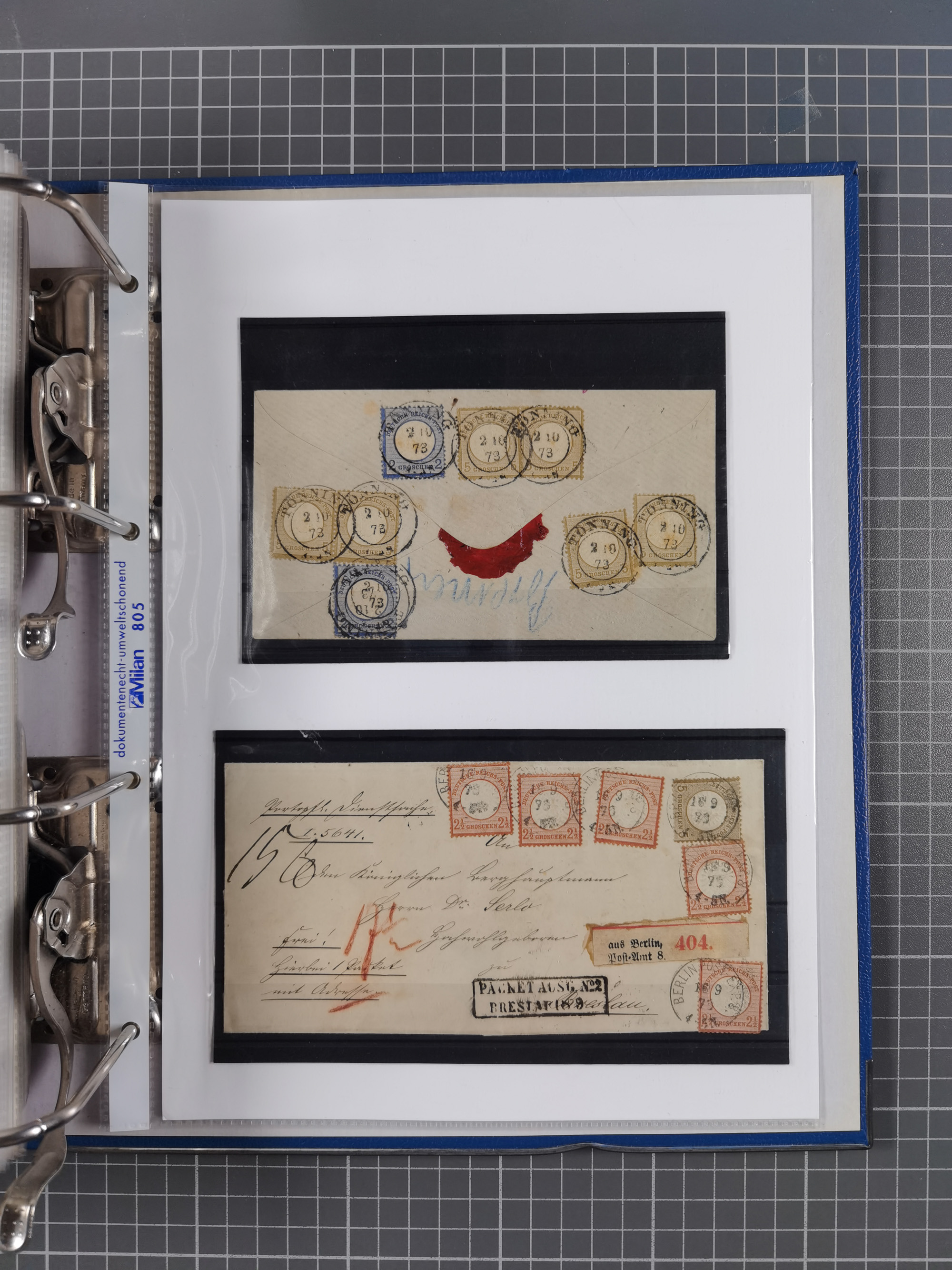1872/74, umfangreiche Sammlung mit über 100 Briefen und Karten mit besseren Einzel- und Mehrfachfrankaturen, R- und Wertbriefen, Express-Briefe, interessante Stempel und weiteren Besonderheiten. Dabei u.a. Mi.-Nr. 1 (2) + Paar 21a auf R-Express-Brief (FA Sommer BPP), Mi.-Nr. 3 (7) auf Express-Brief (1 Wert fehlerhaft), Mi.-Nr. 5 im Paar auf Express-Brief mit Landzustellung (FA Brugger BPP), zwei Einzelfrankaturen Mi.-Nr. 11 auf Wertbriefen (repariert, einmal mit FB Krug BPP), Mi.-Nr. 17a(2) auf Drucksache der 2. Gewichtsstufe (FA Krug BPP), Mi.-Nr. 19 auf P1 als R-Ortskarte von Berlin (FA Sommer BPP) und Mi.-Nr. 23a+30 auf Wertbrief. Die Erhaltung ist zum Teil fehlerhaft, vieles signiert bzw. mit FB und Fotoattesten, ex Untermann