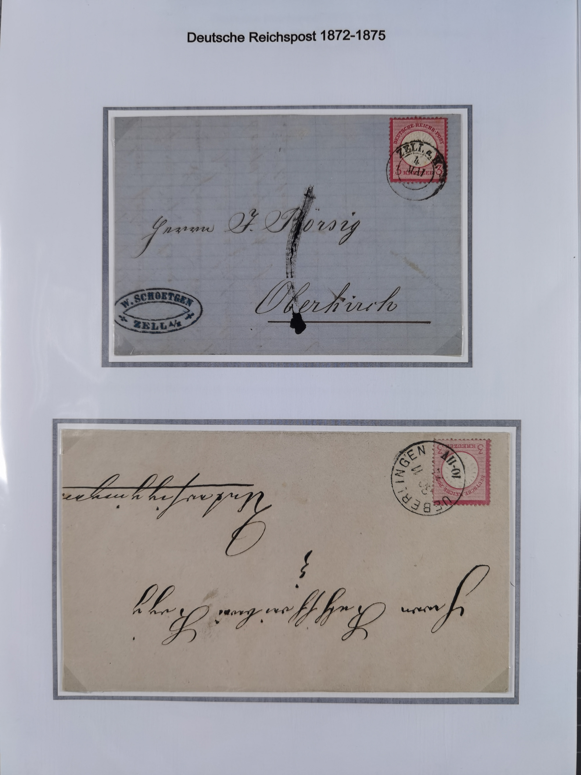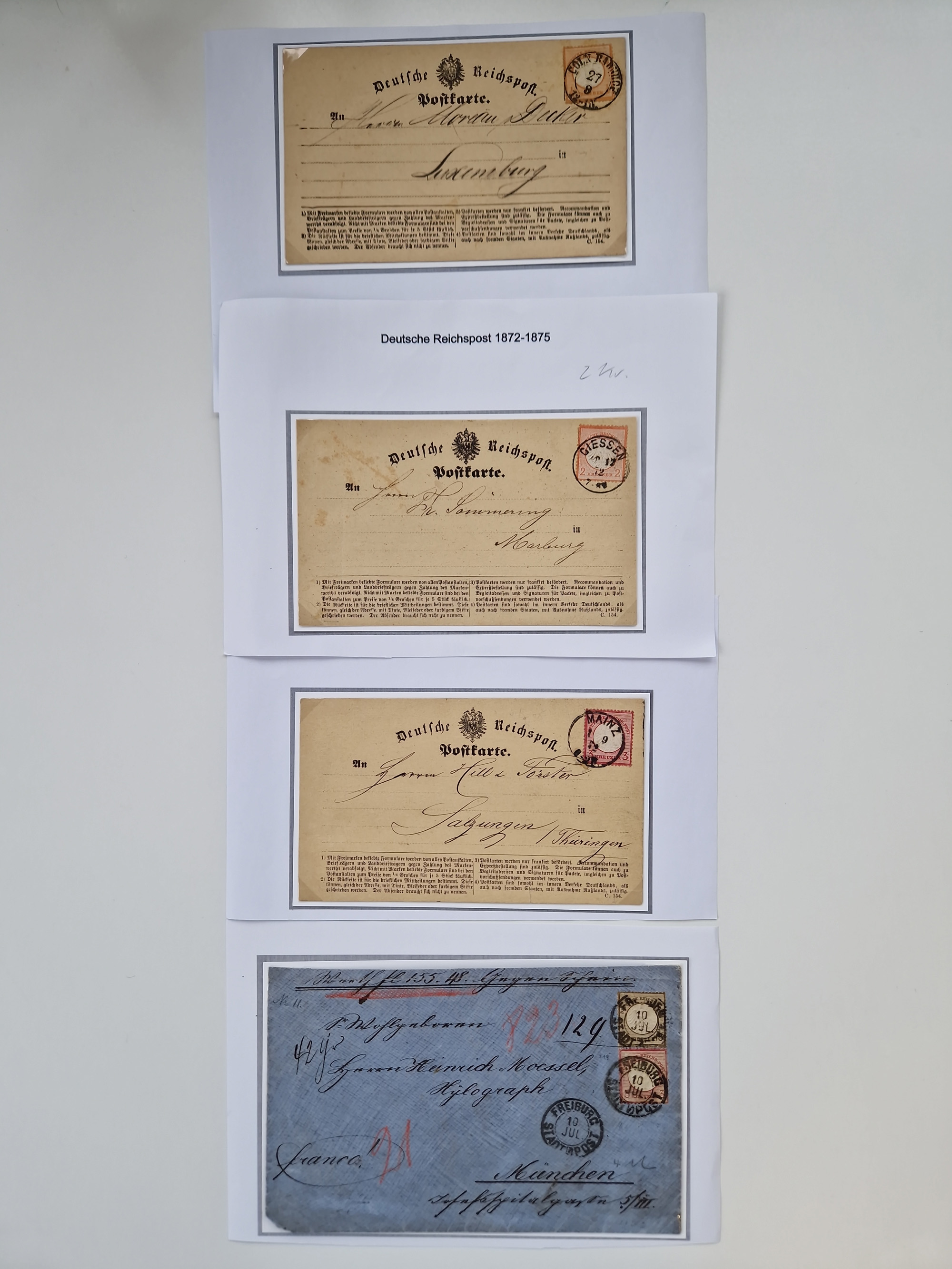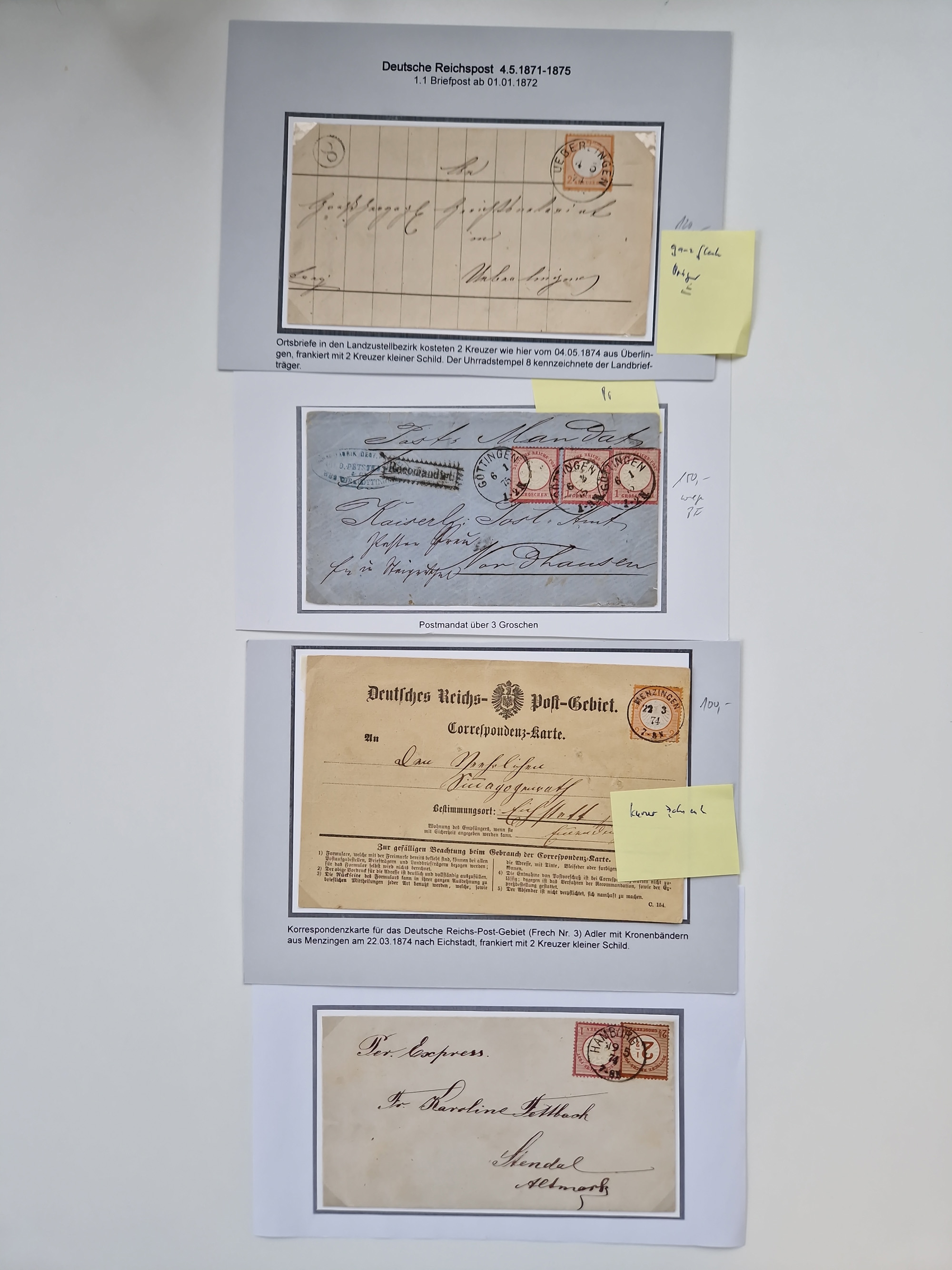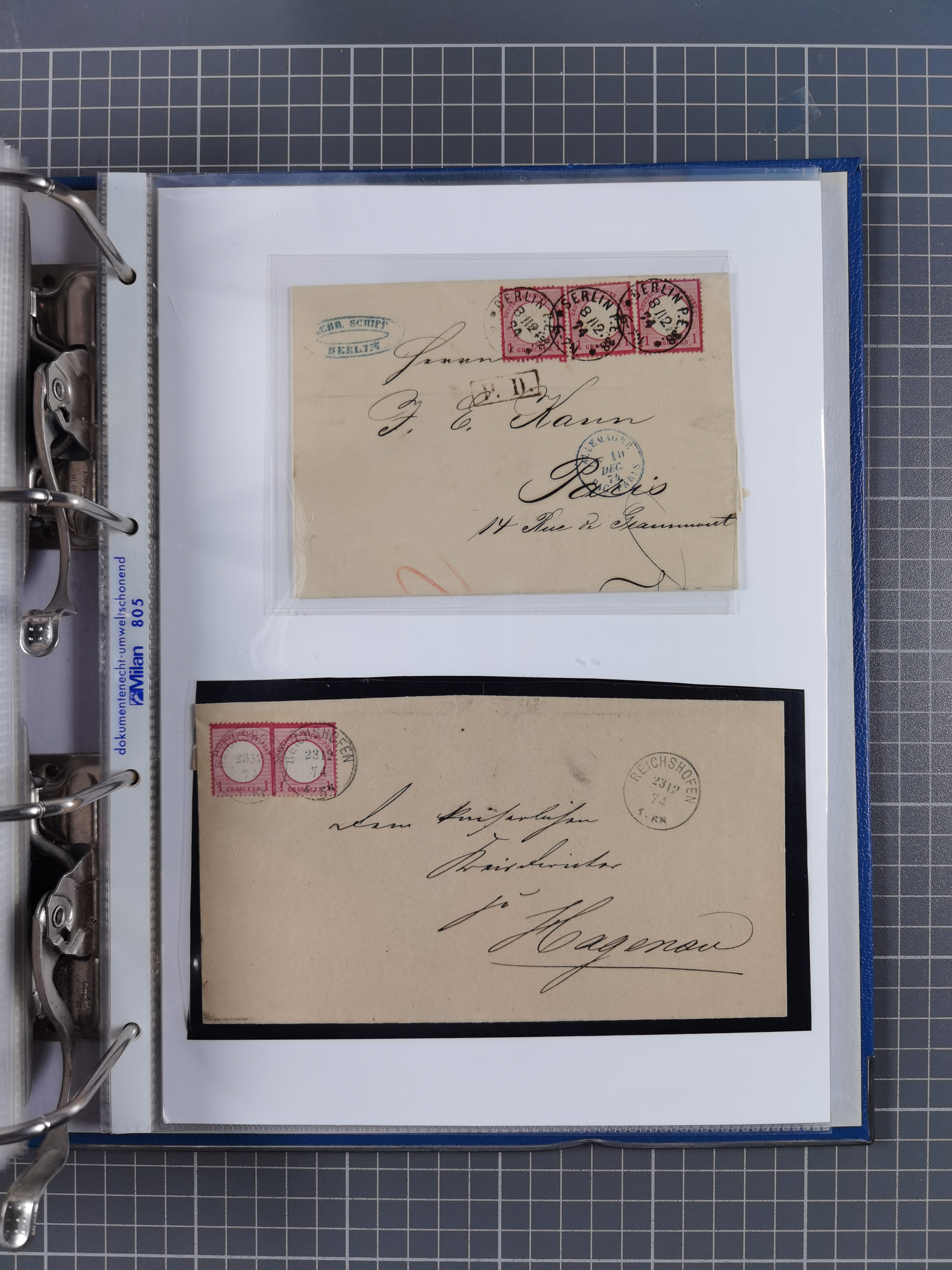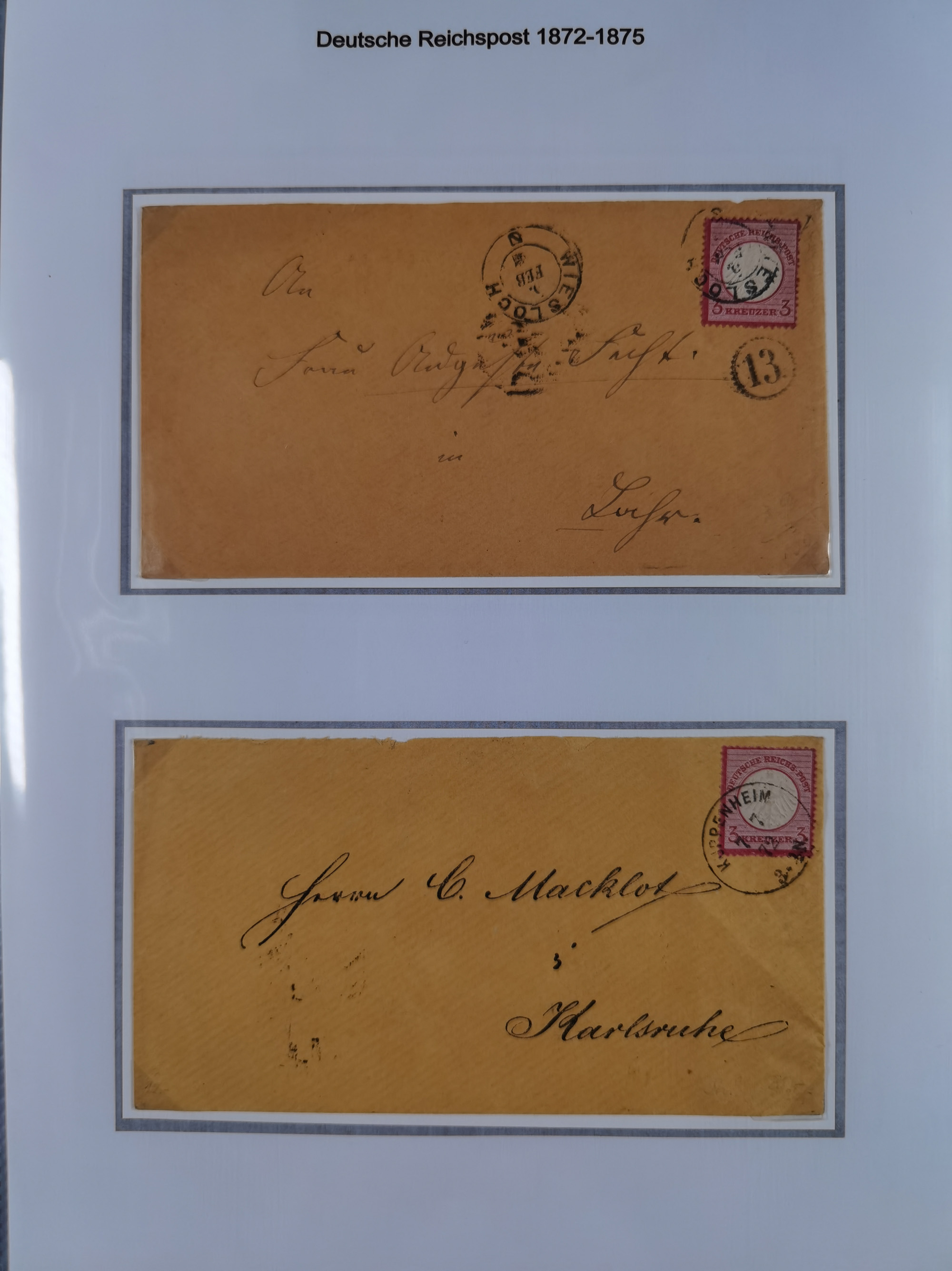 1872/74, umfangreiche Sammlung mit über 100 Briefen und Karten mit besseren Einzel- und Mehrfachfrankaturen, R- und Wertbriefen, Express-Briefe, interessante Stempel und weiteren Besonderheiten. Dabei u.a. Mi.-Nr. 1 (2) + Paar 21a auf R-Express-Brief (FA Sommer BPP), Mi.-Nr. 3 (7) auf Express-Brief (1 Wert fehlerhaft), Mi.-Nr. 5 im Paar auf Express-Brief mit Landzustellung (FA Brugger BPP), zwei Einzelfrankaturen Mi.-Nr. 11 auf Wertbriefen (repariert, einmal mit FB Krug BPP), Mi.-Nr. 17a(2) auf Drucksache der 2. Gewichtsstufe (FA Krug BPP), Mi.-Nr. 19 auf P1 als R-Ortskarte von Berlin (FA Sommer BPP) und Mi.-Nr. 23a+30 auf Wertbrief. Die Erhaltung ist zum Teil fehlerhaft, vieles signiert bzw. mit FB und Fotoattesten, ex Untermann