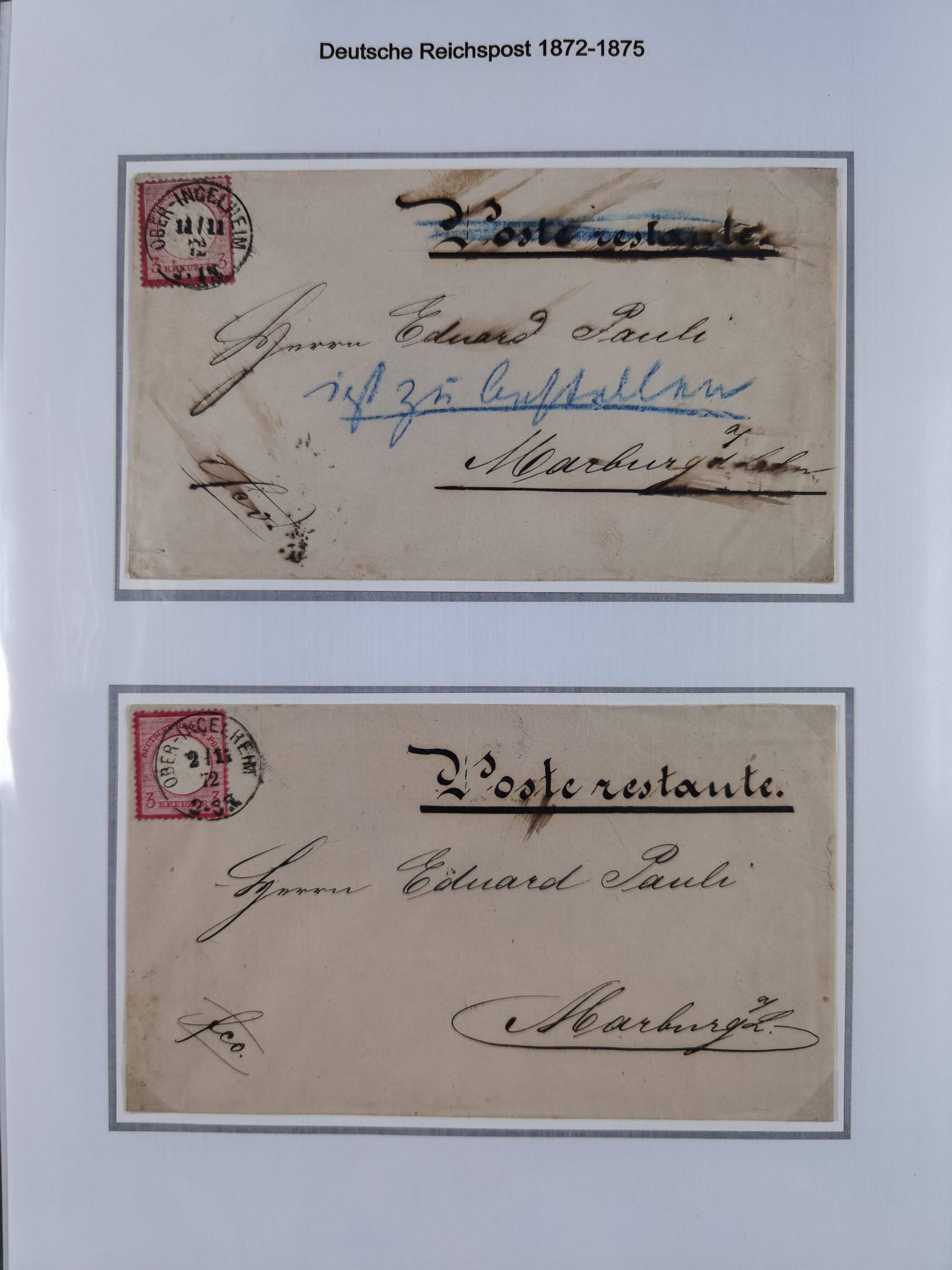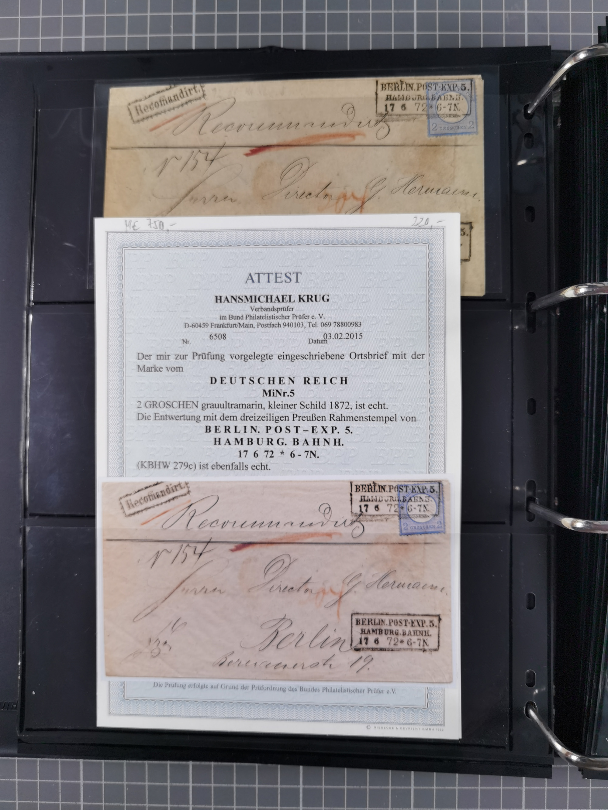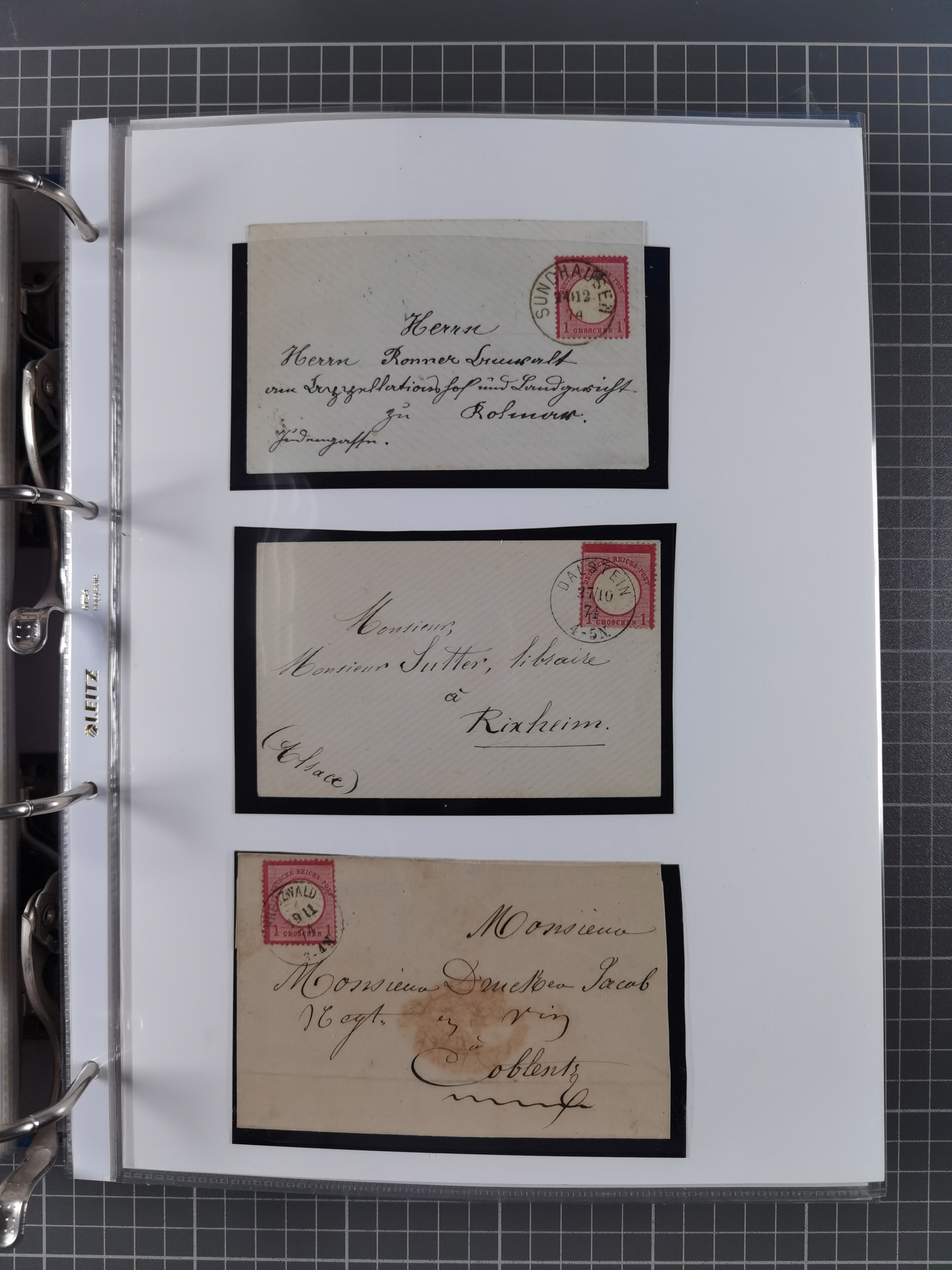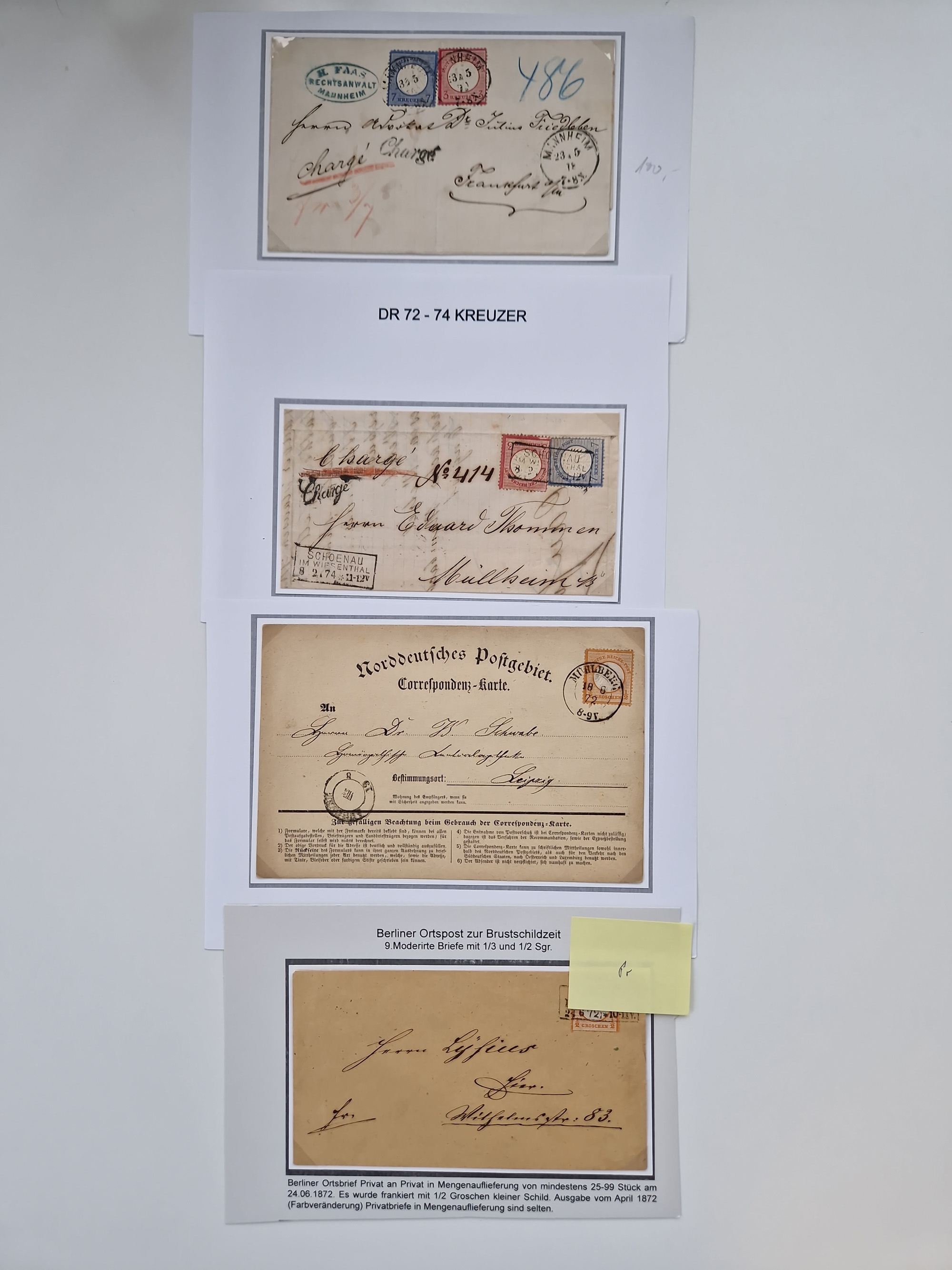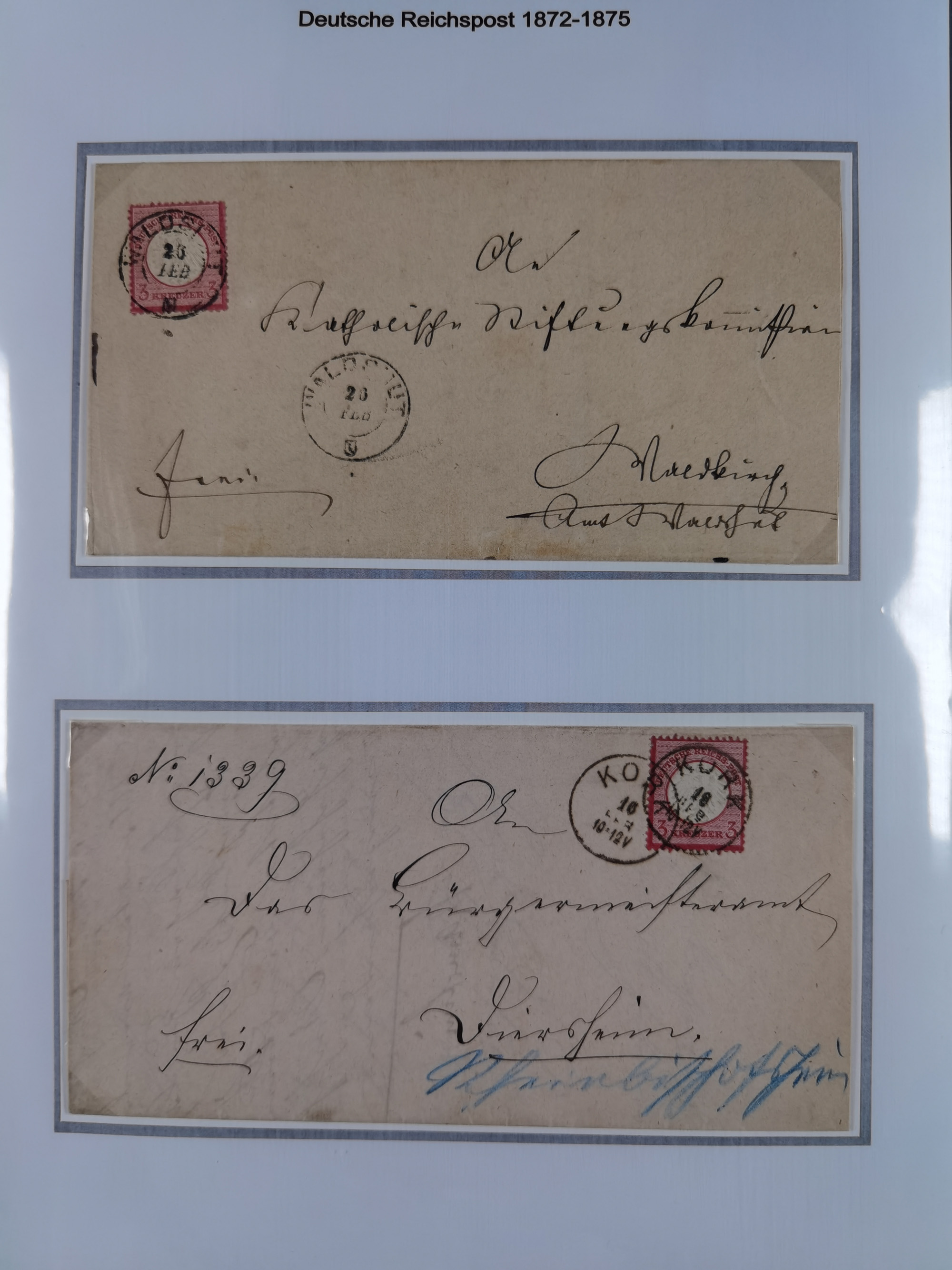 1872/74, umfangreiche Sammlung mit über 100 Briefen und Karten mit besseren Einzel- und Mehrfachfrankaturen, R- und Wertbriefen, Express-Briefe, interessante Stempel und weiteren Besonderheiten. Dabei u.a. Mi.-Nr. 1 (2) + Paar 21a auf R-Express-Brief (FA Sommer BPP), Mi.-Nr. 3 (7) auf Express-Brief (1 Wert fehlerhaft), Mi.-Nr. 5 im Paar auf Express-Brief mit Landzustellung (FA Brugger BPP), zwei Einzelfrankaturen Mi.-Nr. 11 auf Wertbriefen (repariert, einmal mit FB Krug BPP), Mi.-Nr. 17a(2) auf Drucksache der 2. Gewichtsstufe (FA Krug BPP), Mi.-Nr. 19 auf P1 als R-Ortskarte von Berlin (FA Sommer BPP) und Mi.-Nr. 23a+30 auf Wertbrief. Die Erhaltung ist zum Teil fehlerhaft, vieles signiert bzw. mit FB und Fotoattesten, ex Untermann