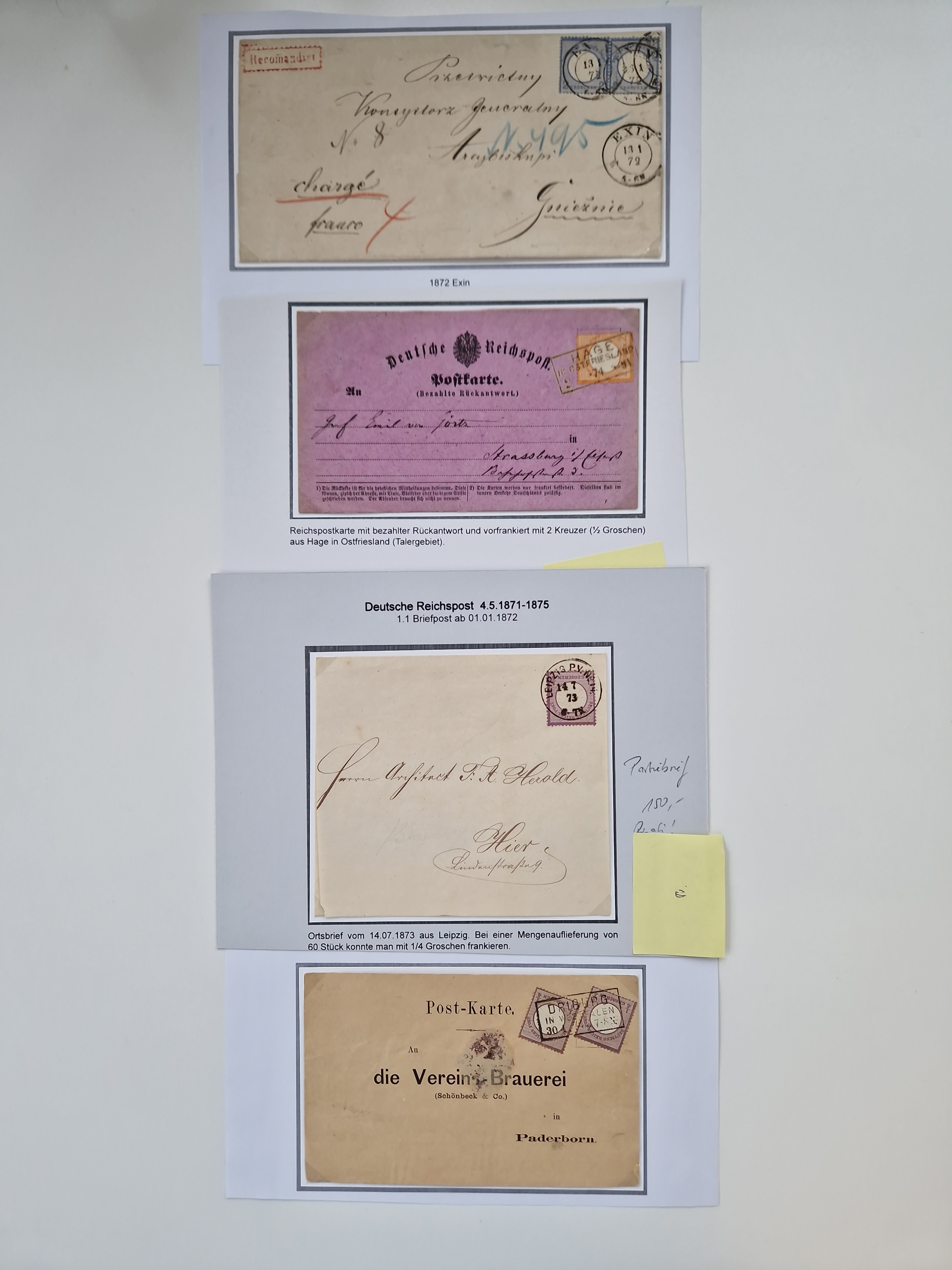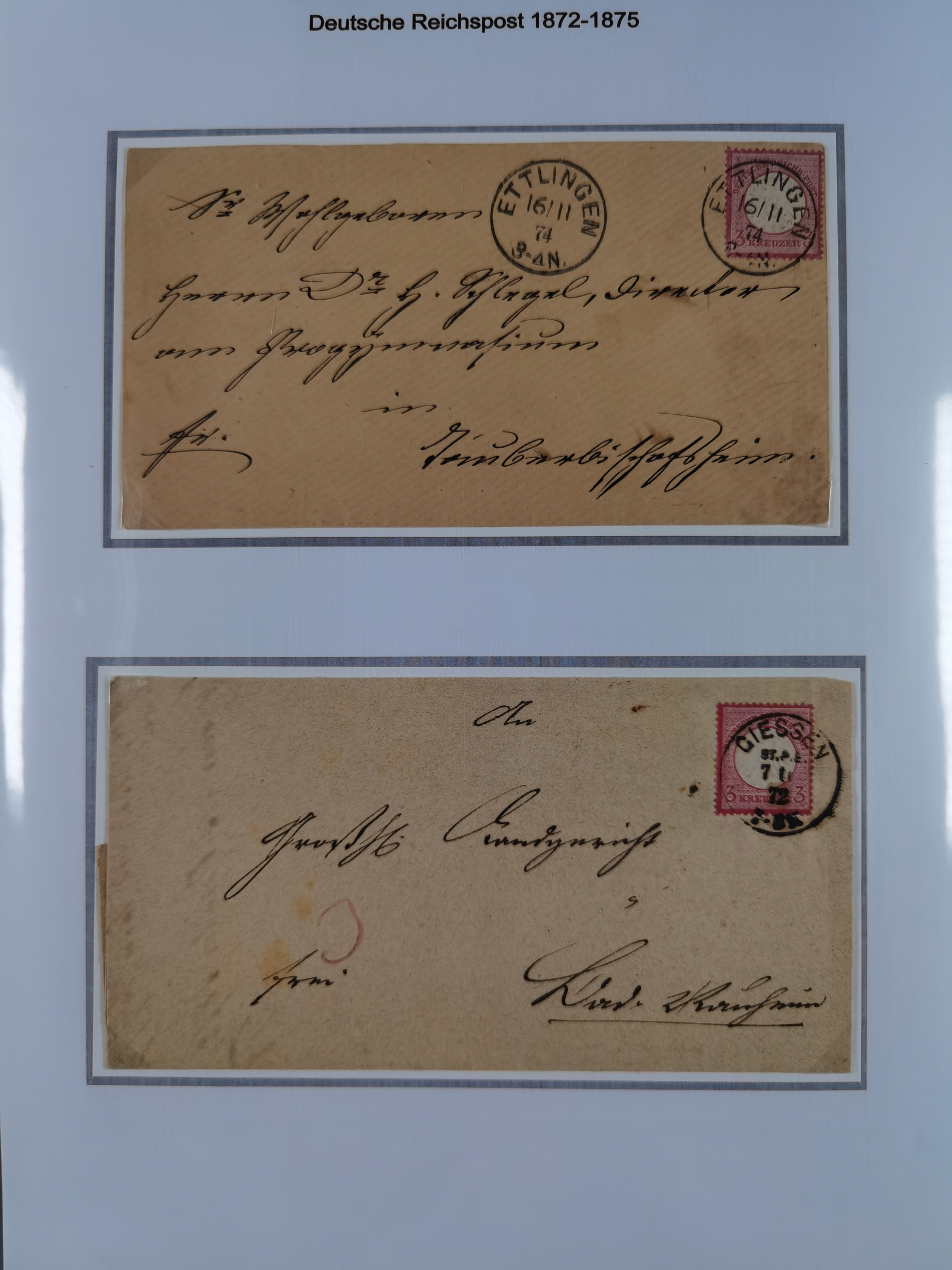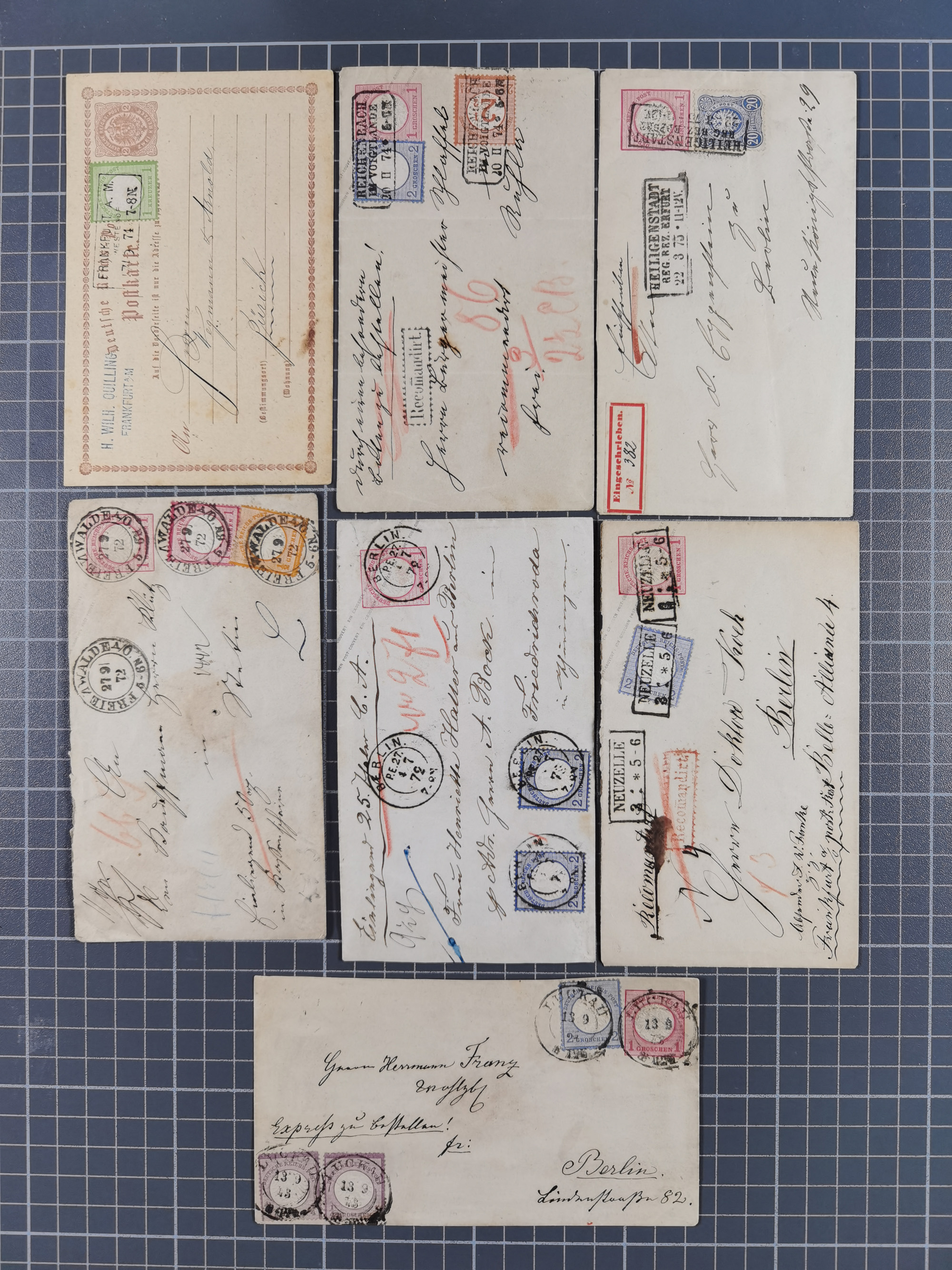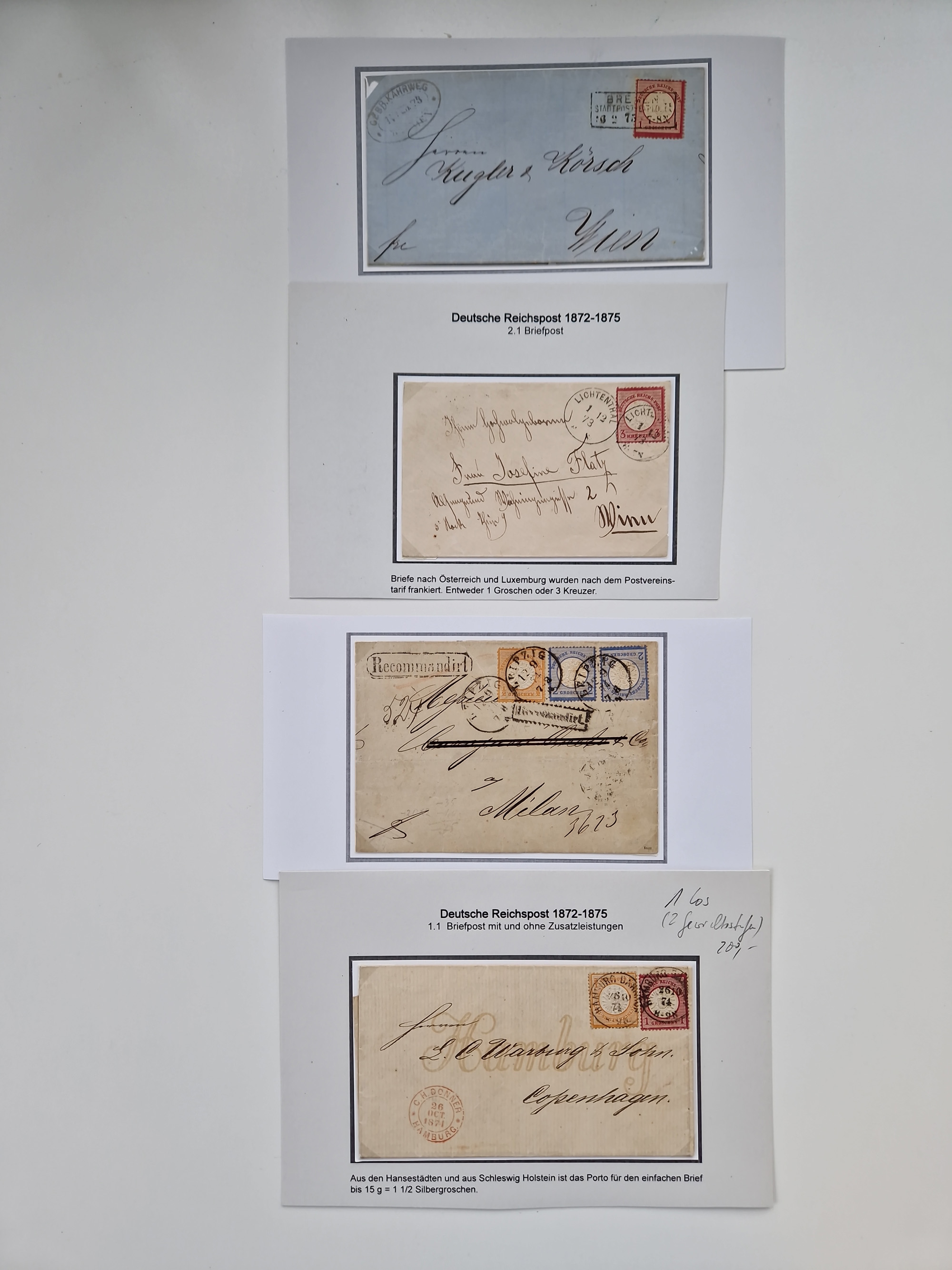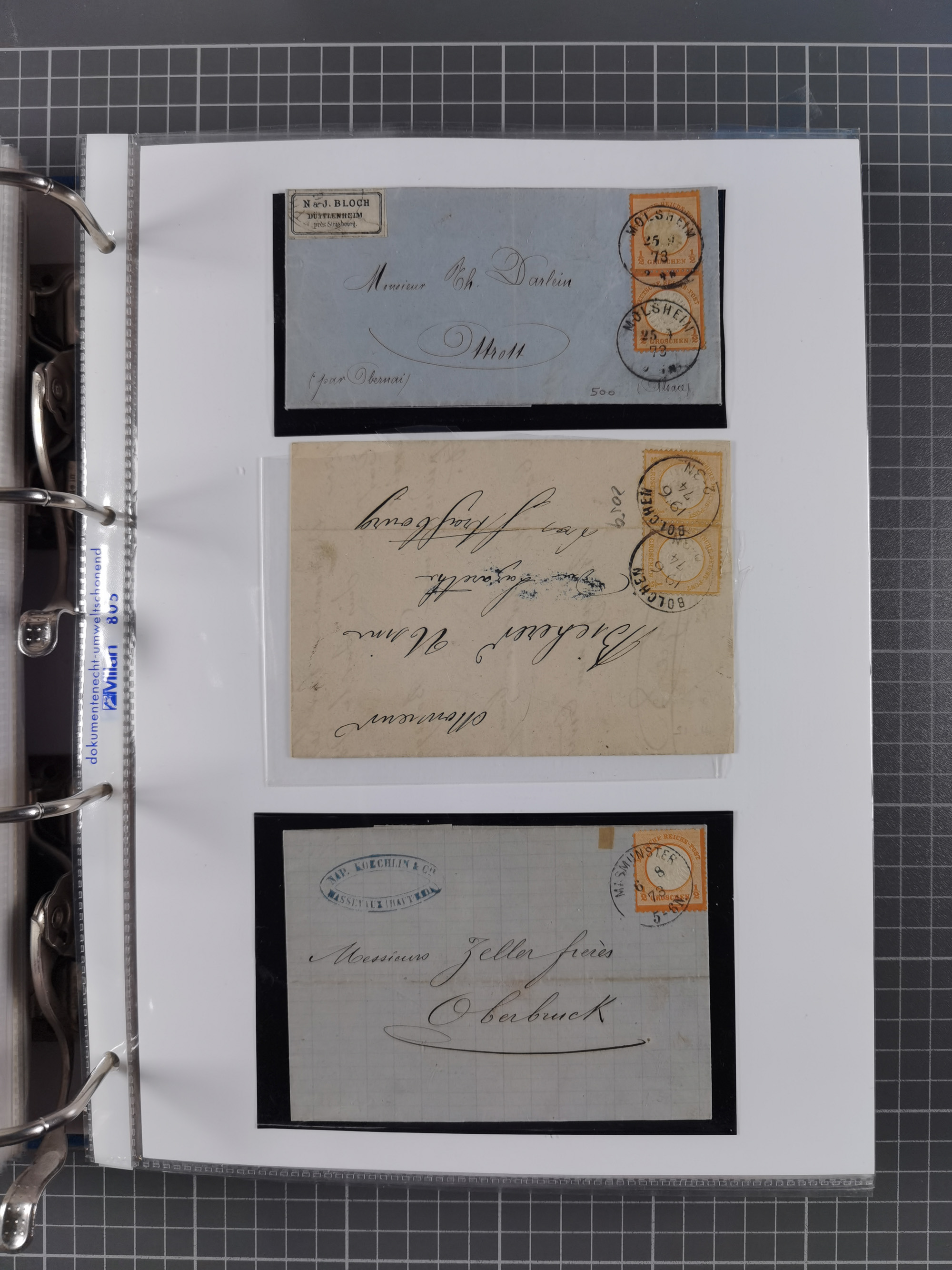 1872/74, umfangreiche Sammlung mit über 100 Briefen und Karten mit besseren Einzel- und Mehrfachfrankaturen, R- und Wertbriefen, Express-Briefe, interessante Stempel und weiteren Besonderheiten. Dabei u.a. Mi.-Nr. 1 (2) + Paar 21a auf R-Express-Brief (FA Sommer BPP), Mi.-Nr. 3 (7) auf Express-Brief (1 Wert fehlerhaft), Mi.-Nr. 5 im Paar auf Express-Brief mit Landzustellung (FA Brugger BPP), zwei Einzelfrankaturen Mi.-Nr. 11 auf Wertbriefen (repariert, einmal mit FB Krug BPP), Mi.-Nr. 17a(2) auf Drucksache der 2. Gewichtsstufe (FA Krug BPP), Mi.-Nr. 19 auf P1 als R-Ortskarte von Berlin (FA Sommer BPP) und Mi.-Nr. 23a+30 auf Wertbrief. Die Erhaltung ist zum Teil fehlerhaft, vieles signiert bzw. mit FB und Fotoattesten, ex Untermann