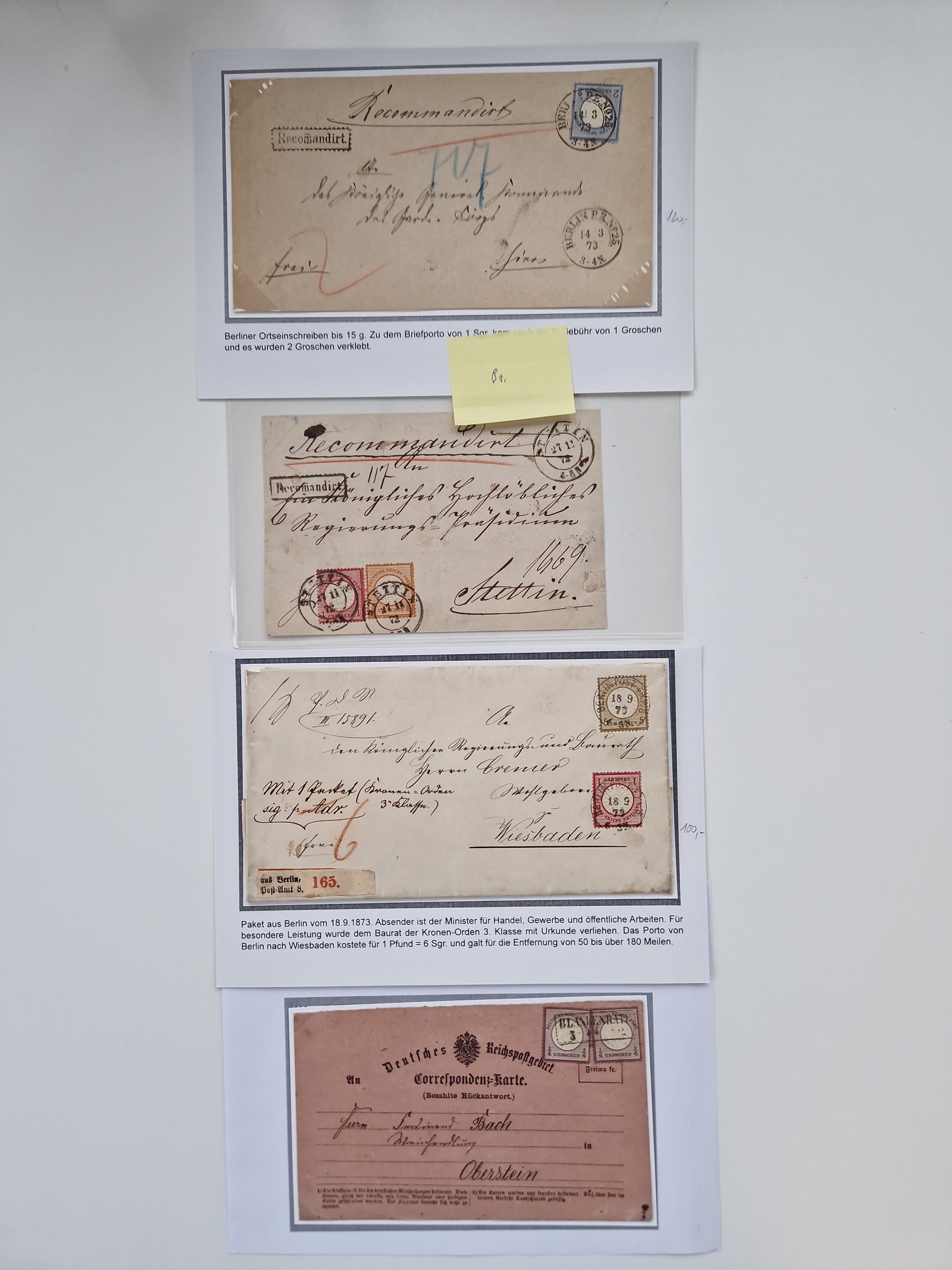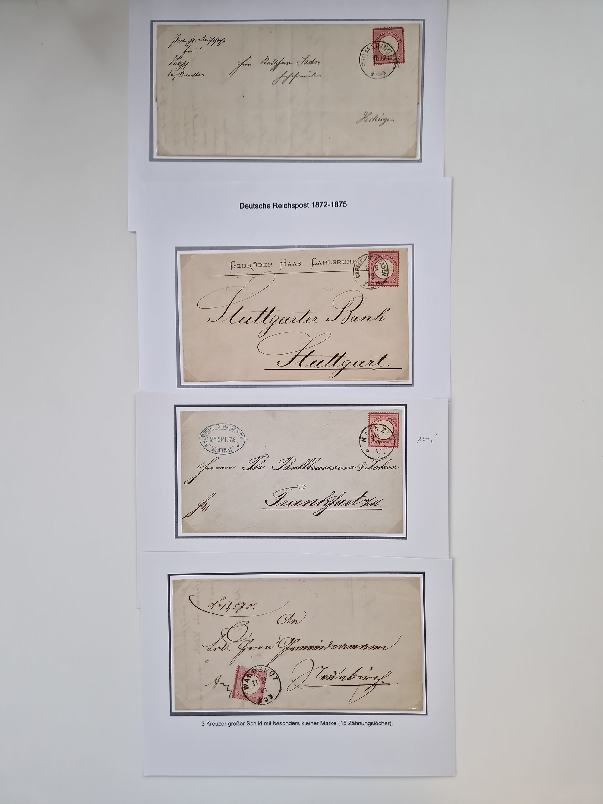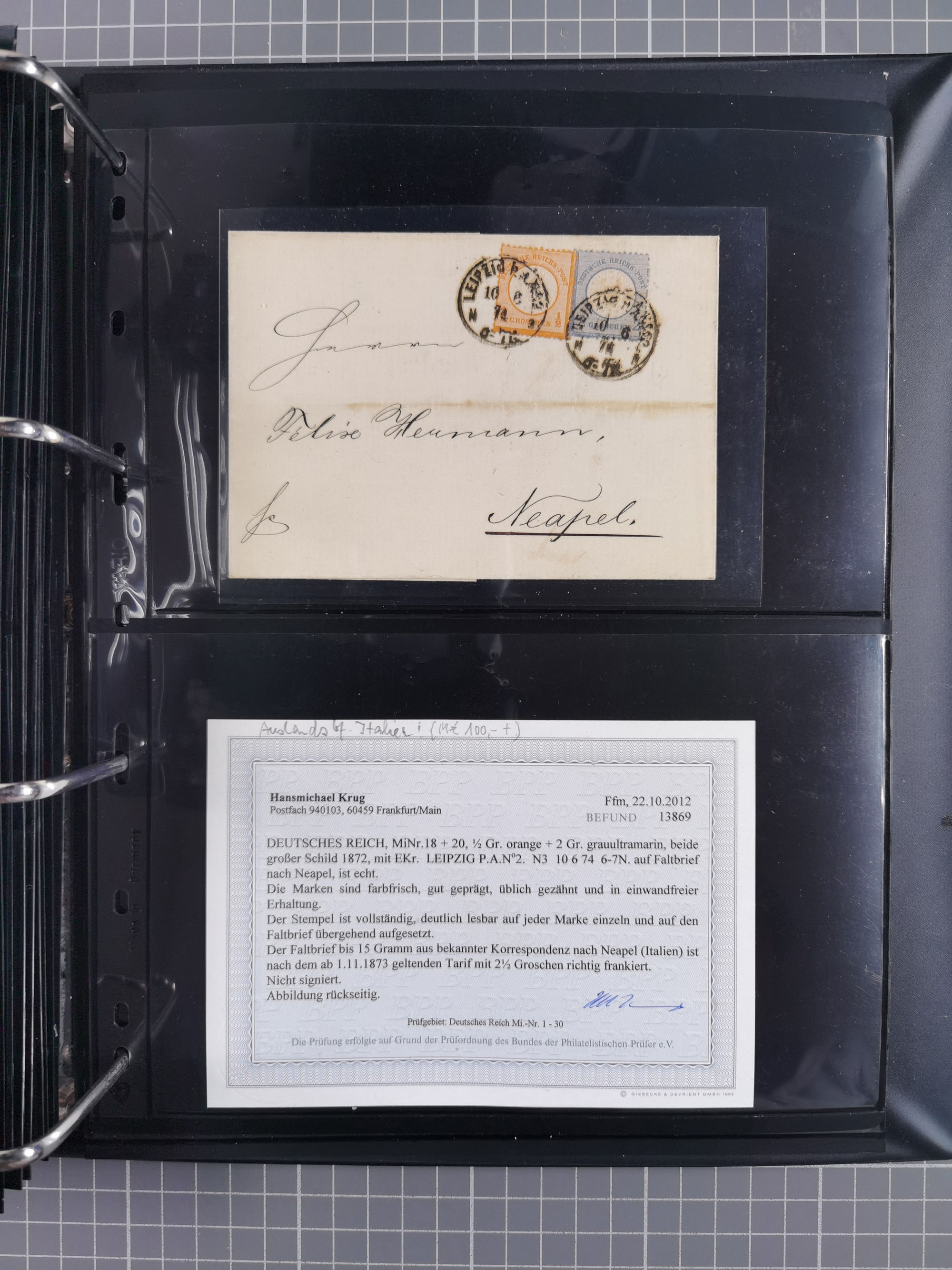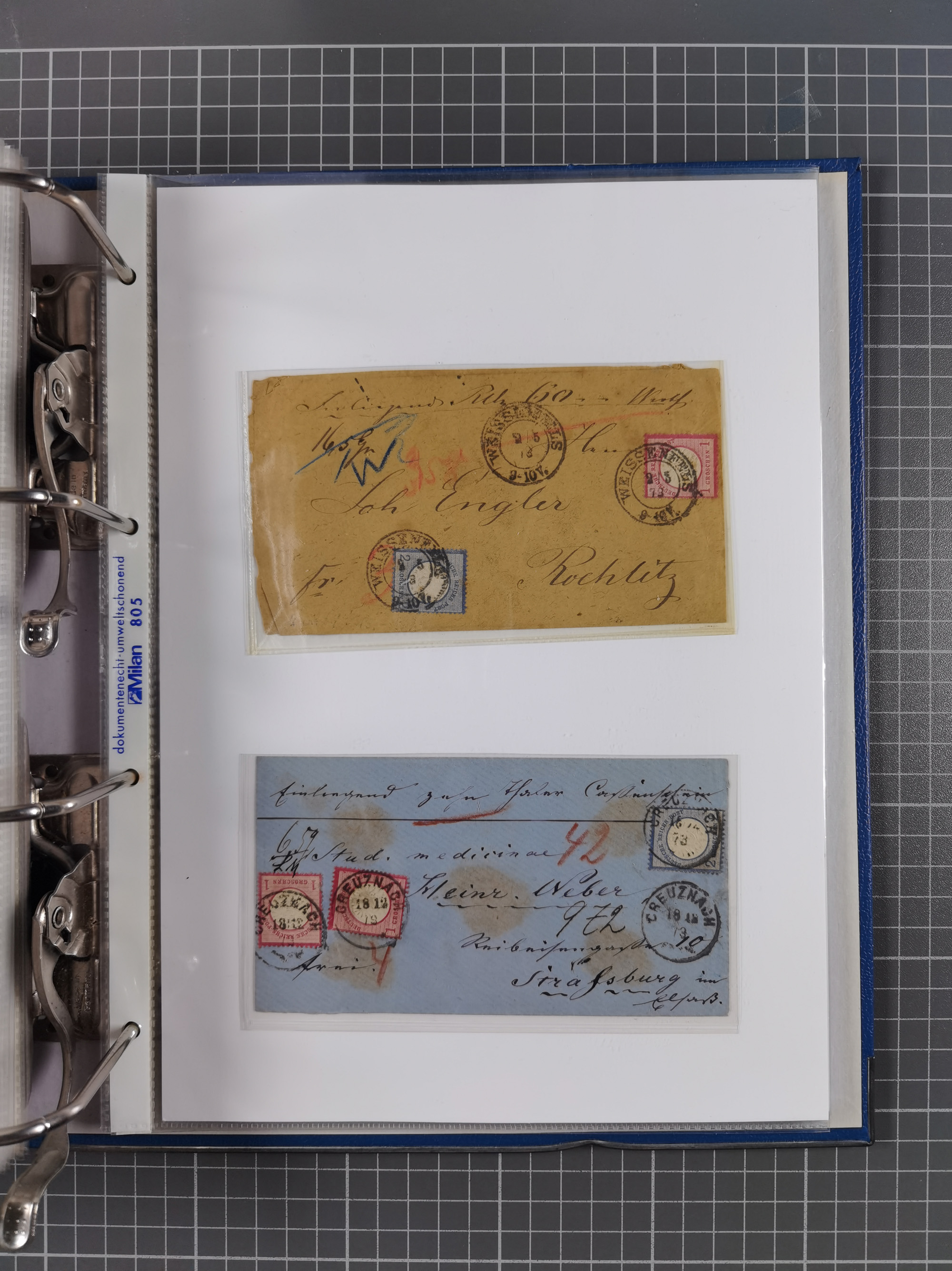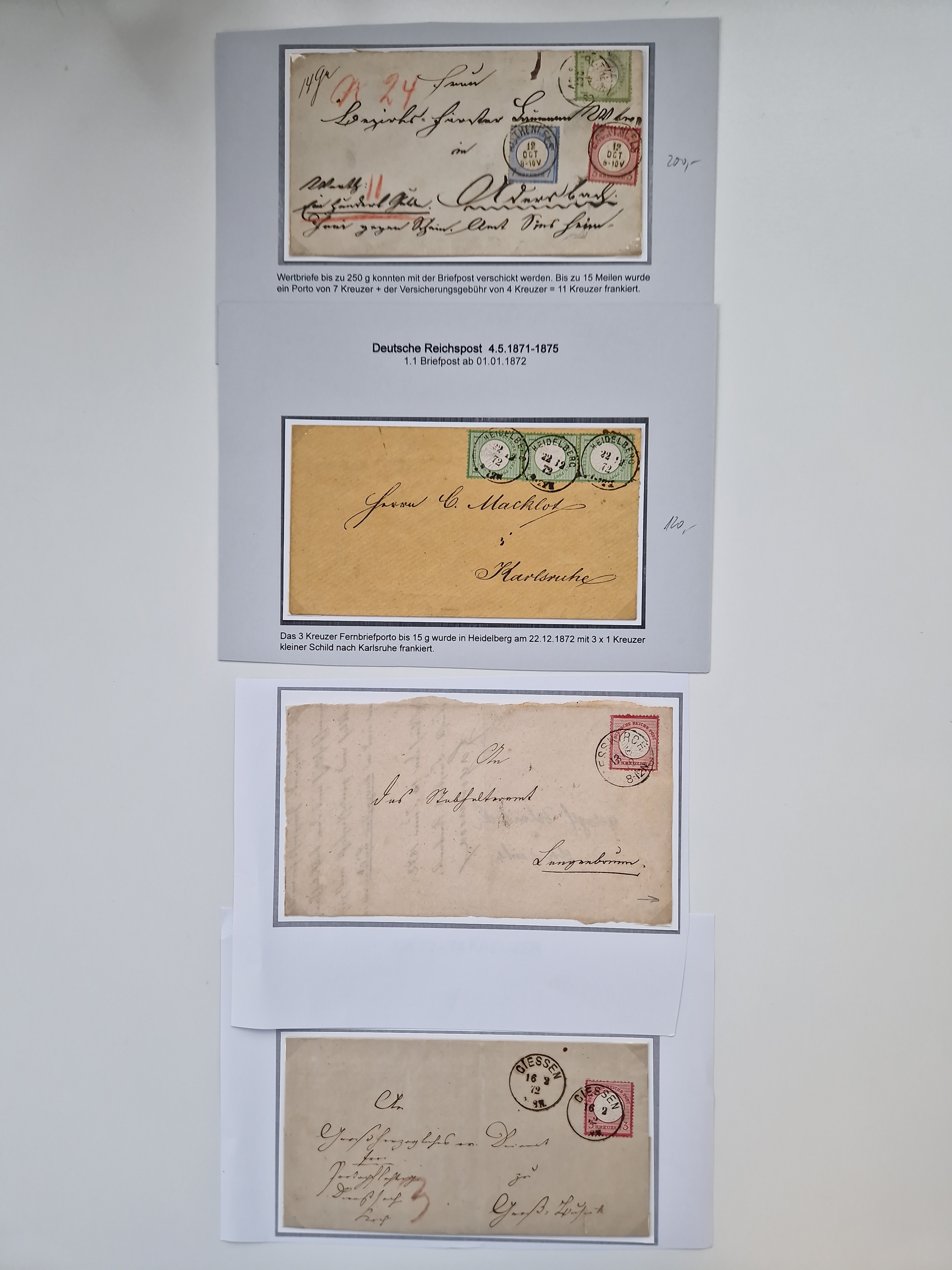 1872/74, umfangreiche Sammlung mit über 100 Briefen und Karten mit besseren Einzel- und Mehrfachfrankaturen, R- und Wertbriefen, Express-Briefe, interessante Stempel und weiteren Besonderheiten. Dabei u.a. Mi.-Nr. 1 (2) + Paar 21a auf R-Express-Brief (FA Sommer BPP), Mi.-Nr. 3 (7) auf Express-Brief (1 Wert fehlerhaft), Mi.-Nr. 5 im Paar auf Express-Brief mit Landzustellung (FA Brugger BPP), zwei Einzelfrankaturen Mi.-Nr. 11 auf Wertbriefen (repariert, einmal mit FB Krug BPP), Mi.-Nr. 17a(2) auf Drucksache der 2. Gewichtsstufe (FA Krug BPP), Mi.-Nr. 19 auf P1 als R-Ortskarte von Berlin (FA Sommer BPP) und Mi.-Nr. 23a+30 auf Wertbrief. Die Erhaltung ist zum Teil fehlerhaft, vieles signiert bzw. mit FB und Fotoattesten, ex Untermann