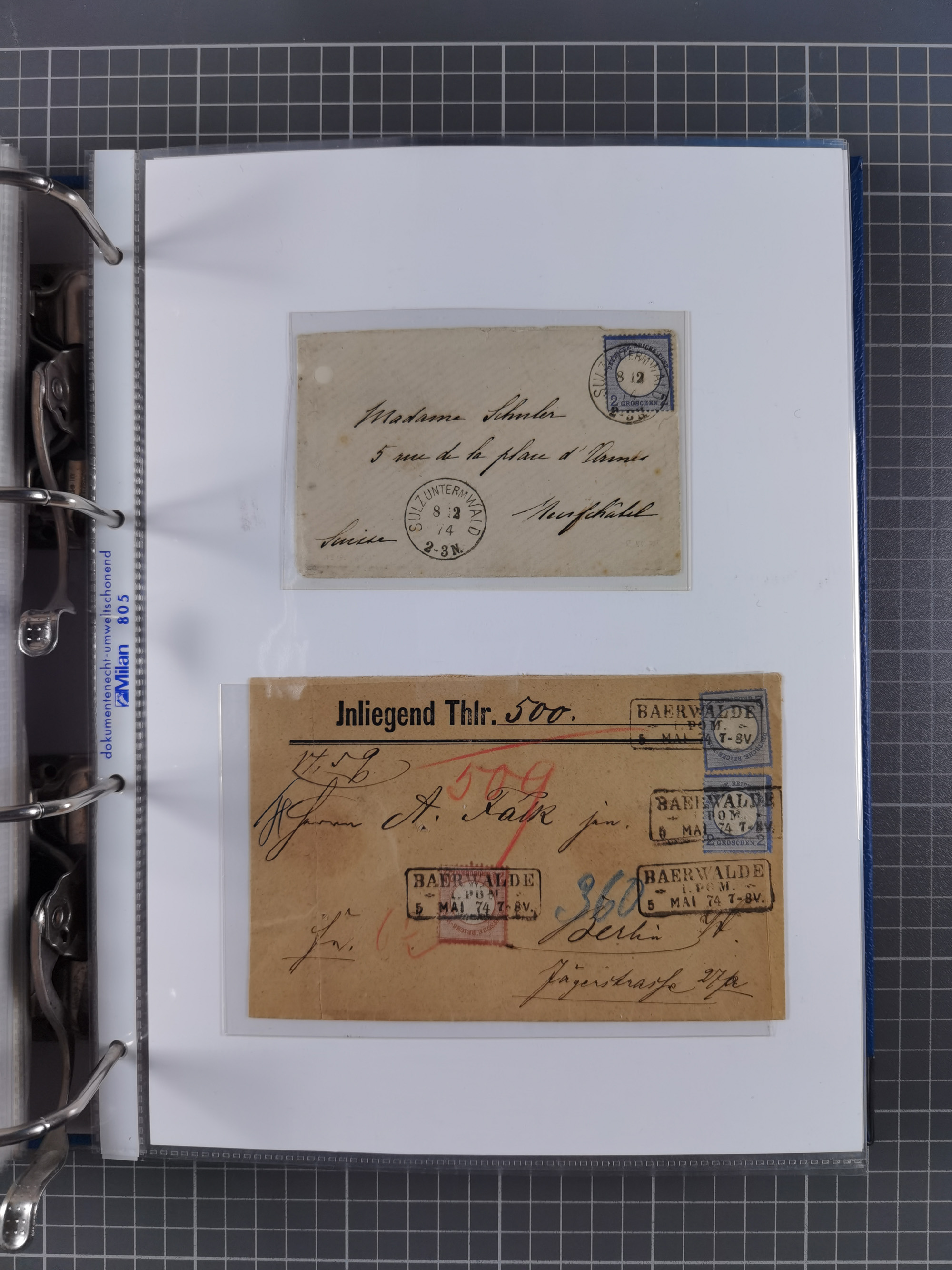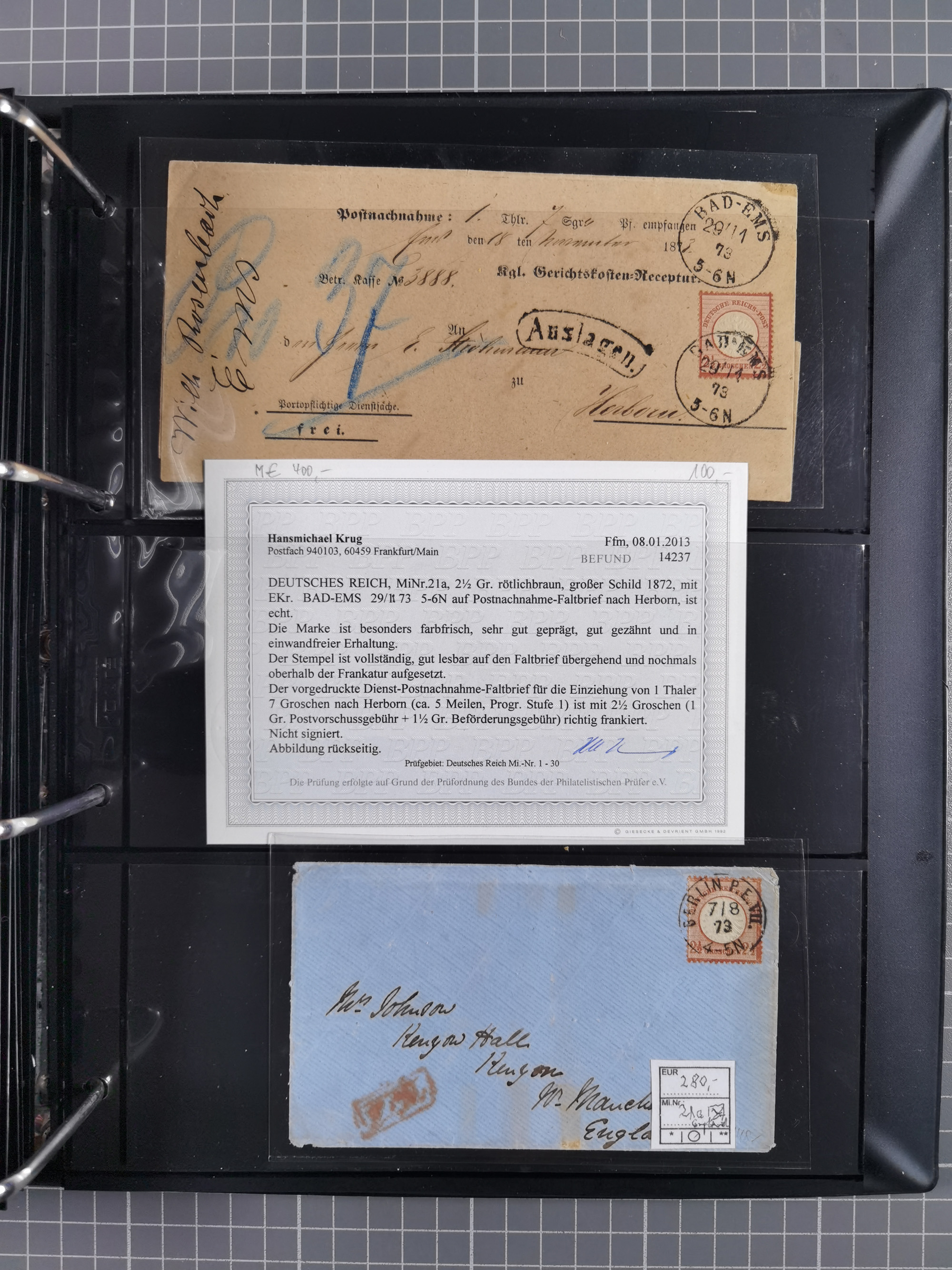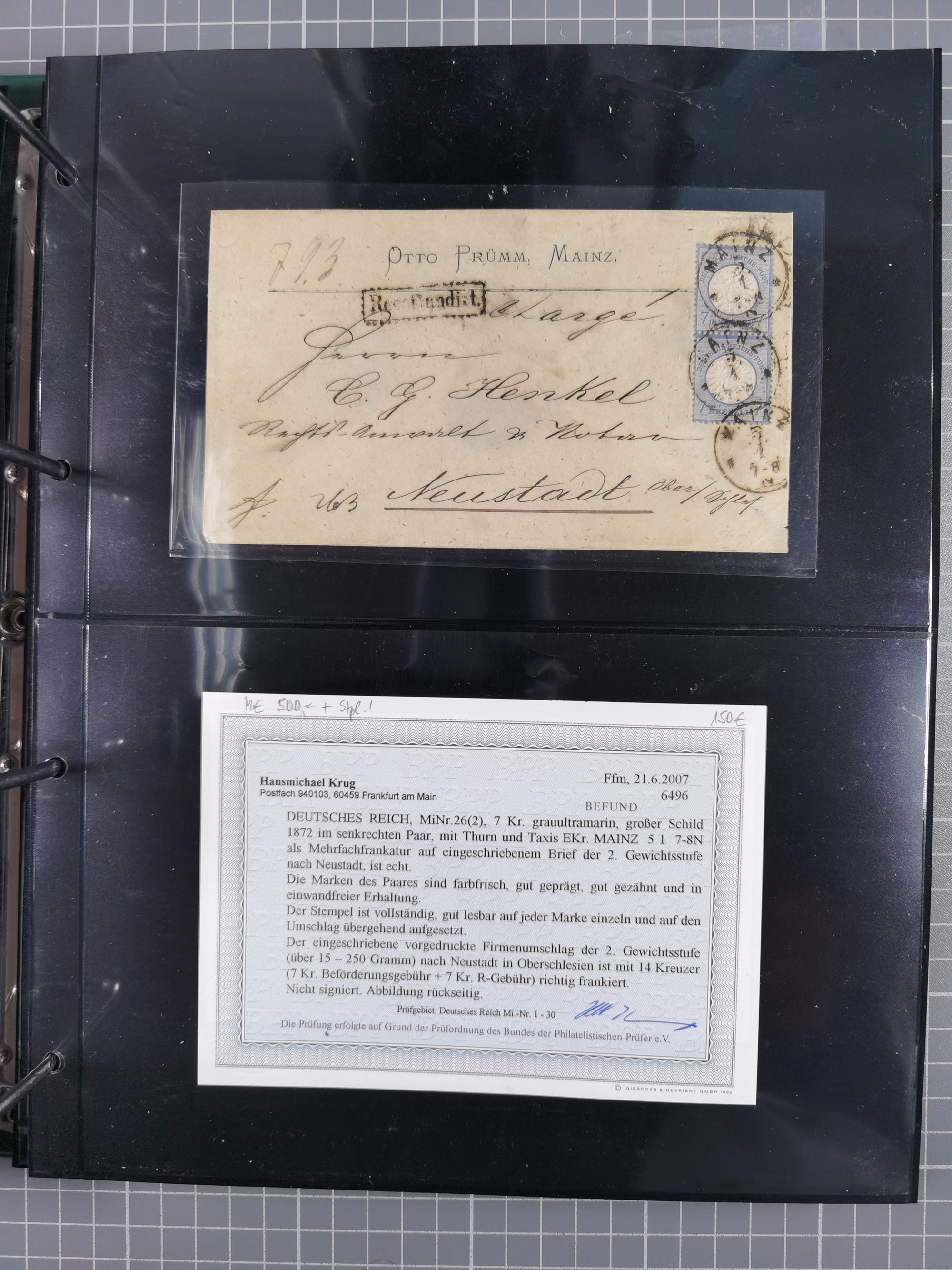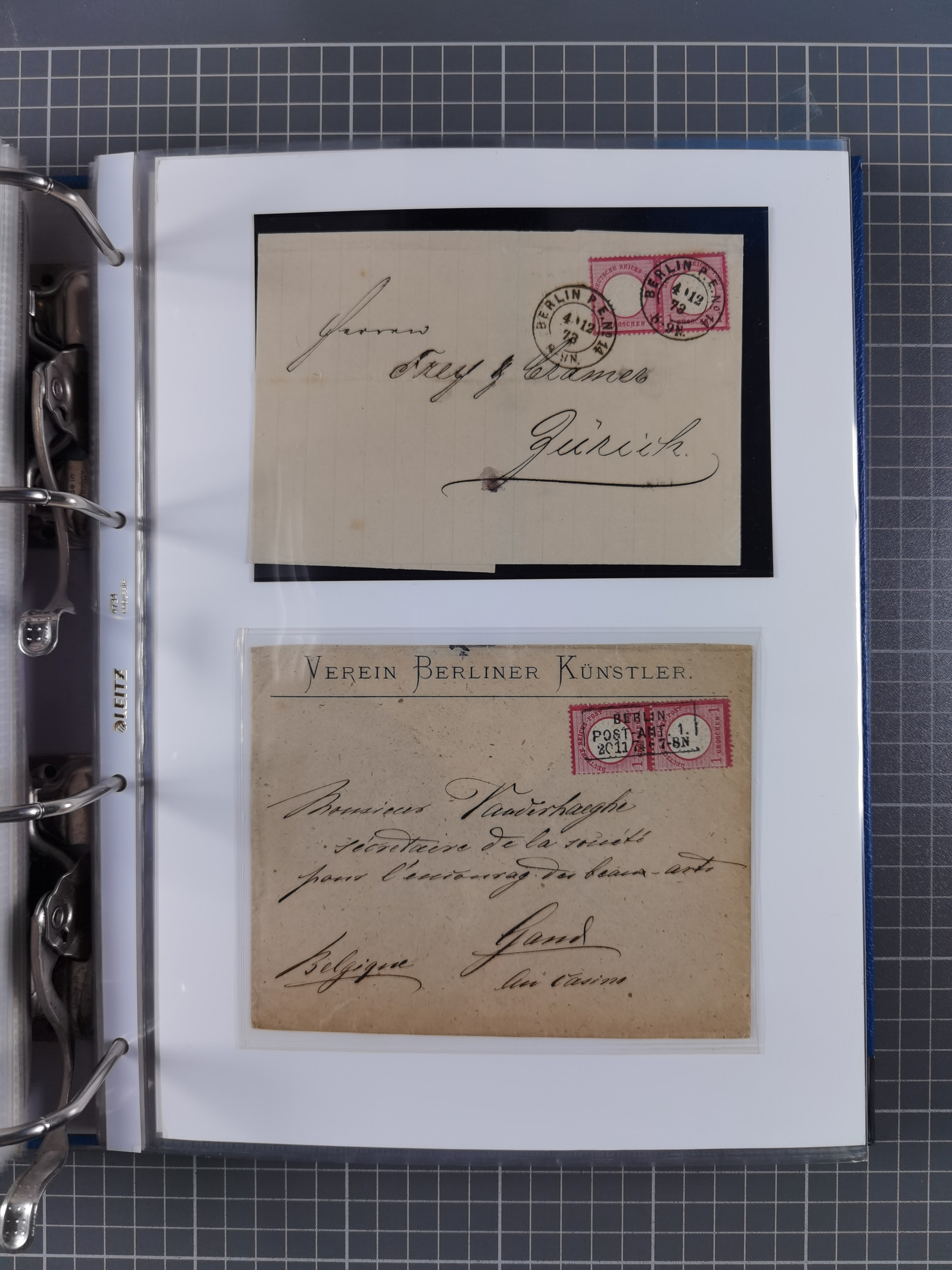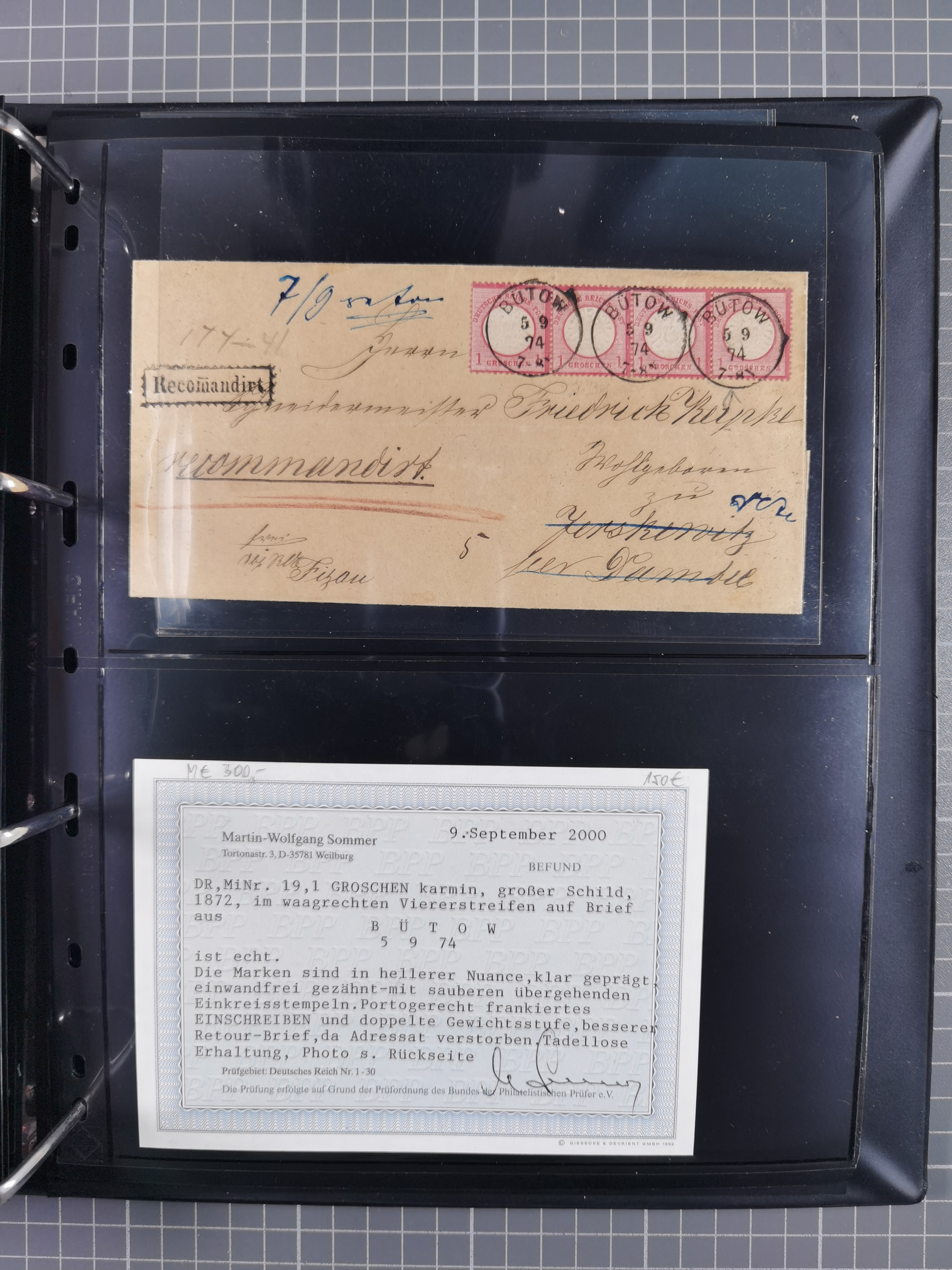 1872/74, umfangreiche Sammlung mit über 100 Briefen und Karten mit besseren Einzel- und Mehrfachfrankaturen, R- und Wertbriefen, Express-Briefe, interessante Stempel und weiteren Besonderheiten. Dabei u.a. Mi.-Nr. 1 (2) + Paar 21a auf R-Express-Brief (FA Sommer BPP), Mi.-Nr. 3 (7) auf Express-Brief (1 Wert fehlerhaft), Mi.-Nr. 5 im Paar auf Express-Brief mit Landzustellung (FA Brugger BPP), zwei Einzelfrankaturen Mi.-Nr. 11 auf Wertbriefen (repariert, einmal mit FB Krug BPP), Mi.-Nr. 17a(2) auf Drucksache der 2. Gewichtsstufe (FA Krug BPP), Mi.-Nr. 19 auf P1 als R-Ortskarte von Berlin (FA Sommer BPP) und Mi.-Nr. 23a+30 auf Wertbrief. Die Erhaltung ist zum Teil fehlerhaft, vieles signiert bzw. mit FB und Fotoattesten, ex Untermann