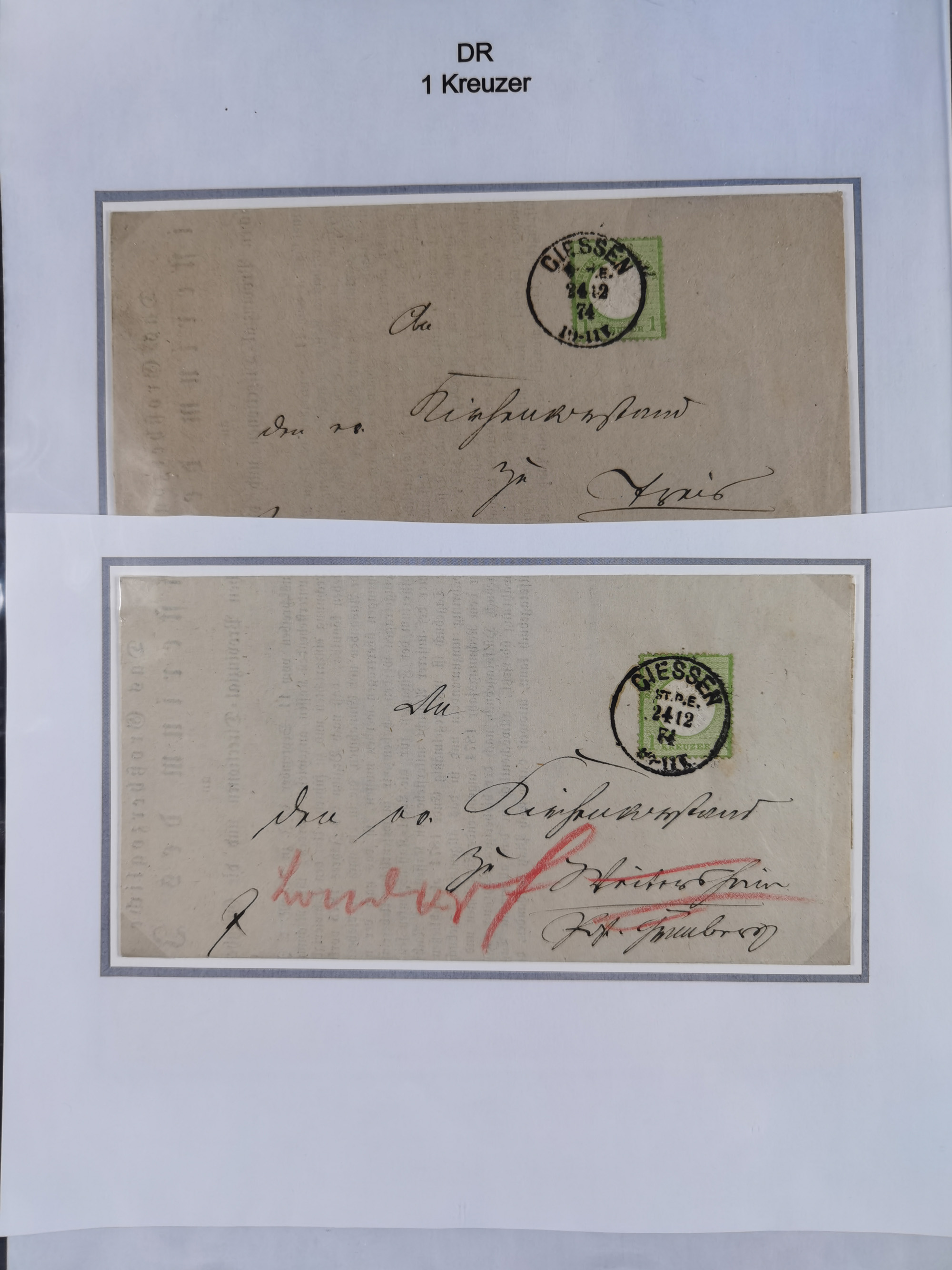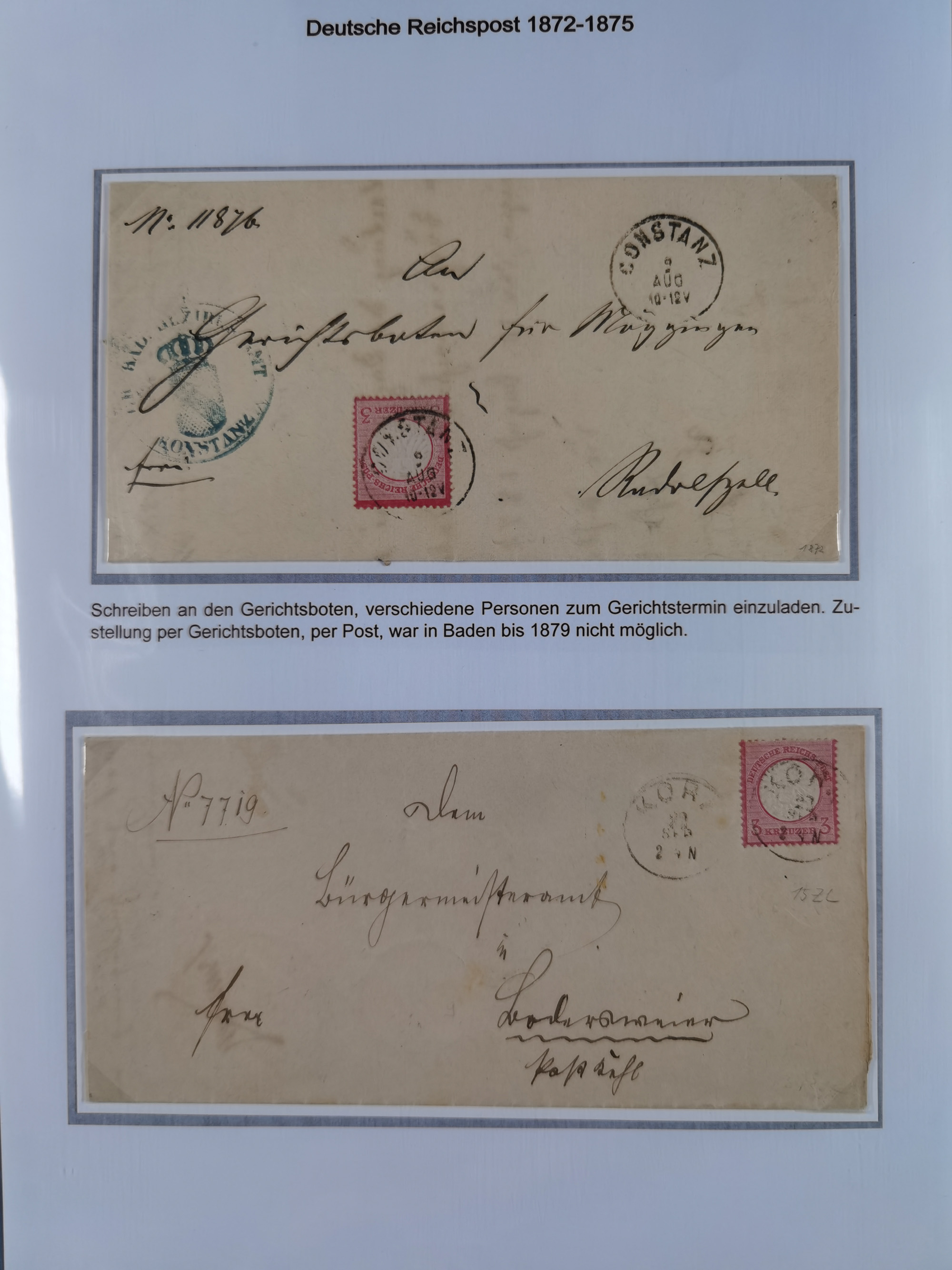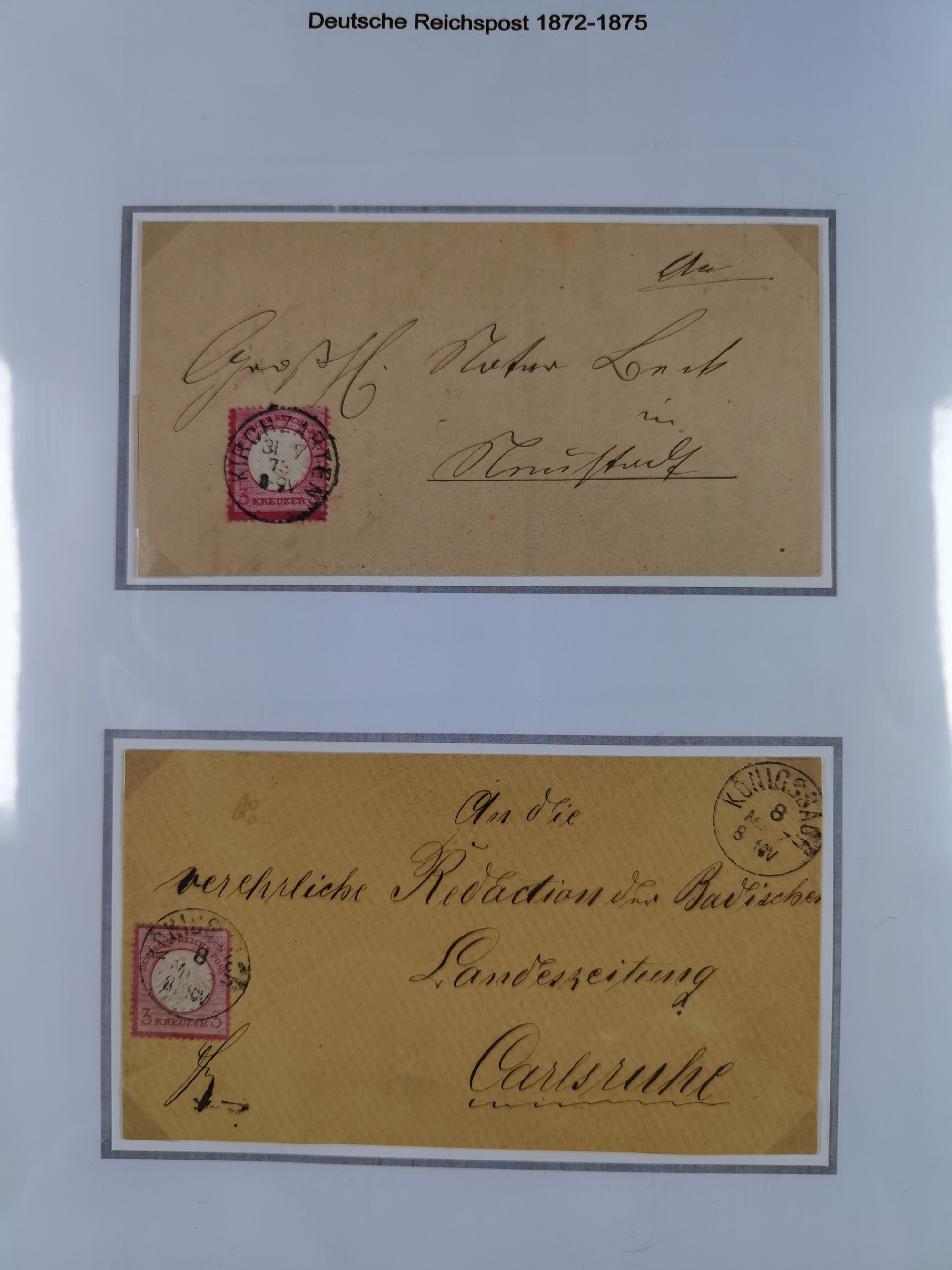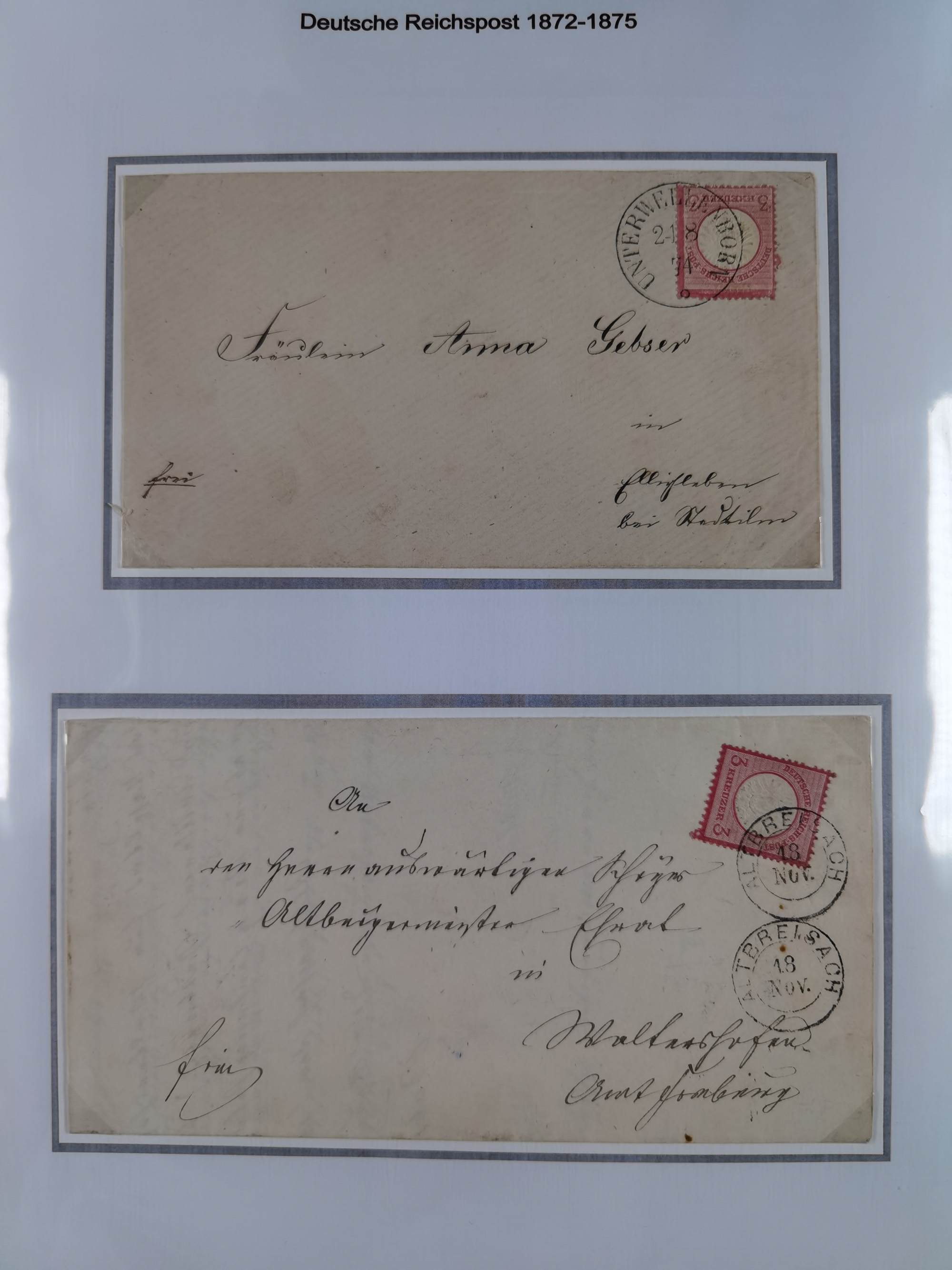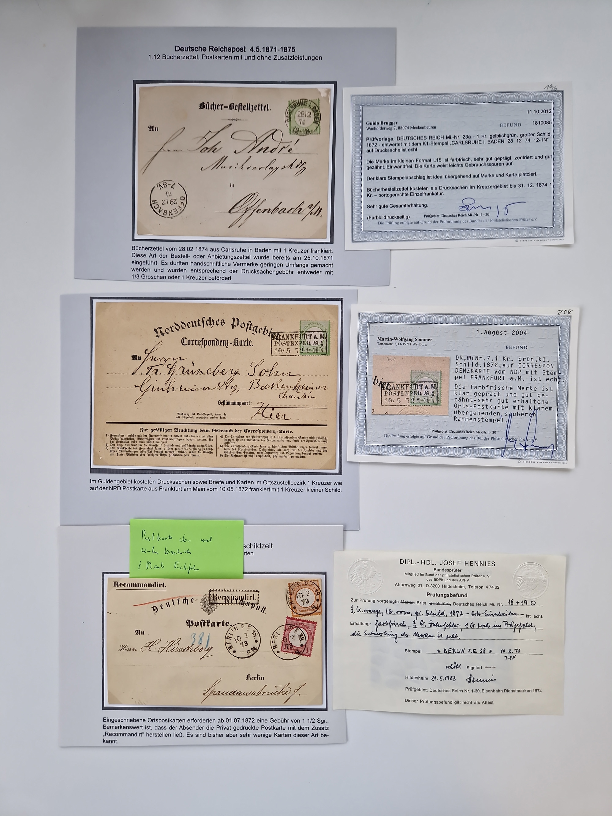1872/74, umfangreiche Sammlung mit über 100 Briefen und Karten mit besseren Einzel- und Mehrfachfrankaturen, R- und Wertbriefen, Express-Briefe, interessante Stempel und weiteren Besonderheiten. Dabei u.a. Mi.-Nr. 1 (2) + Paar 21a auf R-Express-Brief (FA Sommer BPP), Mi.-Nr. 3 (7) auf Express-Brief (1 Wert fehlerhaft), Mi.-Nr. 5 im Paar auf Express-Brief mit Landzustellung (FA Brugger BPP), zwei Einzelfrankaturen Mi.-Nr. 11 auf Wertbriefen (repariert, einmal mit FB Krug BPP), Mi.-Nr. 17a(2) auf Drucksache der 2. Gewichtsstufe (FA Krug BPP), Mi.-Nr. 19 auf P1 als R-Ortskarte von Berlin (FA Sommer BPP) und Mi.-Nr. 23a+30 auf Wertbrief. Die Erhaltung ist zum Teil fehlerhaft, vieles signiert bzw. mit FB und Fotoattesten, ex Untermann