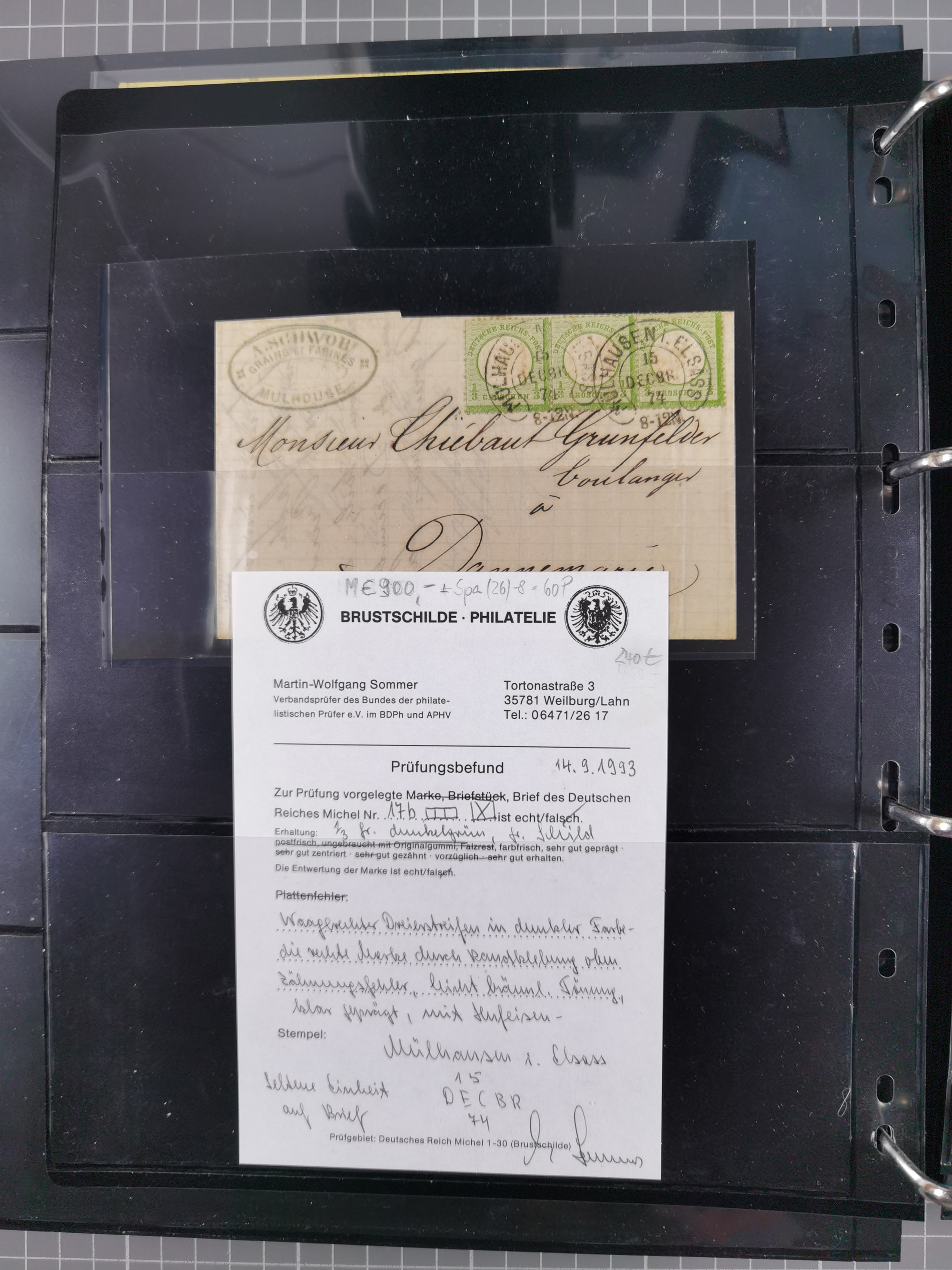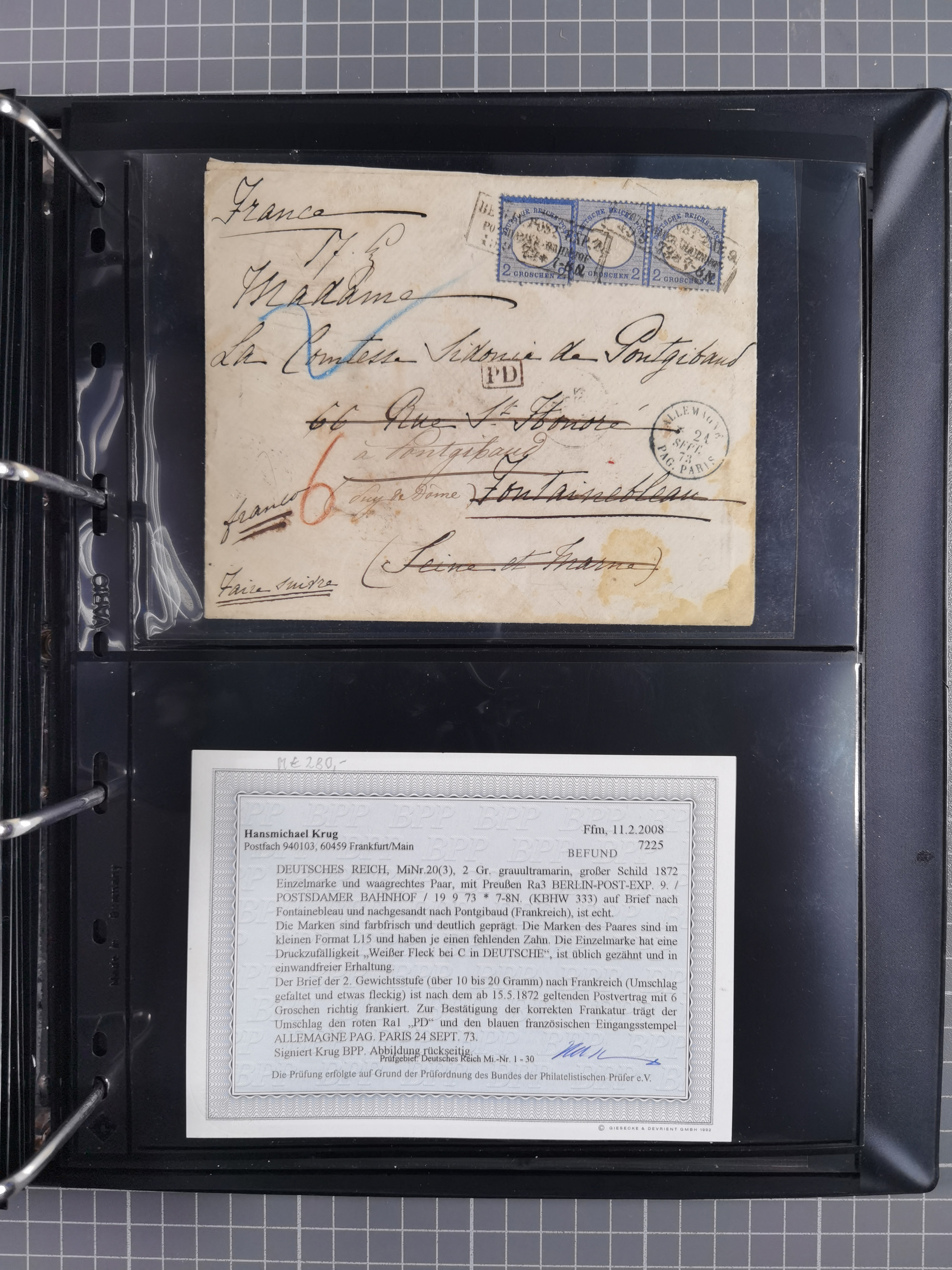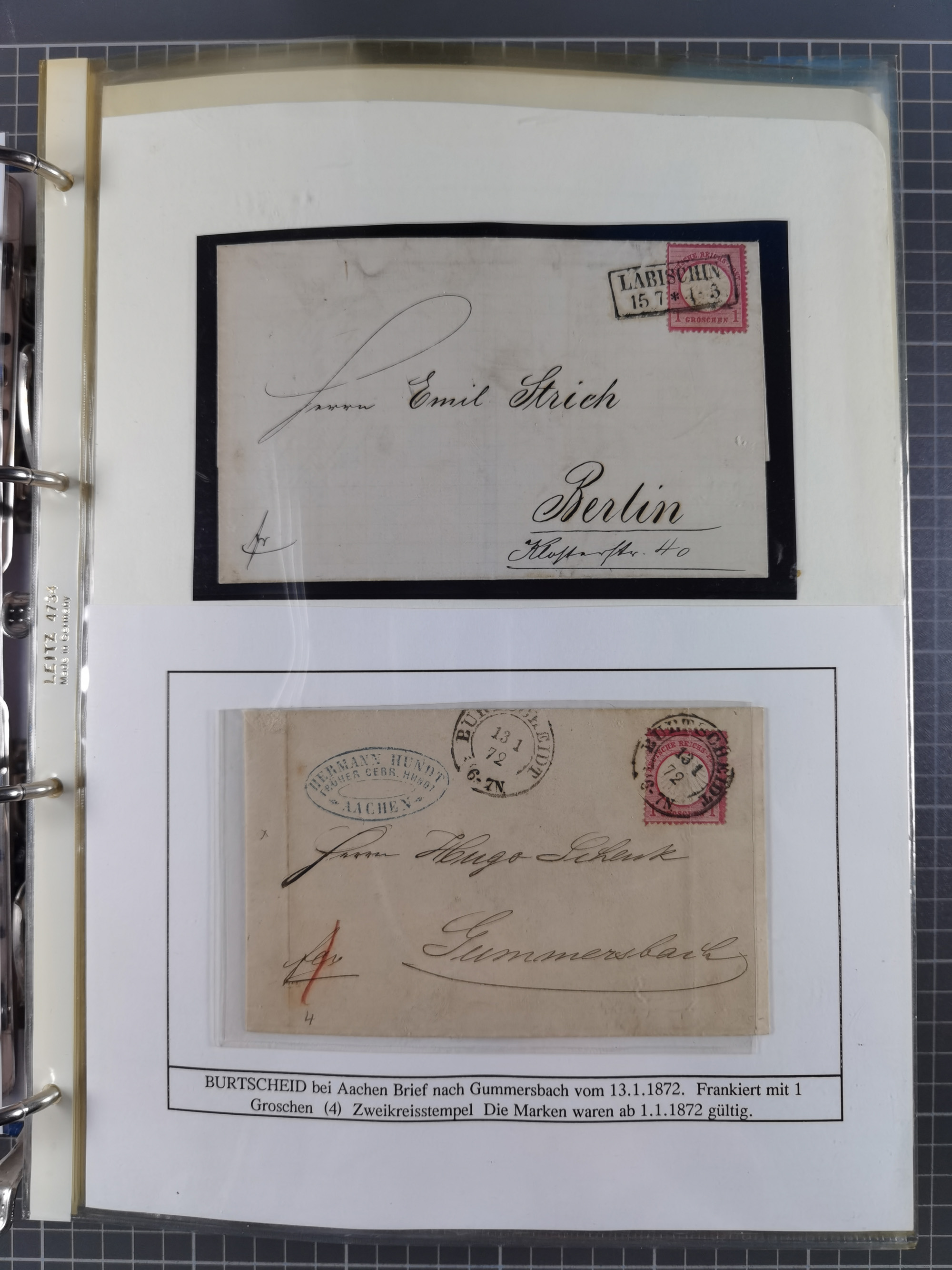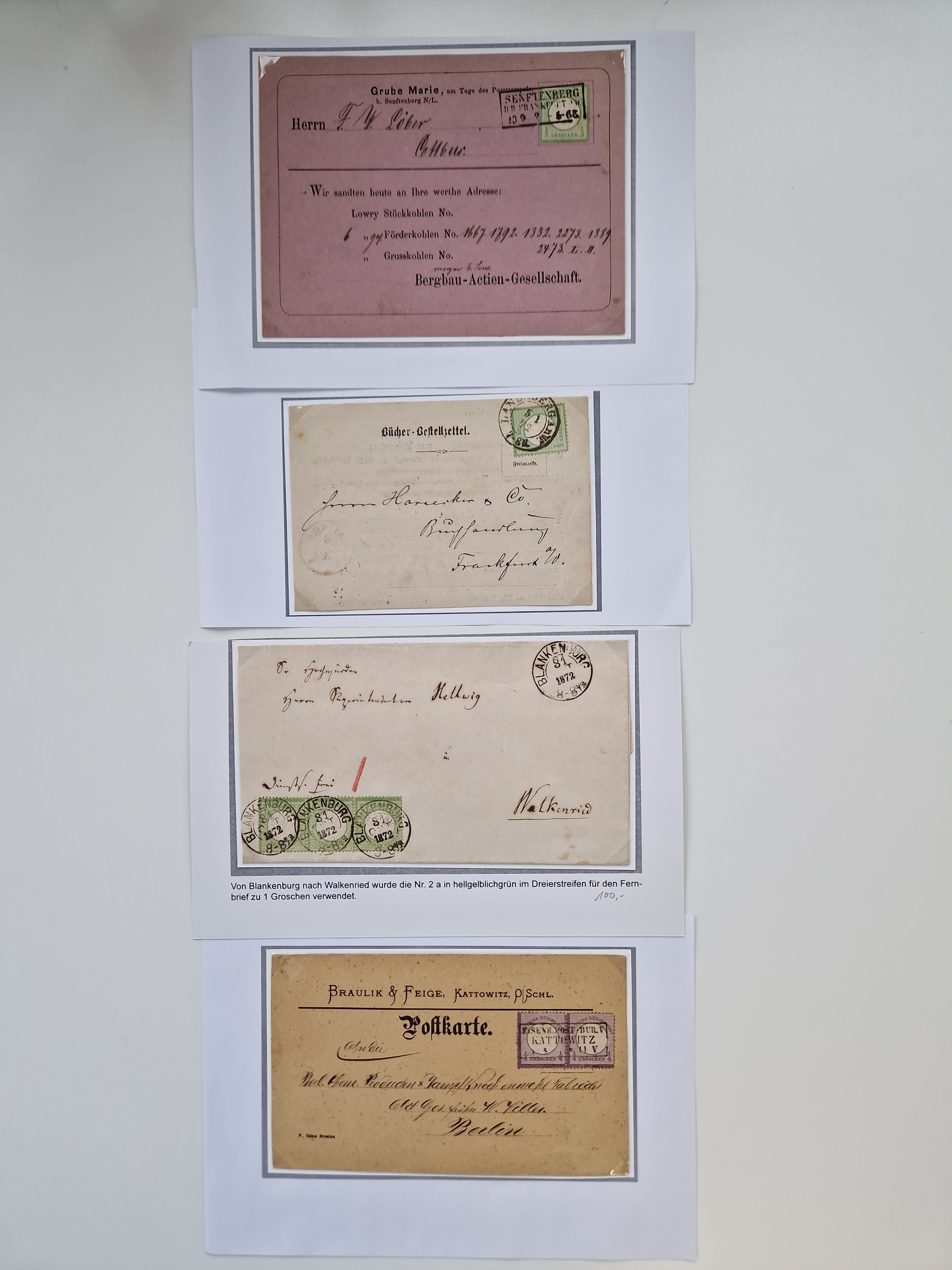 1872/74, umfangreiche Sammlung mit über 100 Briefen und Karten mit besseren Einzel- und Mehrfachfrankaturen, R- und Wertbriefen, Express-Briefe, interessante Stempel und weiteren Besonderheiten. Dabei u.a. Mi.-Nr. 1 (2) + Paar 21a auf R-Express-Brief (FA Sommer BPP), Mi.-Nr. 3 (7) auf Express-Brief (1 Wert fehlerhaft), Mi.-Nr. 5 im Paar auf Express-Brief mit Landzustellung (FA Brugger BPP), zwei Einzelfrankaturen Mi.-Nr. 11 auf Wertbriefen (repariert, einmal mit FB Krug BPP), Mi.-Nr. 17a(2) auf Drucksache der 2. Gewichtsstufe (FA Krug BPP), Mi.-Nr. 19 auf P1 als R-Ortskarte von Berlin (FA Sommer BPP) und Mi.-Nr. 23a+30 auf Wertbrief. Die Erhaltung ist zum Teil fehlerhaft, vieles signiert bzw. mit FB und Fotoattesten, ex Untermann