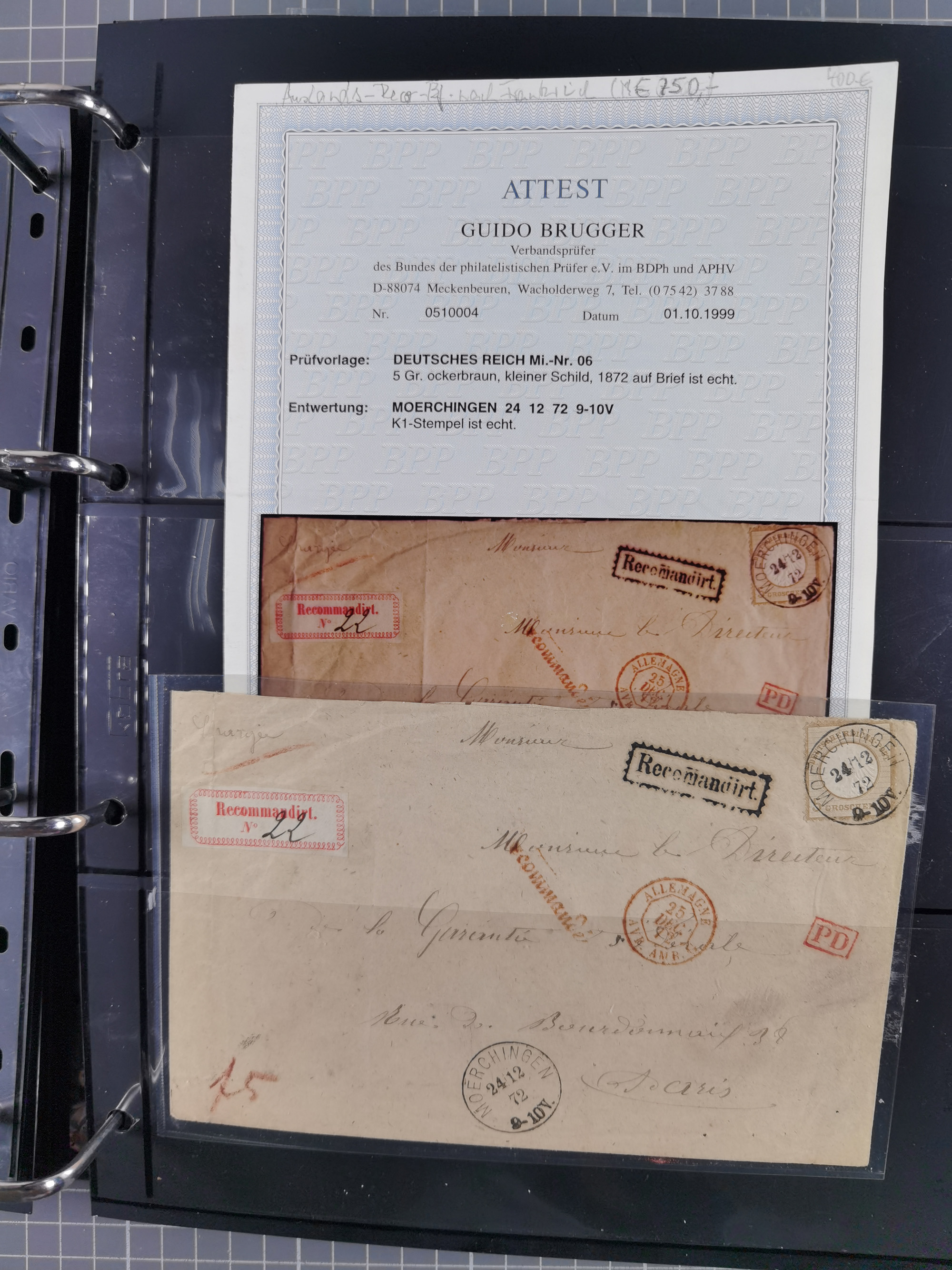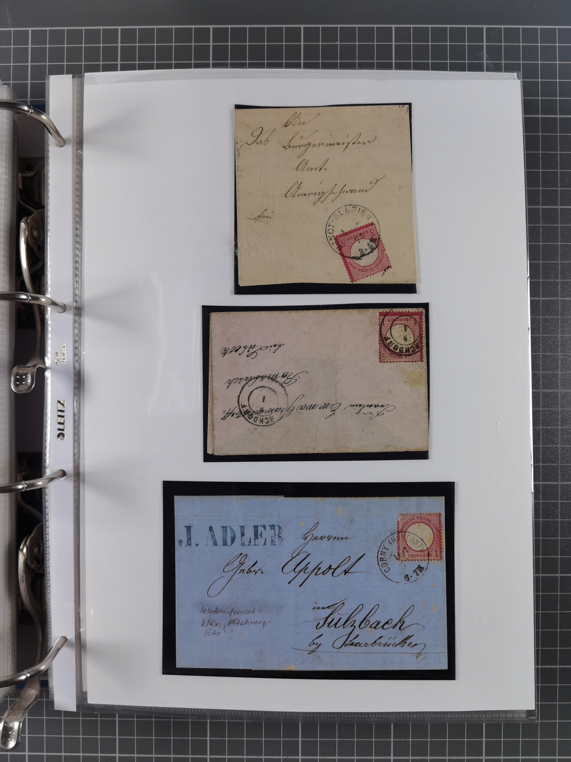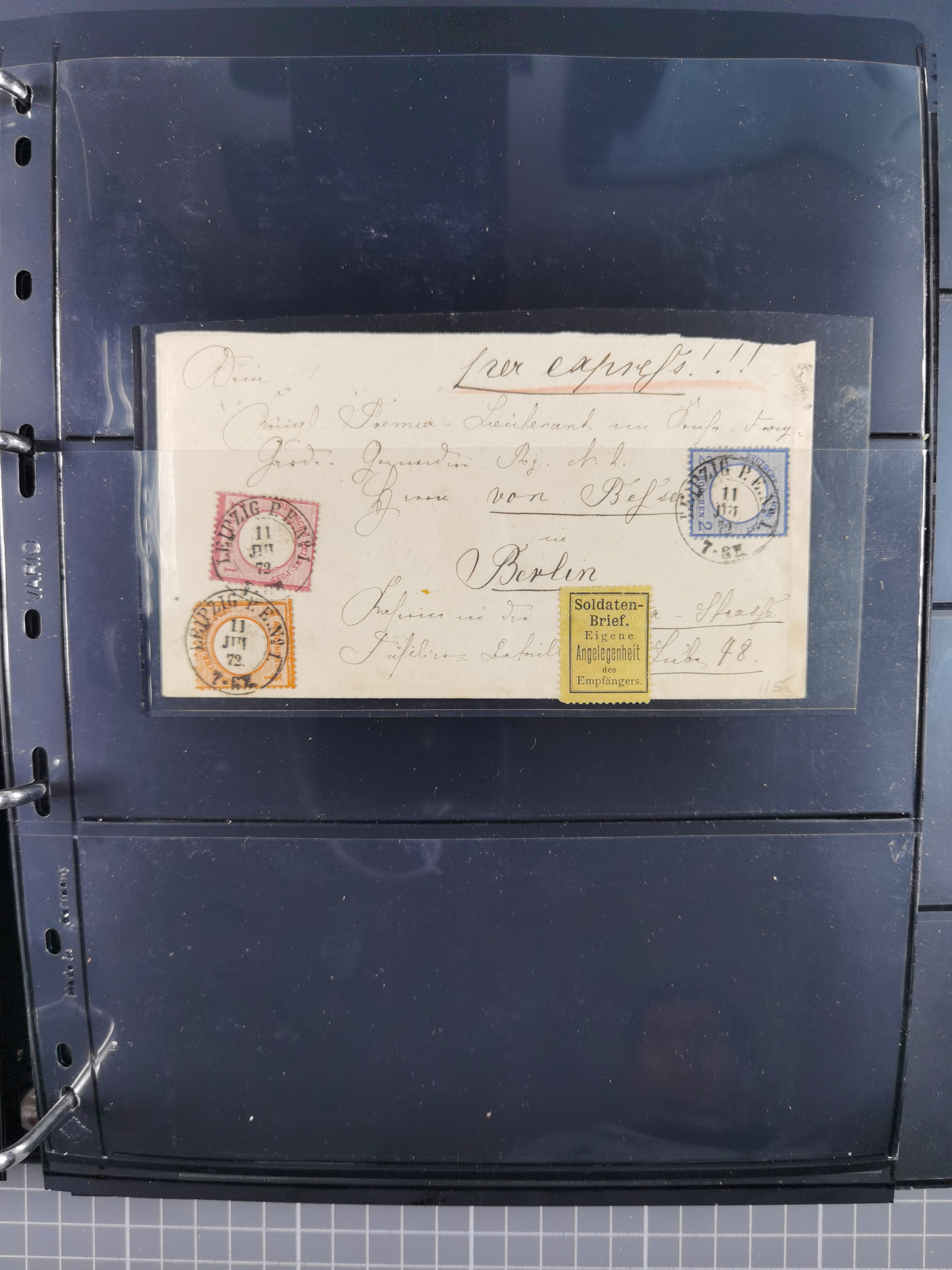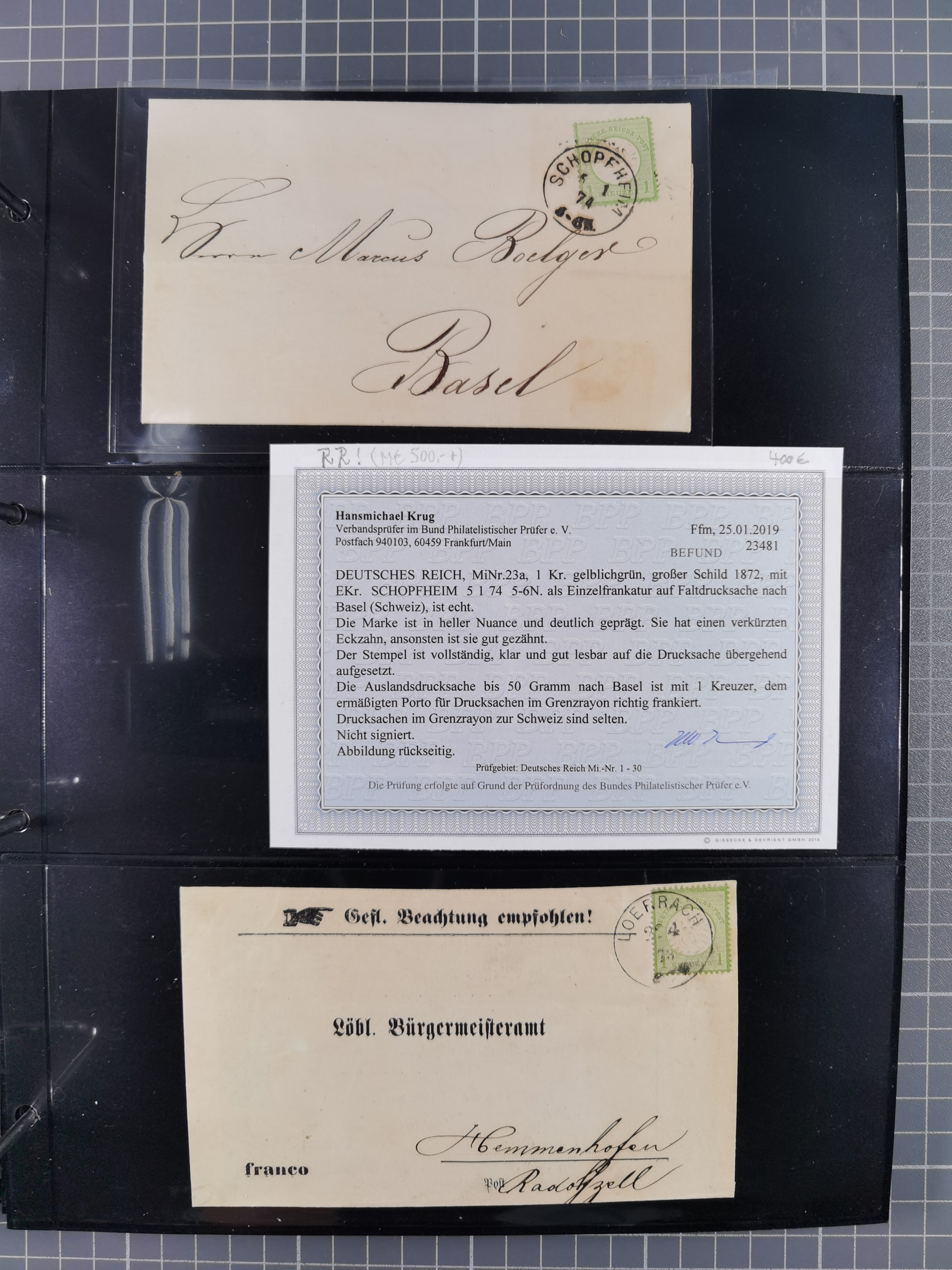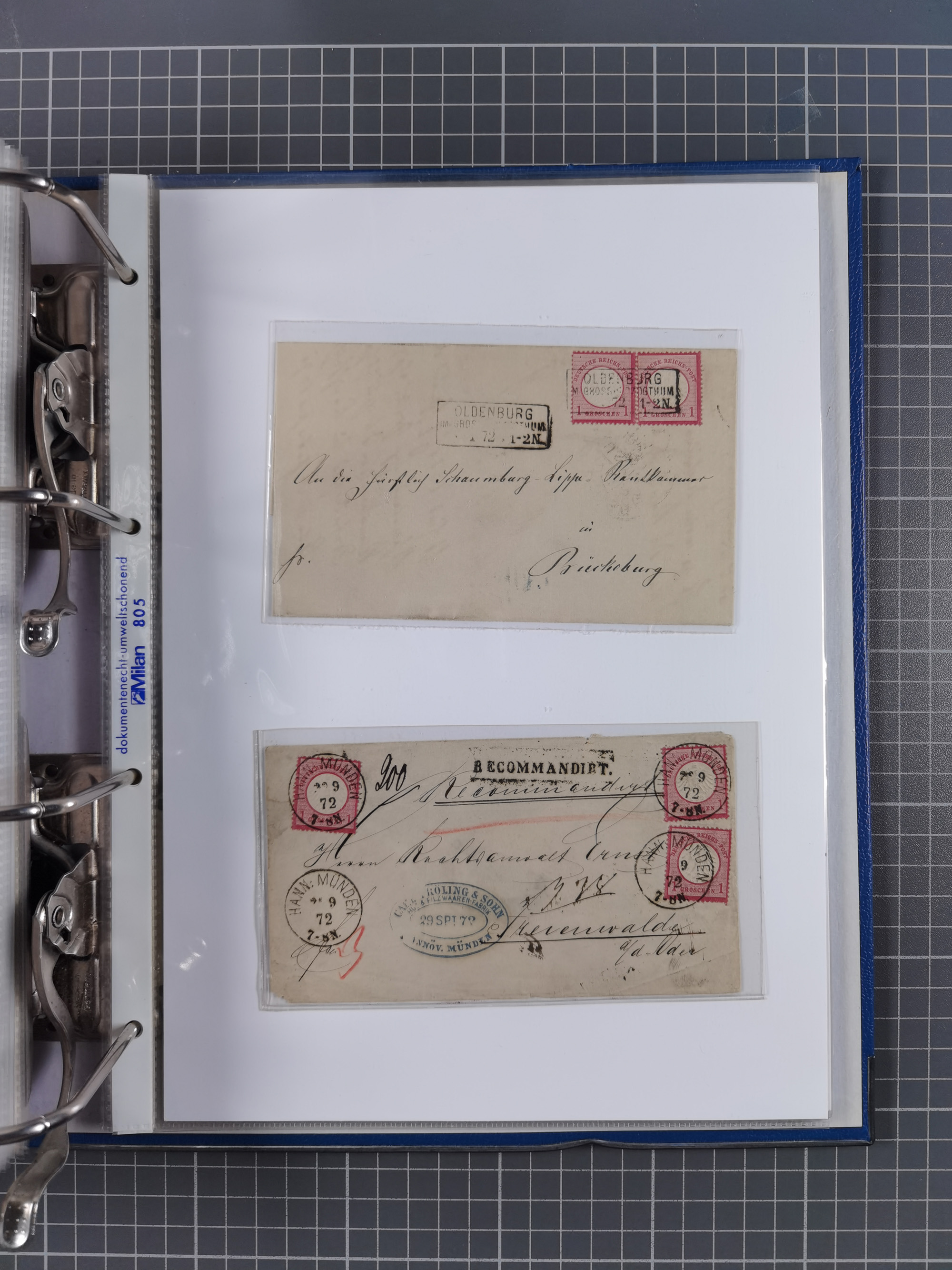 1872/74, umfangreiche Sammlung mit über 100 Briefen und Karten mit besseren Einzel- und Mehrfachfrankaturen, R- und Wertbriefen, Express-Briefe, interessante Stempel und weiteren Besonderheiten. Dabei u.a. Mi.-Nr. 1 (2) + Paar 21a auf R-Express-Brief (FA Sommer BPP), Mi.-Nr. 3 (7) auf Express-Brief (1 Wert fehlerhaft), Mi.-Nr. 5 im Paar auf Express-Brief mit Landzustellung (FA Brugger BPP), zwei Einzelfrankaturen Mi.-Nr. 11 auf Wertbriefen (repariert, einmal mit FB Krug BPP), Mi.-Nr. 17a(2) auf Drucksache der 2. Gewichtsstufe (FA Krug BPP), Mi.-Nr. 19 auf P1 als R-Ortskarte von Berlin (FA Sommer BPP) und Mi.-Nr. 23a+30 auf Wertbrief. Die Erhaltung ist zum Teil fehlerhaft, vieles signiert bzw. mit FB und Fotoattesten, ex Untermann