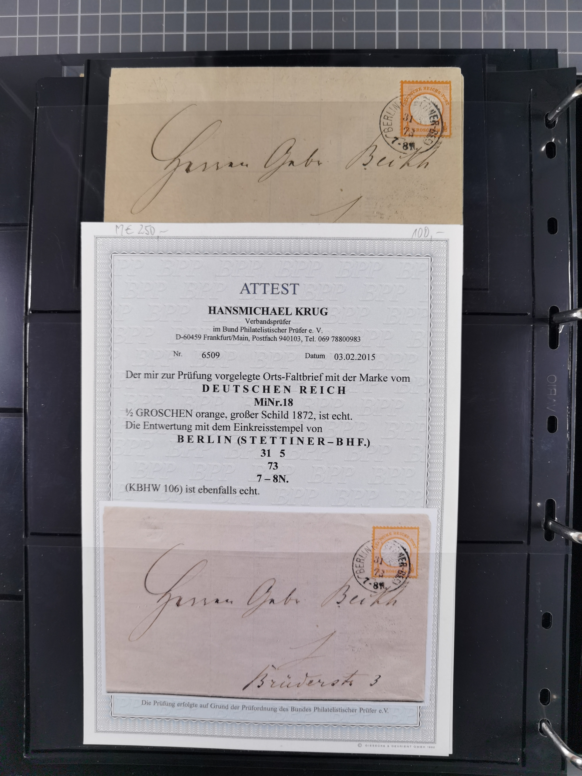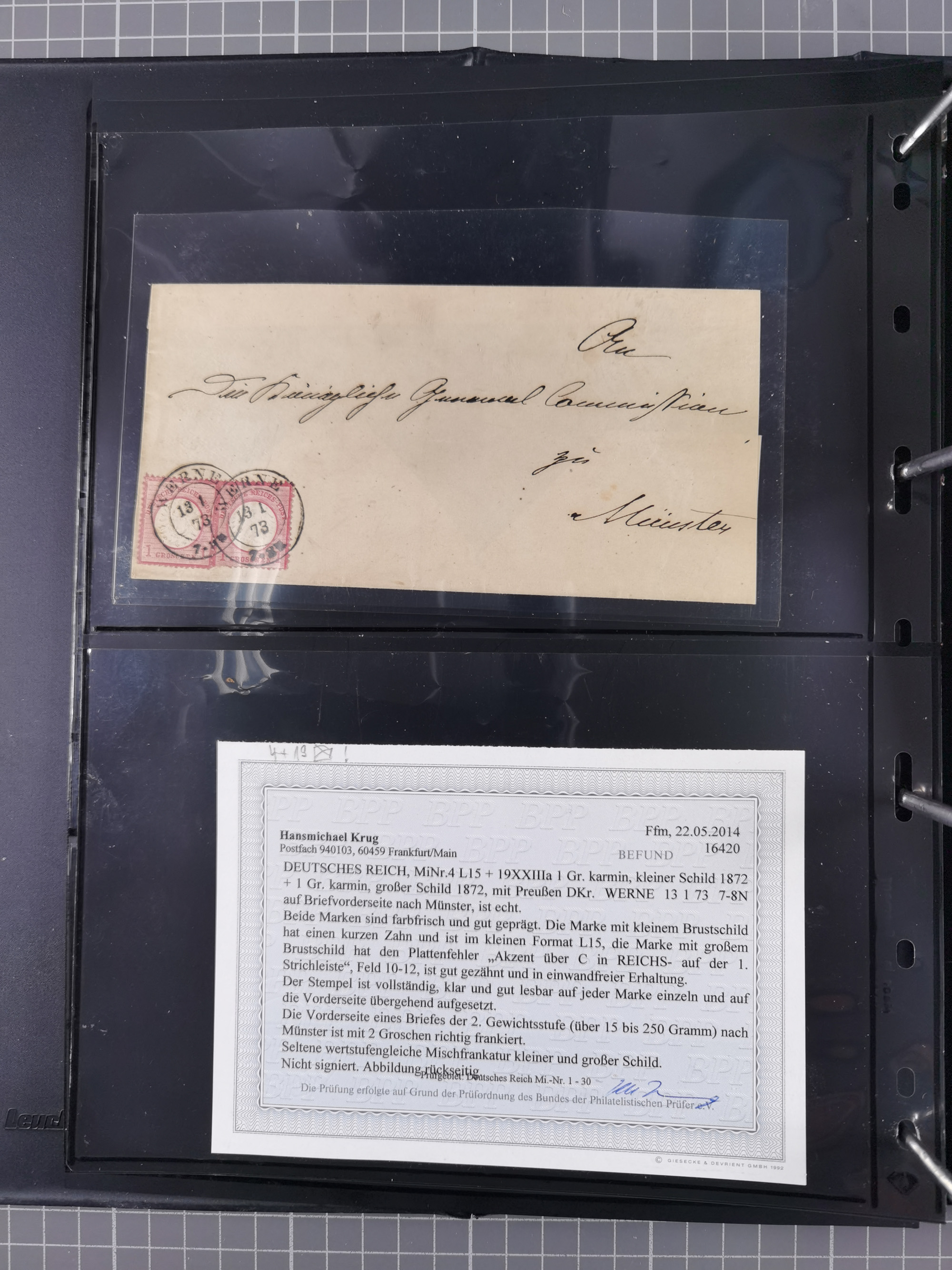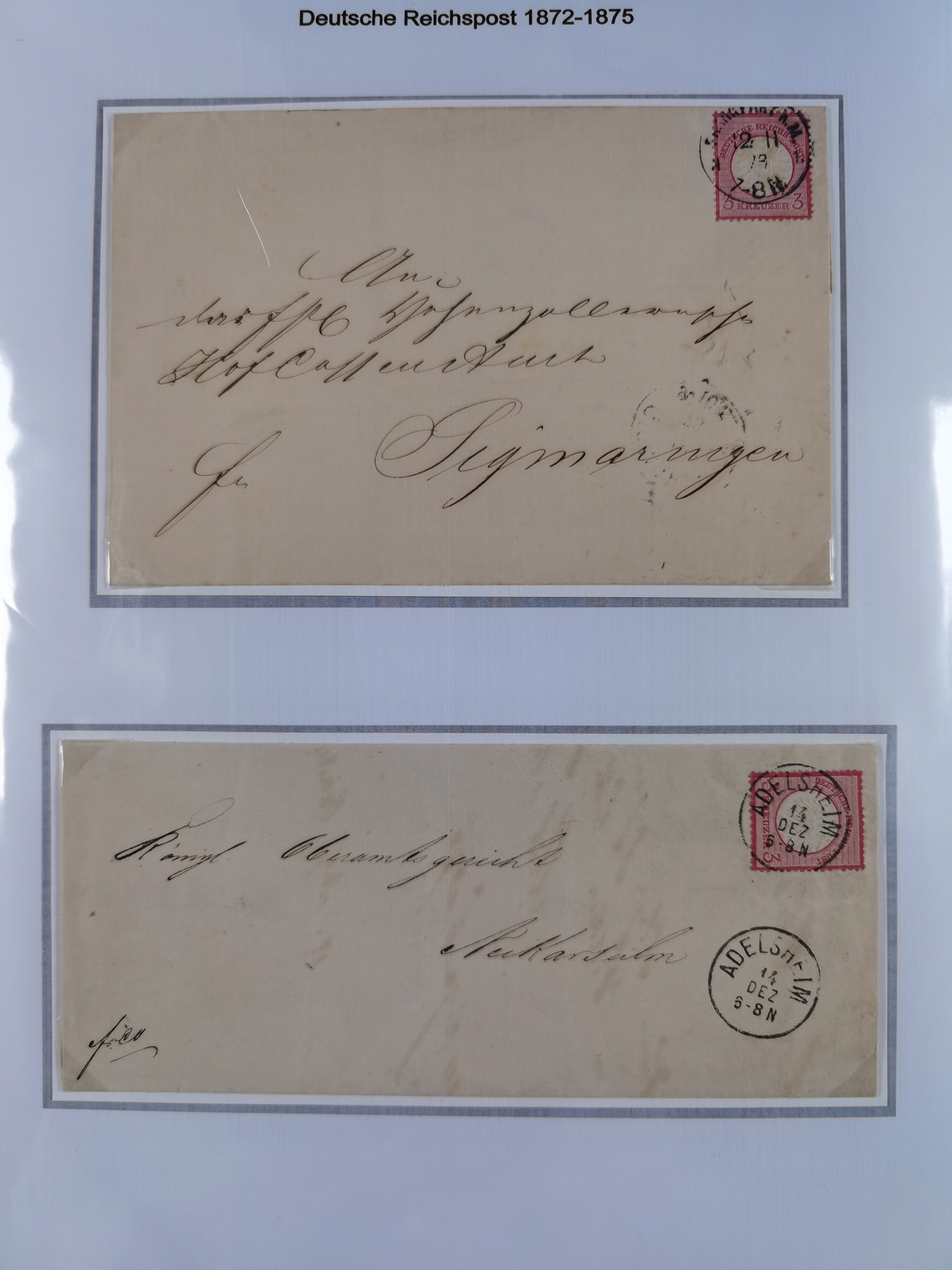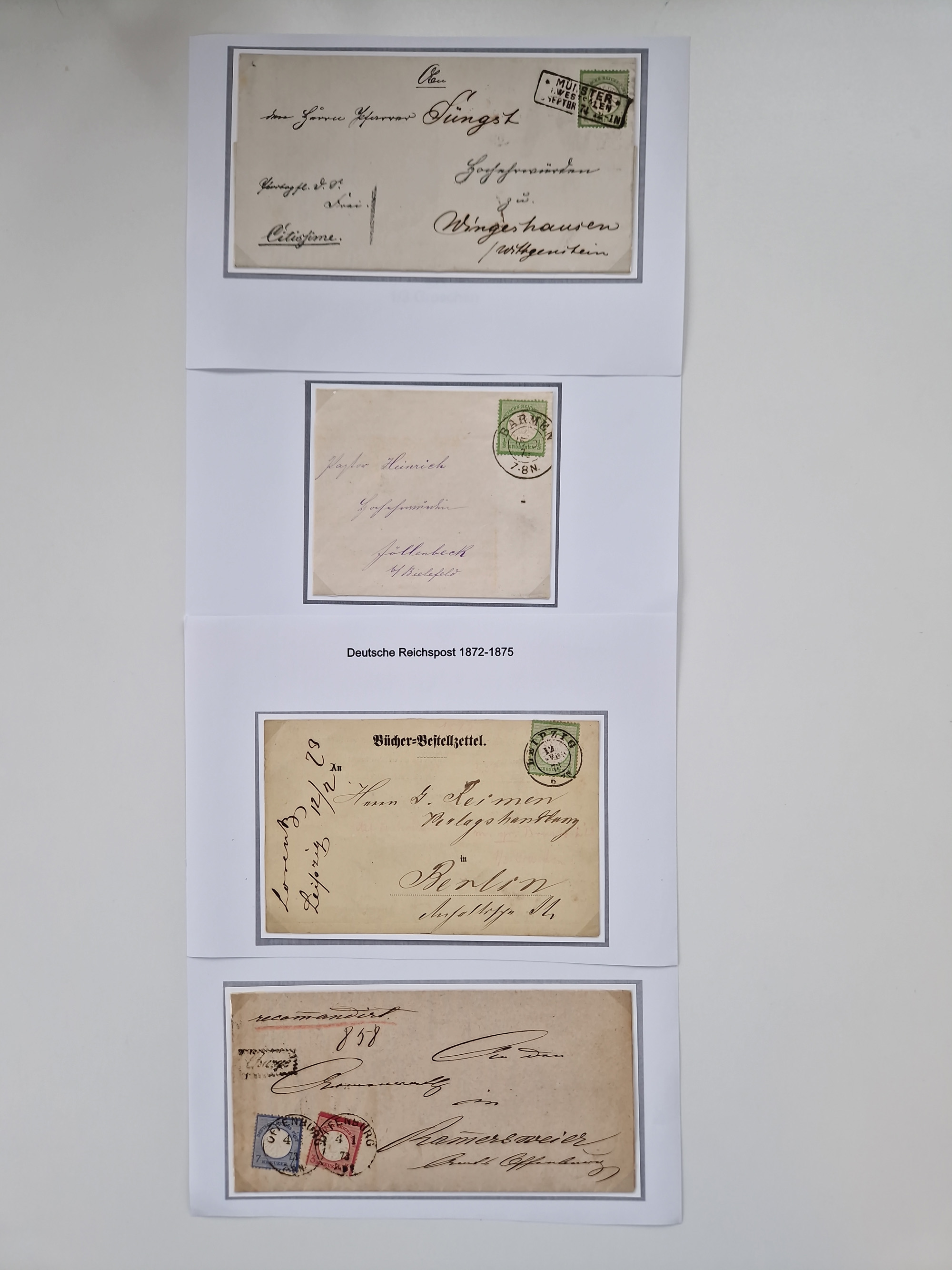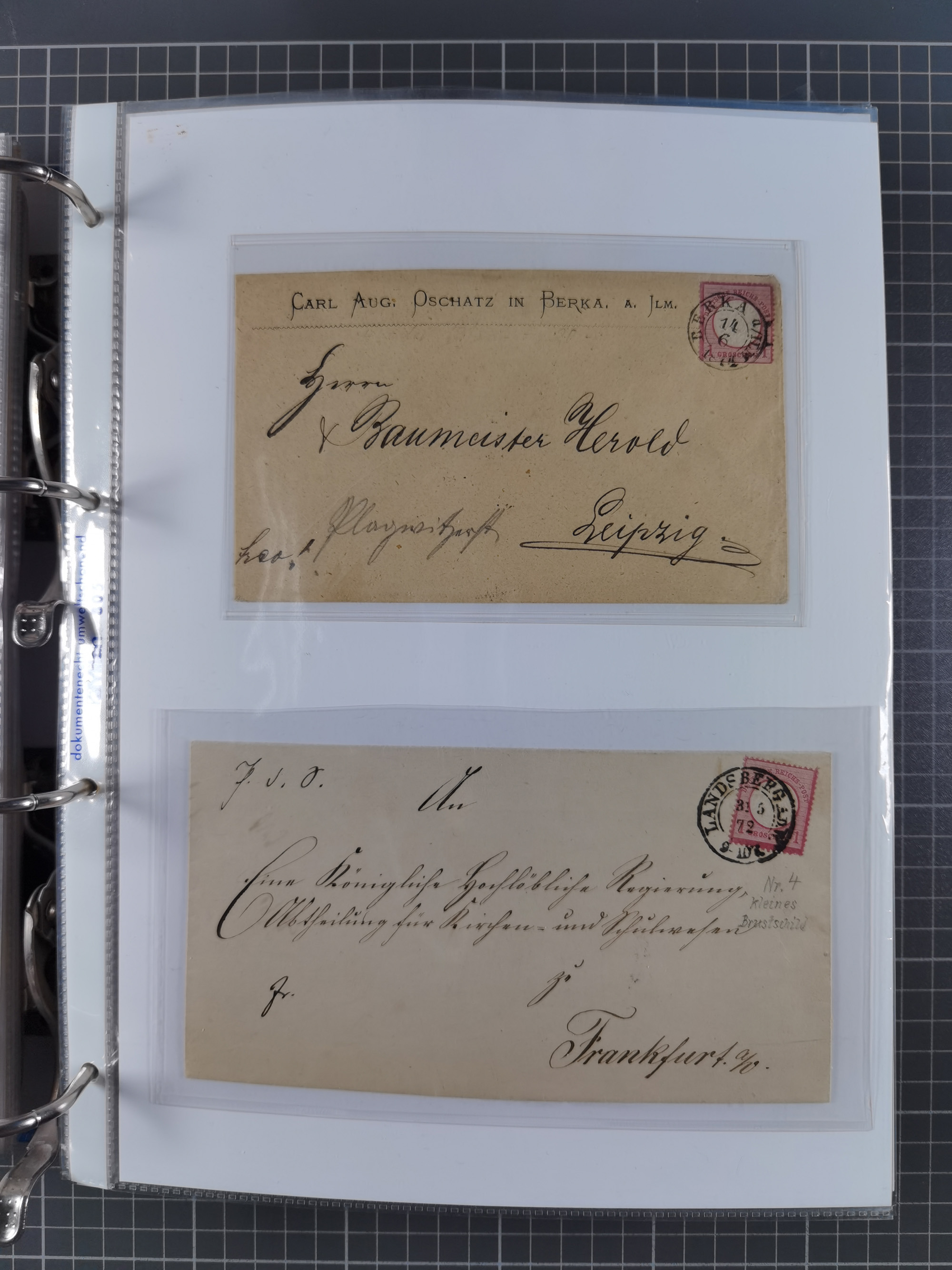 1872/74, umfangreiche Sammlung mit über 100 Briefen und Karten mit besseren Einzel- und Mehrfachfrankaturen, R- und Wertbriefen, Express-Briefe, interessante Stempel und weiteren Besonderheiten. Dabei u.a. Mi.-Nr. 1 (2) + Paar 21a auf R-Express-Brief (FA Sommer BPP), Mi.-Nr. 3 (7) auf Express-Brief (1 Wert fehlerhaft), Mi.-Nr. 5 im Paar auf Express-Brief mit Landzustellung (FA Brugger BPP), zwei Einzelfrankaturen Mi.-Nr. 11 auf Wertbriefen (repariert, einmal mit FB Krug BPP), Mi.-Nr. 17a(2) auf Drucksache der 2. Gewichtsstufe (FA Krug BPP), Mi.-Nr. 19 auf P1 als R-Ortskarte von Berlin (FA Sommer BPP) und Mi.-Nr. 23a+30 auf Wertbrief. Die Erhaltung ist zum Teil fehlerhaft, vieles signiert bzw. mit FB und Fotoattesten, ex Untermann