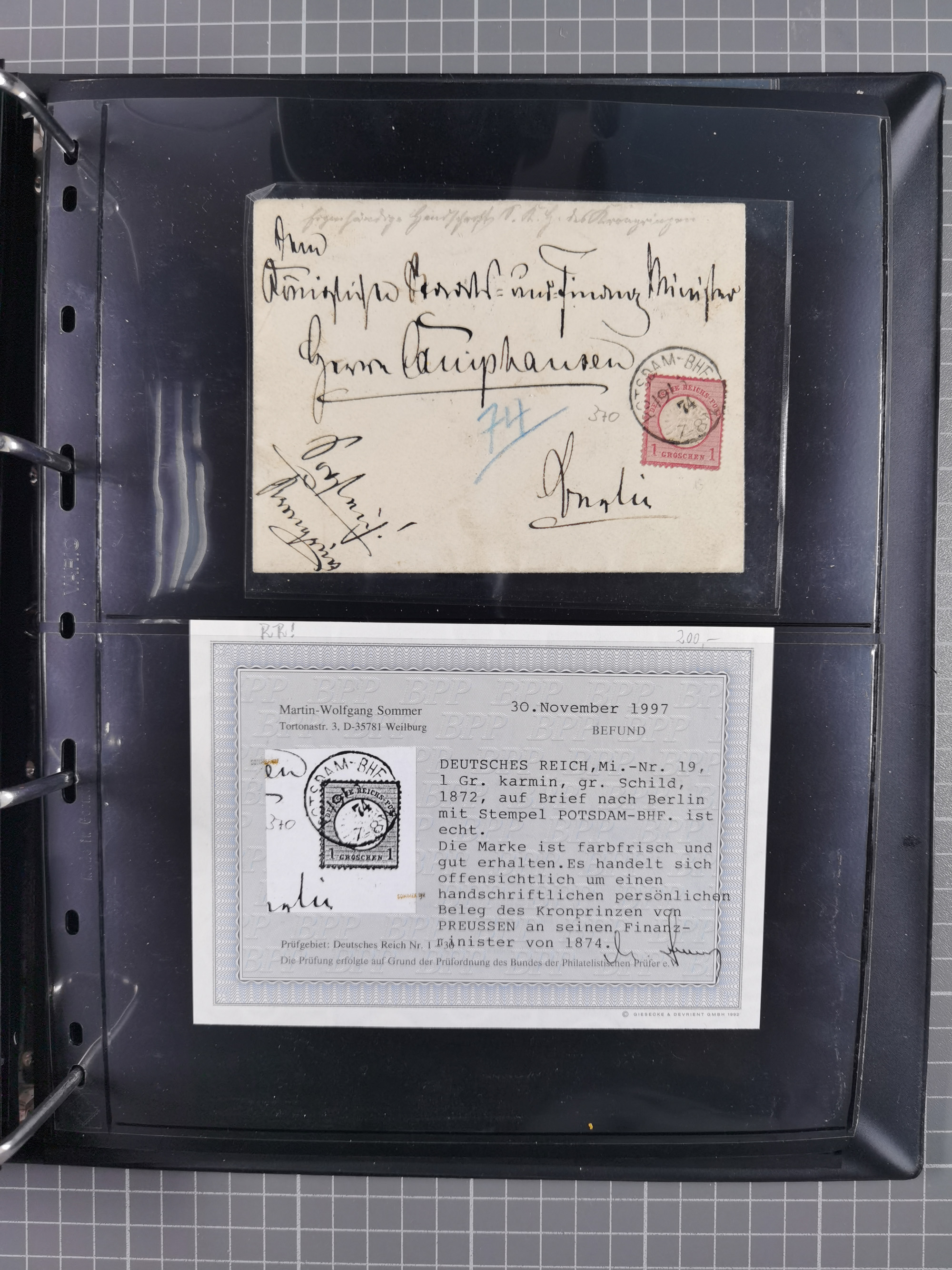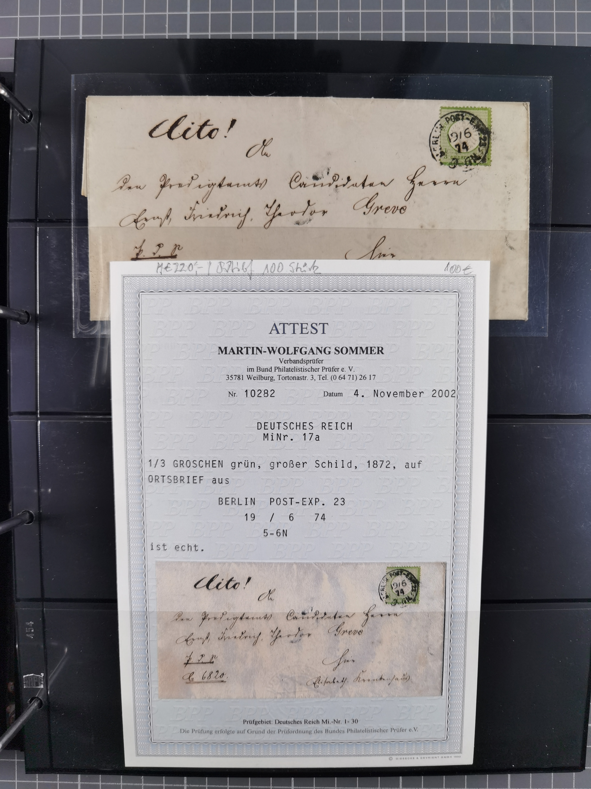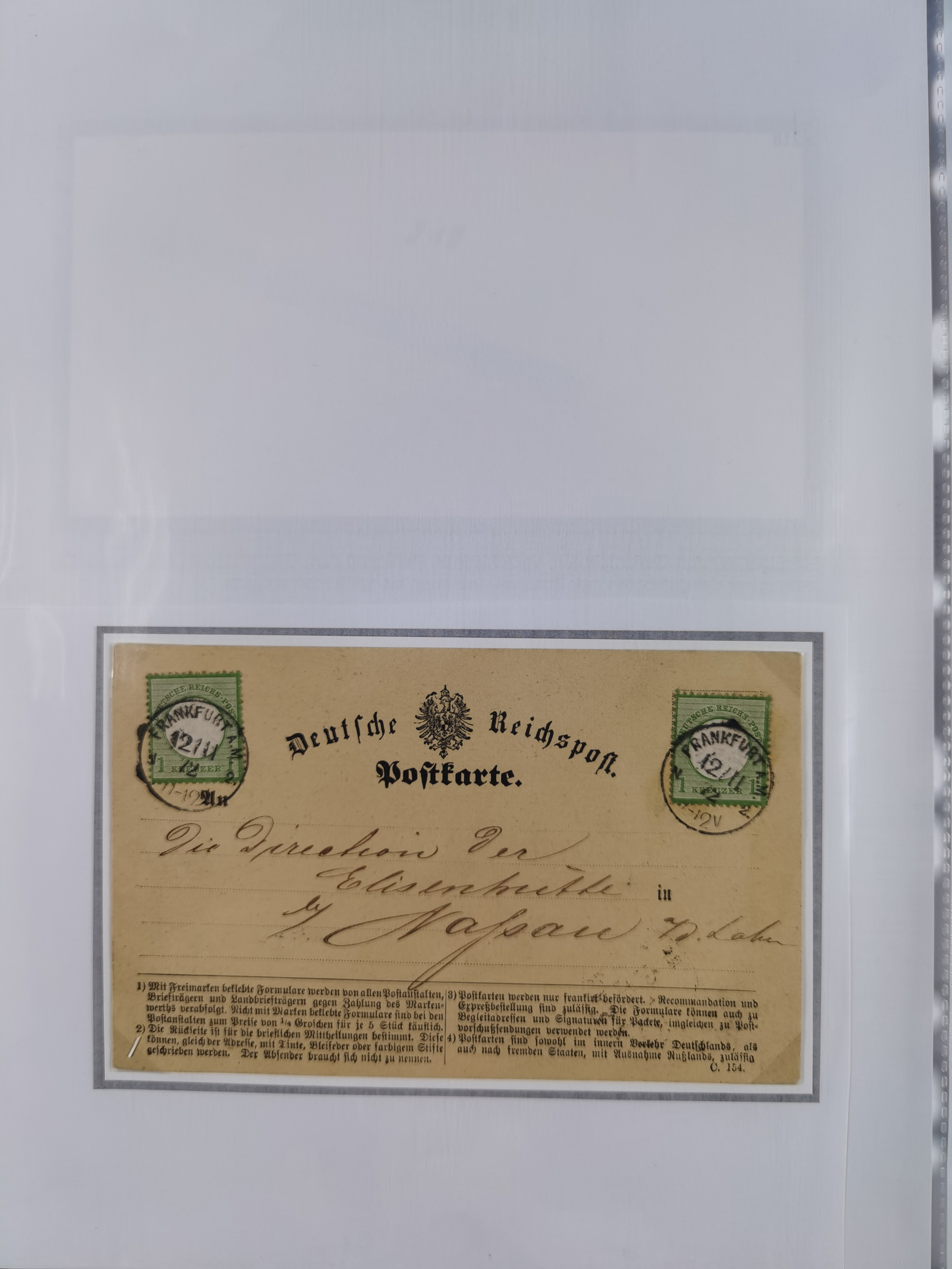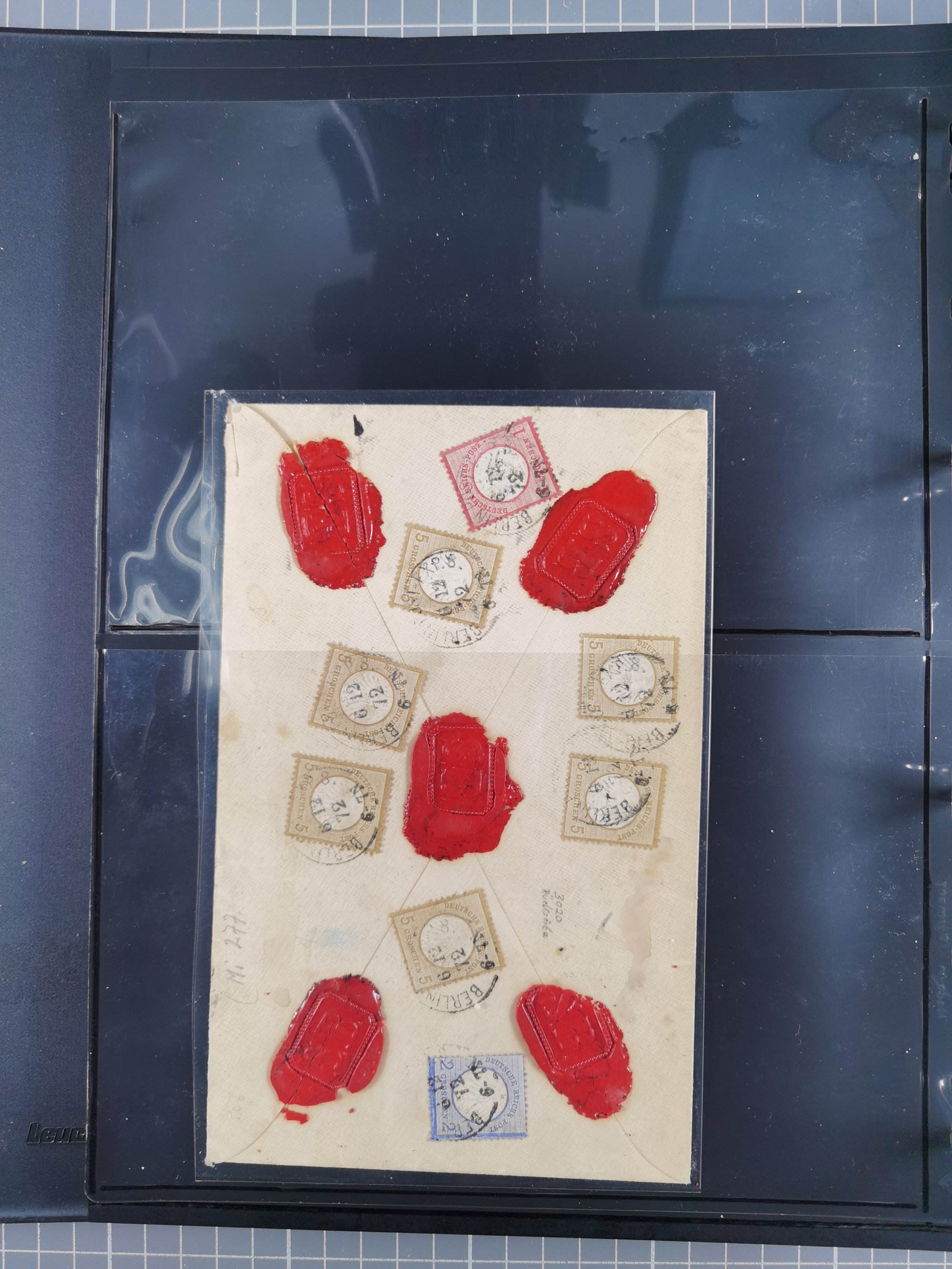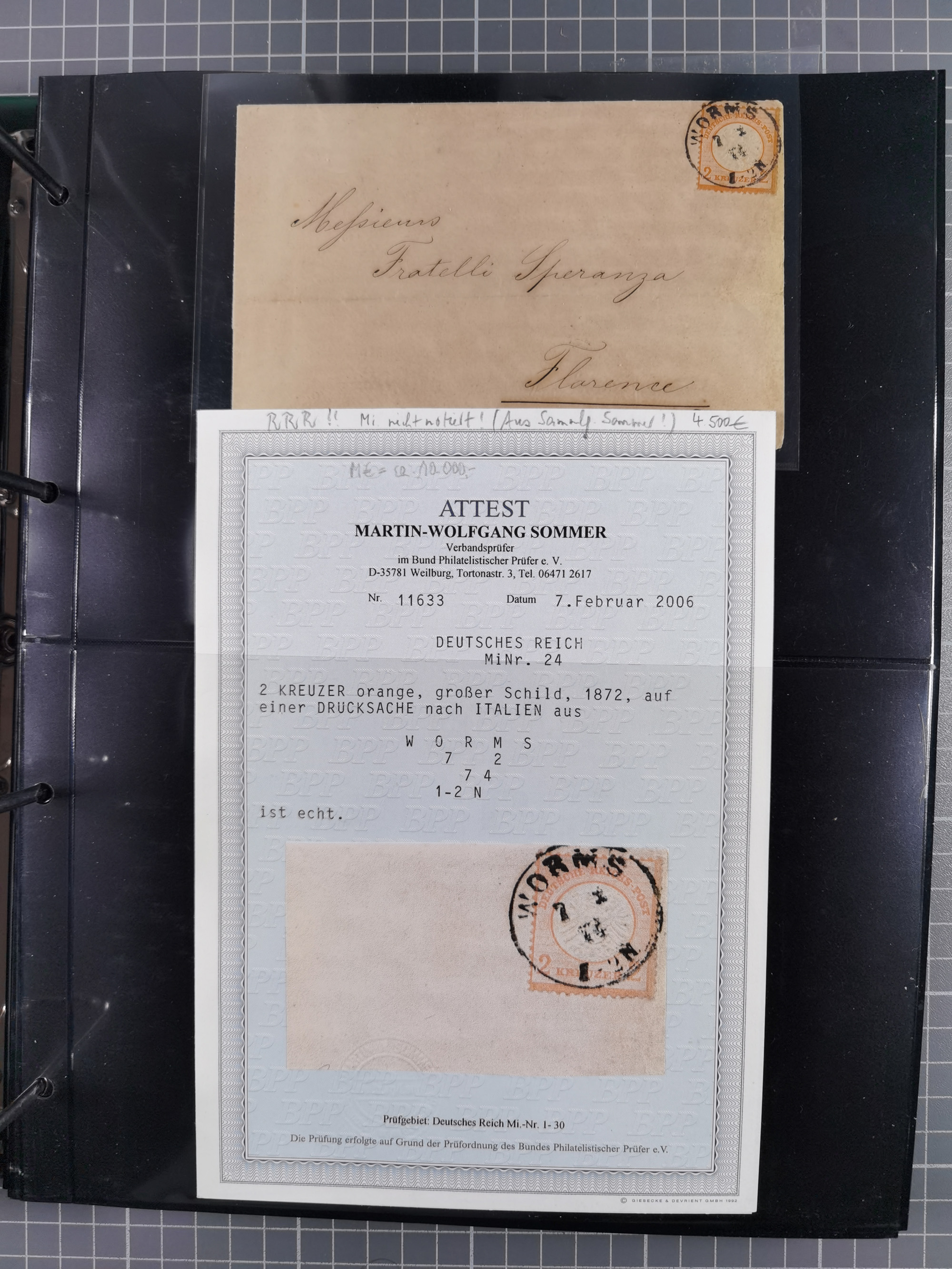 1872/74, umfangreiche Sammlung mit über 100 Briefen und Karten mit besseren Einzel- und Mehrfachfrankaturen, R- und Wertbriefen, Express-Briefe, interessante Stempel und weiteren Besonderheiten. Dabei u.a. Mi.-Nr. 1 (2) + Paar 21a auf R-Express-Brief (FA Sommer BPP), Mi.-Nr. 3 (7) auf Express-Brief (1 Wert fehlerhaft), Mi.-Nr. 5 im Paar auf Express-Brief mit Landzustellung (FA Brugger BPP), zwei Einzelfrankaturen Mi.-Nr. 11 auf Wertbriefen (repariert, einmal mit FB Krug BPP), Mi.-Nr. 17a(2) auf Drucksache der 2. Gewichtsstufe (FA Krug BPP), Mi.-Nr. 19 auf P1 als R-Ortskarte von Berlin (FA Sommer BPP) und Mi.-Nr. 23a+30 auf Wertbrief. Die Erhaltung ist zum Teil fehlerhaft, vieles signiert bzw. mit FB und Fotoattesten, ex Untermann