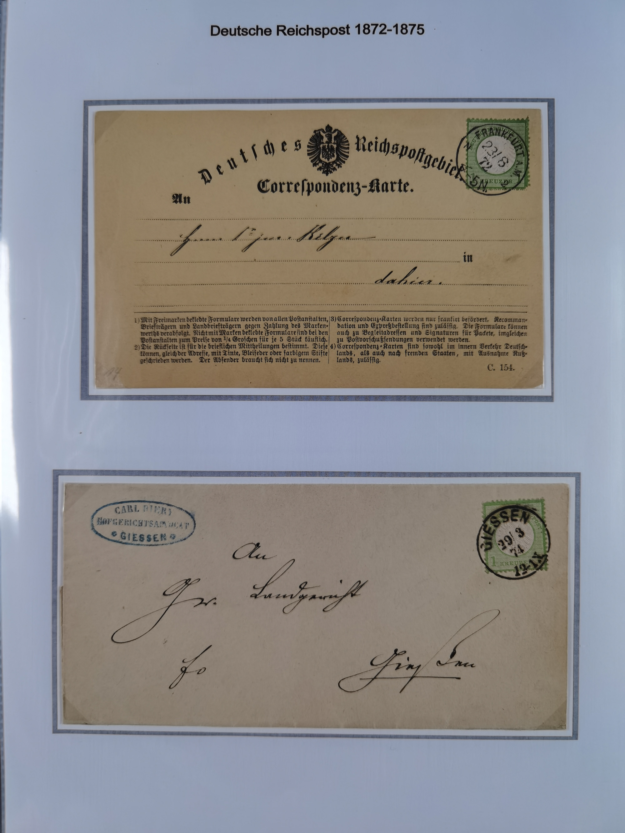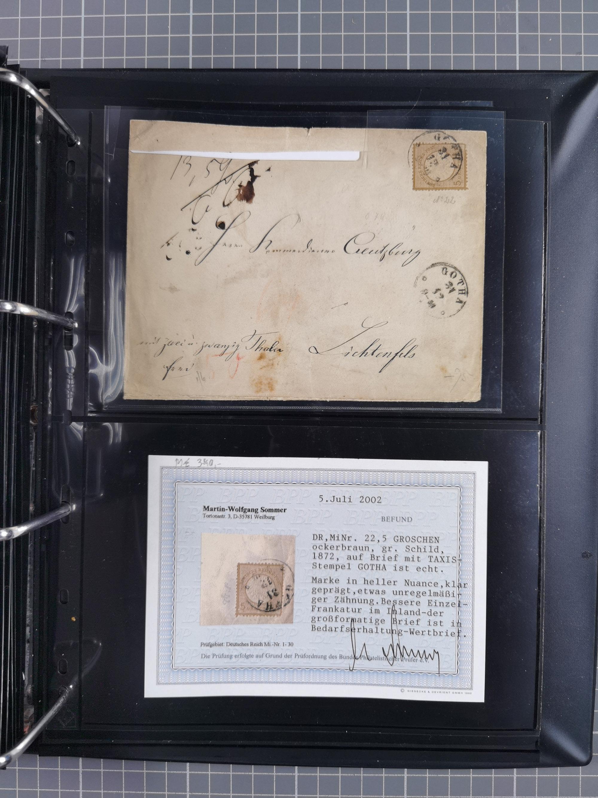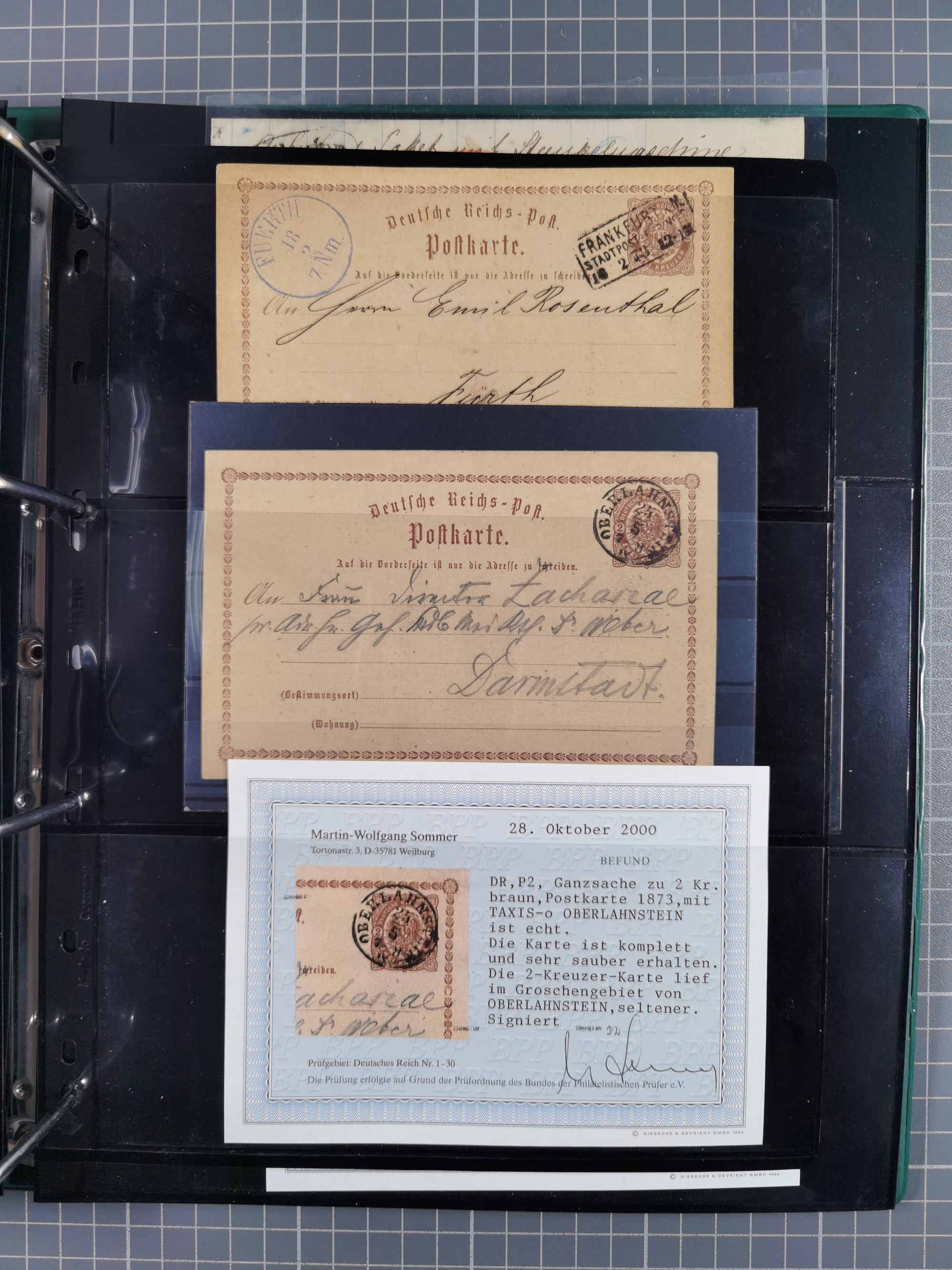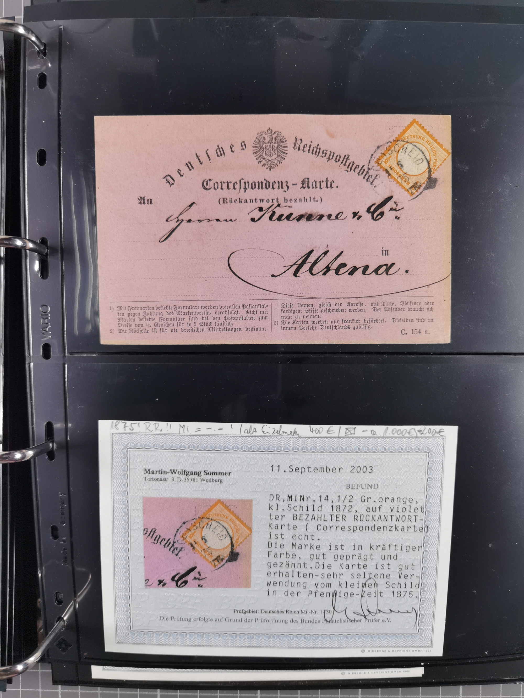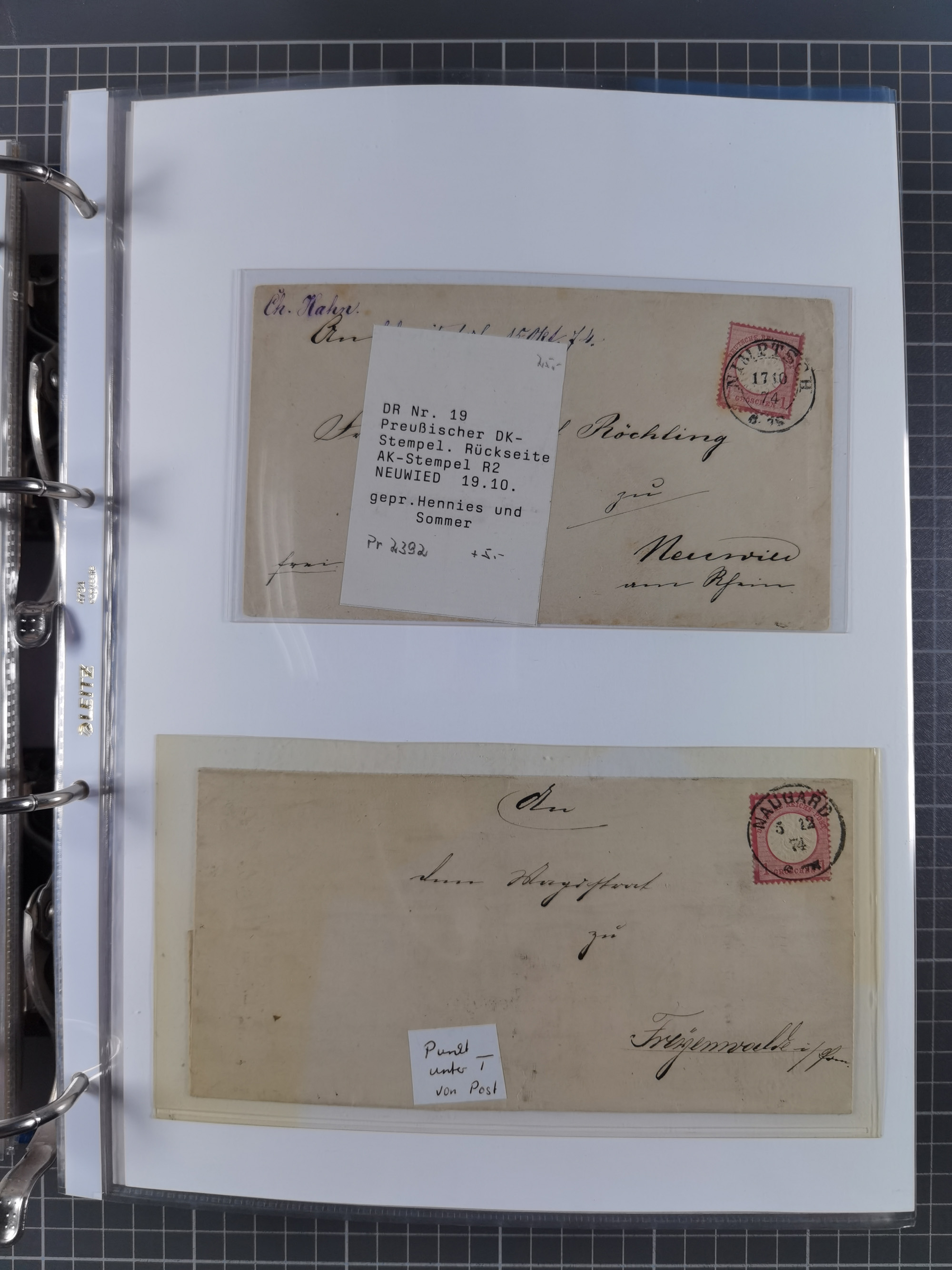 1872/74, umfangreiche Sammlung mit über 100 Briefen und Karten mit besseren Einzel- und Mehrfachfrankaturen, R- und Wertbriefen, Express-Briefe, interessante Stempel und weiteren Besonderheiten. Dabei u.a. Mi.-Nr. 1 (2) + Paar 21a auf R-Express-Brief (FA Sommer BPP), Mi.-Nr. 3 (7) auf Express-Brief (1 Wert fehlerhaft), Mi.-Nr. 5 im Paar auf Express-Brief mit Landzustellung (FA Brugger BPP), zwei Einzelfrankaturen Mi.-Nr. 11 auf Wertbriefen (repariert, einmal mit FB Krug BPP), Mi.-Nr. 17a(2) auf Drucksache der 2. Gewichtsstufe (FA Krug BPP), Mi.-Nr. 19 auf P1 als R-Ortskarte von Berlin (FA Sommer BPP) und Mi.-Nr. 23a+30 auf Wertbrief. Die Erhaltung ist zum Teil fehlerhaft, vieles signiert bzw. mit FB und Fotoattesten, ex Untermann