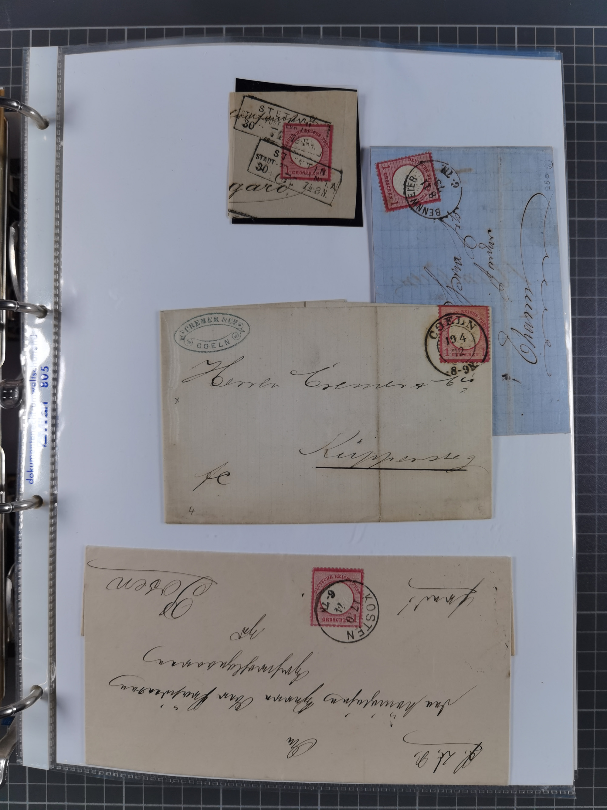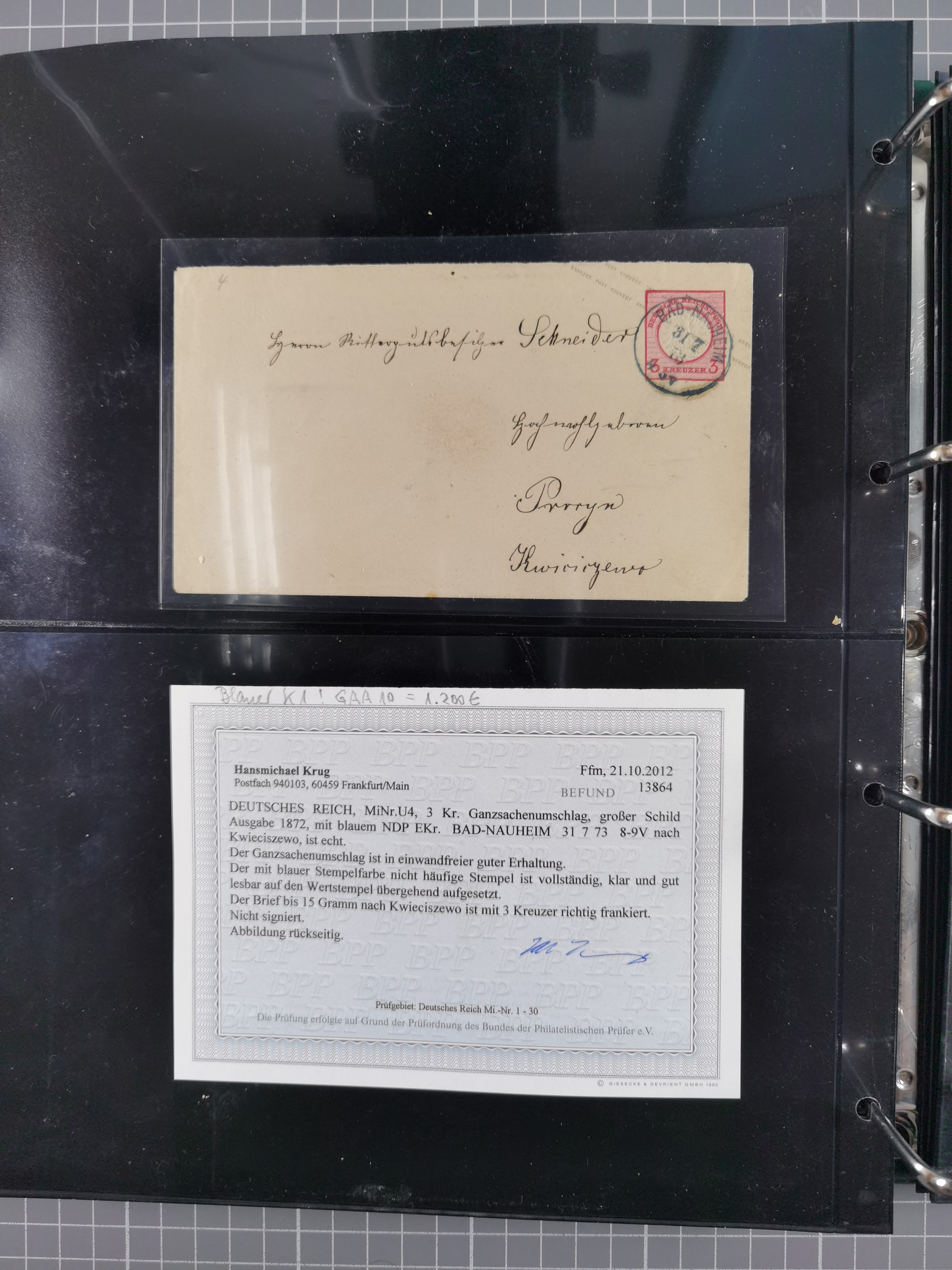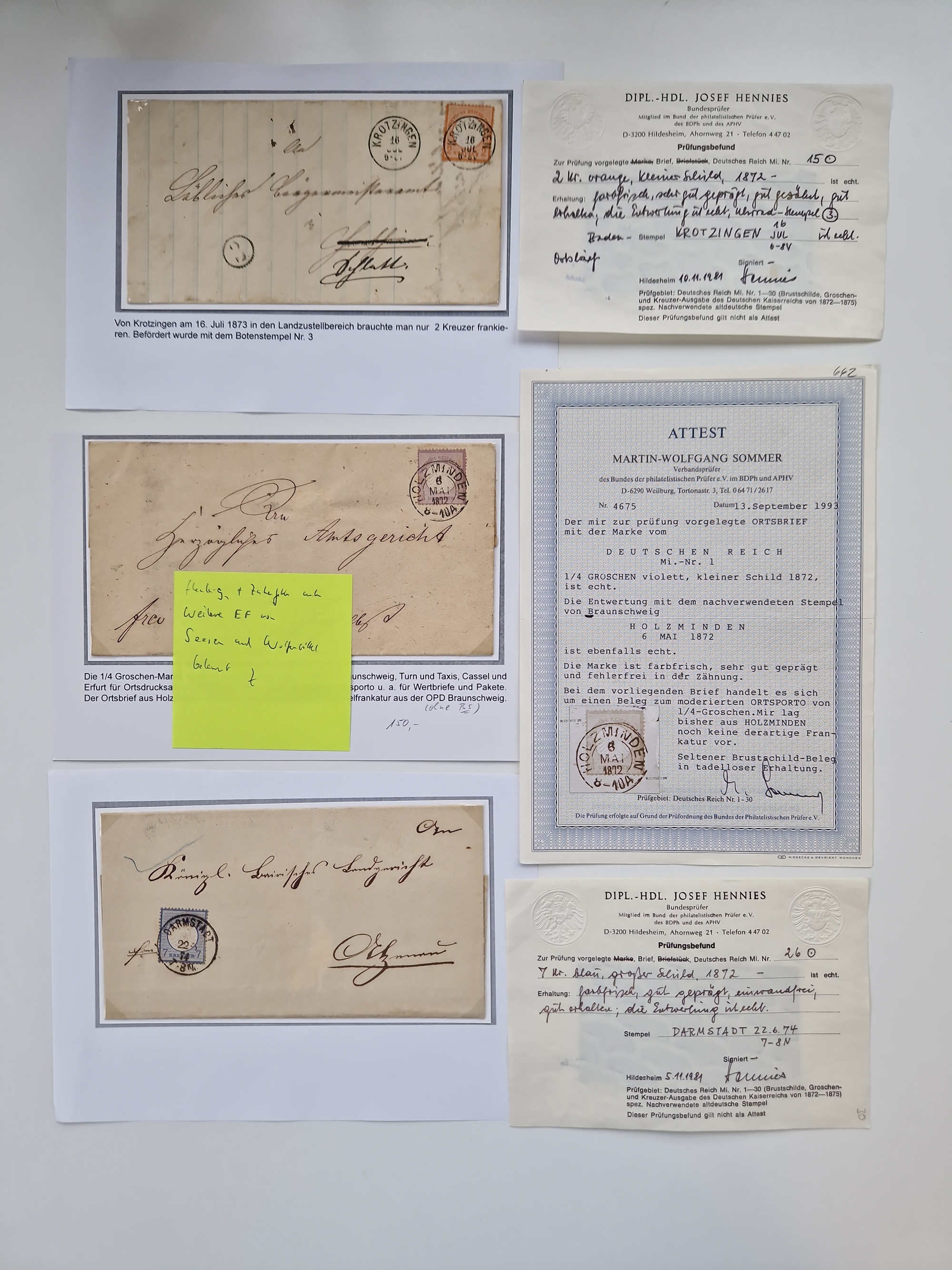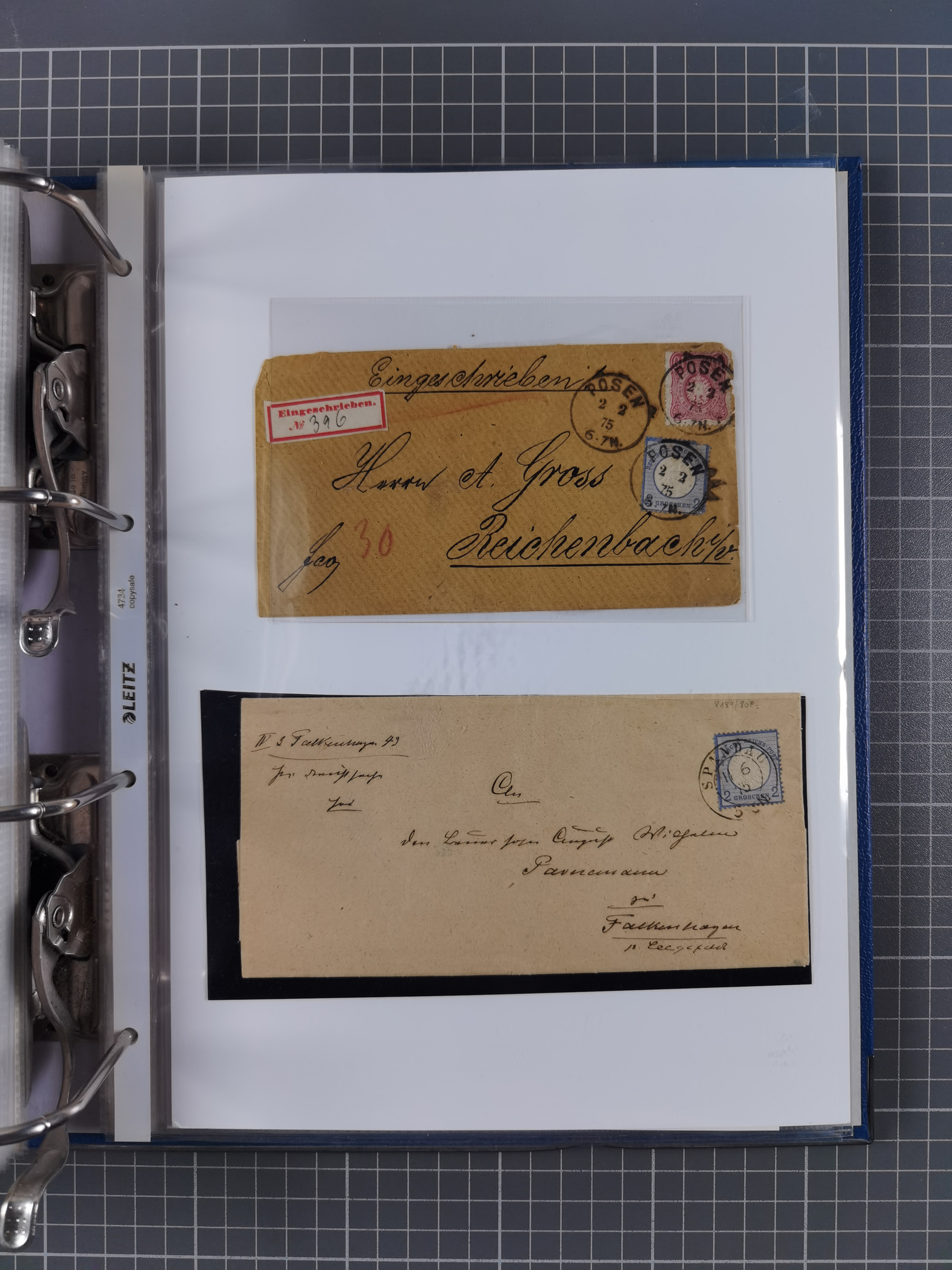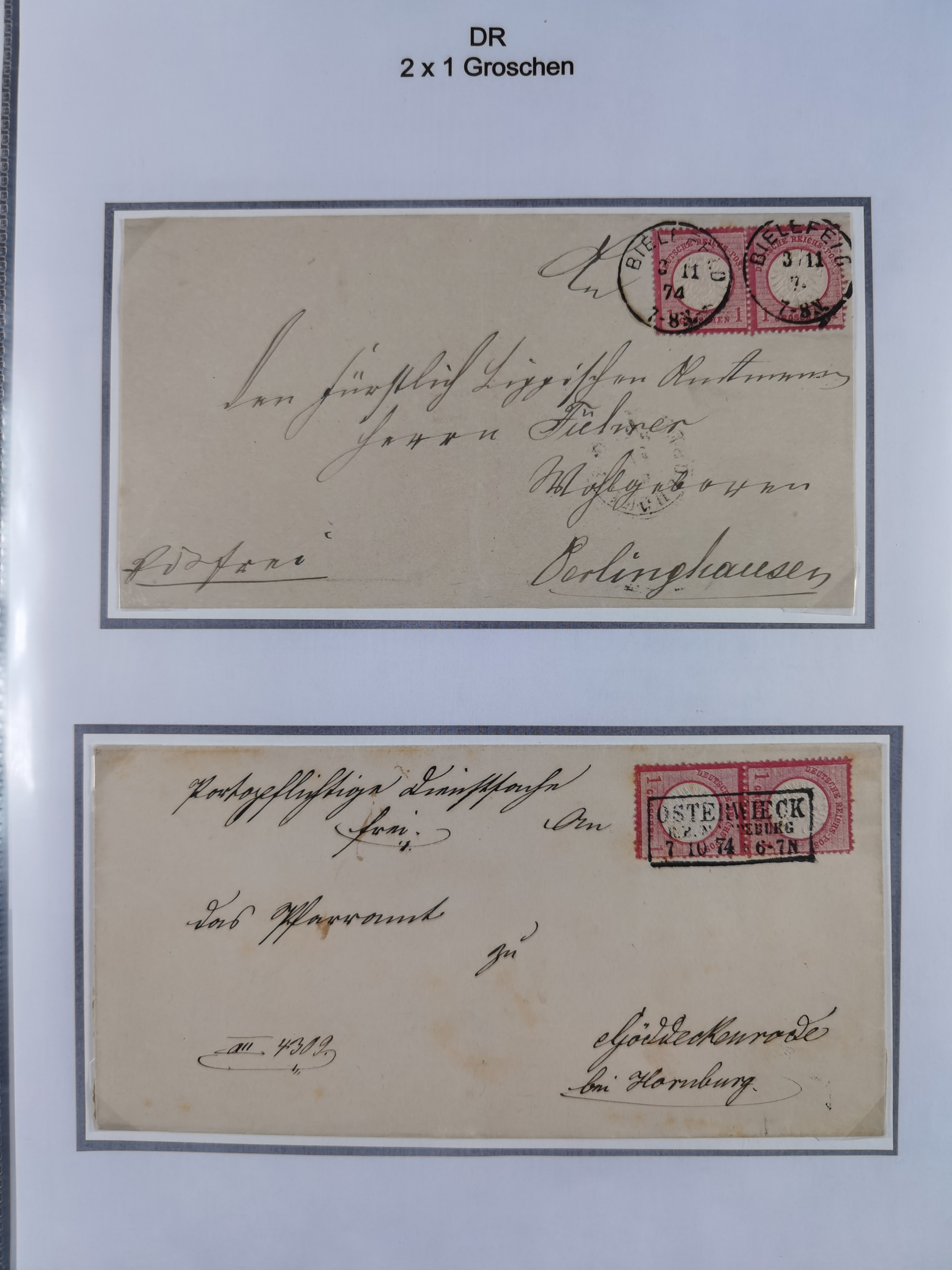 1872/74, umfangreiche Sammlung mit über 100 Briefen und Karten mit besseren Einzel- und Mehrfachfrankaturen, R- und Wertbriefen, Express-Briefe, interessante Stempel und weiteren Besonderheiten. Dabei u.a. Mi.-Nr. 1 (2) + Paar 21a auf R-Express-Brief (FA Sommer BPP), Mi.-Nr. 3 (7) auf Express-Brief (1 Wert fehlerhaft), Mi.-Nr. 5 im Paar auf Express-Brief mit Landzustellung (FA Brugger BPP), zwei Einzelfrankaturen Mi.-Nr. 11 auf Wertbriefen (repariert, einmal mit FB Krug BPP), Mi.-Nr. 17a(2) auf Drucksache der 2. Gewichtsstufe (FA Krug BPP), Mi.-Nr. 19 auf P1 als R-Ortskarte von Berlin (FA Sommer BPP) und Mi.-Nr. 23a+30 auf Wertbrief. Die Erhaltung ist zum Teil fehlerhaft, vieles signiert bzw. mit FB und Fotoattesten, ex Untermann