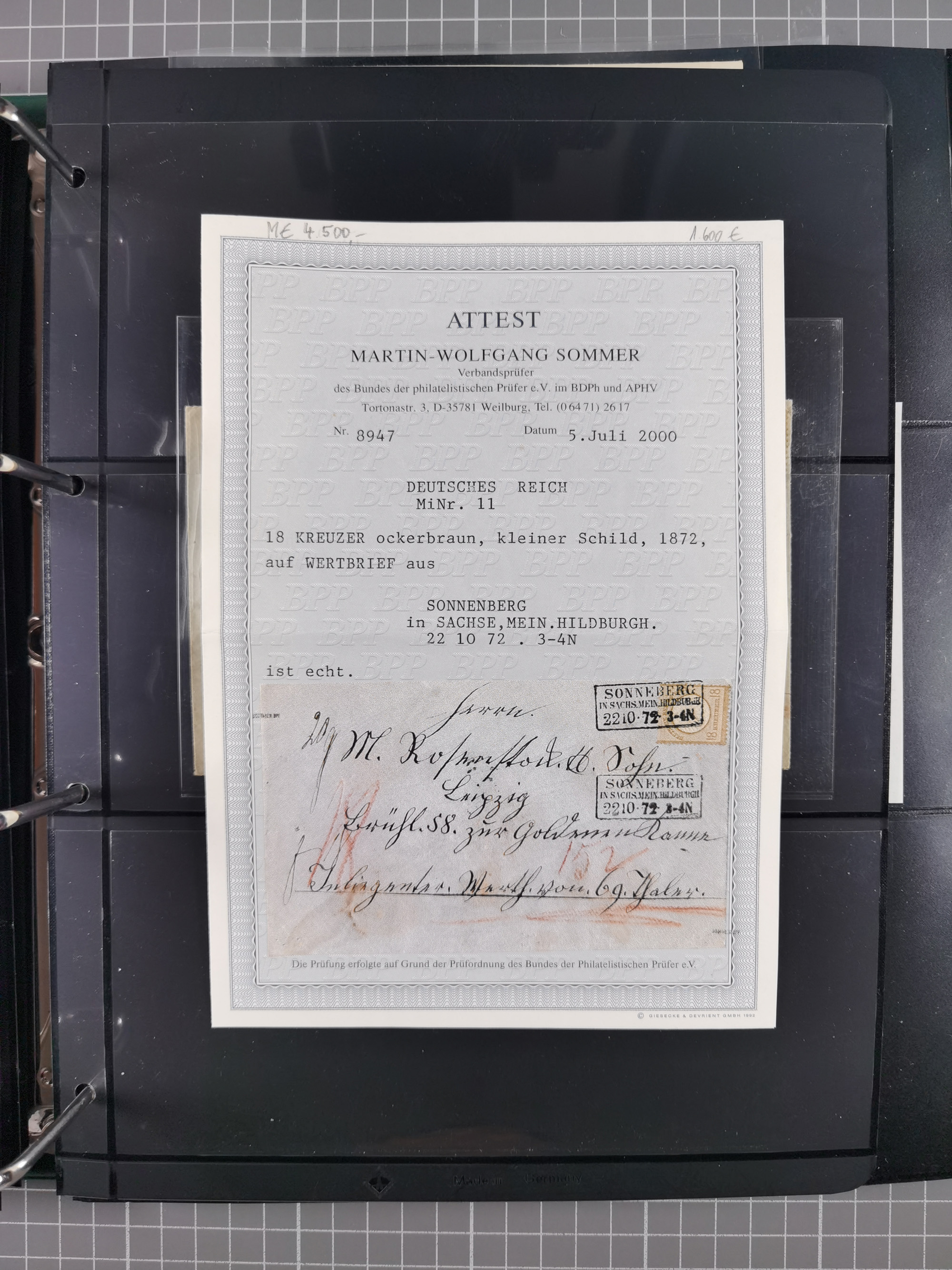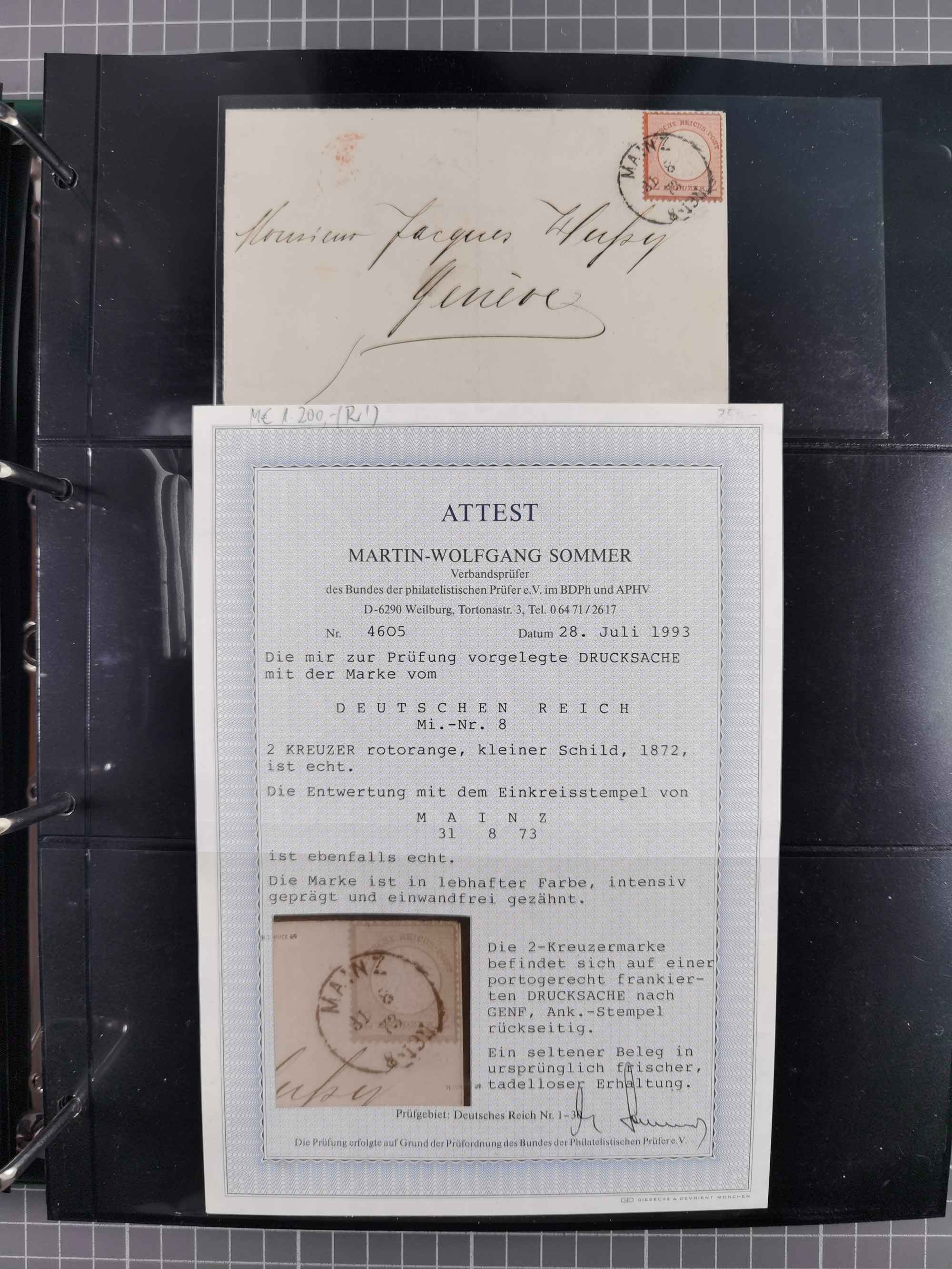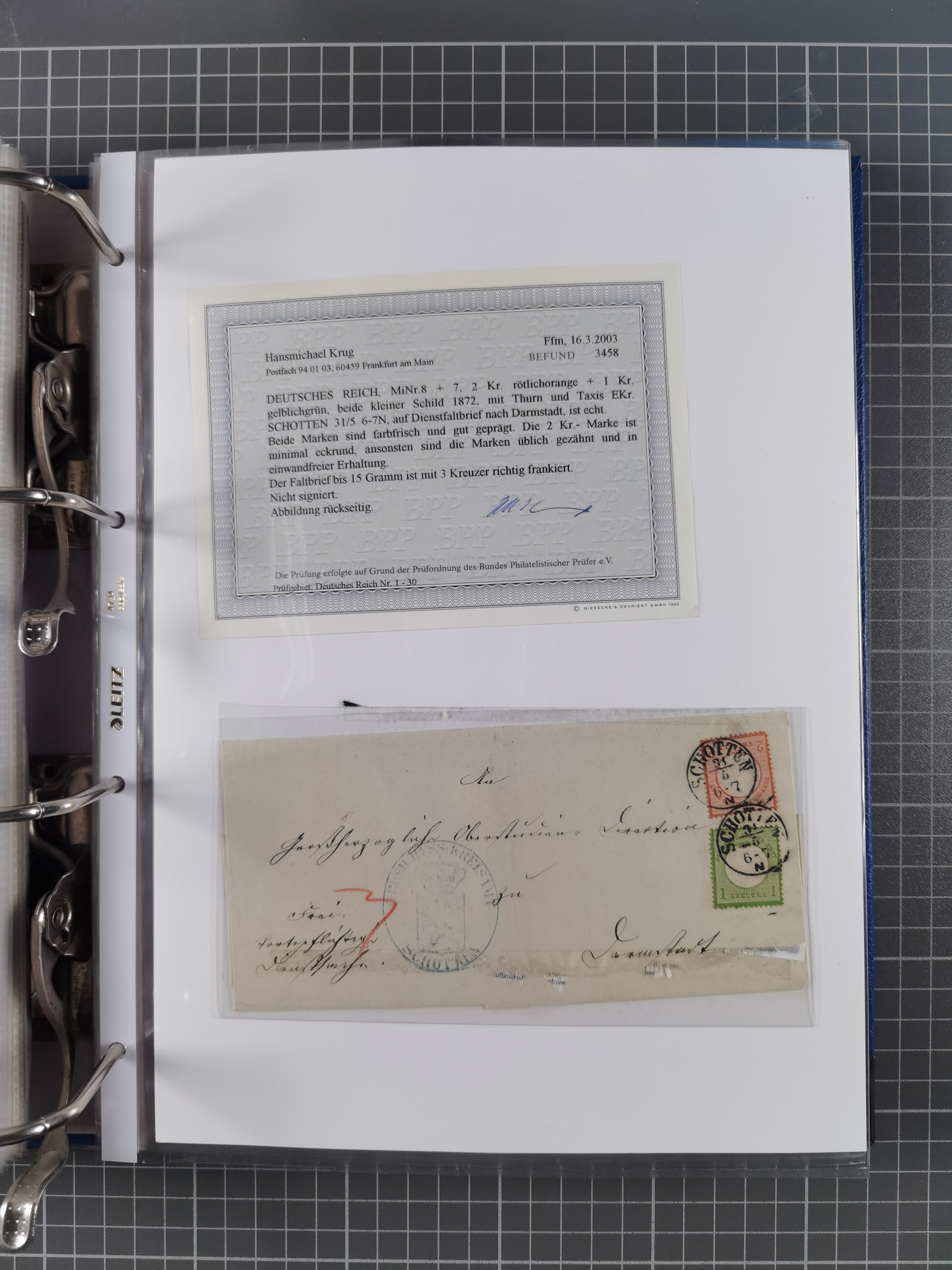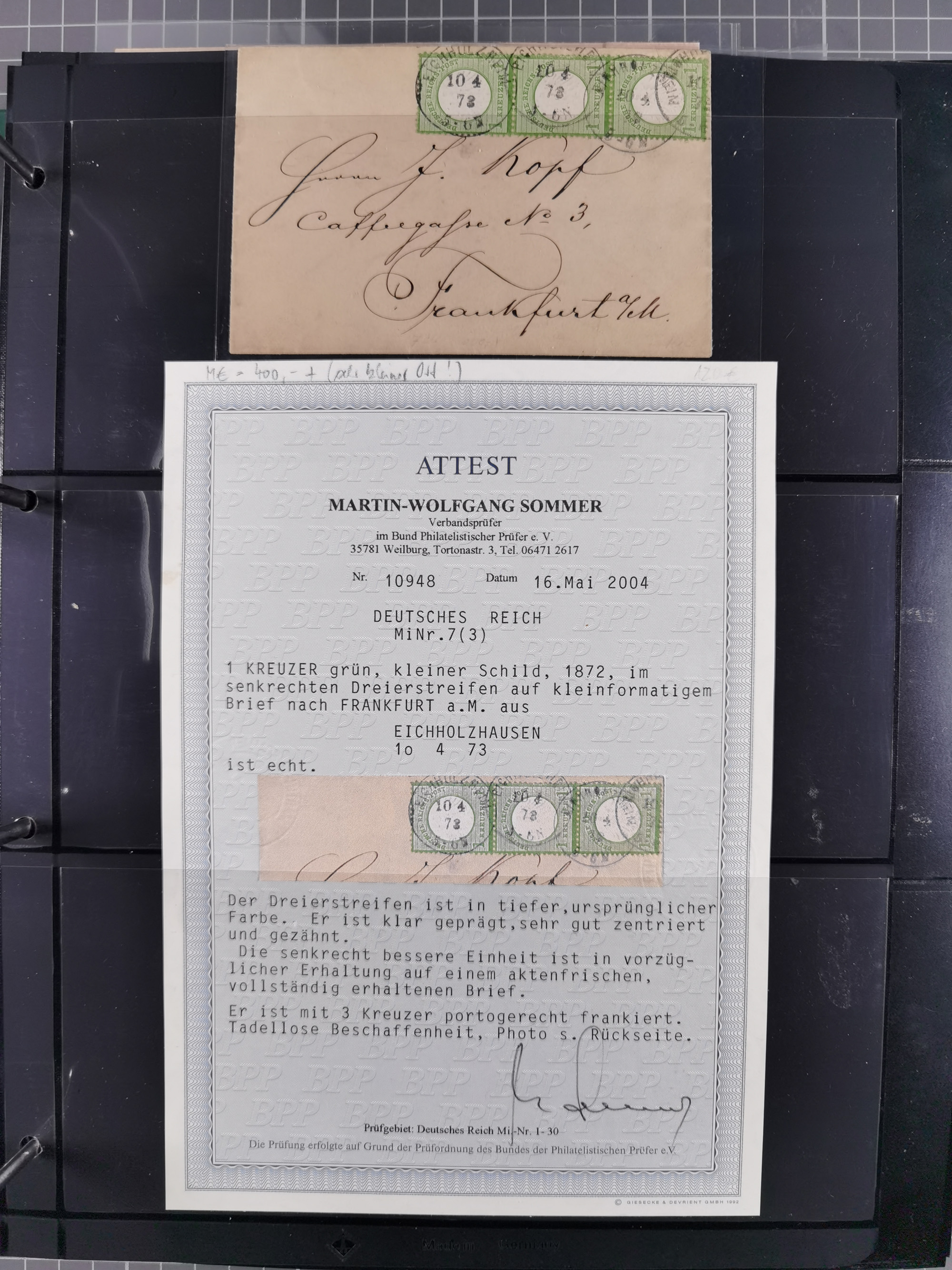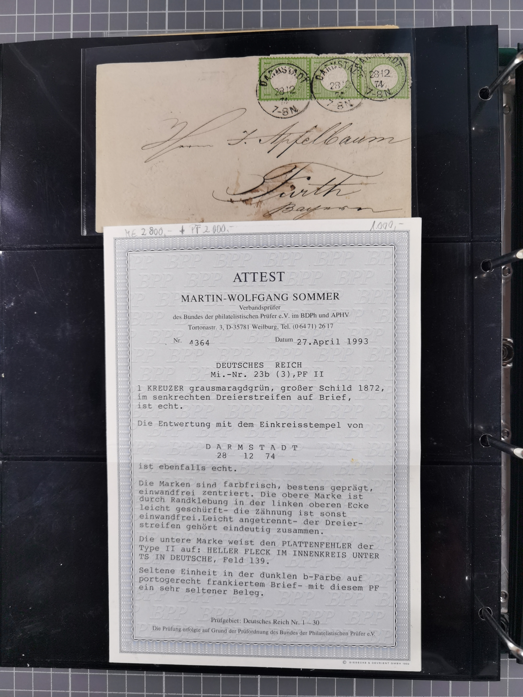 1872/74, umfangreiche Sammlung mit über 100 Briefen und Karten mit besseren Einzel- und Mehrfachfrankaturen, R- und Wertbriefen, Express-Briefe, interessante Stempel und weiteren Besonderheiten. Dabei u.a. Mi.-Nr. 1 (2) + Paar 21a auf R-Express-Brief (FA Sommer BPP), Mi.-Nr. 3 (7) auf Express-Brief (1 Wert fehlerhaft), Mi.-Nr. 5 im Paar auf Express-Brief mit Landzustellung (FA Brugger BPP), zwei Einzelfrankaturen Mi.-Nr. 11 auf Wertbriefen (repariert, einmal mit FB Krug BPP), Mi.-Nr. 17a(2) auf Drucksache der 2. Gewichtsstufe (FA Krug BPP), Mi.-Nr. 19 auf P1 als R-Ortskarte von Berlin (FA Sommer BPP) und Mi.-Nr. 23a+30 auf Wertbrief. Die Erhaltung ist zum Teil fehlerhaft, vieles signiert bzw. mit FB und Fotoattesten, ex Untermann